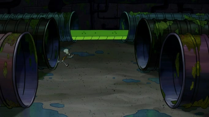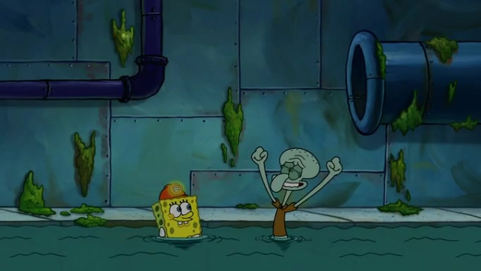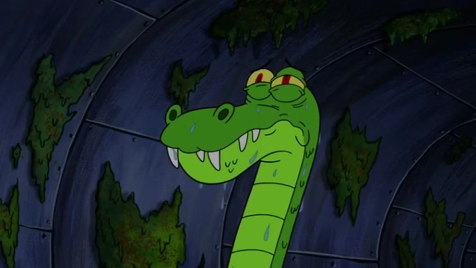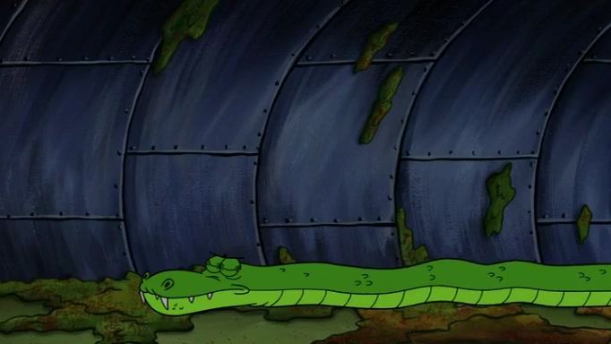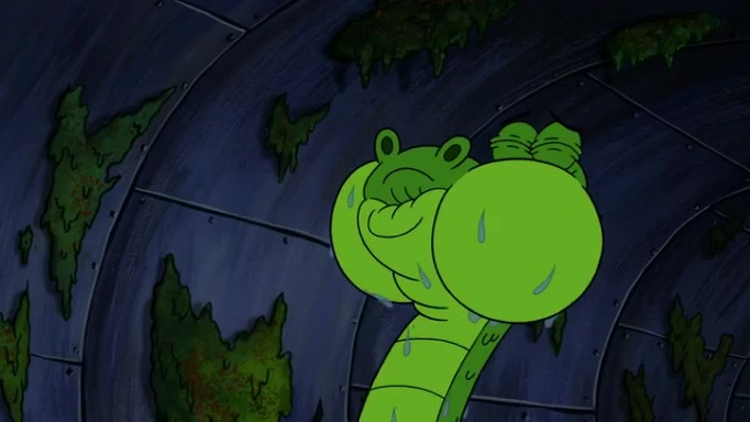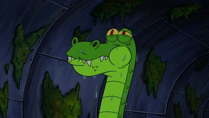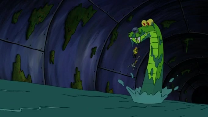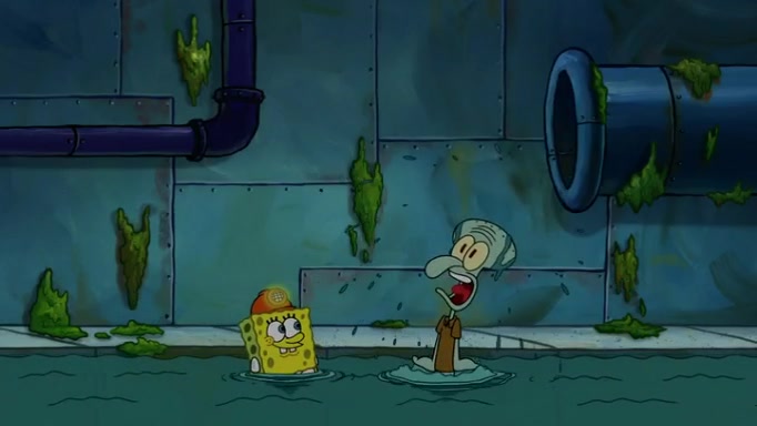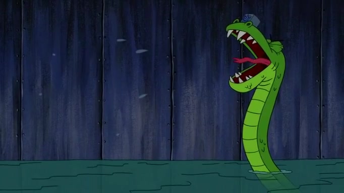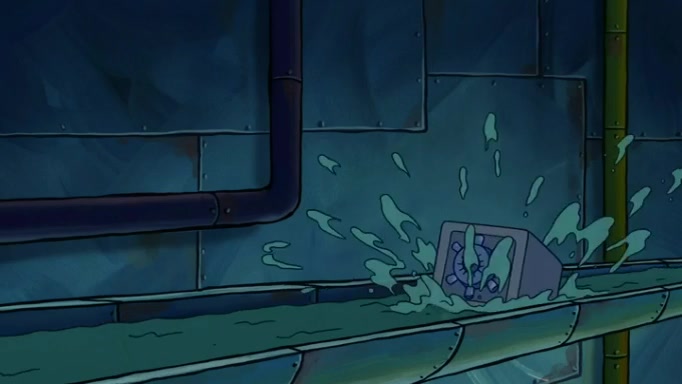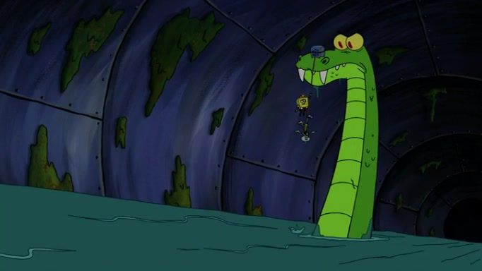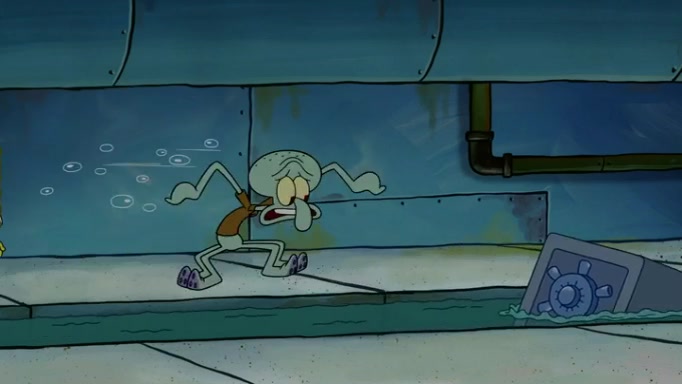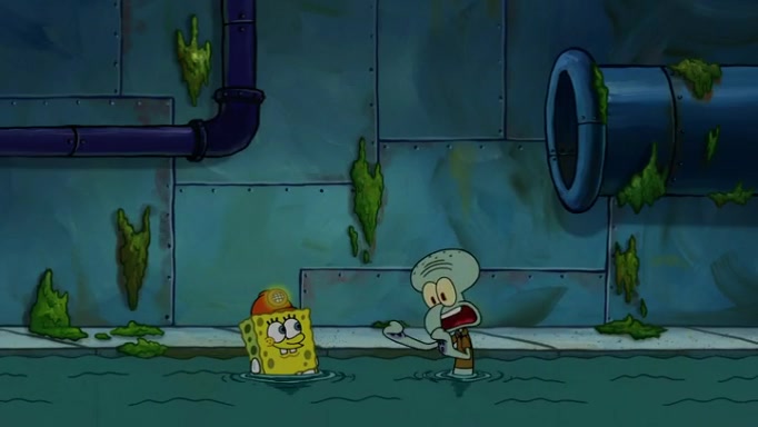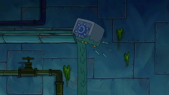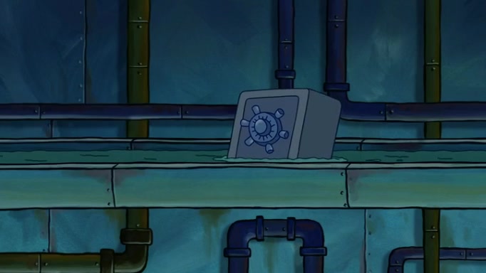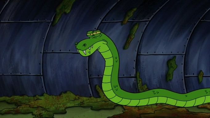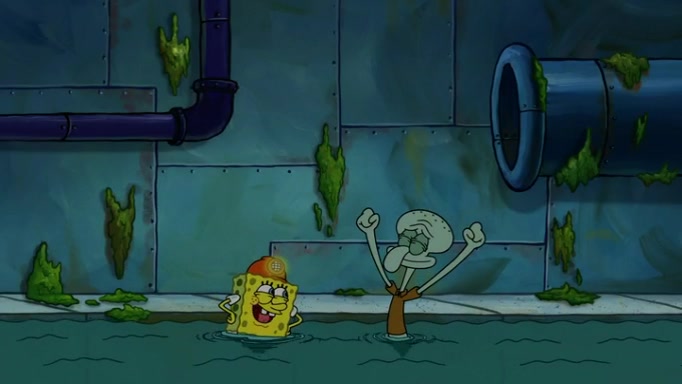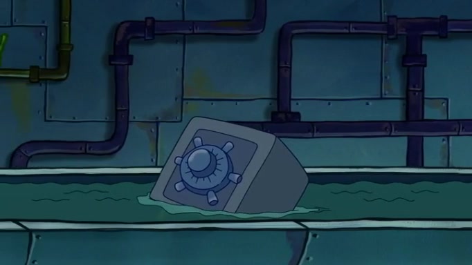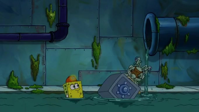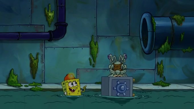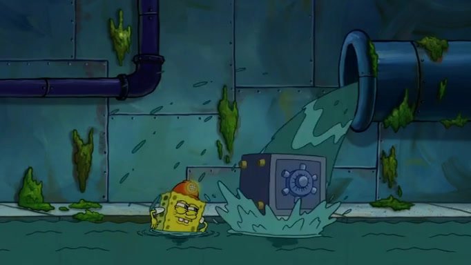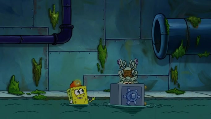 At the Krusty Krab Stadium, Mr. Krabs can be seen talking to Crupski and Charlton Hawkfish about Mr. Krabs buying the stadium. Customers outside are complaining about the plumbing an Charlton is angered to not only see that the pipes have a reducer in it, but is also made out of cardboard. Charlton worries that the pipes won't hold but Crupski says it's a way to save money much to the delight of Mr. Krabs. Meanwhile, SpongeBob and Squidward make it to the sewers where they begin their search for the safe. They manage to spot the safe where it gets stuck in the pipes. As Squidward tries to reach for it, the safe gets unstuck and floats away. Squidward fails to grab it again and a couple of lampreys bites at his hands. SpongeBob helps get the lampreys off and spots the safe floating in the distance. SpongeBob and Squidward go after it once more and, suddenly, a large sewer snake emerges from the water.