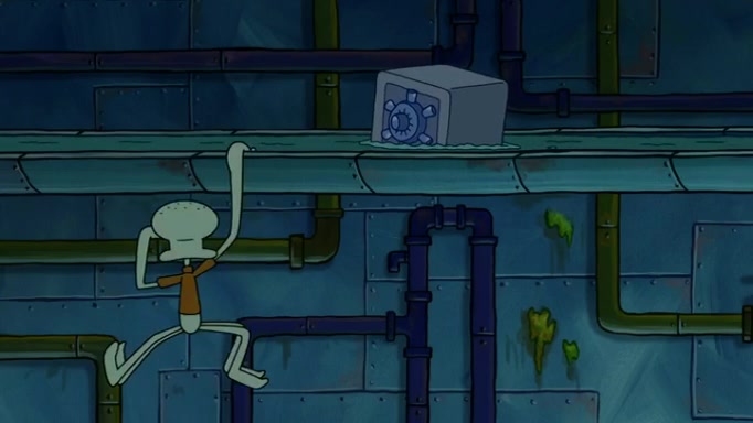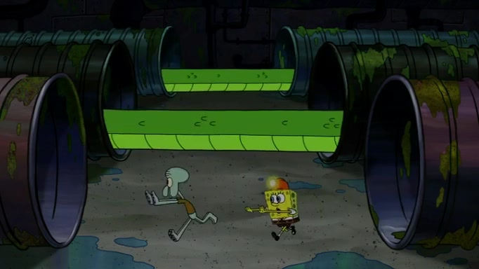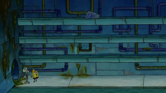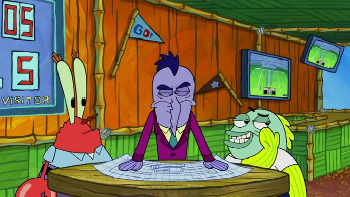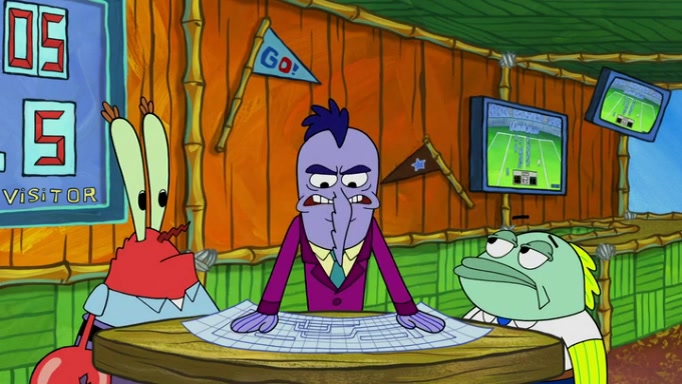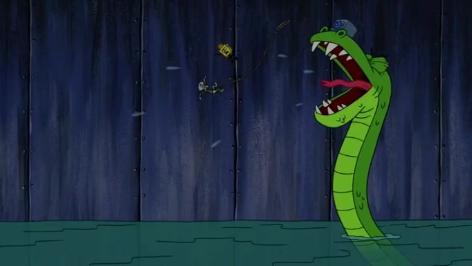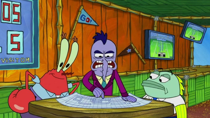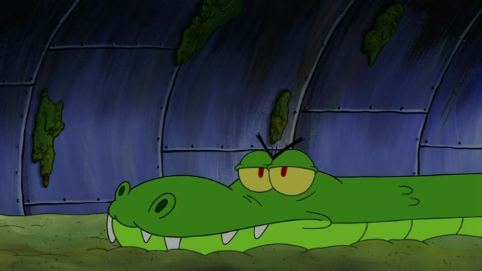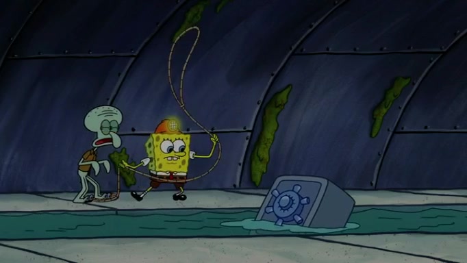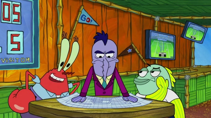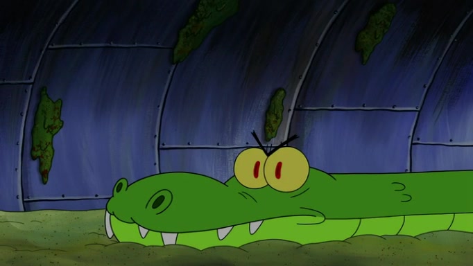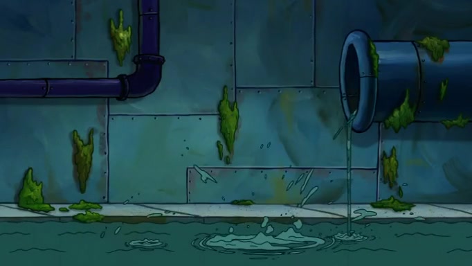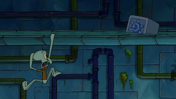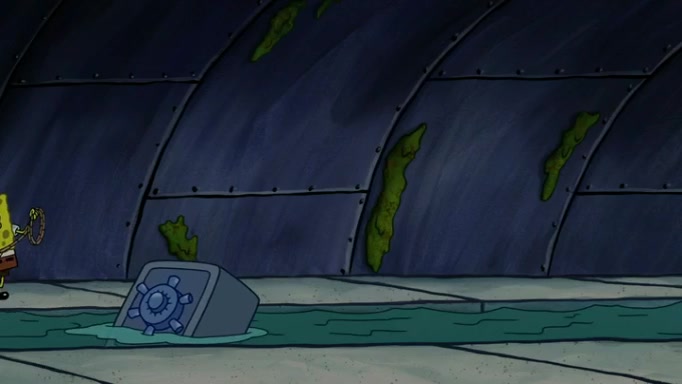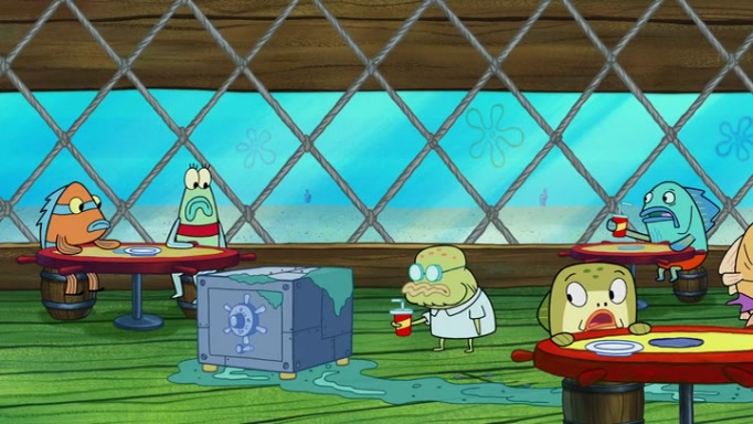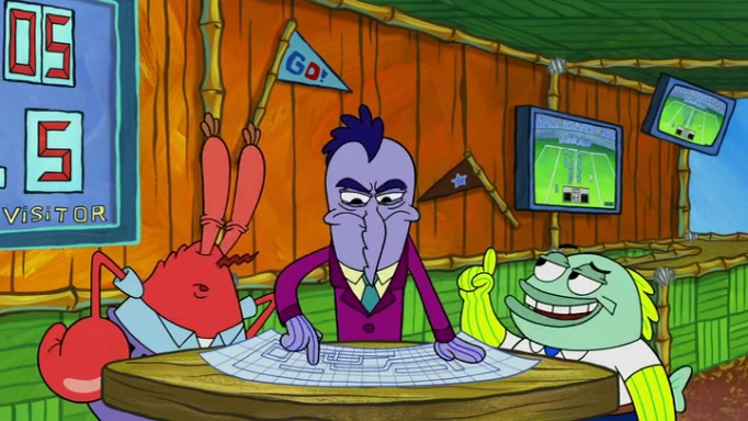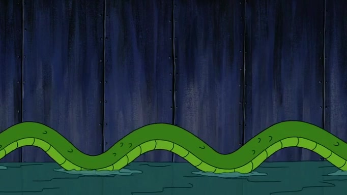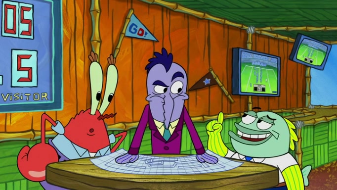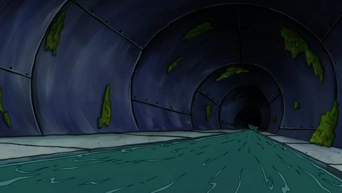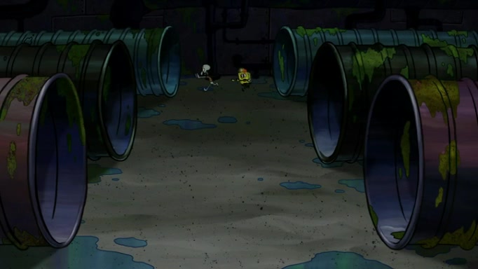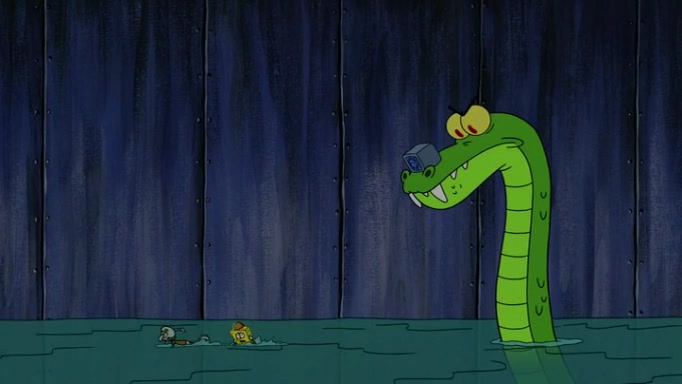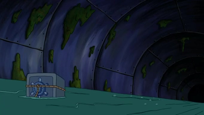 At the Krusty Krab Stadium, Mr. Krabs can be seen talking to Crupski and Charlton Hawkfish about Mr. Krabs buying the stadium. Customers outside are complaining about the plumbing an Charlton is angered to not only see that the pipes have a reducer in it, but is also made out of cardboard. Charlton worries that the pipes won't hold but Crupski says it's a way to save money much to the delight of Mr. Krabs. Meanwhile, SpongeBob and Squidward make it to the sewers where they begin their search for the safe. They manage to spot the safe where it gets stuck in the pipes. As Squidward tries to reach for it, the safe gets unstuck and floats away. Squidward fails to grab it again and a couple of lampreys bites at his hands. SpongeBob helps get the lampreys off and spots the safe floating in the distance. SpongeBob and Squidward go after it once more and, suddenly, a large sewer snake emerges from the water.