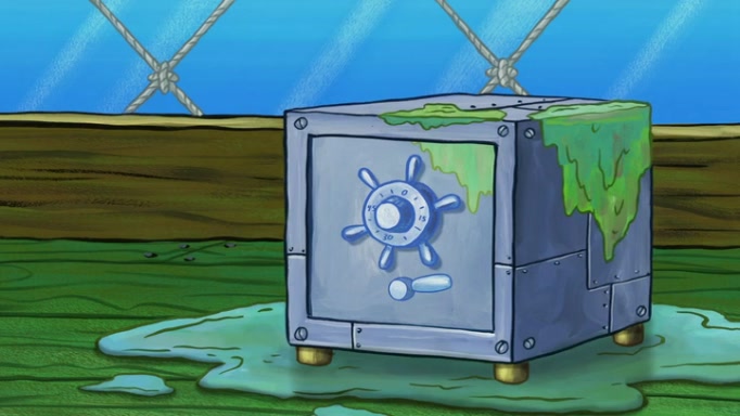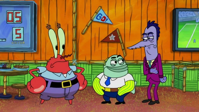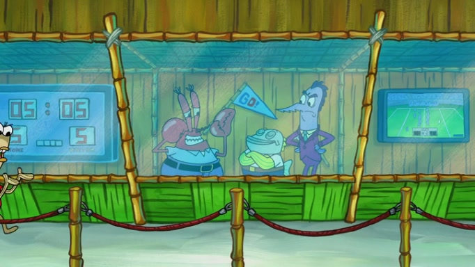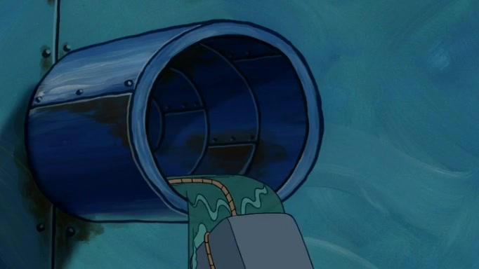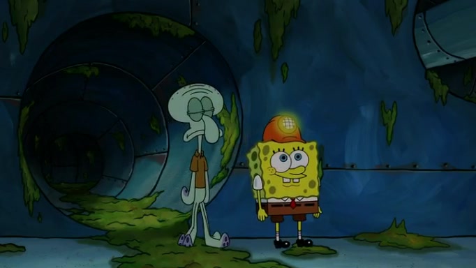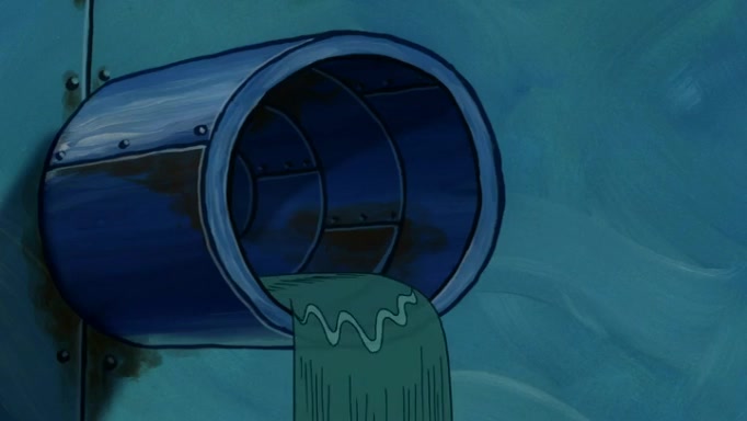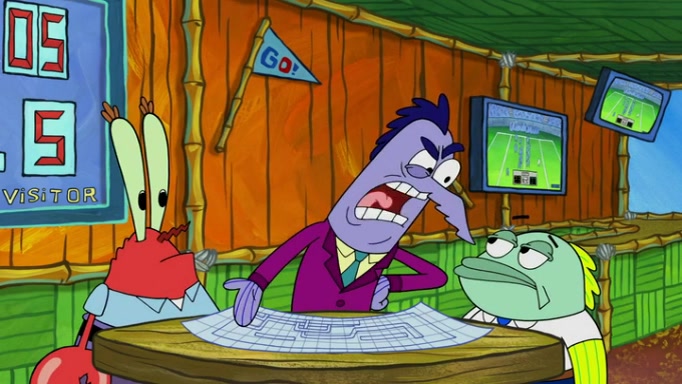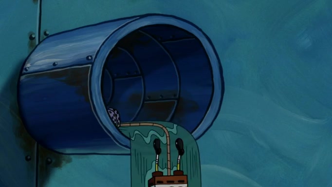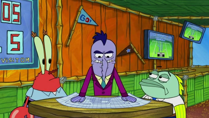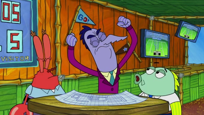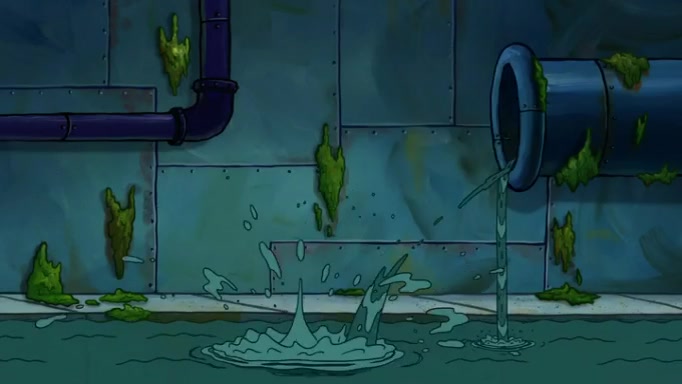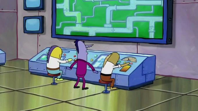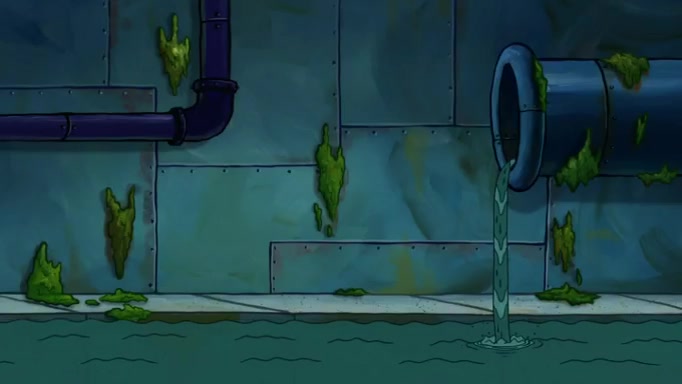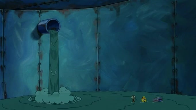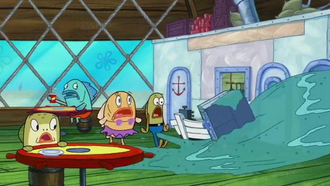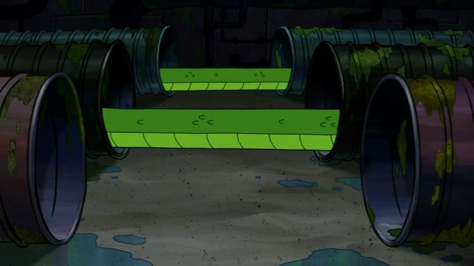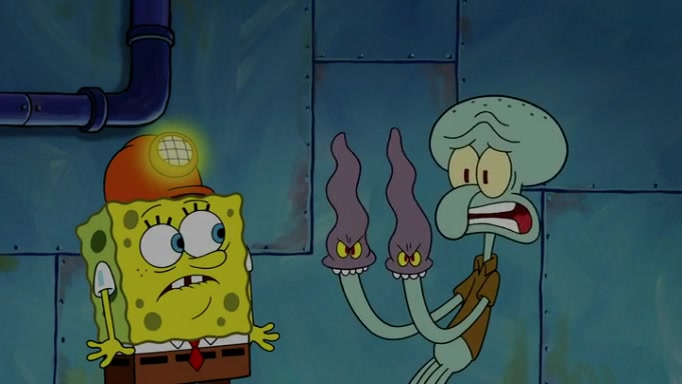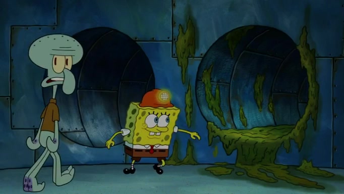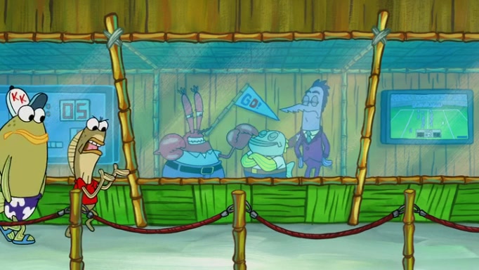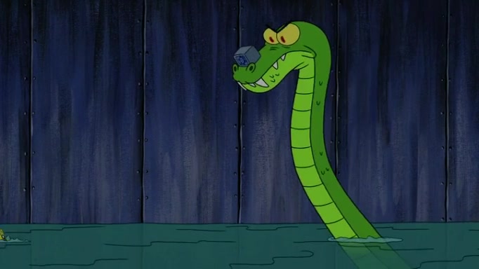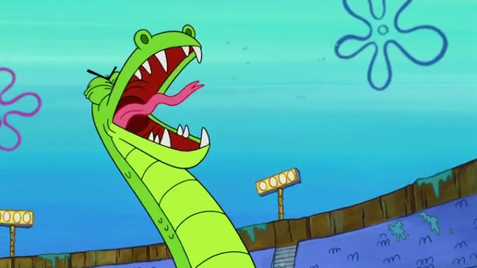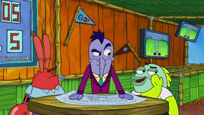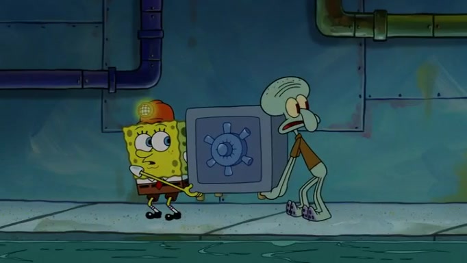 At the Krusty Krab Stadium, Mr. Krabs can be seen talking to Crupski and Charlton Hawkfish about Mr. Krabs buying the stadium. Customers outside are complaining about the plumbing an Charlton is angered to not only see that the pipes have a reducer in it, but is also made out of cardboard. Charlton worries that the pipes won't hold but Crupski says it's a way to save money much to the delight of Mr. Krabs. Meanwhile, SpongeBob and Squidward make it to the sewers where they begin their search for the safe. They manage to spot the safe where it gets stuck in the pipes. As Squidward tries to reach for it, the safe gets unstuck and floats away. Squidward fails to grab it again and a couple of lampreys bites at his hands. SpongeBob helps get the lampreys off and spots the safe floating in the distance. SpongeBob and Squidward go after it once more and, suddenly, a large sewer snake emerges from the water.