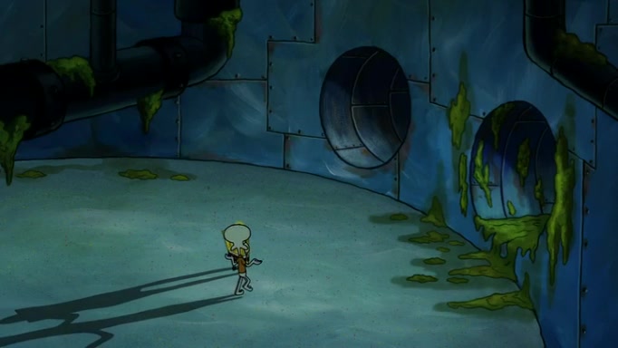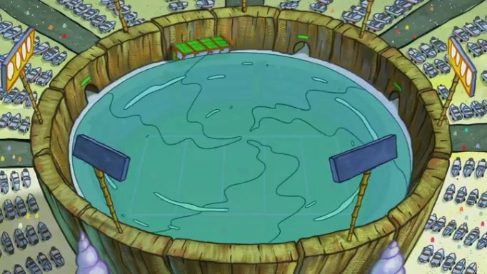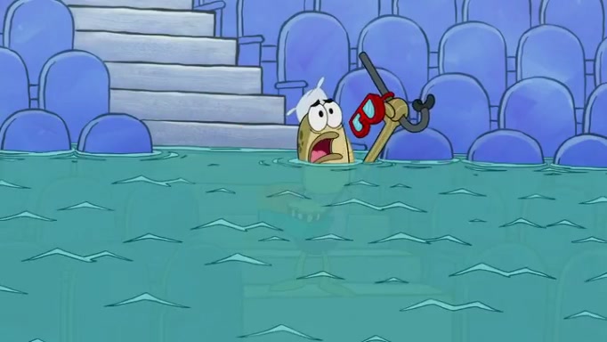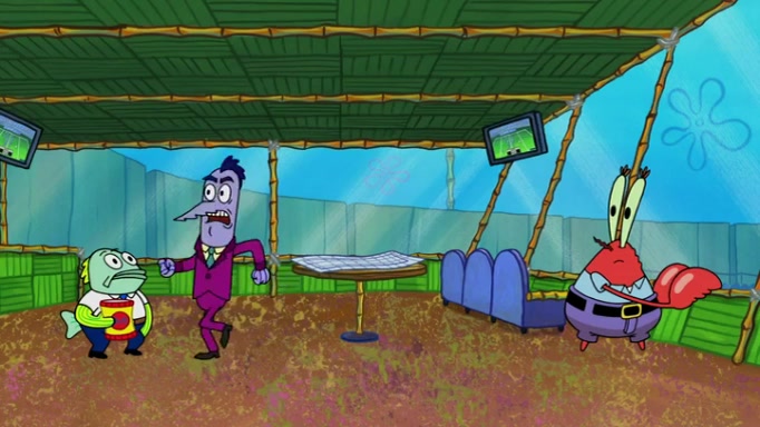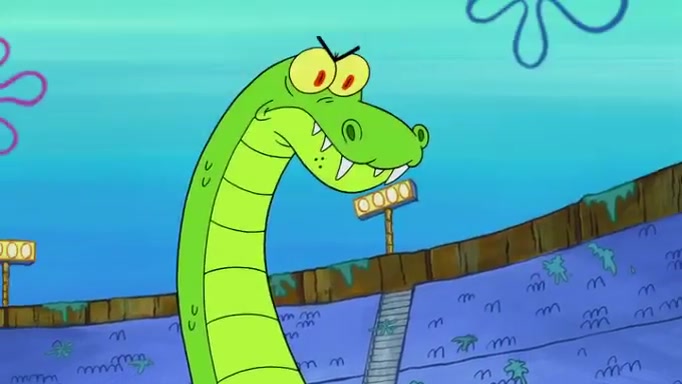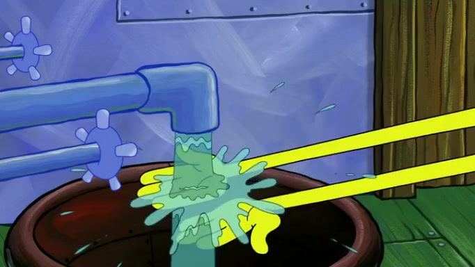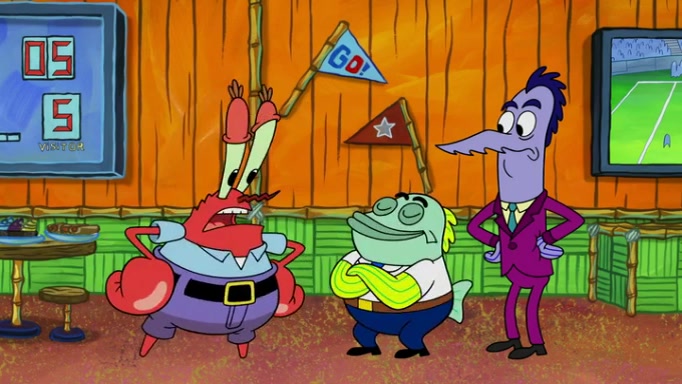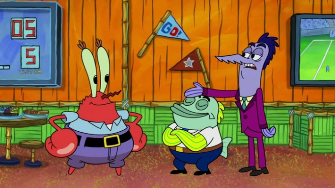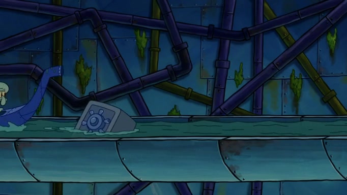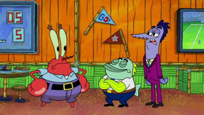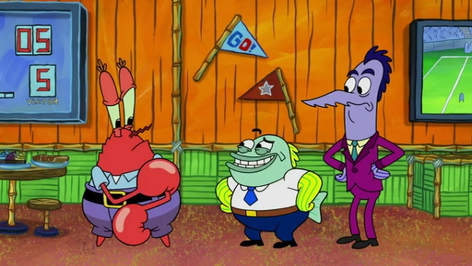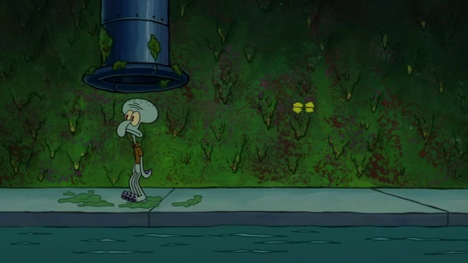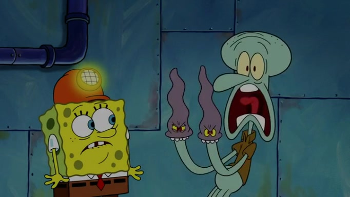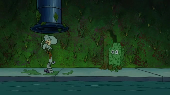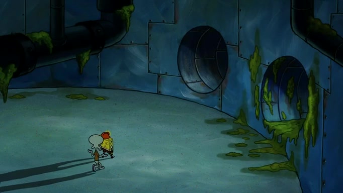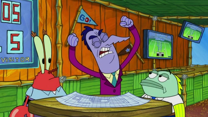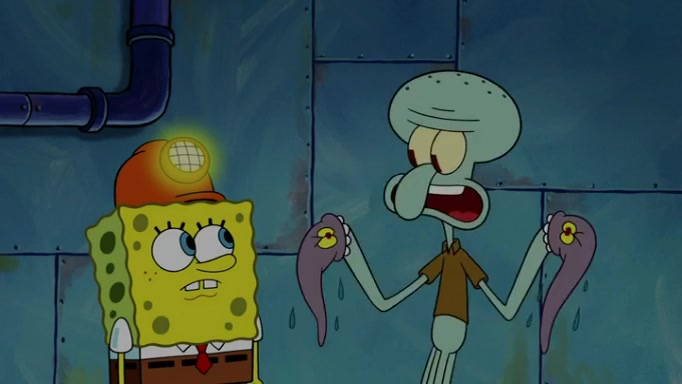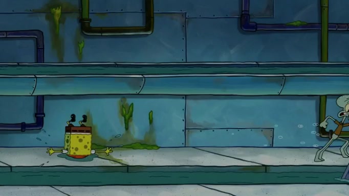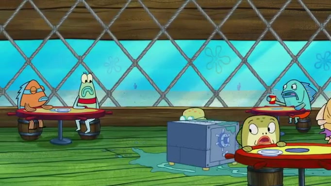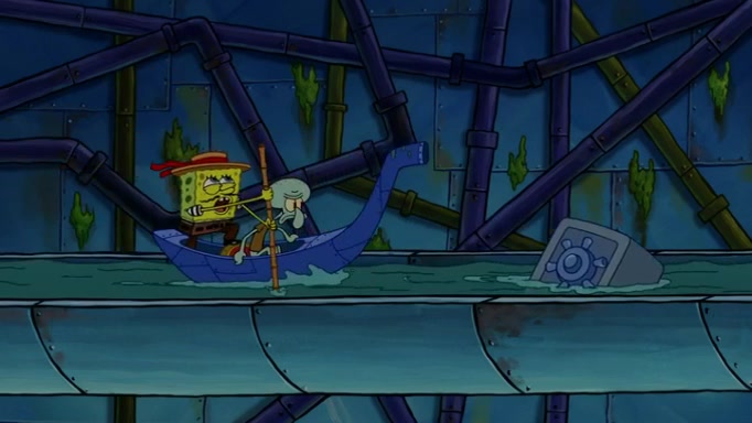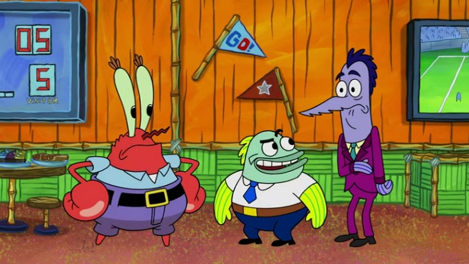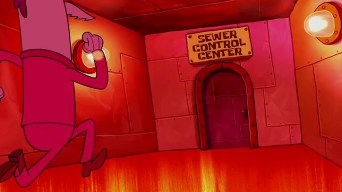 At the Krusty Krab Stadium, Mr. Krabs can be seen talking to Crupski and Charlton Hawkfish about Mr. Krabs buying the stadium. Customers outside are complaining about the plumbing an Charlton is angered to not only see that the pipes have a reducer in it, but is also made out of cardboard. Charlton worries that the pipes won't hold but Crupski says it's a way to save money much to the delight of Mr. Krabs. Meanwhile, SpongeBob and Squidward make it to the sewers where they begin their search for the safe. They manage to spot the safe where it gets stuck in the pipes. As Squidward tries to reach for it, the safe gets unstuck and floats away. Squidward fails to grab it again and a couple of lampreys bites at his hands. SpongeBob helps get the lampreys off and spots the safe floating in the distance. SpongeBob and Squidward go after it once more and, suddenly, a large sewer snake emerges from the water.
