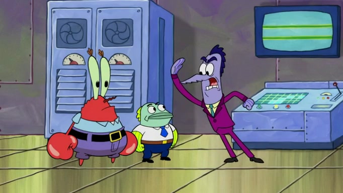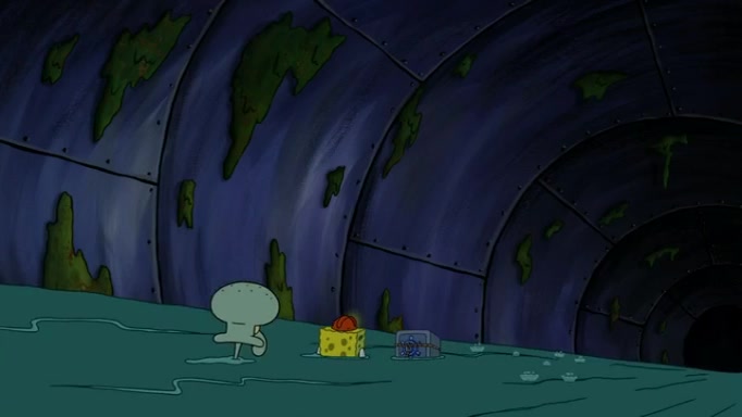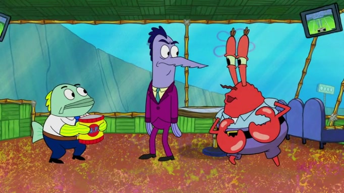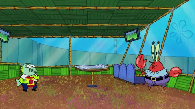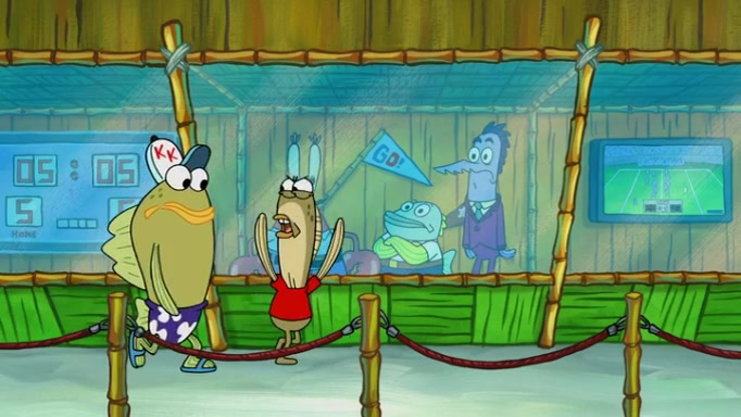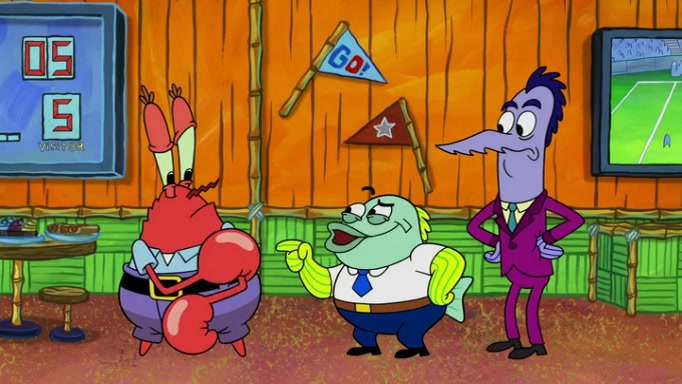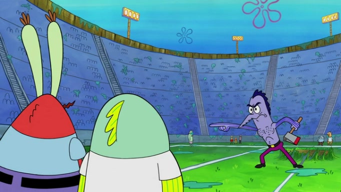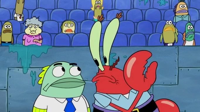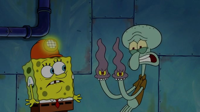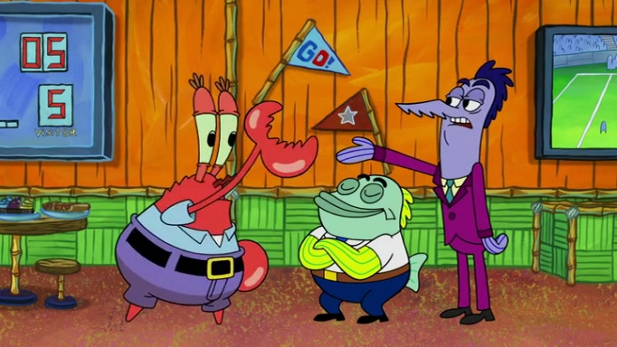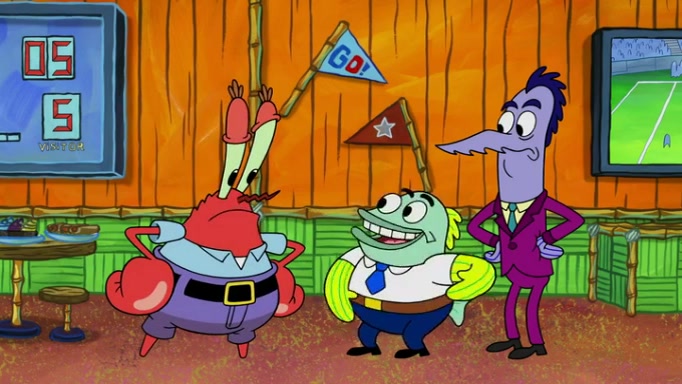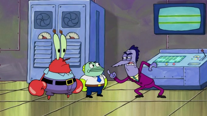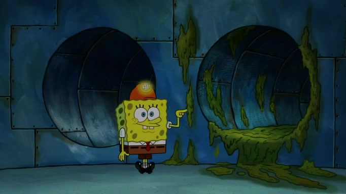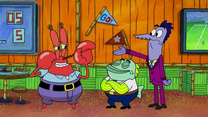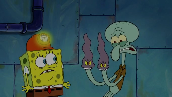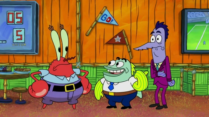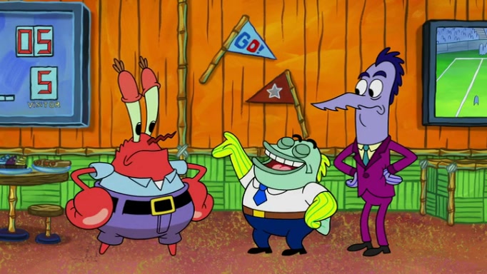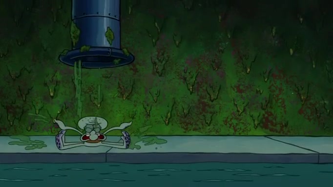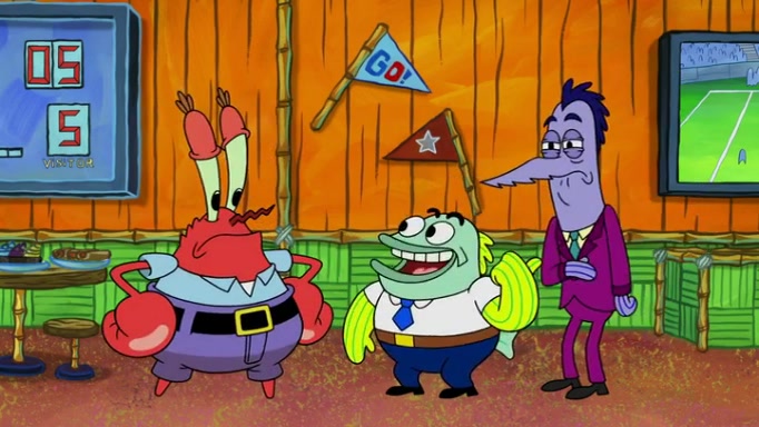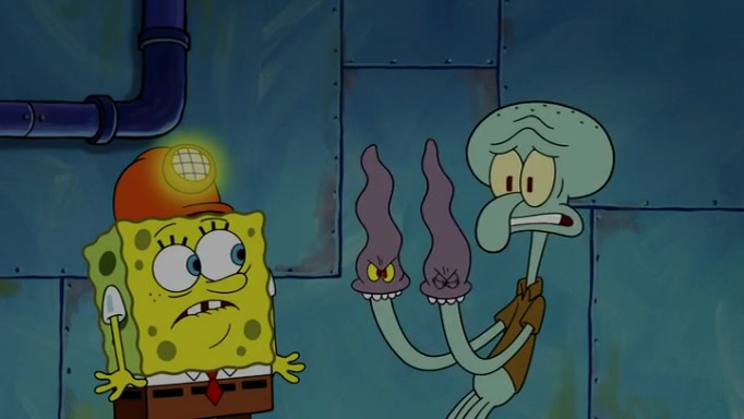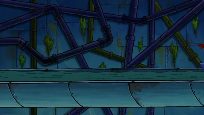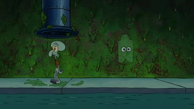 At the Krusty Krab Stadium, Mr. Krabs can be seen talking to Crupski and Charlton Hawkfish about Mr. Krabs buying the stadium. Customers outside are complaining about the plumbing an Charlton is angered to not only see that the pipes have a reducer in it, but is also made out of cardboard. Charlton worries that the pipes won't hold but Crupski says it's a way to save money much to the delight of Mr. Krabs. Meanwhile, SpongeBob and Squidward make it to the sewers where they begin their search for the safe. They manage to spot the safe where it gets stuck in the pipes. As Squidward tries to reach for it, the safe gets unstuck and floats away. Squidward fails to grab it again and a couple of lampreys bites at his hands. SpongeBob helps get the lampreys off and spots the safe floating in the distance. SpongeBob and Squidward go after it once more and, suddenly, a large sewer snake emerges from the water.