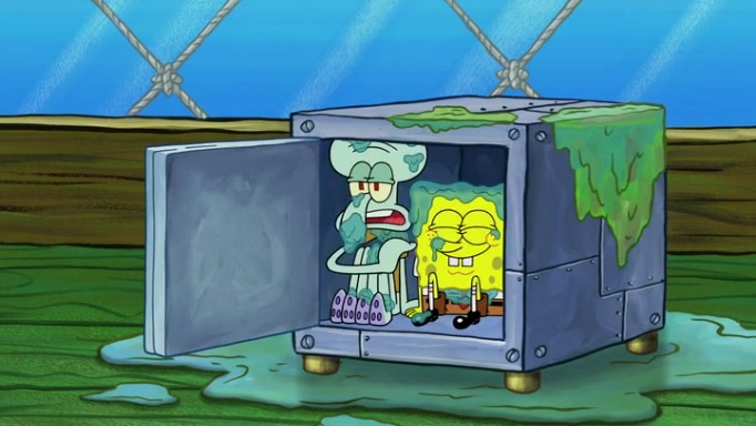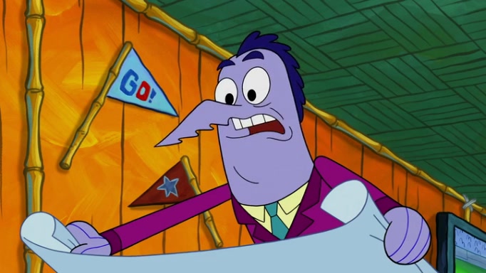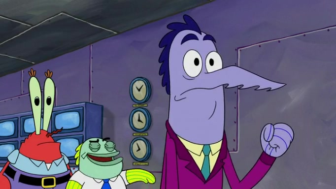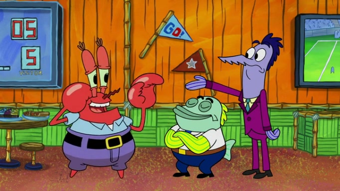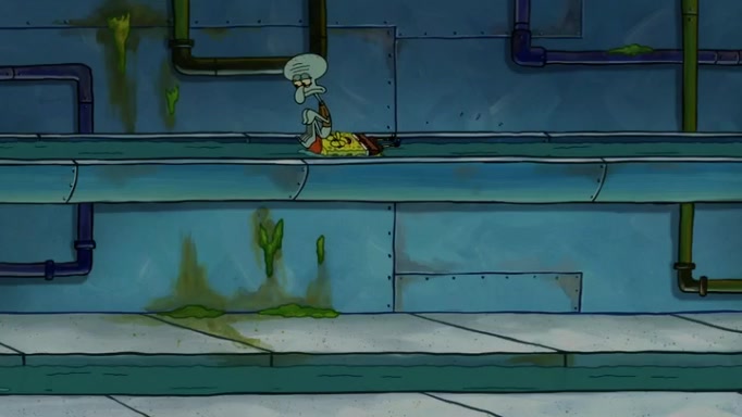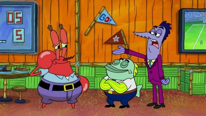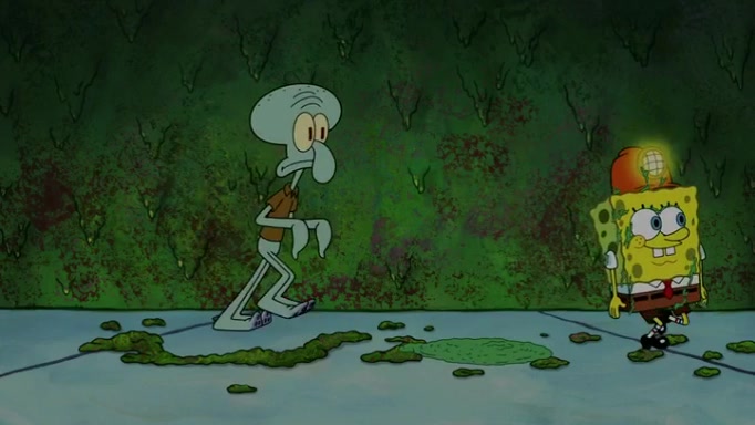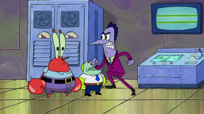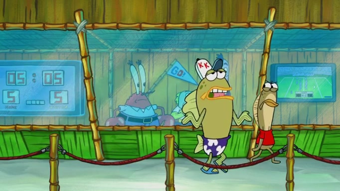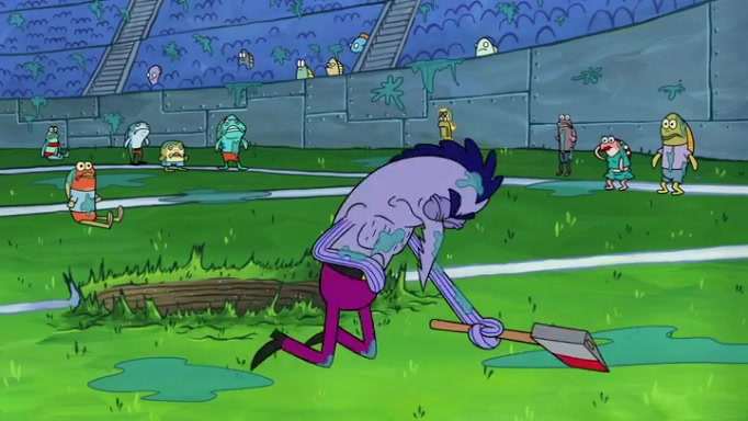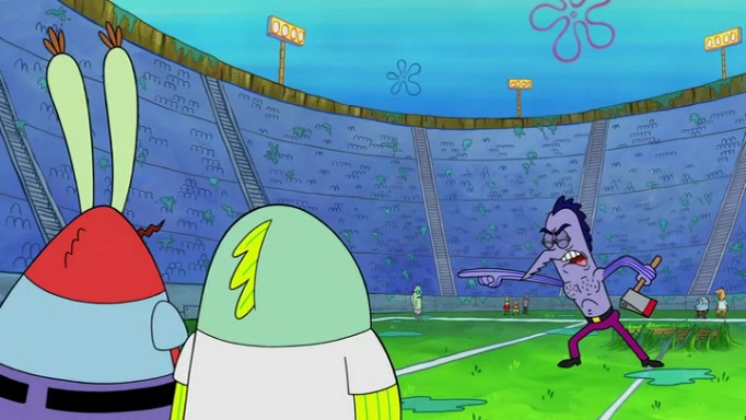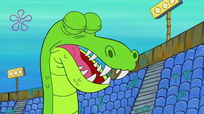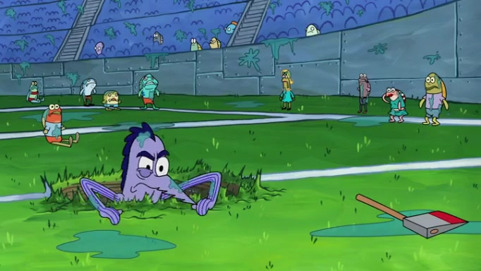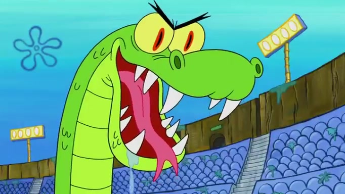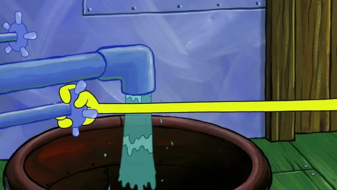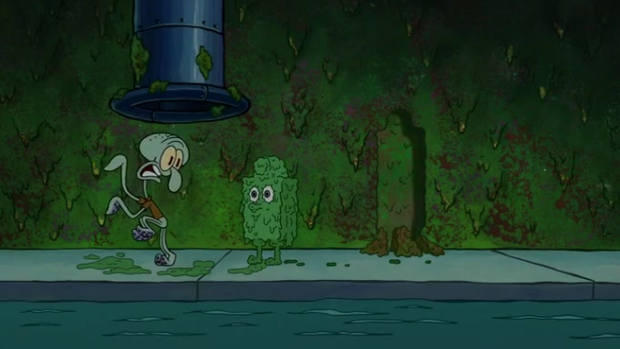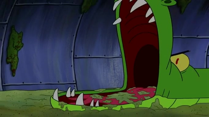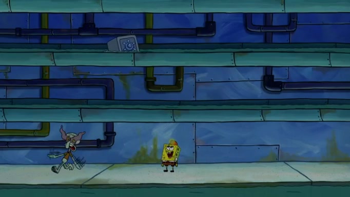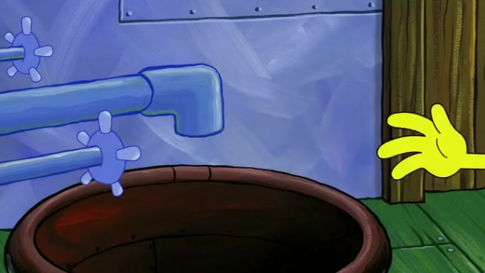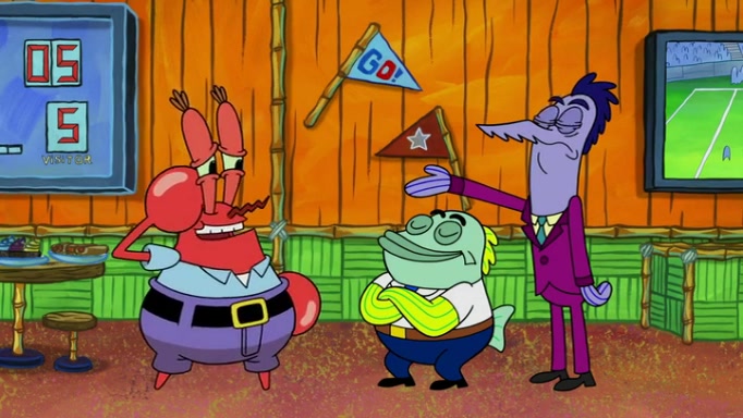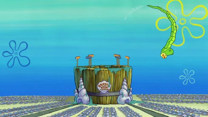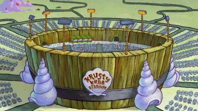 At the Krusty Krab Stadium, Mr. Krabs can be seen talking to Crupski and Charlton Hawkfish about Mr. Krabs buying the stadium. Customers outside are complaining about the plumbing an Charlton is angered to not only see that the pipes have a reducer in it, but is also made out of cardboard. Charlton worries that the pipes won't hold but Crupski says it's a way to save money much to the delight of Mr. Krabs. Meanwhile, SpongeBob and Squidward make it to the sewers where they begin their search for the safe. They manage to spot the safe where it gets stuck in the pipes. As Squidward tries to reach for it, the safe gets unstuck and floats away. Squidward fails to grab it again and a couple of lampreys bites at his hands. SpongeBob helps get the lampreys off and spots the safe floating in the distance. SpongeBob and Squidward go after it once more and, suddenly, a large sewer snake emerges from the water.