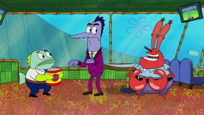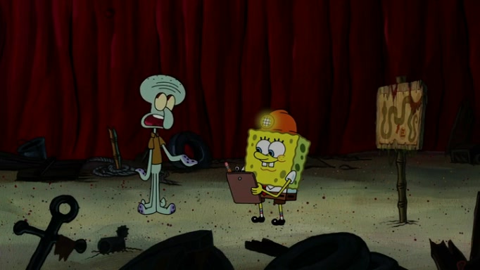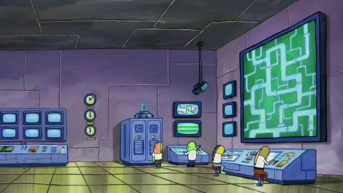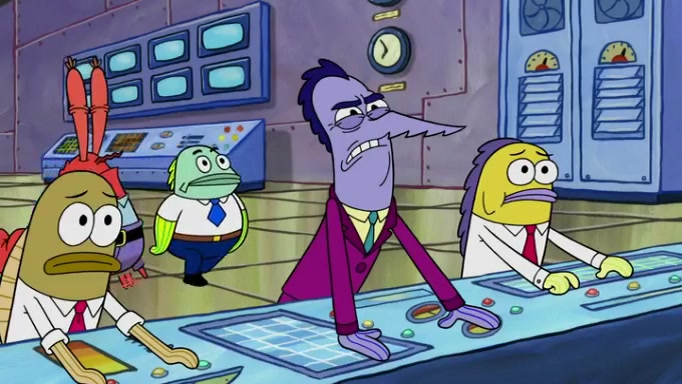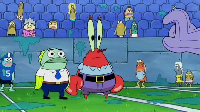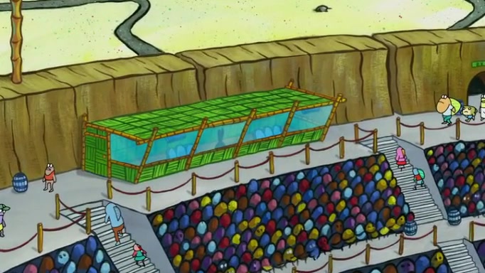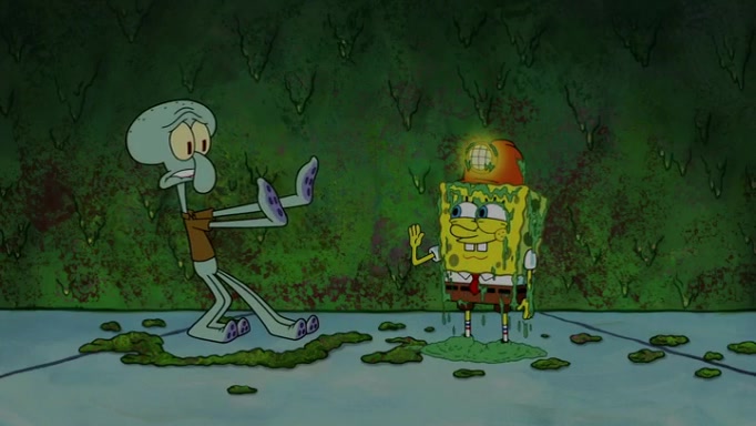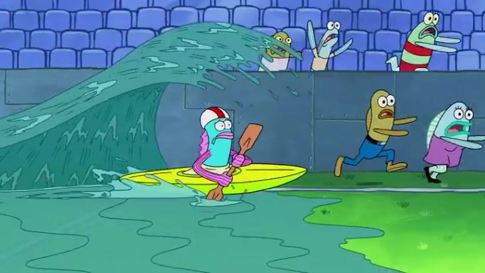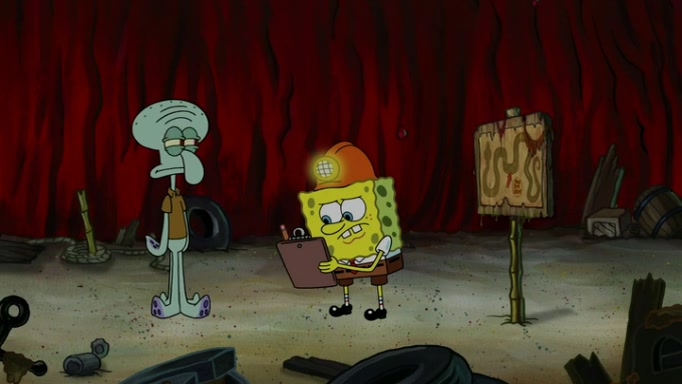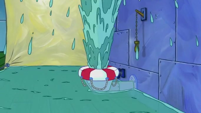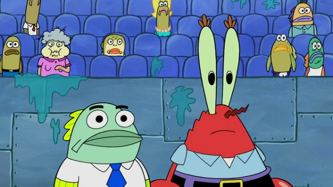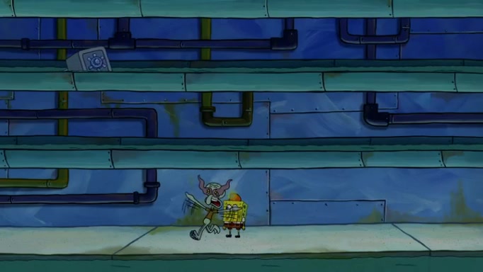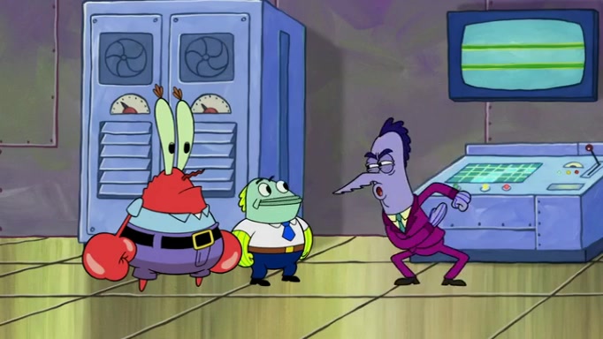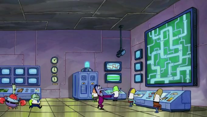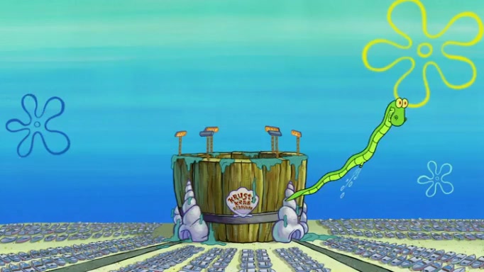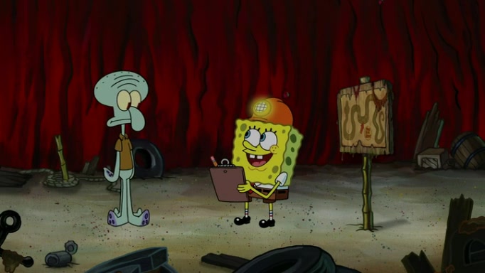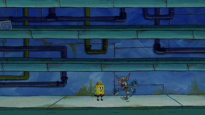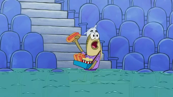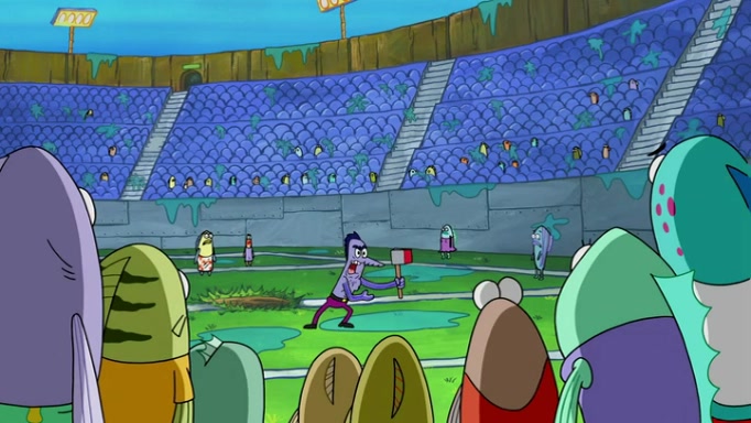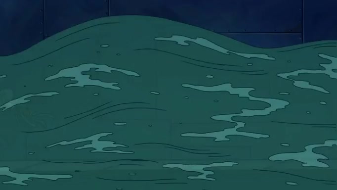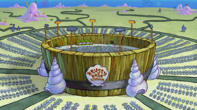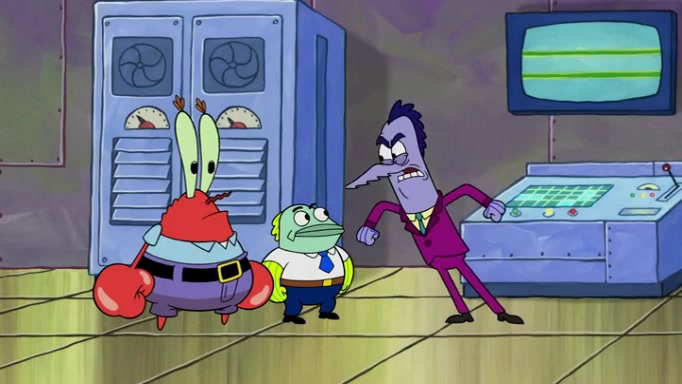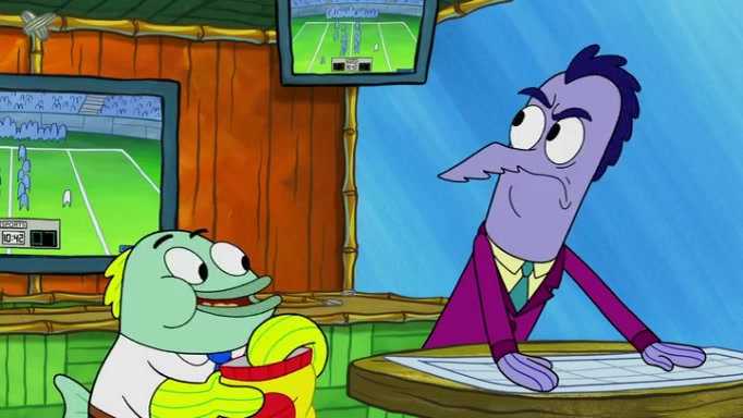 At the Krusty Krab Stadium, Mr. Krabs can be seen talking to Crupski and Charlton Hawkfish about Mr. Krabs buying the stadium. Customers outside are complaining about the plumbing an Charlton is angered to not only see that the pipes have a reducer in it, but is also made out of cardboard. Charlton worries that the pipes won't hold but Crupski says it's a way to save money much to the delight of Mr. Krabs. Meanwhile, SpongeBob and Squidward make it to the sewers where they begin their search for the safe. They manage to spot the safe where it gets stuck in the pipes. As Squidward tries to reach for it, the safe gets unstuck and floats away. Squidward fails to grab it again and a couple of lampreys bites at his hands. SpongeBob helps get the lampreys off and spots the safe floating in the distance. SpongeBob and Squidward go after it once more and, suddenly, a large sewer snake emerges from the water.