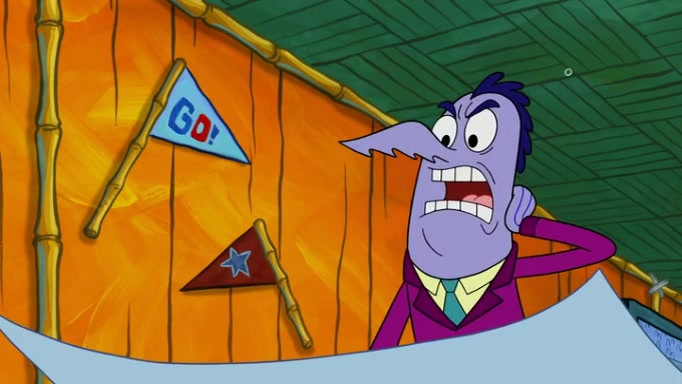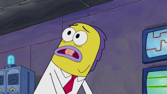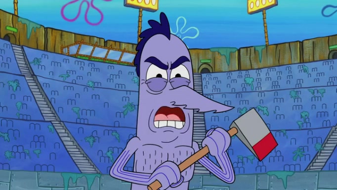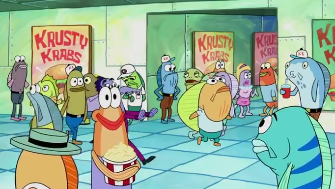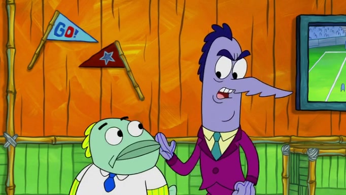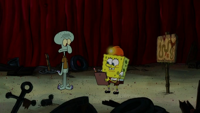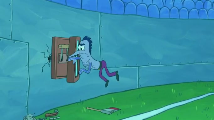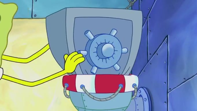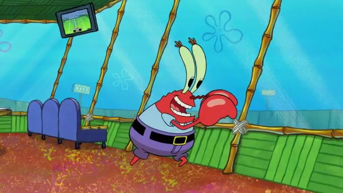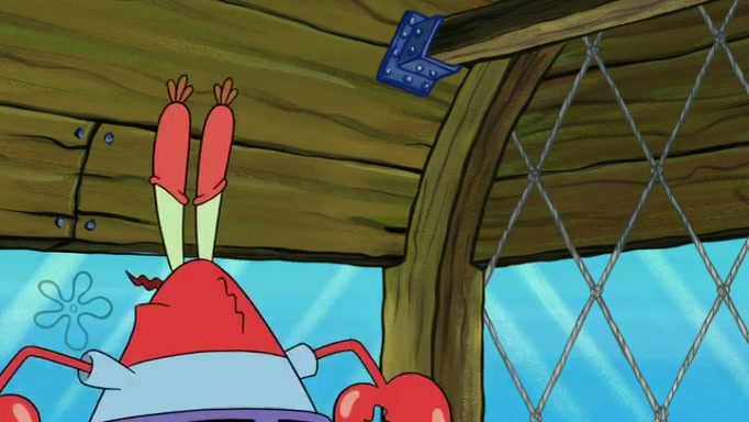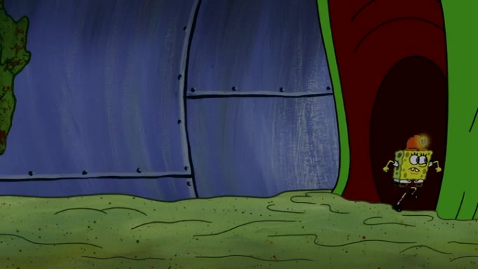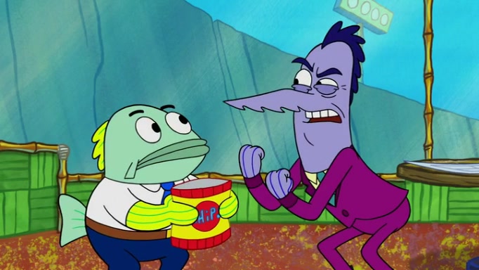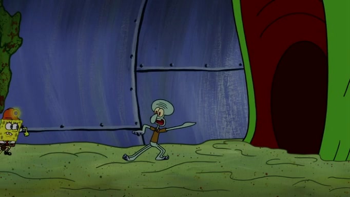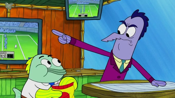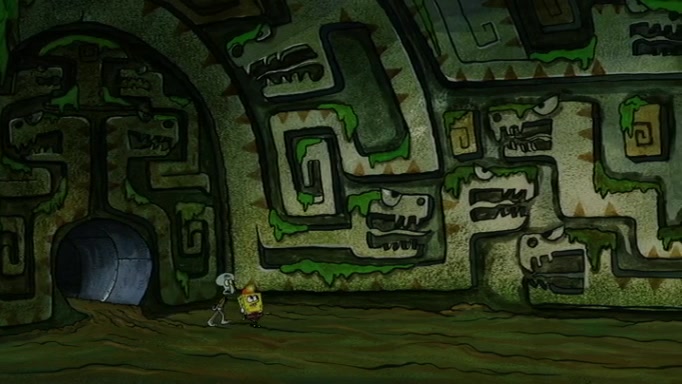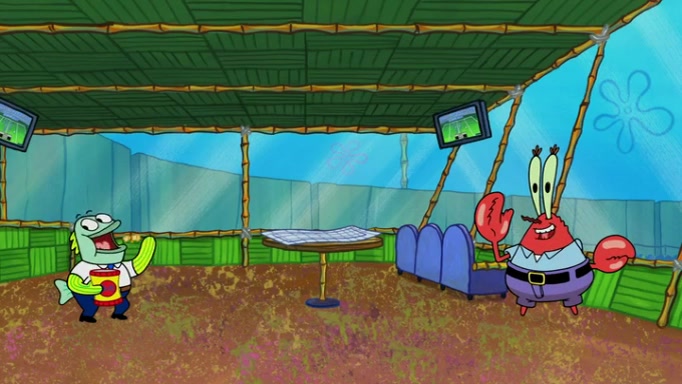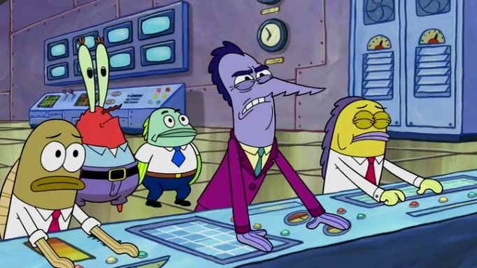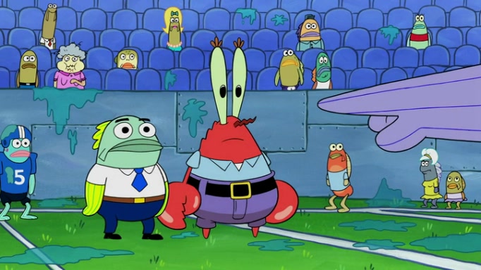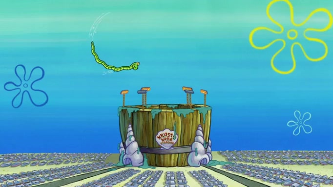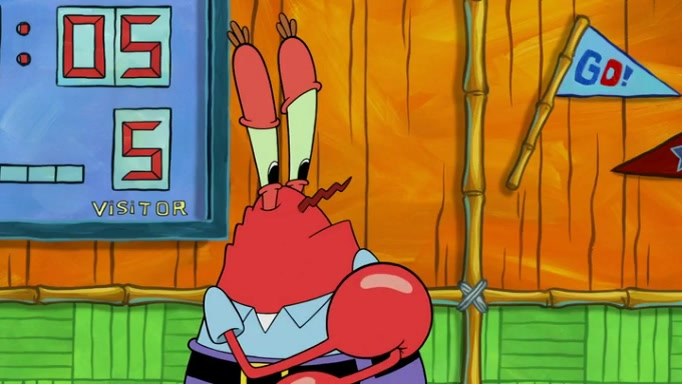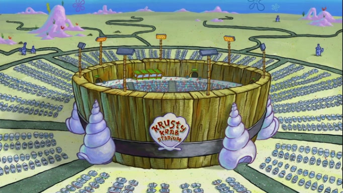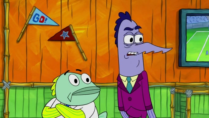 At the Krusty Krab Stadium, Mr. Krabs can be seen talking to Crupski and Charlton Hawkfish about Mr. Krabs buying the stadium. Customers outside are complaining about the plumbing an Charlton is angered to not only see that the pipes have a reducer in it, but is also made out of cardboard. Charlton worries that the pipes won't hold but Crupski says it's a way to save money much to the delight of Mr. Krabs. Meanwhile, SpongeBob and Squidward make it to the sewers where they begin their search for the safe. They manage to spot the safe where it gets stuck in the pipes. As Squidward tries to reach for it, the safe gets unstuck and floats away. Squidward fails to grab it again and a couple of lampreys bites at his hands. SpongeBob helps get the lampreys off and spots the safe floating in the distance. SpongeBob and Squidward go after it once more and, suddenly, a large sewer snake emerges from the water.