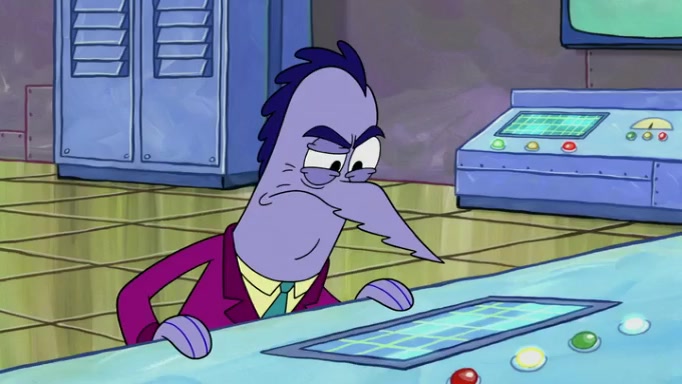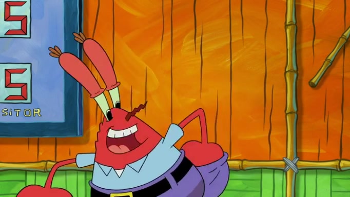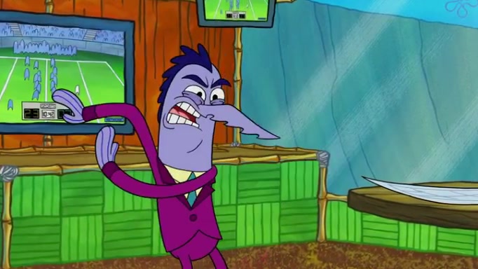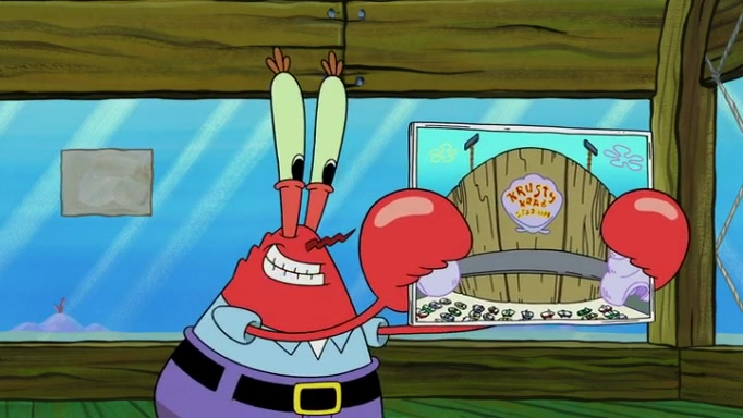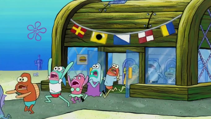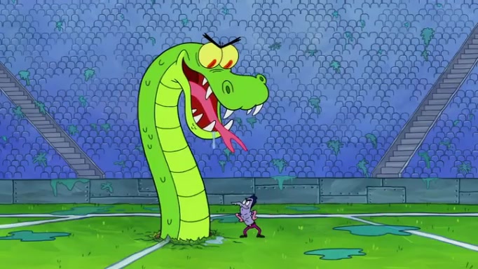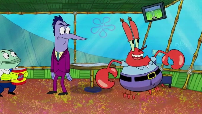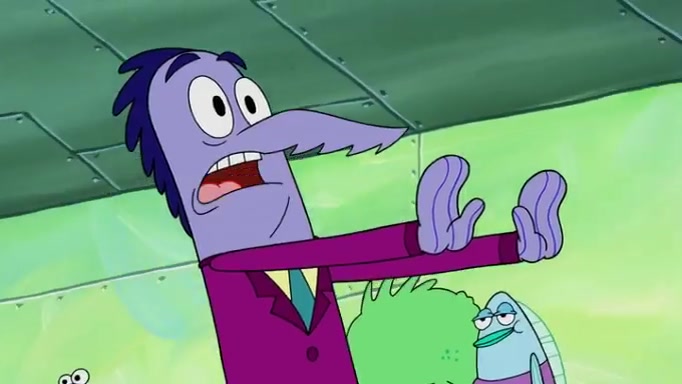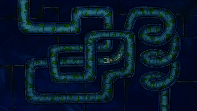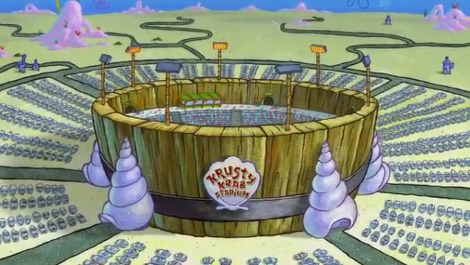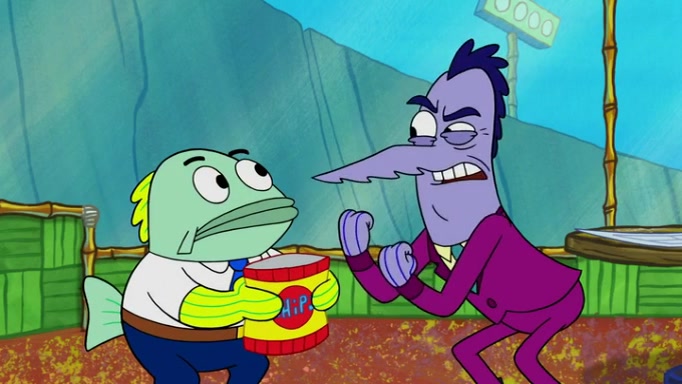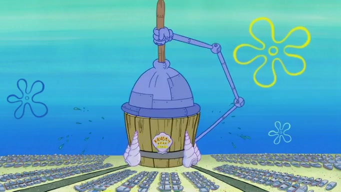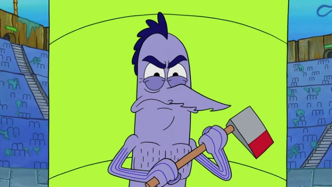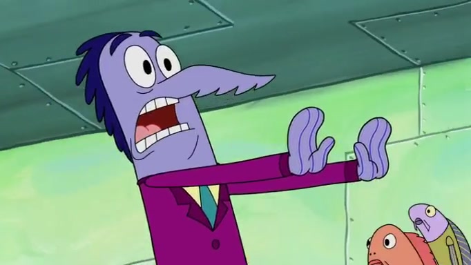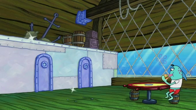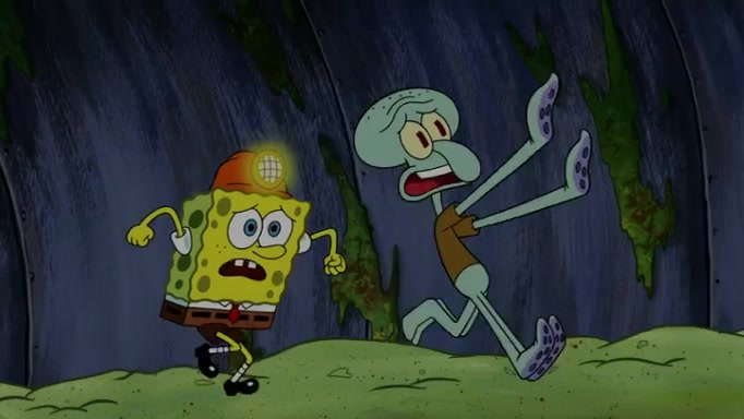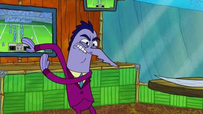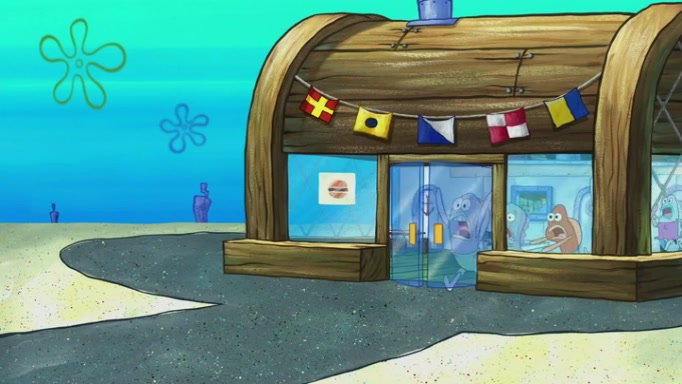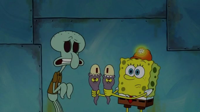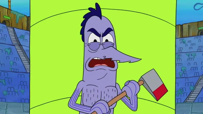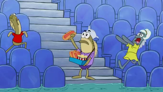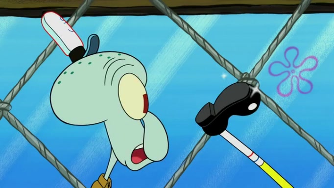 At the Krusty Krab Stadium, Mr. Krabs can be seen talking to Crupski and Charlton Hawkfish about Mr. Krabs buying the stadium. Customers outside are complaining about the plumbing an Charlton is angered to not only see that the pipes have a reducer in it, but is also made out of cardboard. Charlton worries that the pipes won't hold but Crupski says it's a way to save money much to the delight of Mr. Krabs. Meanwhile, SpongeBob and Squidward make it to the sewers where they begin their search for the safe. They manage to spot the safe where it gets stuck in the pipes. As Squidward tries to reach for it, the safe gets unstuck and floats away. Squidward fails to grab it again and a couple of lampreys bites at his hands. SpongeBob helps get the lampreys off and spots the safe floating in the distance. SpongeBob and Squidward go after it once more and, suddenly, a large sewer snake emerges from the water.