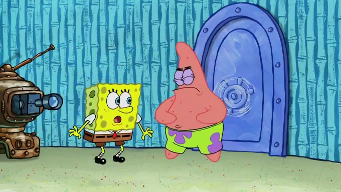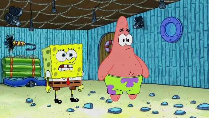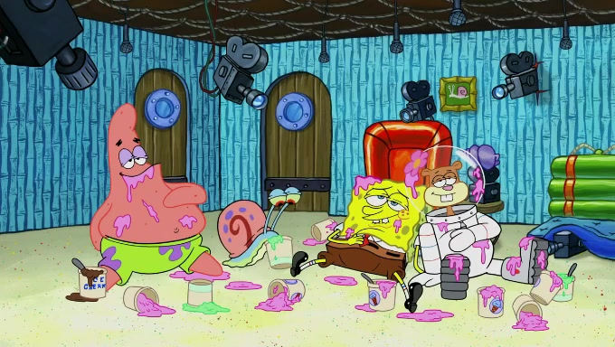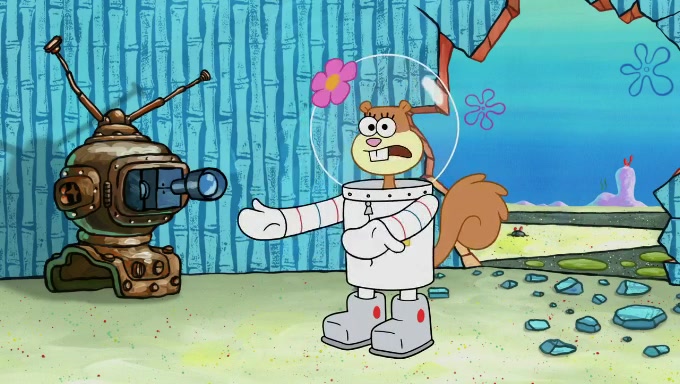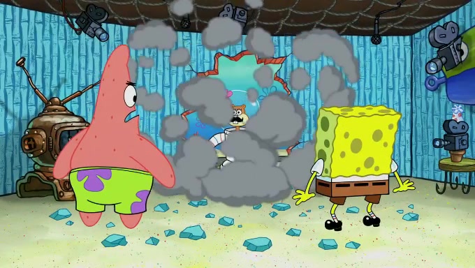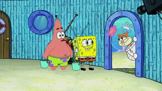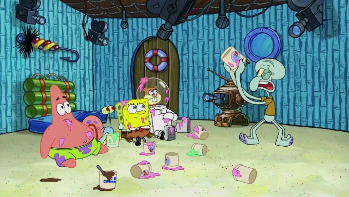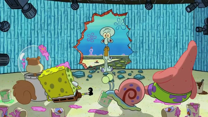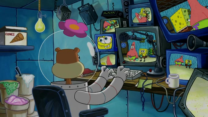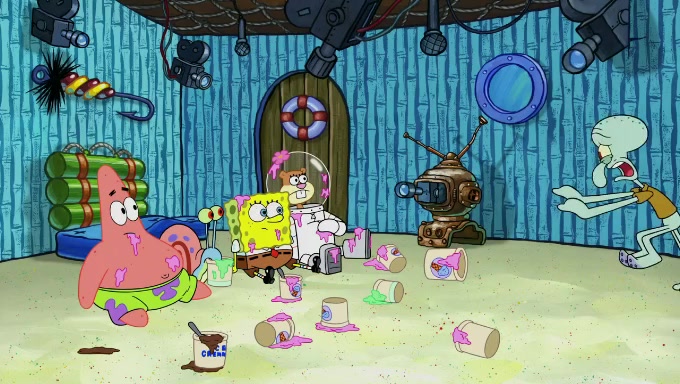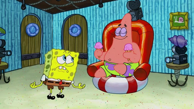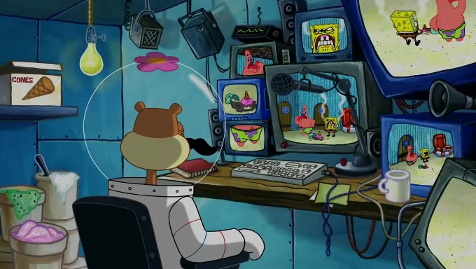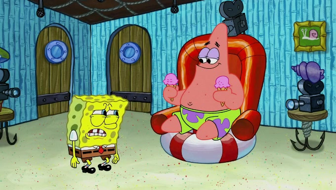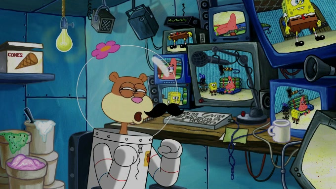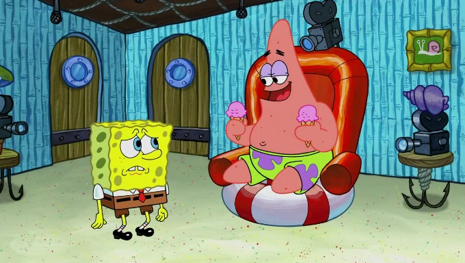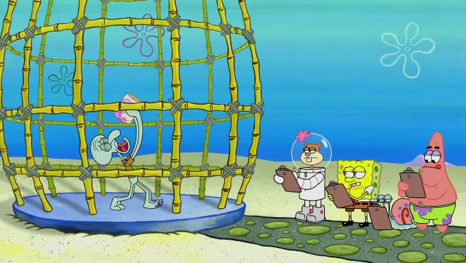 Sandy then realizes Patrick is taking advantage of his privileges and taking advantage of SpongeBob due to his power of being in charge. SpongeBob angrily fights back, with Gary telling Sandy that the situation is bad. She runs towards the door and asks them to open it, but they have a fight about who opens it for her and she is forced to break the door down. Still wearing the mustache, Patrick believes that she is a real ice cream lady and asks her to tell SpongeBob to open the door. She then reveals herself to Patrick, shocking him. Sandy reveals her experiment towards SpongeBob and Patrick. She shows them the cameras and microphones which leads to their affected behavior again, with SpongeBob upset that Gary was in on it too. Upon hearing this, Patrick realized that he got carried away with being in charge and apologized to SpongeBob for his selfish behavior with him saying that he deserved a Z-. SpongeBob tells him not to be so hard on himself as it was the experiment's fault, causing Patrick to blame science. Sandy tells them that they all get an A+ and ice cream. The episode wraps up to Squidward who is begging for a drop of the ice cream which Sandy, SpongeBob, Patrick, and Gary all ate, and they end up observing Squidward's desire for the ice cream in the house, now revealed to be a cage.