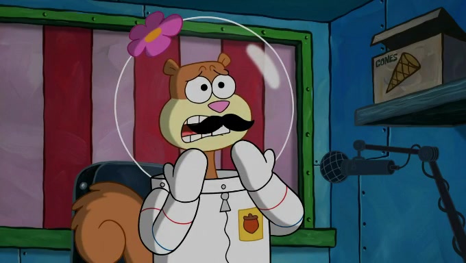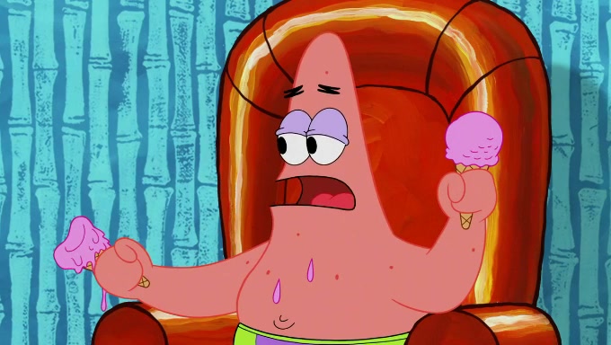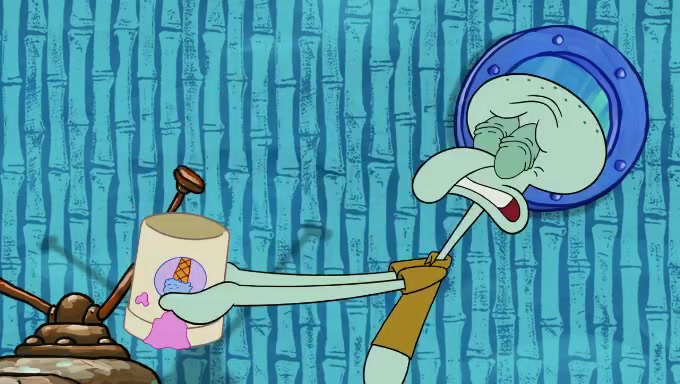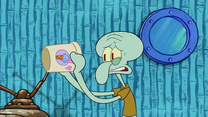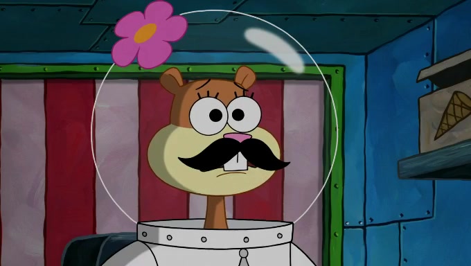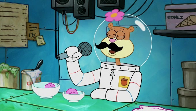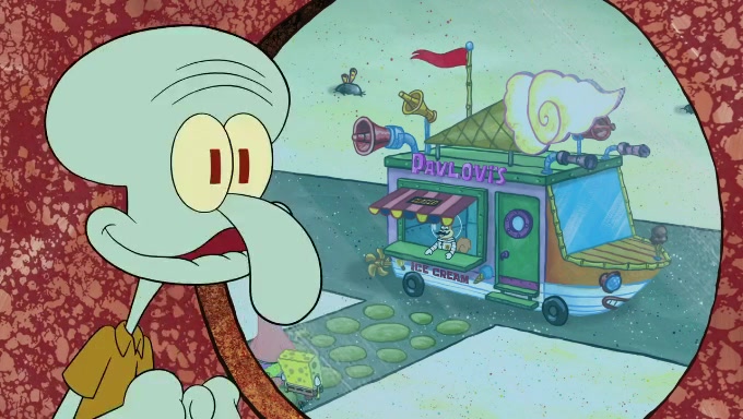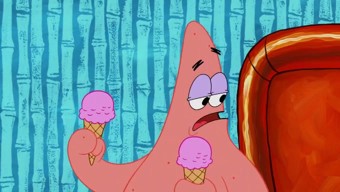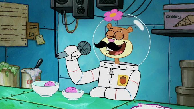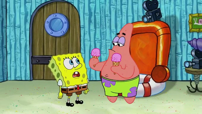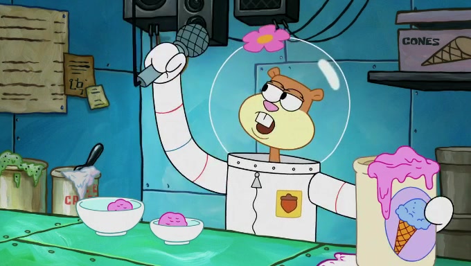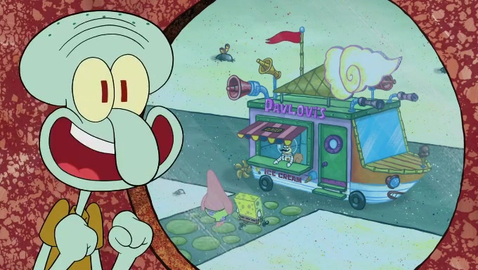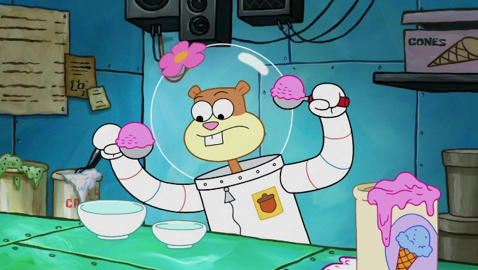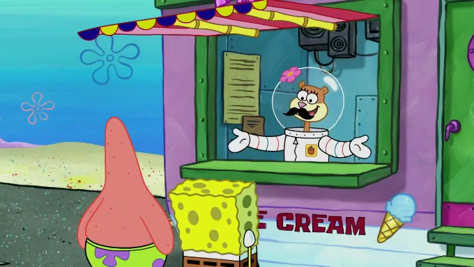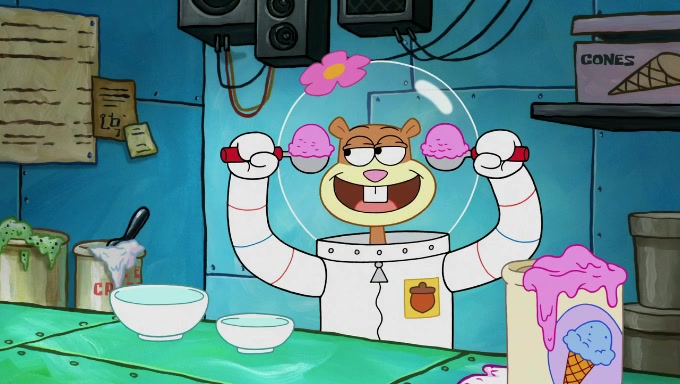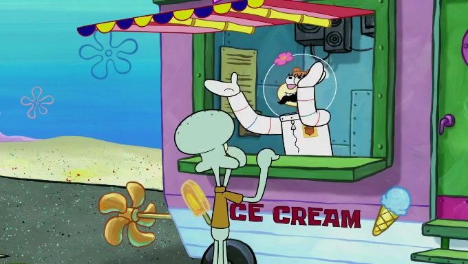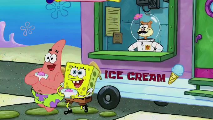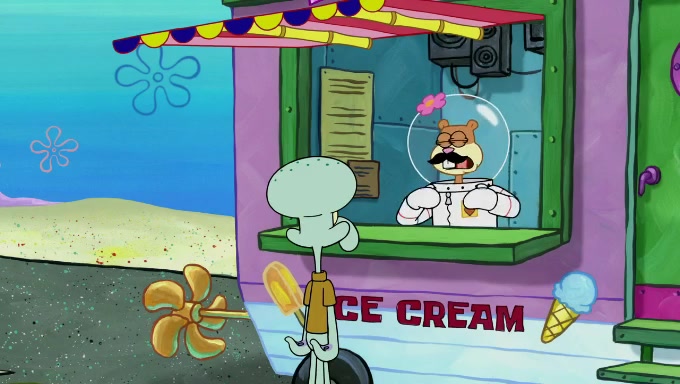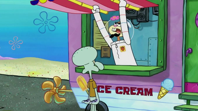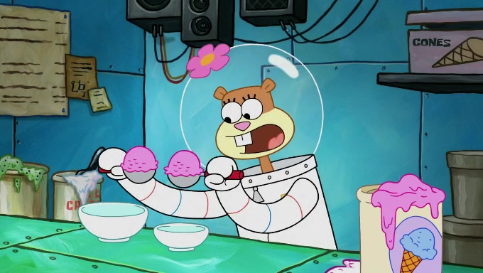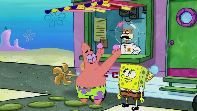 Sandy then starts her second experiment by putting two scoops of the same amount of ice cream into two different sized bowls to confuse Patrick, which she gives to the two disguised as a mustached ice cream man. Squidward tries to get the ice cream, but when he comes, Sandy says the ice cream is sold out and slams the window on his nose, leaving him annoyed. Patrick likes the bigger bowl but believes the ice cream in the other bowl is bigger and SpongeBob and Patrick constantly trade before Patrick says the only way for it to be fair is for him to eat both, causing SpongeBob to protest before Patrick selfishly reminds him that he is in charge.