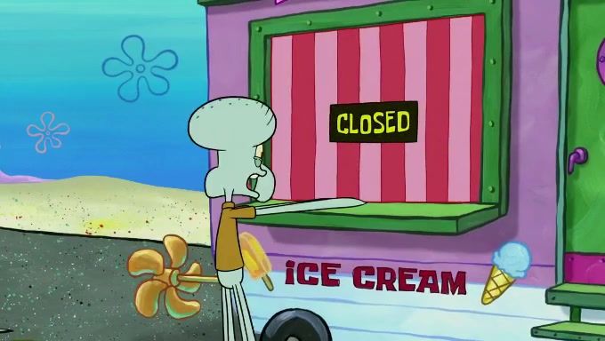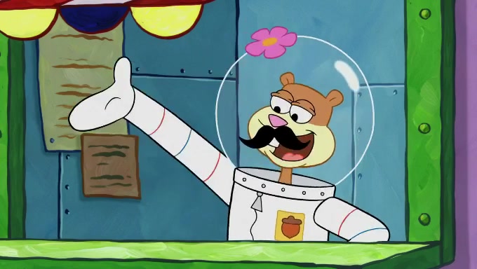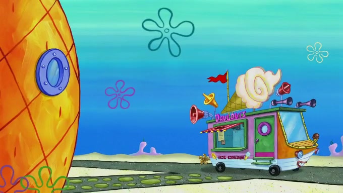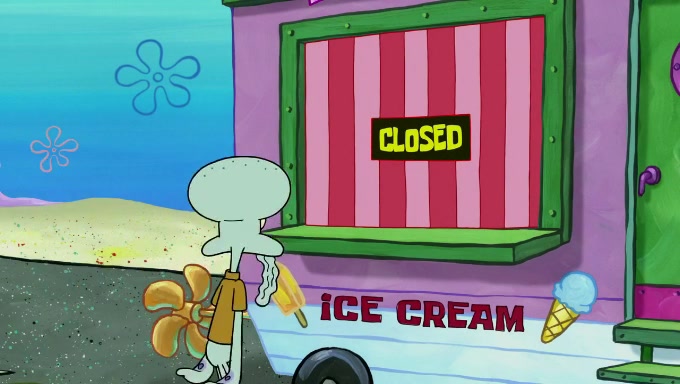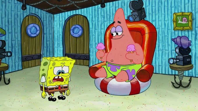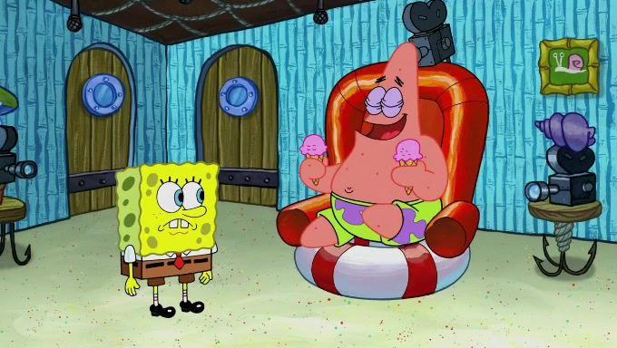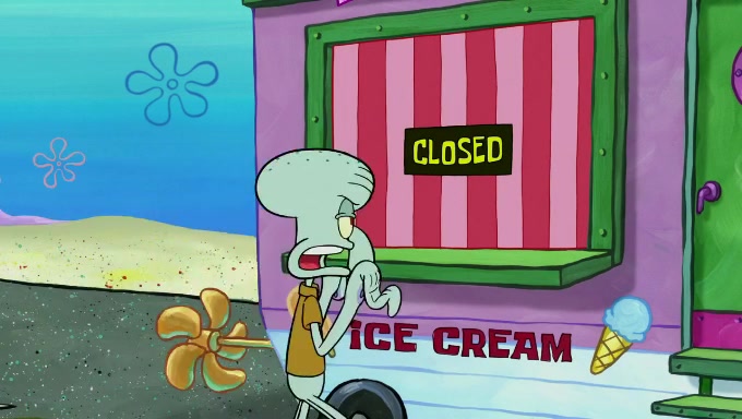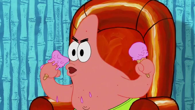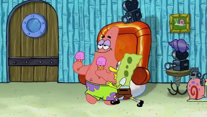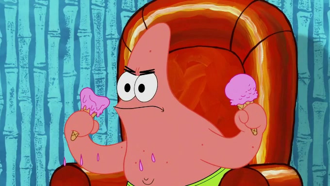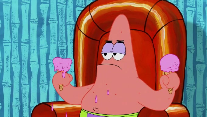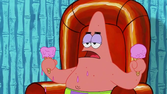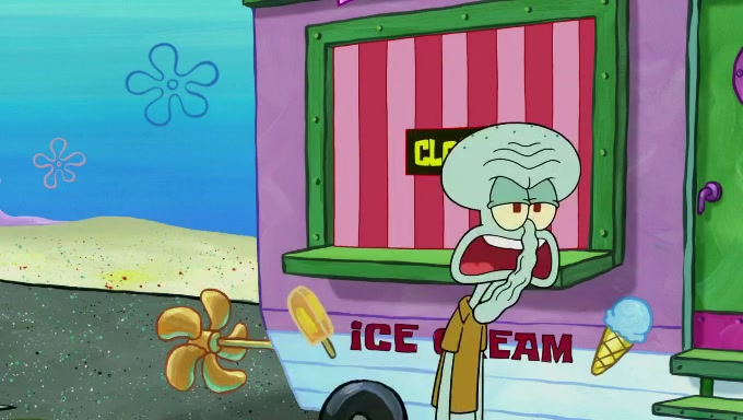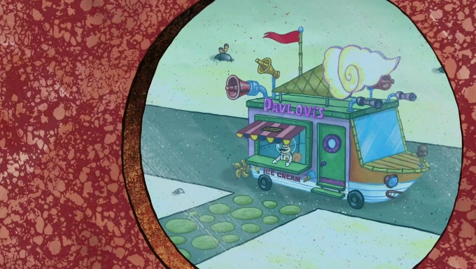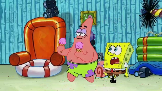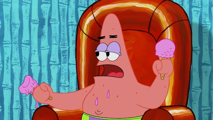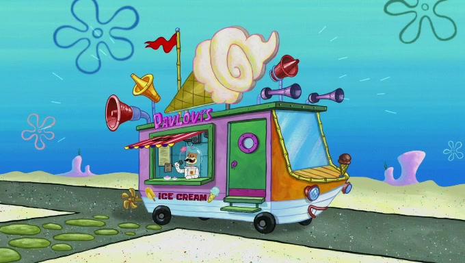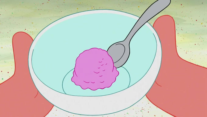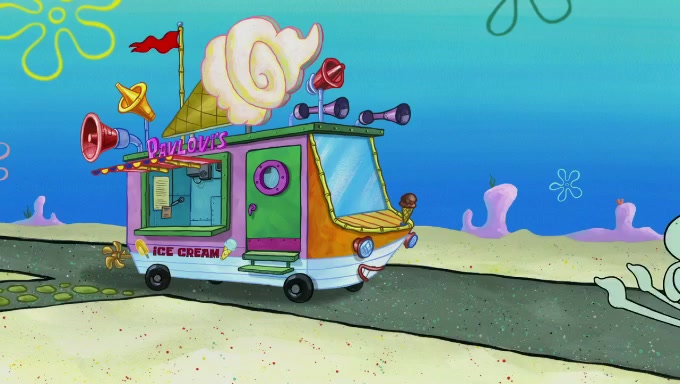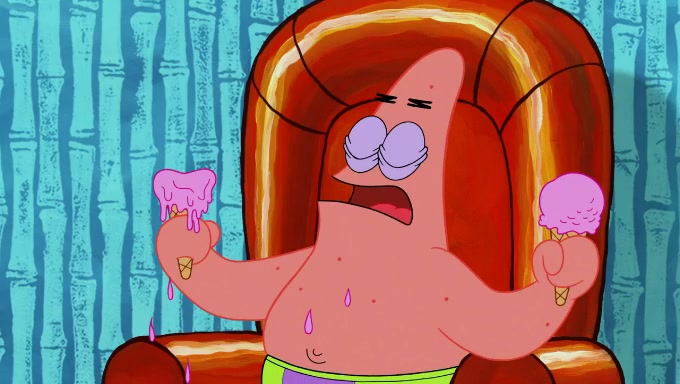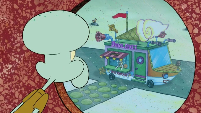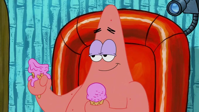 Sandy then starts her second experiment by putting two scoops of the same amount of ice cream into two different sized bowls to confuse Patrick, which she gives to the two disguised as a mustached ice cream man. Squidward tries to get the ice cream, but when he comes, Sandy says the ice cream is sold out and slams the window on his nose, leaving him annoyed. Patrick likes the bigger bowl but believes the ice cream in the other bowl is bigger and SpongeBob and Patrick constantly trade before Patrick says the only way for it to be fair is for him to eat both, causing SpongeBob to protest before Patrick selfishly reminds him that he is in charge.
