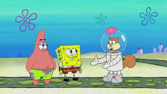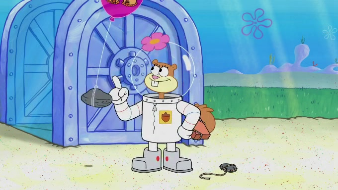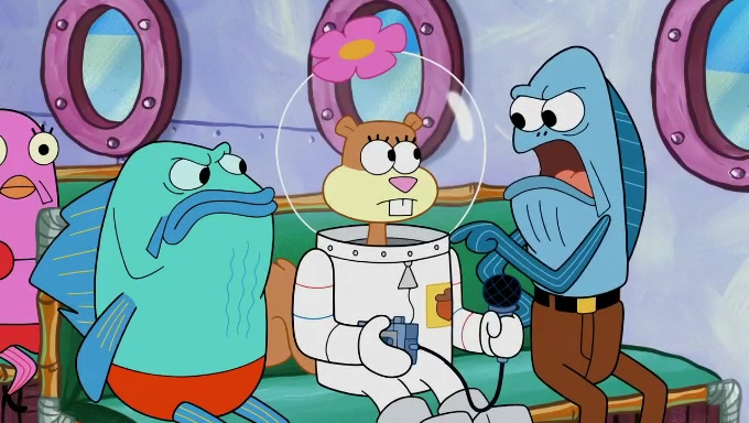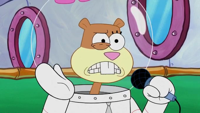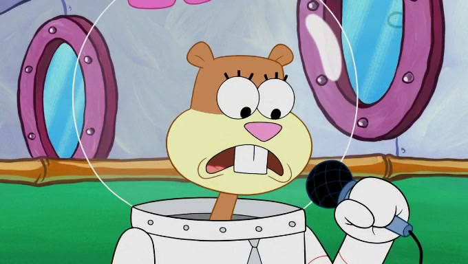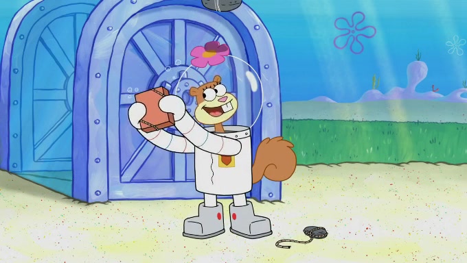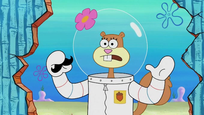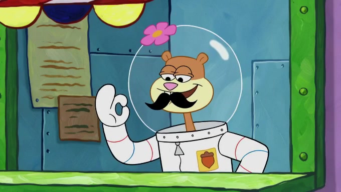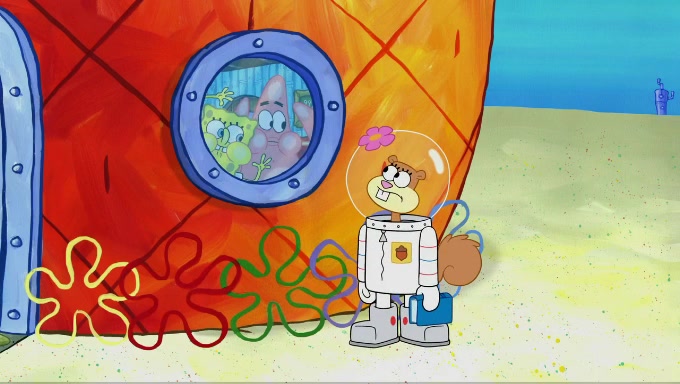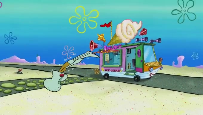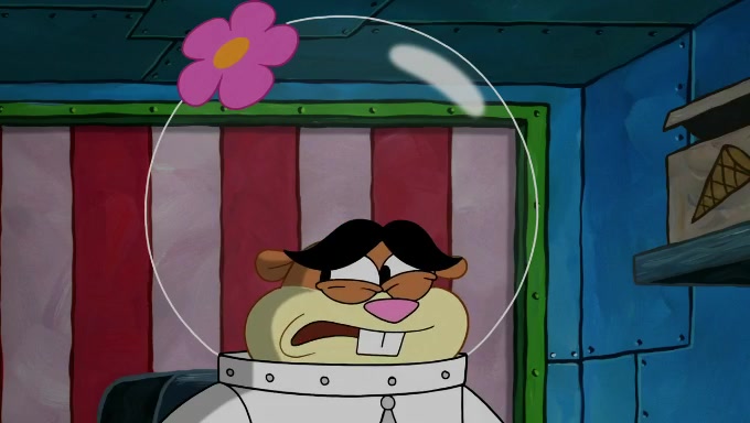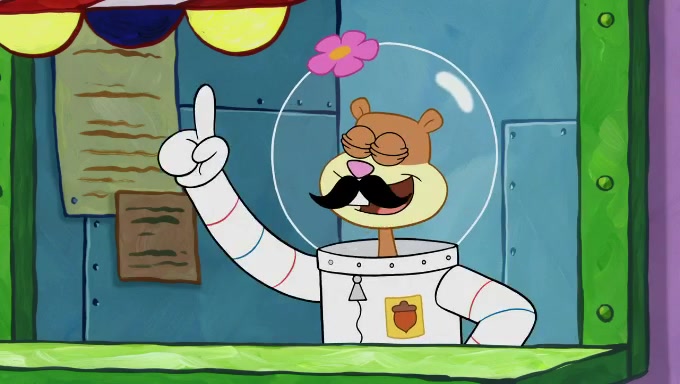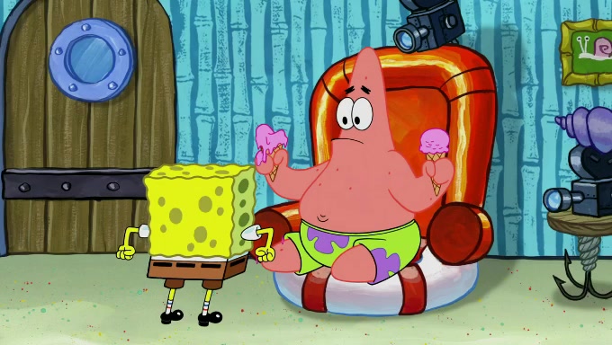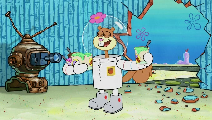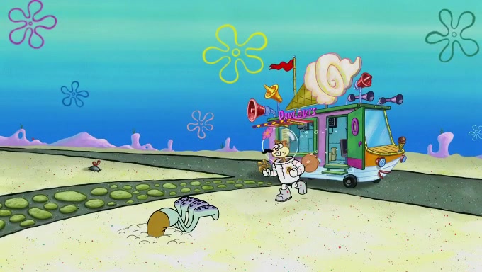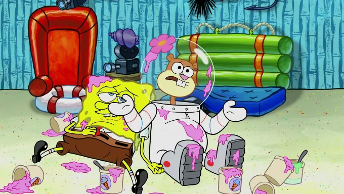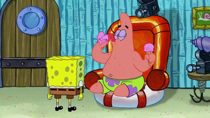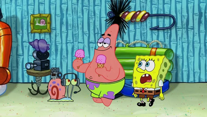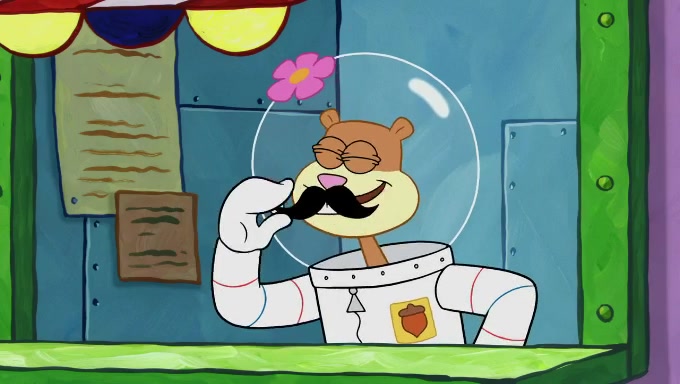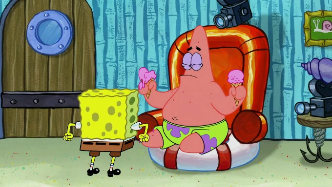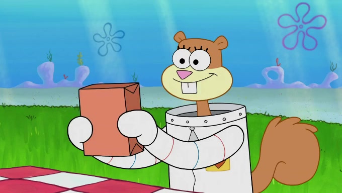 Sandy then starts her second experiment by putting two scoops of the same amount of ice cream into two different sized bowls to confuse Patrick, which she gives to the two disguised as a mustached ice cream man. Squidward tries to get the ice cream, but when he comes, Sandy says the ice cream is sold out and slams the window on his nose, leaving him annoyed. Patrick likes the bigger bowl but believes the ice cream in the other bowl is bigger and SpongeBob and Patrick constantly trade before Patrick says the only way for it to be fair is for him to eat both, causing SpongeBob to protest before Patrick selfishly reminds him that he is in charge.