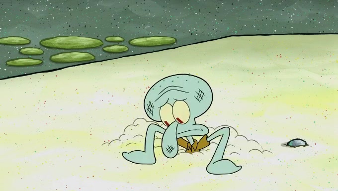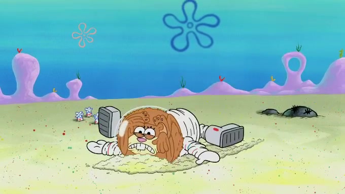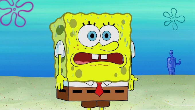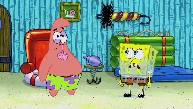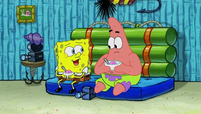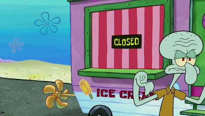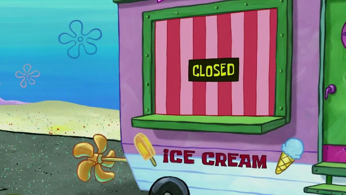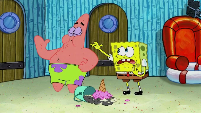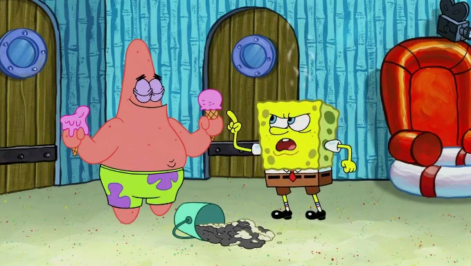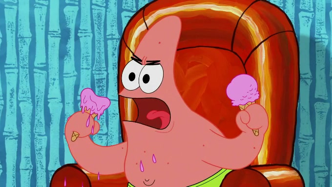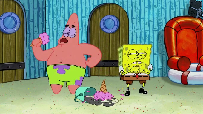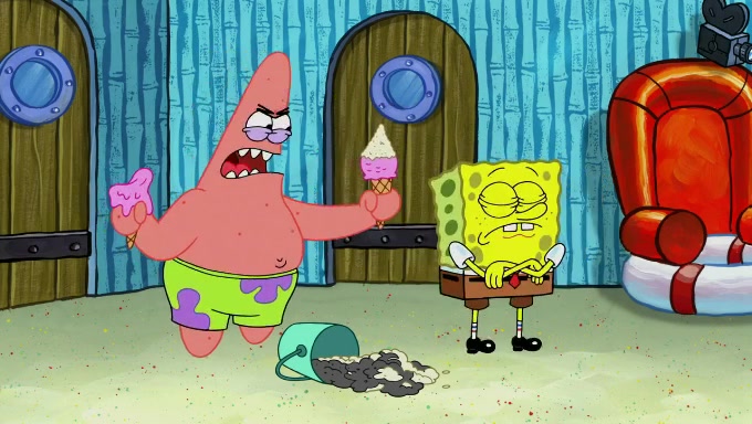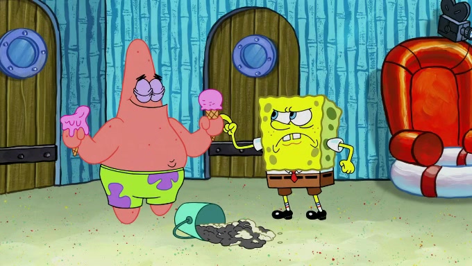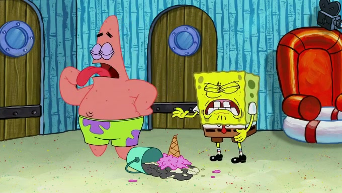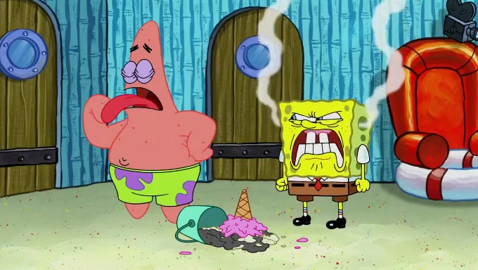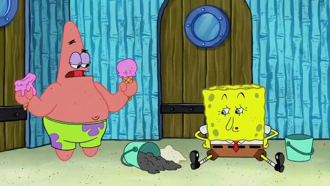 Sandy then begins observing them both in her third experiment when she hands them two ice cream cones exactly the same size. Squidward again tries to get the ice cream but she says that they are sold out again and slams the window on his leg. Patrick takes both cones and SpongeBob begs to have his but Patrick forces him to rub his feet and then count the sand while his ice cream melts. SpongeBob then counts the black sand after finishing with the white sand, but Patrick cruelly knocks over the bucket and mixes it all together, forcing him to start over. Angry, SpongeBob gives Patrick's ice cream "sprinkles" by covering it with white sand, only for Patrick to retaliate by dropping his ice cream in the sand and eating SpongeBob's melted ice cream whole, finally causing SpongeBob's patience to run out.