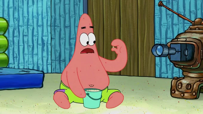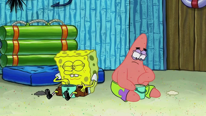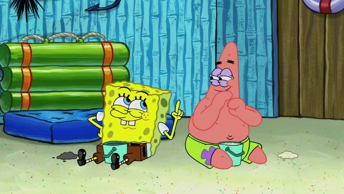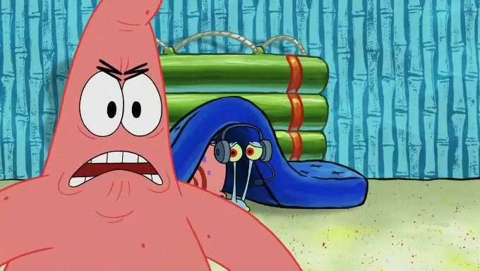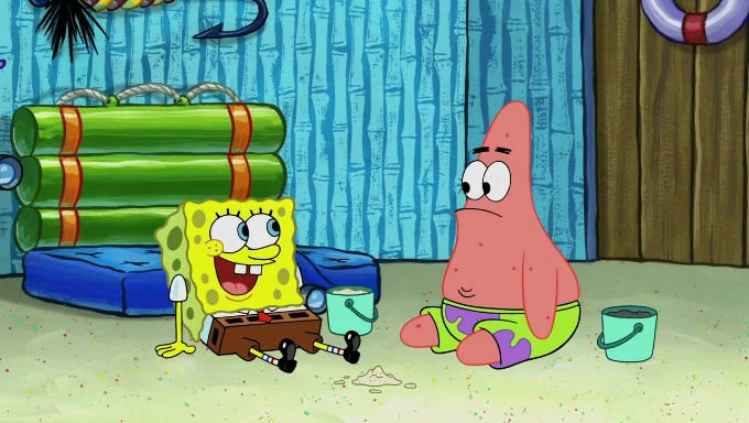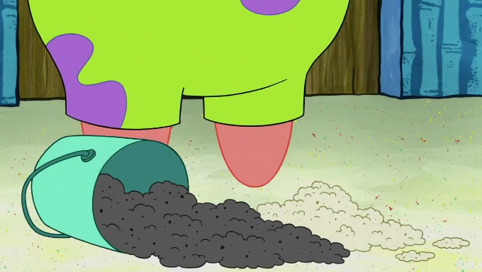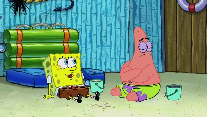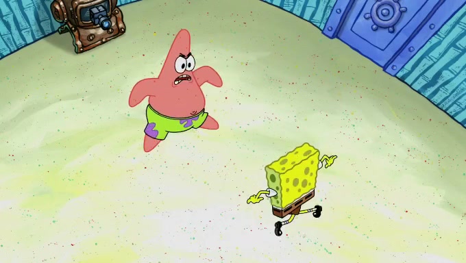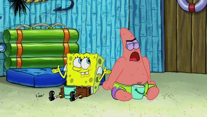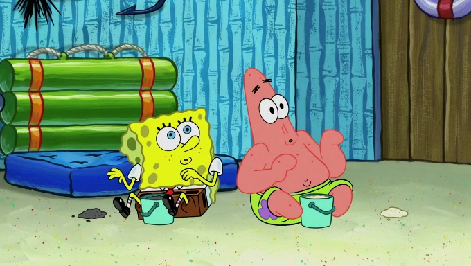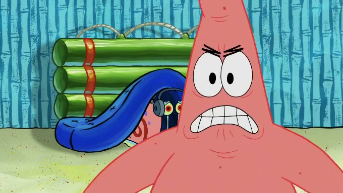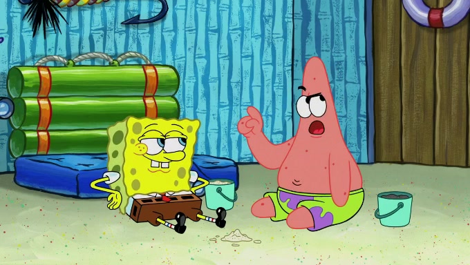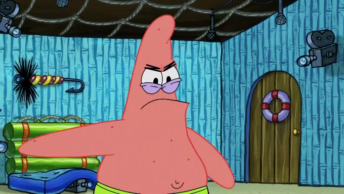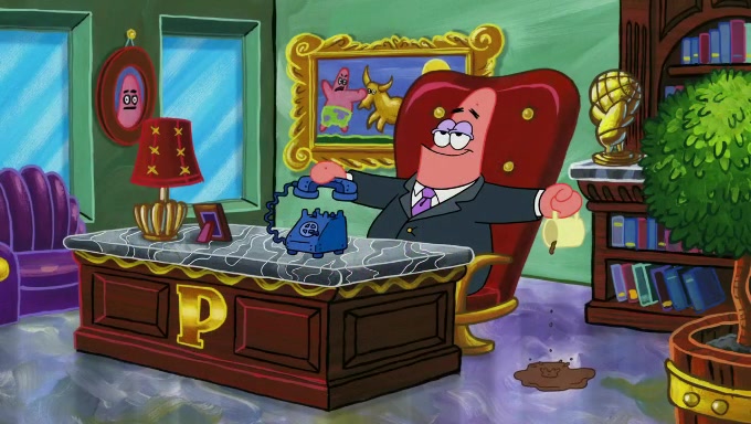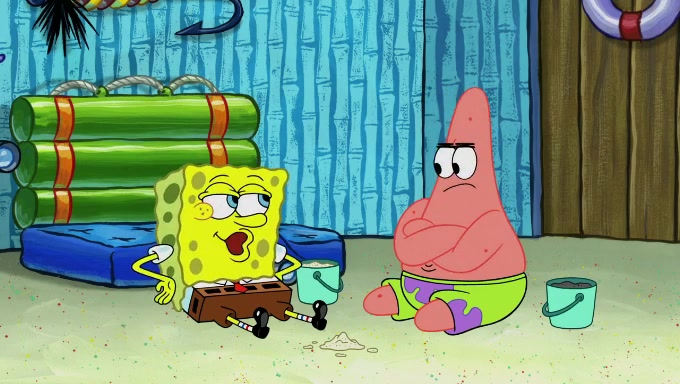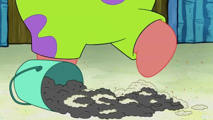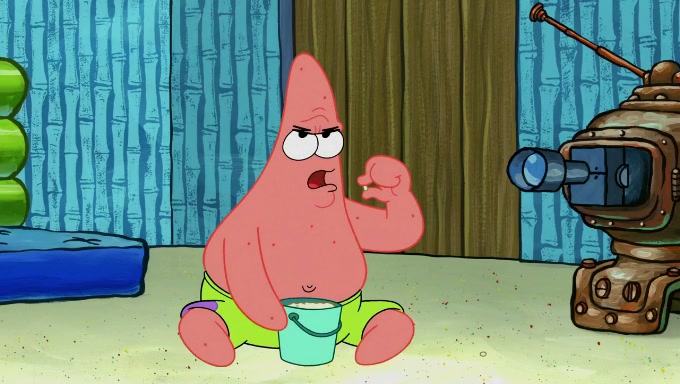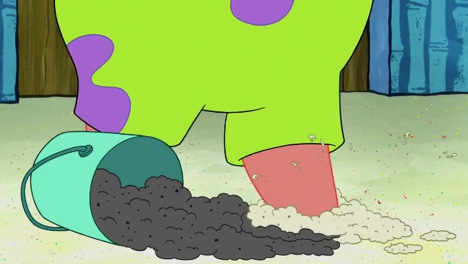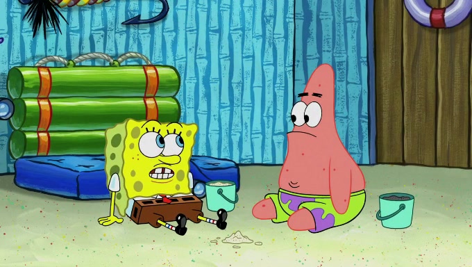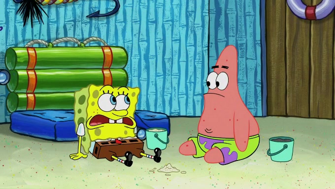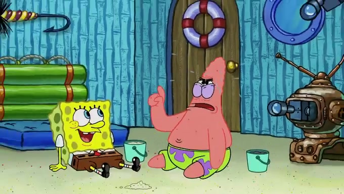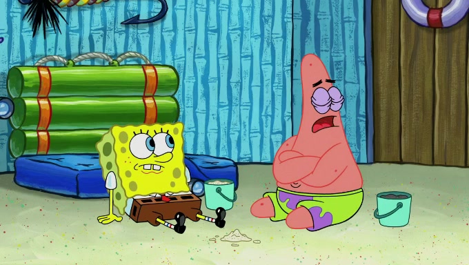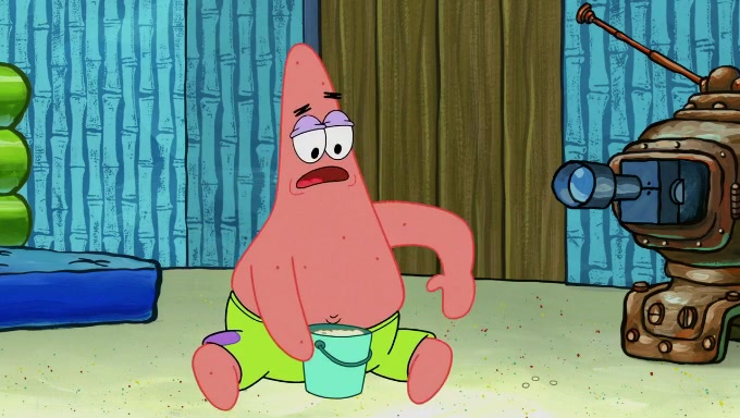 When SpongeBob and Patrick get back home, Patrick is unable to stop thinking about being in charge. SpongeBob asks which method they will use to count the sand, but Patrick does not pay attention and continues to think about the phrase "I'm in charge." After SpongeBob asks how he wants to count the sand, he simply says that first suggestion, which is both of them counting the white sand first and then the black sand. While counting the sand, Patrick continues to think about being in charge and imagines himself running an organization called "Patrick Corp.". When SpongeBob snaps him back into reality, having been stuck at 47 grains, Patrick decides he doesn't like how they are doing it and has SpongeBob count the black sand while he counts the white sand. He has trouble counting the sand but SpongeBob does it flawlessly. Patrick then makes the error of missing the digit in the tens place as SpongeBob has the same digit in the ones place as him, causing him to get frustrated with SpongeBob.