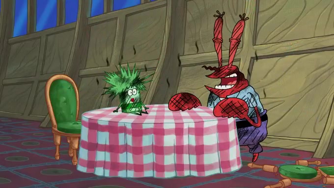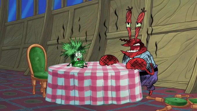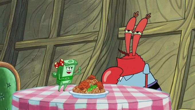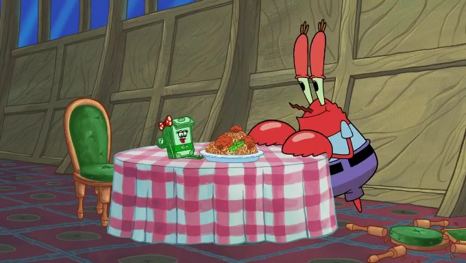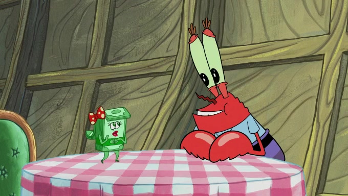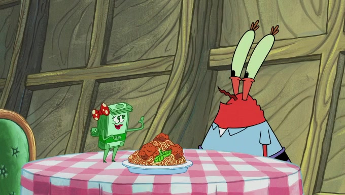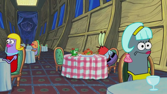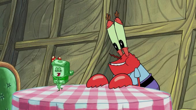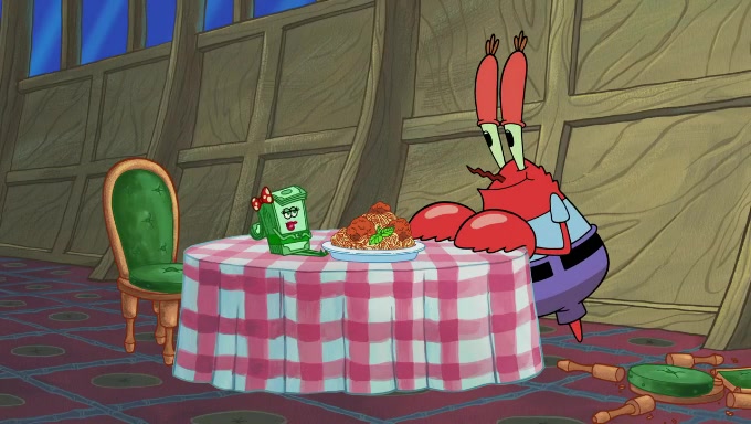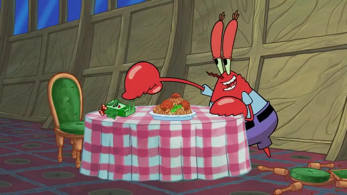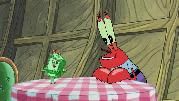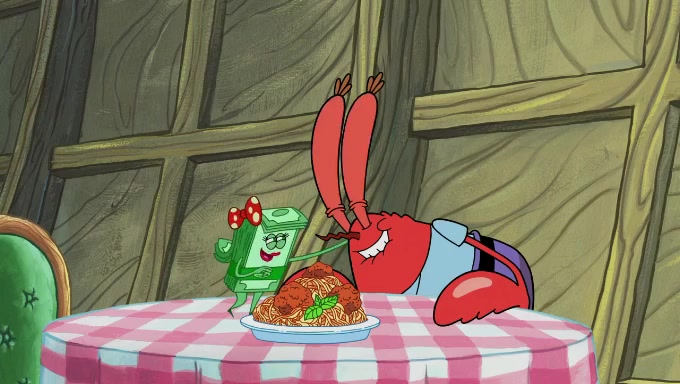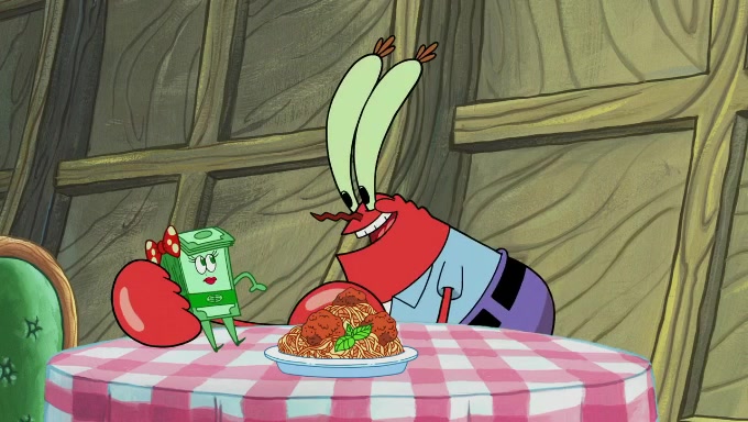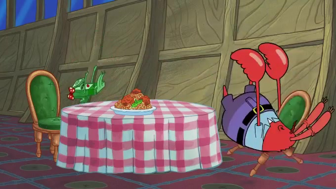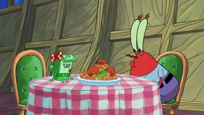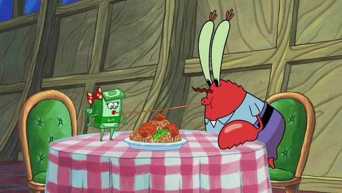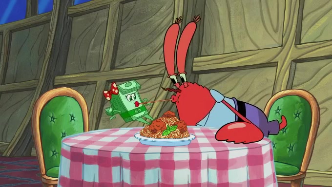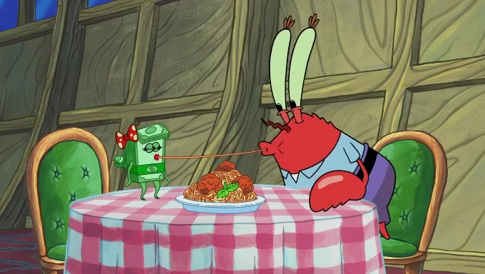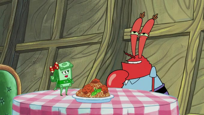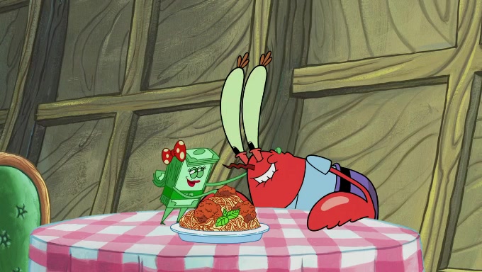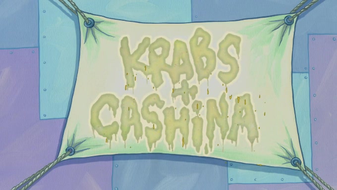 While eating spaghetti at Fancy!, Cashina asks Mr. Krabs if he knows any secrets or formulas. Mr. Krabs mentions that he knows one... but for delicious kisses. He then proceeds to kiss Cashina, but Plankton quickly presses a button that replaces her lips with ones that electrocute him on contact. Nevertheless, he took the kiss well.
