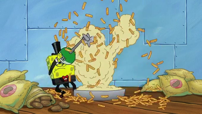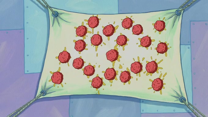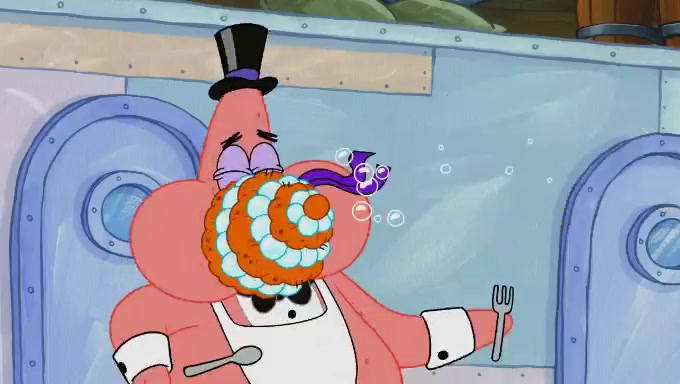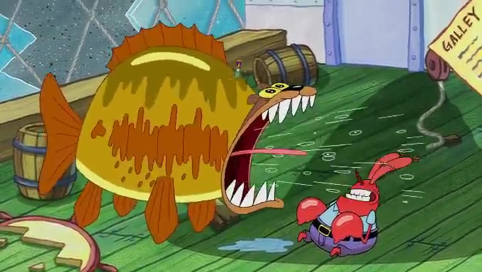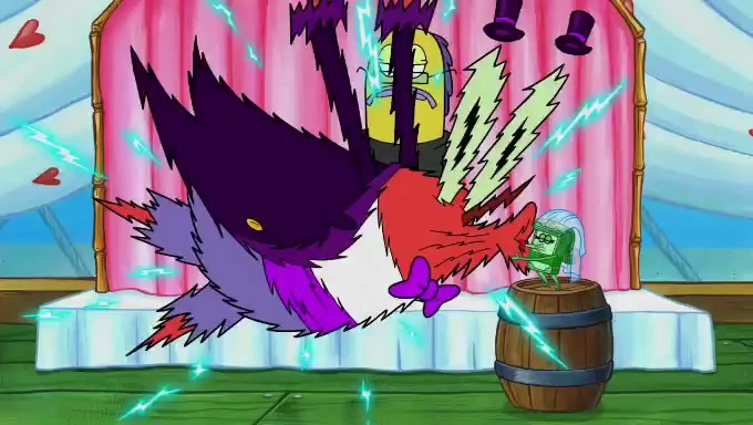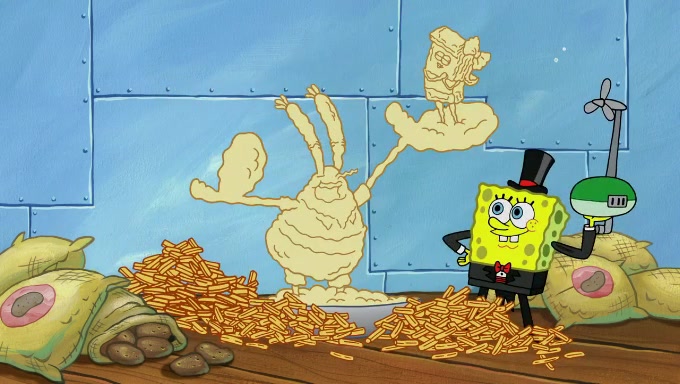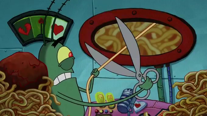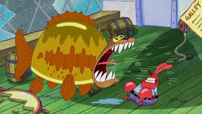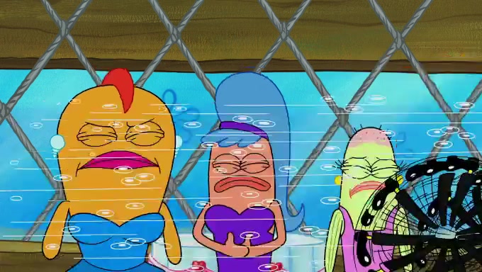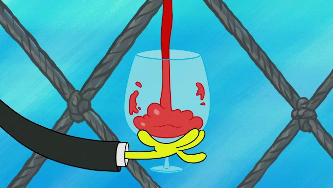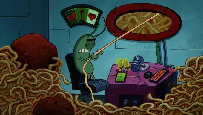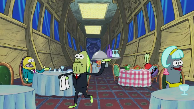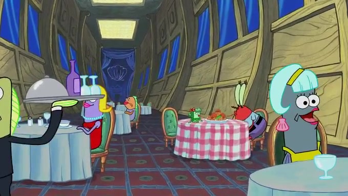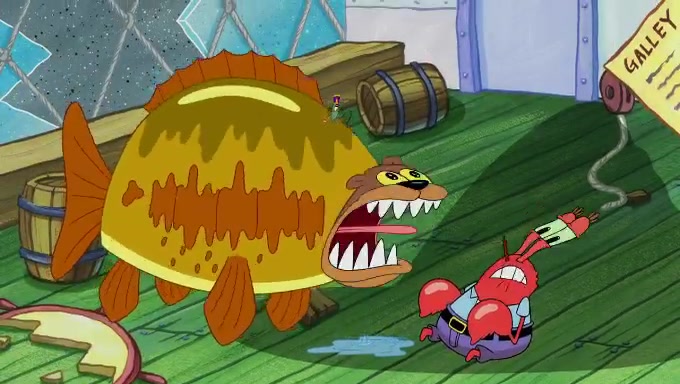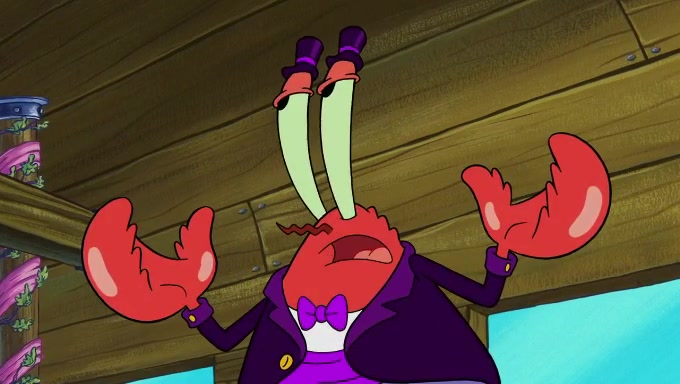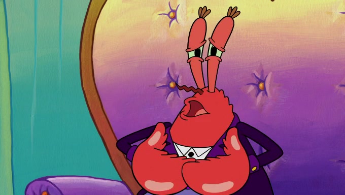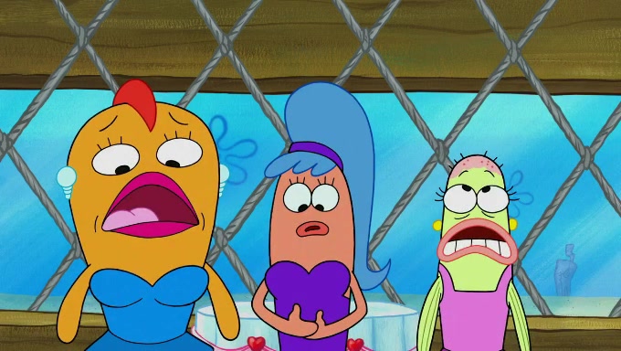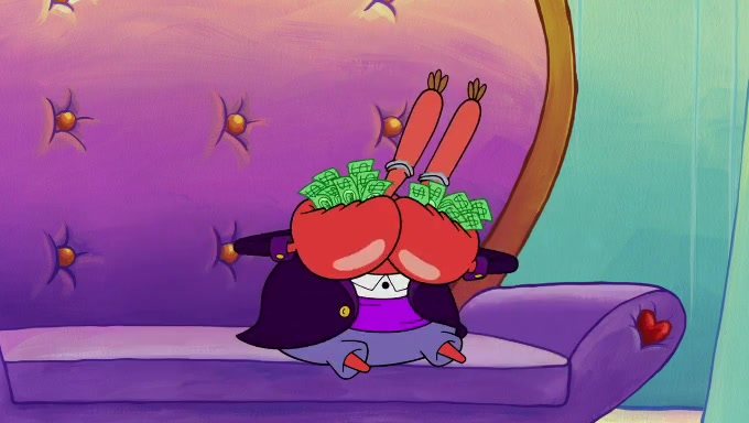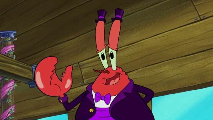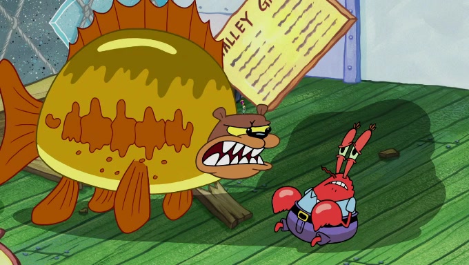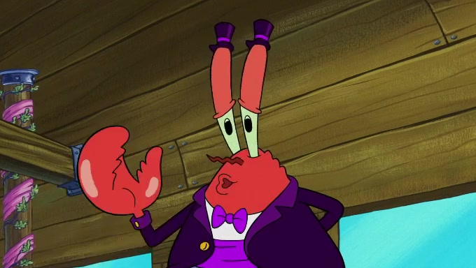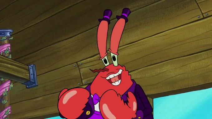 While eating spaghetti at Fancy!, Cashina asks Mr. Krabs if he knows any secrets or formulas. Mr. Krabs mentions that he knows one... but for delicious kisses. He then proceeds to kiss Cashina, but Plankton quickly presses a button that replaces her lips with ones that electrocute him on contact. Nevertheless, he took the kiss well.