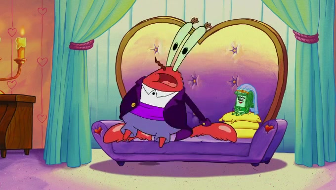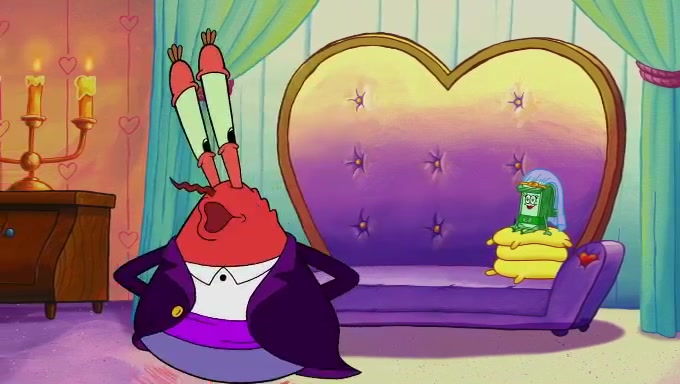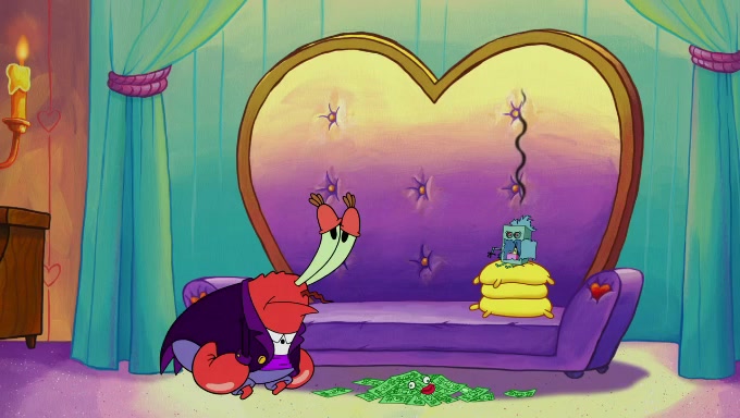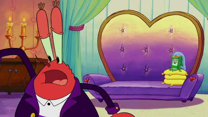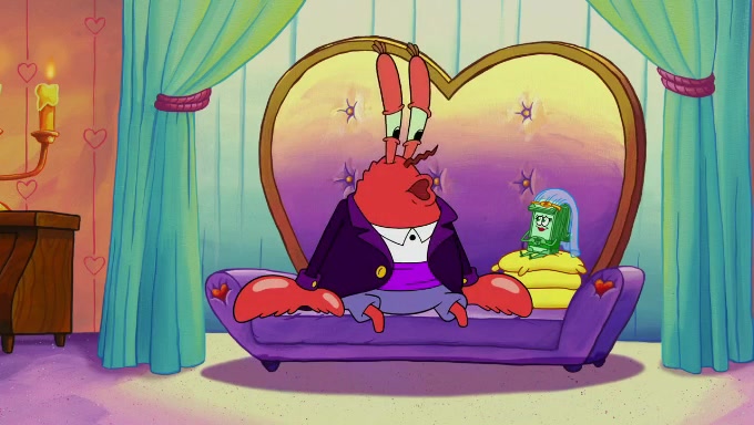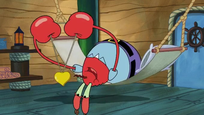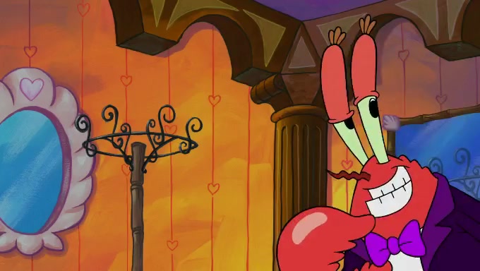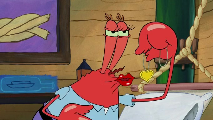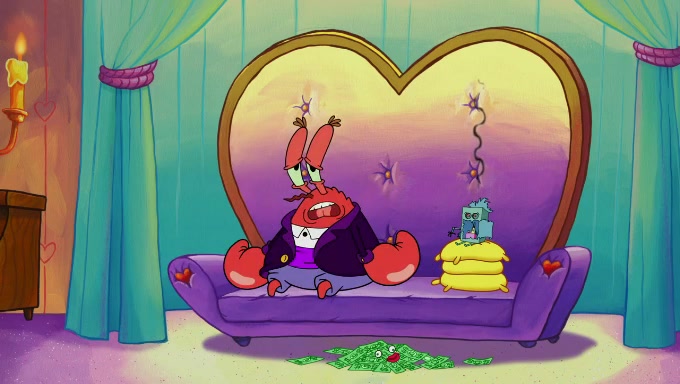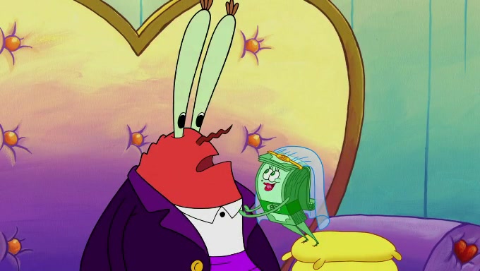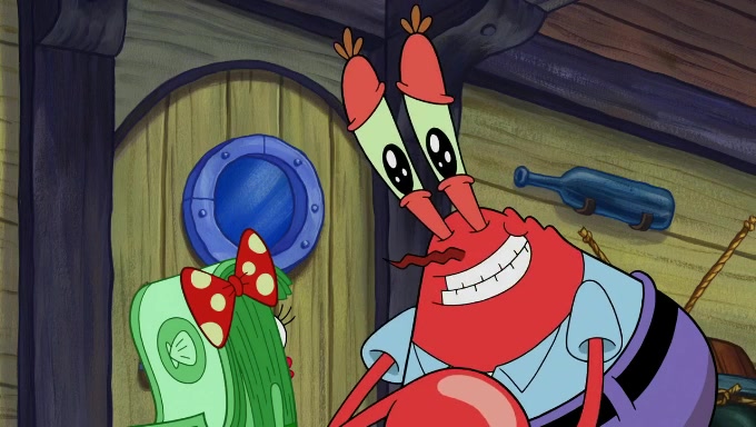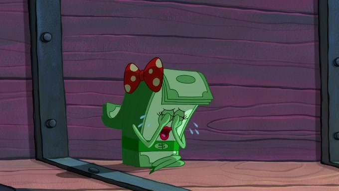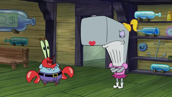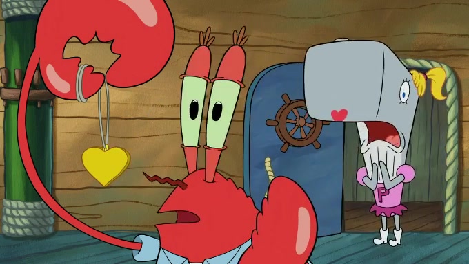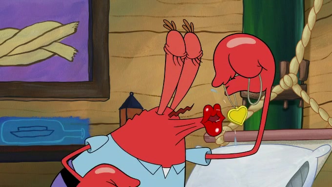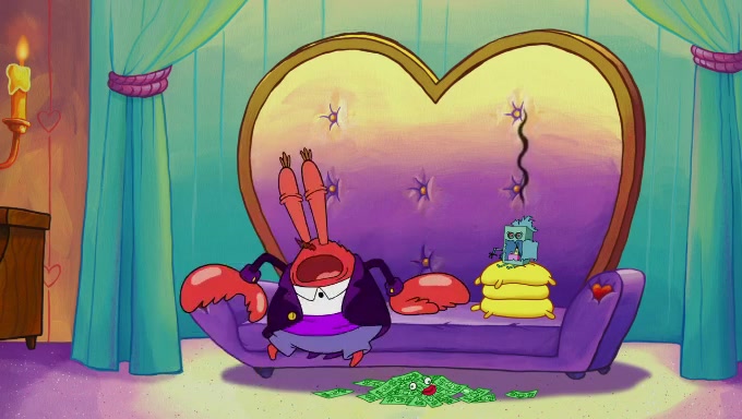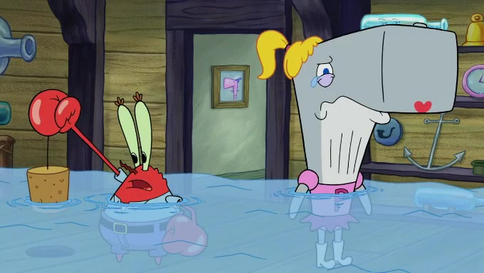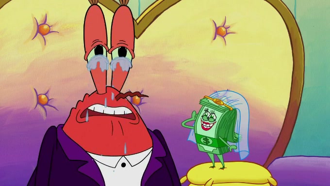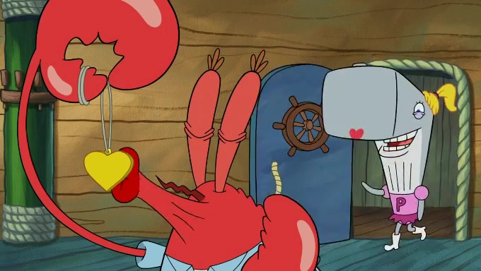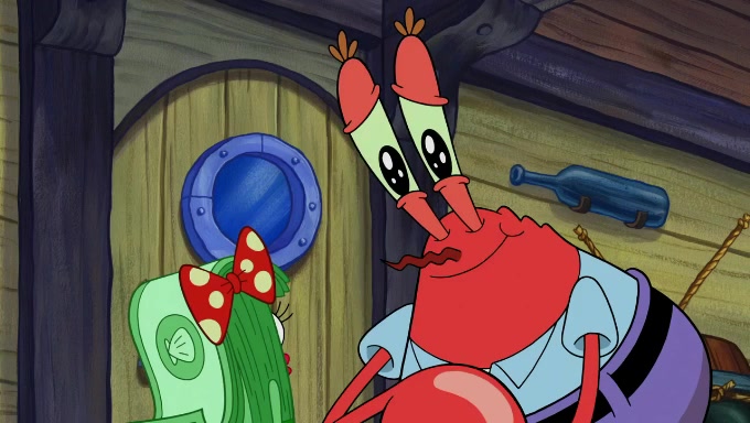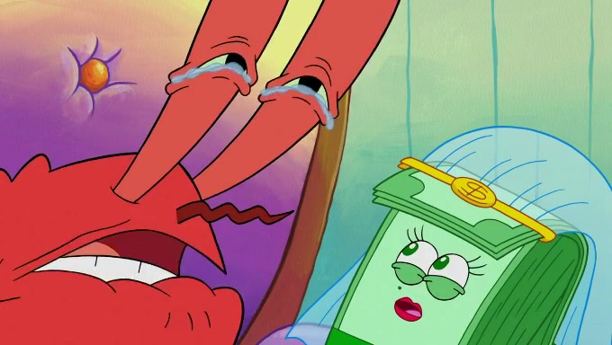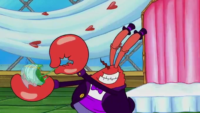 Mr. Krabs and Cashina later go out to Honeymoon Hotel where he proceeds to kiss her again, only to be stopped. Cashina asks Mr. Krabs to tell her the secret formula and he says that he will. However, just as Mr. Krabs is about to tell her the formula, he starts sweating nervously and his eyes get watery. A teardrop falls on Cashina, causing her to malfunction and explode, revealing Plankton inside it. Mr. Krabs, shocked at the revelation, starts to get angry, but then gets depressed. He says that he's been alone for so long and that it was the first time that he fell for someone, and that although Cashina wasn't real, his feelings were. Plankton just concludes that he was being crazy and runs out of the room, declaring that he will get the formula next time. Mr. Krabs breaks down sobbing, and a bellhop tries to console him, only to say that he has to tip him. Mr. Krabs then stashes away the money from when Cashina exploded and gives the bellhop a nickel.