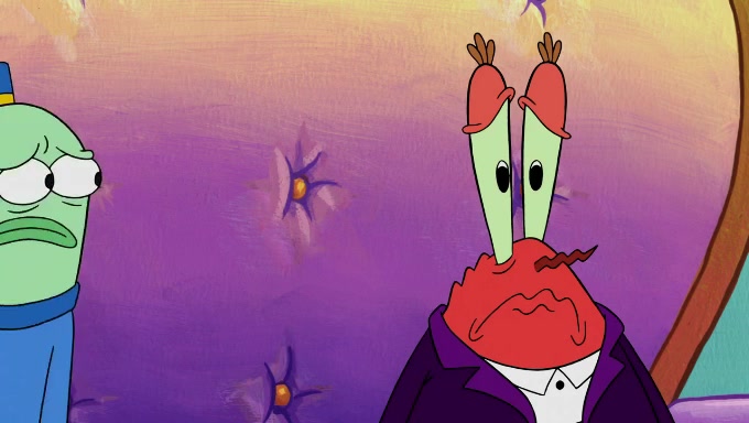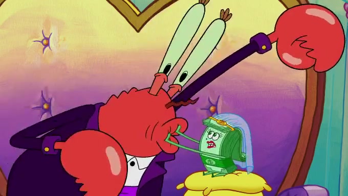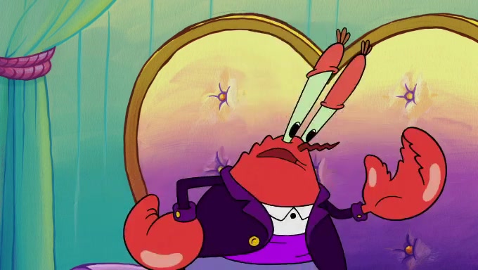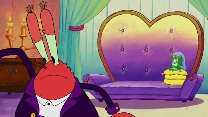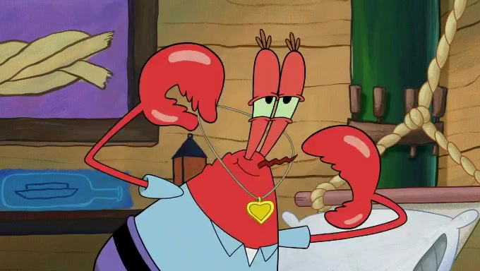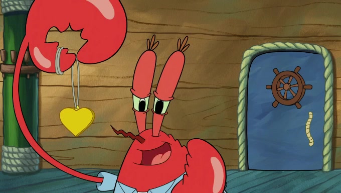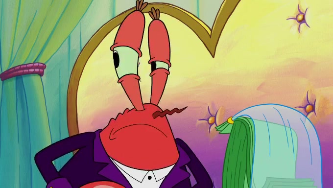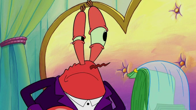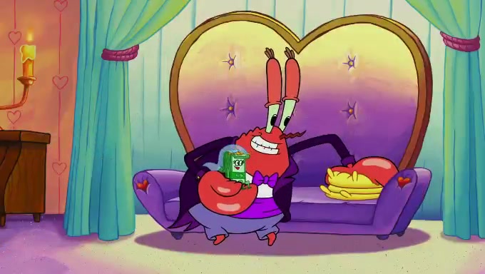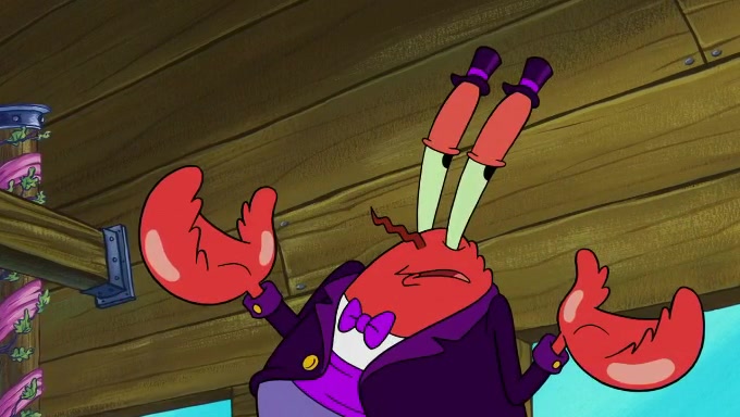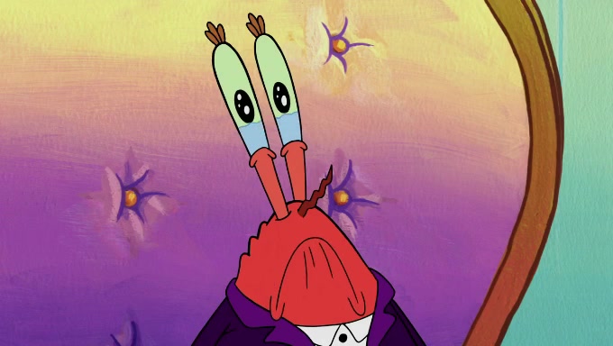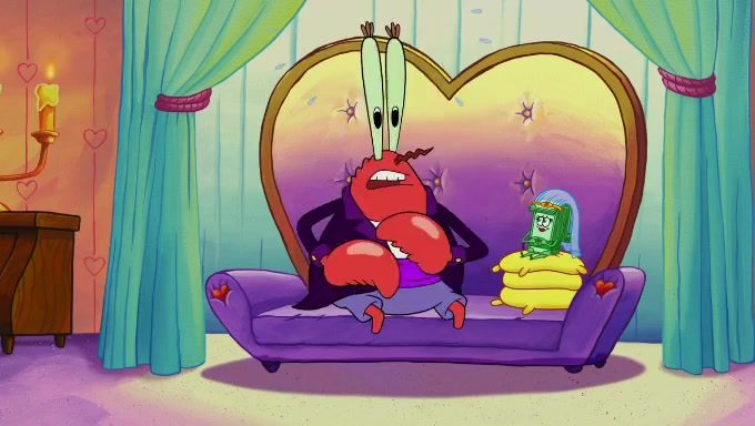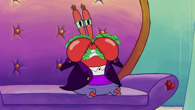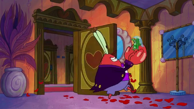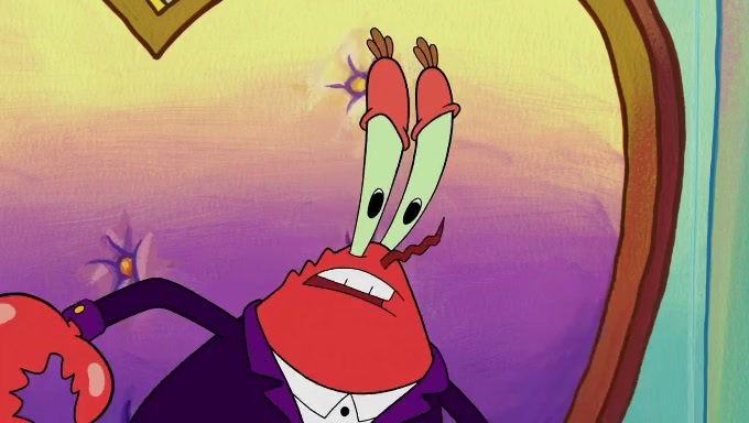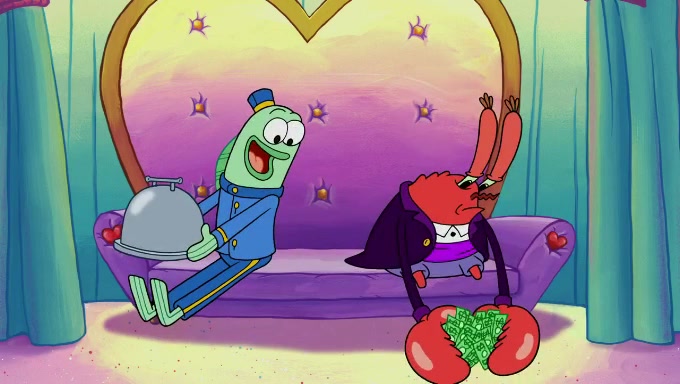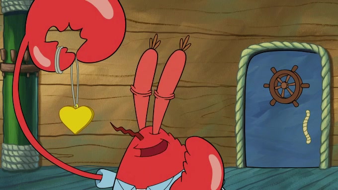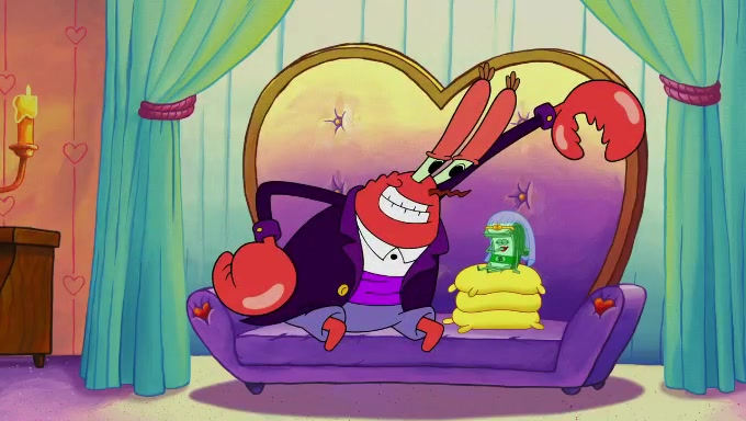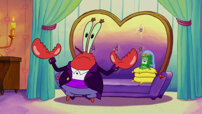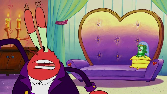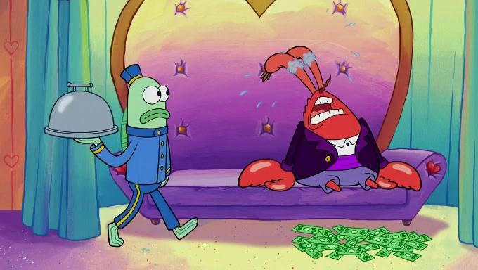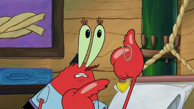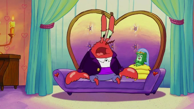 Mr. Krabs and Cashina later go out to Honeymoon Hotel where he proceeds to kiss her again, only to be stopped. Cashina asks Mr. Krabs to tell her the secret formula and he says that he will. However, just as Mr. Krabs is about to tell her the formula, he starts sweating nervously and his eyes get watery. A teardrop falls on Cashina, causing her to malfunction and explode, revealing Plankton inside it. Mr. Krabs, shocked at the revelation, starts to get angry, but then gets depressed. He says that he's been alone for so long and that it was the first time that he fell for someone, and that although Cashina wasn't real, his feelings were. Plankton just concludes that he was being crazy and runs out of the room, declaring that he will get the formula next time. Mr. Krabs breaks down sobbing, and a bellhop tries to console him, only to say that he has to tip him. Mr. Krabs then stashes away the money from when Cashina exploded and gives the bellhop a nickel.
