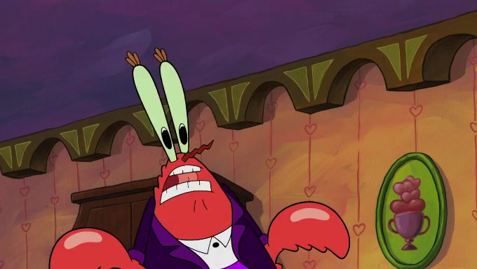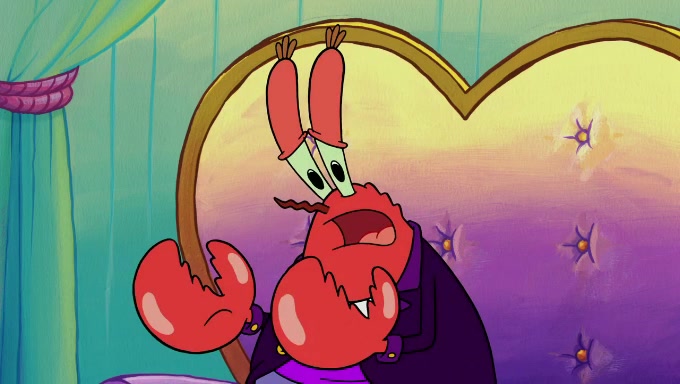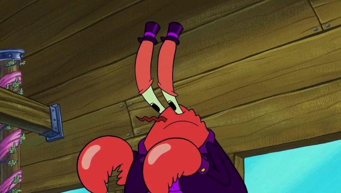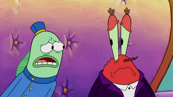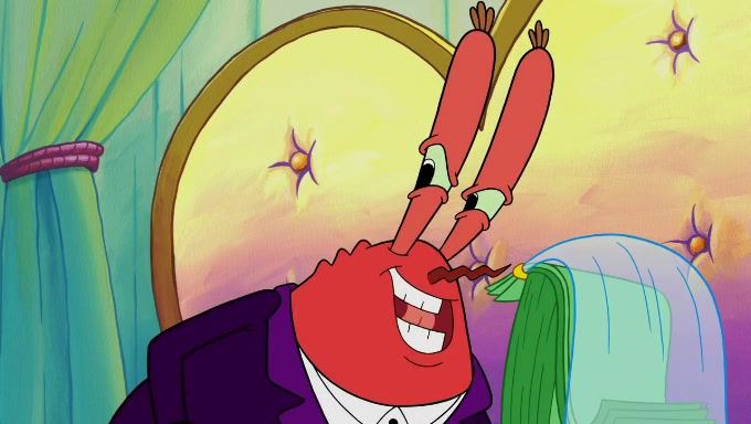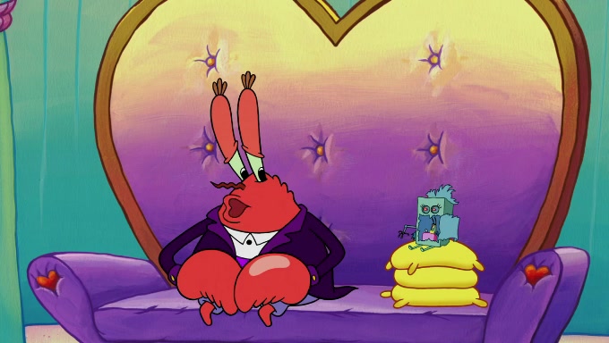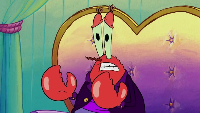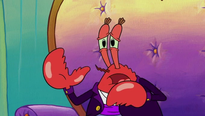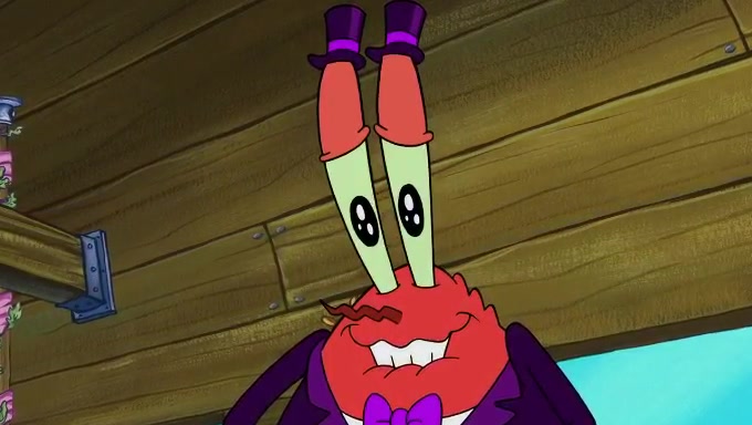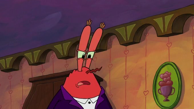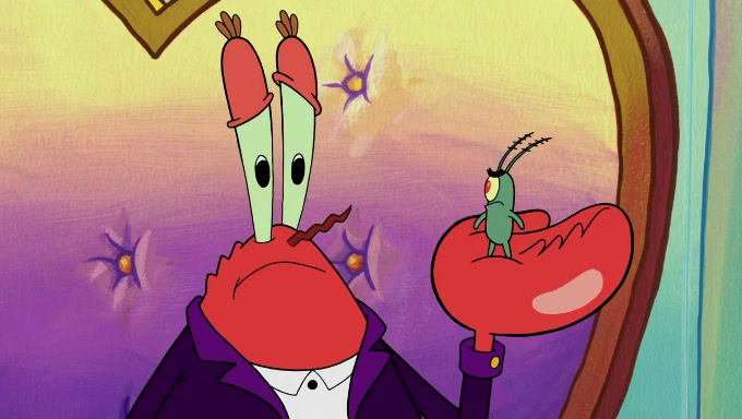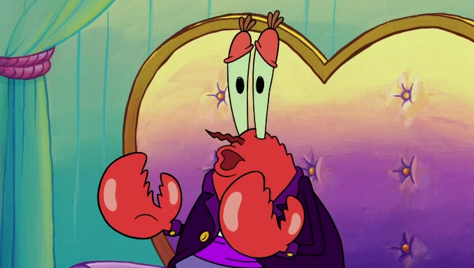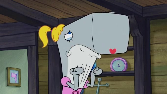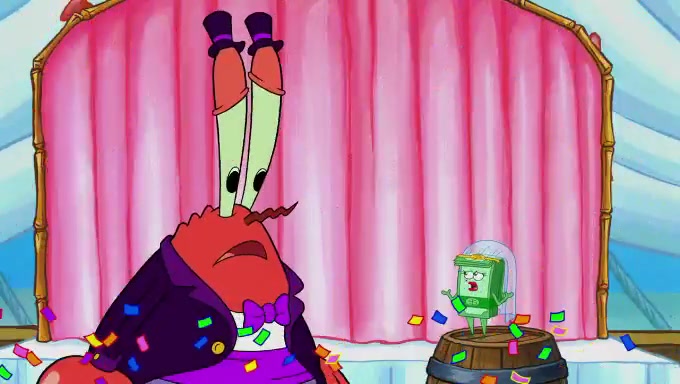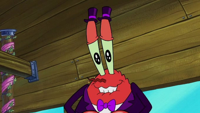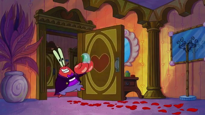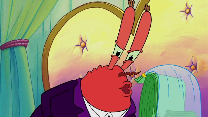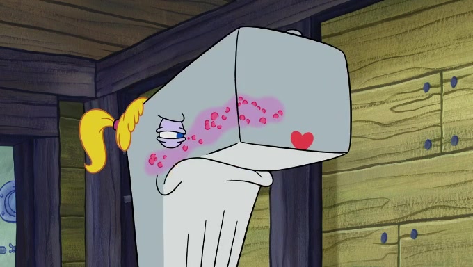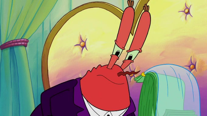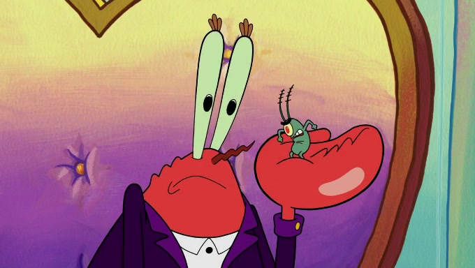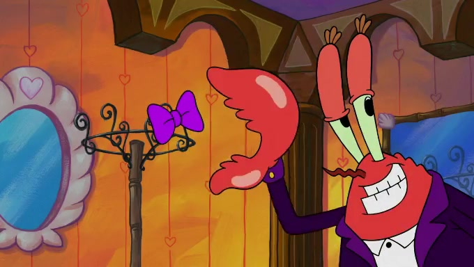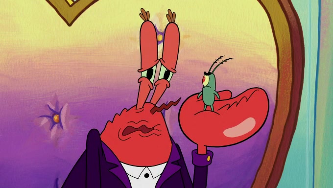 Mr. Krabs and Cashina later go out to Honeymoon Hotel where he proceeds to kiss her again, only to be stopped. Cashina asks Mr. Krabs to tell her the secret formula and he says that he will. However, just as Mr. Krabs is about to tell her the formula, he starts sweating nervously and his eyes get watery. A teardrop falls on Cashina, causing her to malfunction and explode, revealing Plankton inside it. Mr. Krabs, shocked at the revelation, starts to get angry, but then gets depressed. He says that he's been alone for so long and that it was the first time that he fell for someone, and that although Cashina wasn't real, his feelings were. Plankton just concludes that he was being crazy and runs out of the room, declaring that he will get the formula next time. Mr. Krabs breaks down sobbing, and a bellhop tries to console him, only to say that he has to tip him. Mr. Krabs then stashes away the money from when Cashina exploded and gives the bellhop a nickel.