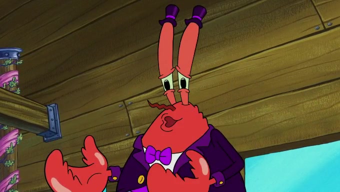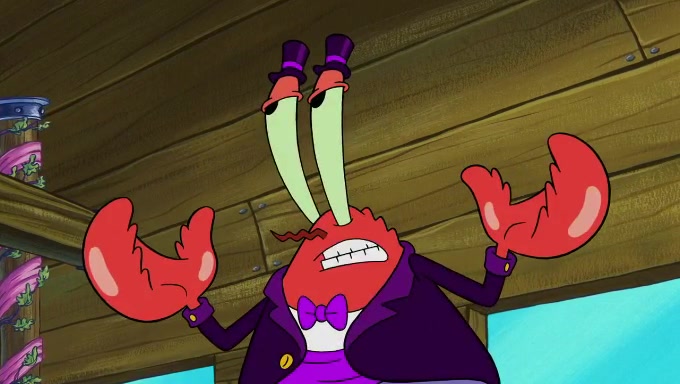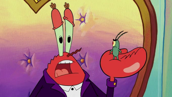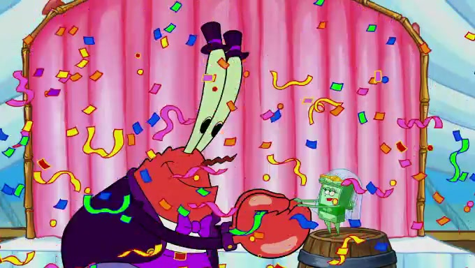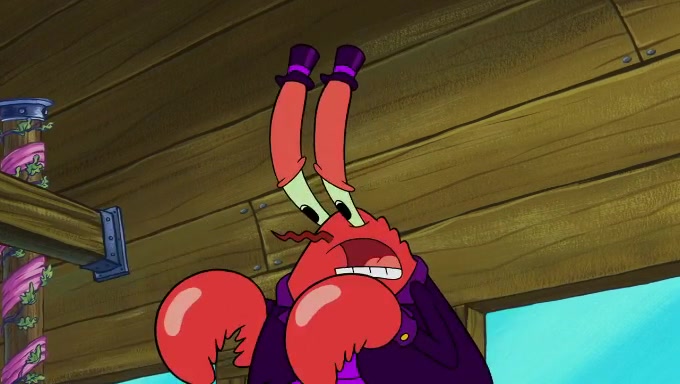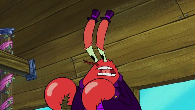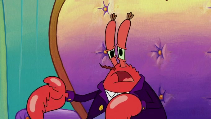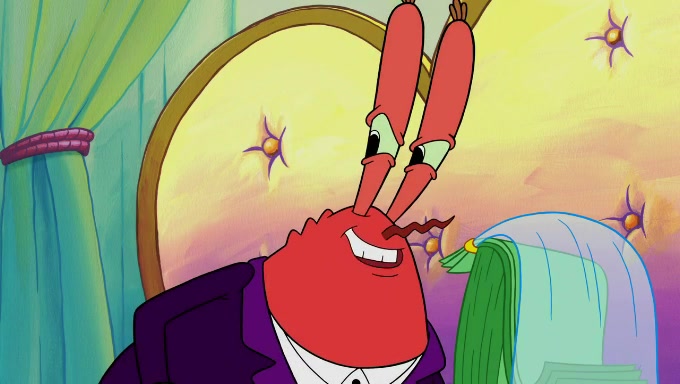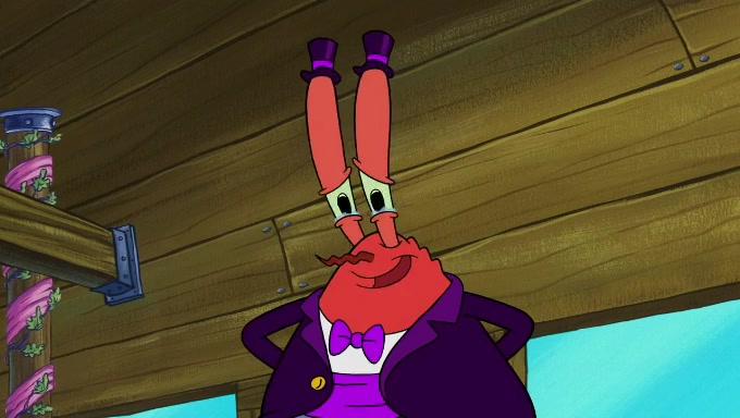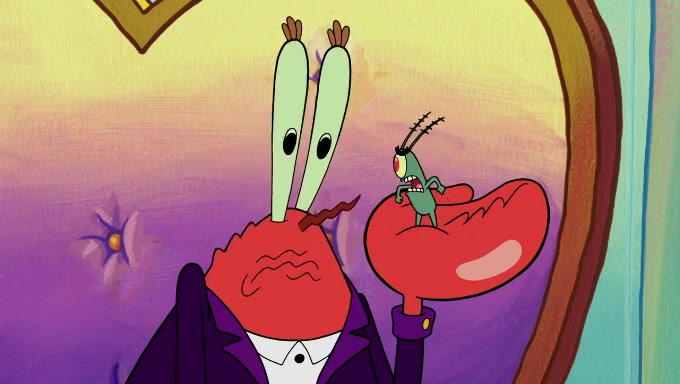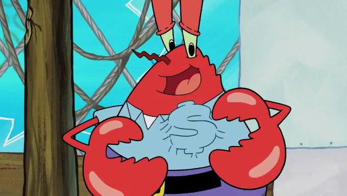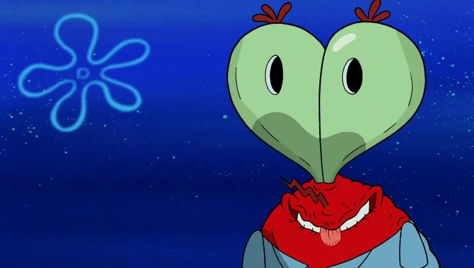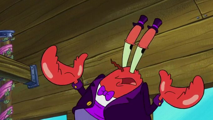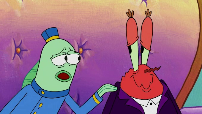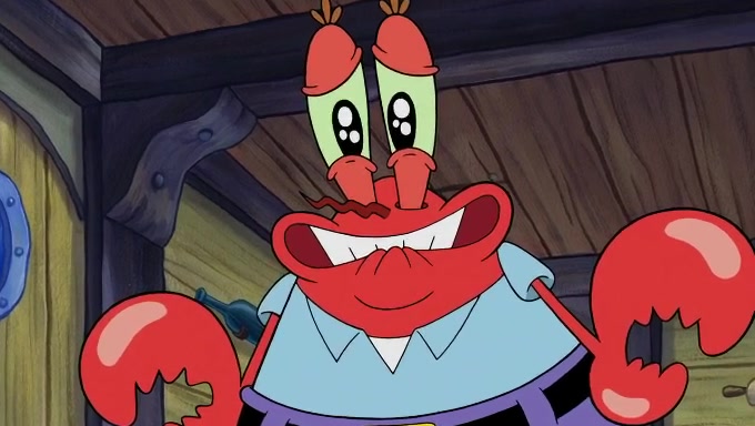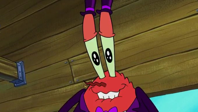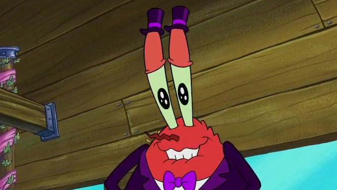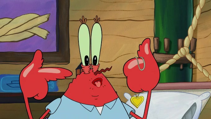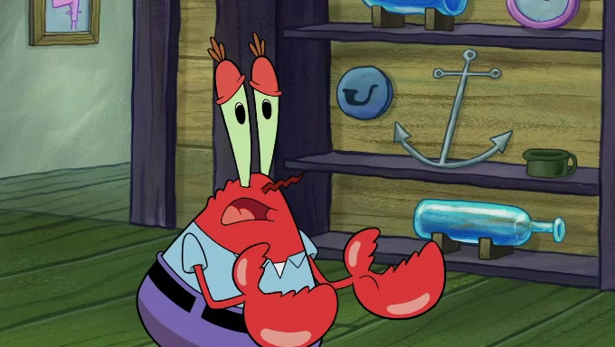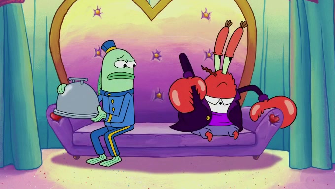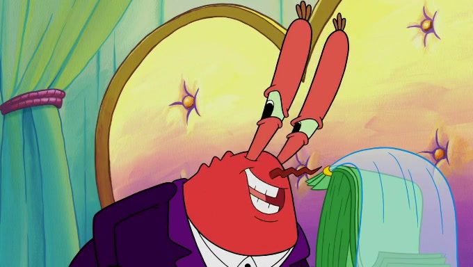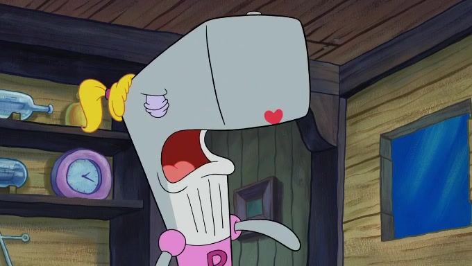 Mr. Krabs and Cashina later go out to Honeymoon Hotel where he proceeds to kiss her again, only to be stopped. Cashina asks Mr. Krabs to tell her the secret formula and he says that he will. However, just as Mr. Krabs is about to tell her the formula, he starts sweating nervously and his eyes get watery. A teardrop falls on Cashina, causing her to malfunction and explode, revealing Plankton inside it. Mr. Krabs, shocked at the revelation, starts to get angry, but then gets depressed. He says that he's been alone for so long and that it was the first time that he fell for someone, and that although Cashina wasn't real, his feelings were. Plankton just concludes that he was being crazy and runs out of the room, declaring that he will get the formula next time. Mr. Krabs breaks down sobbing, and a bellhop tries to console him, only to say that he has to tip him. Mr. Krabs then stashes away the money from when Cashina exploded and gives the bellhop a nickel.