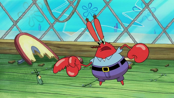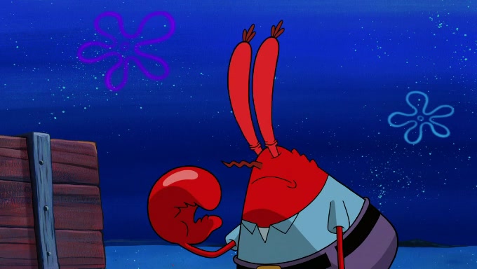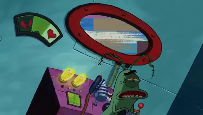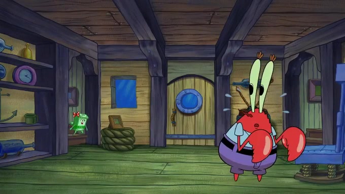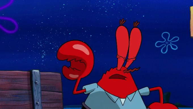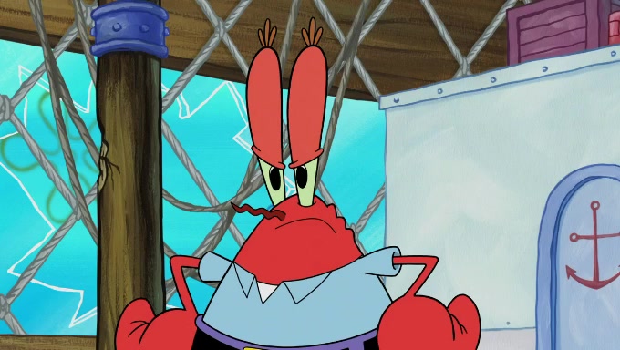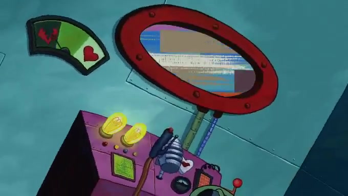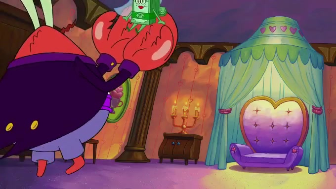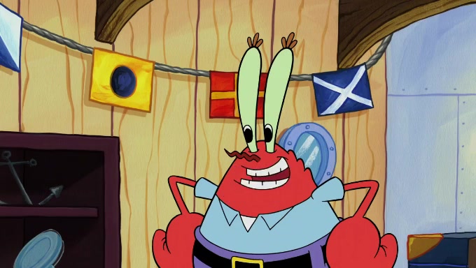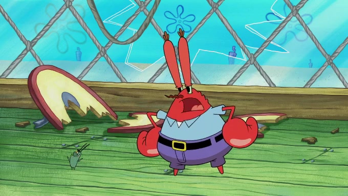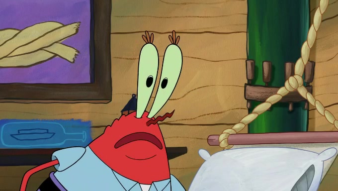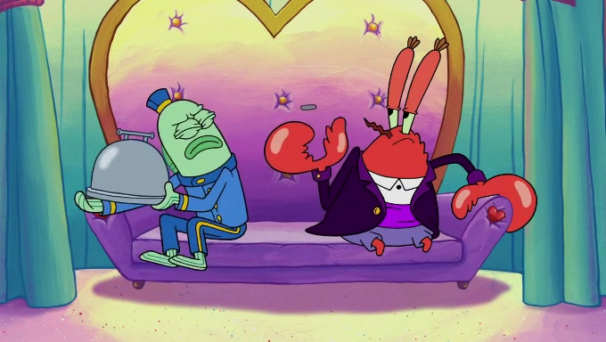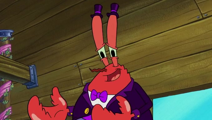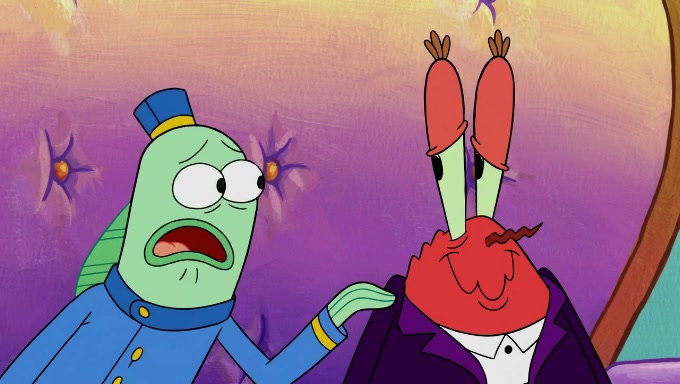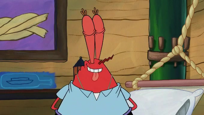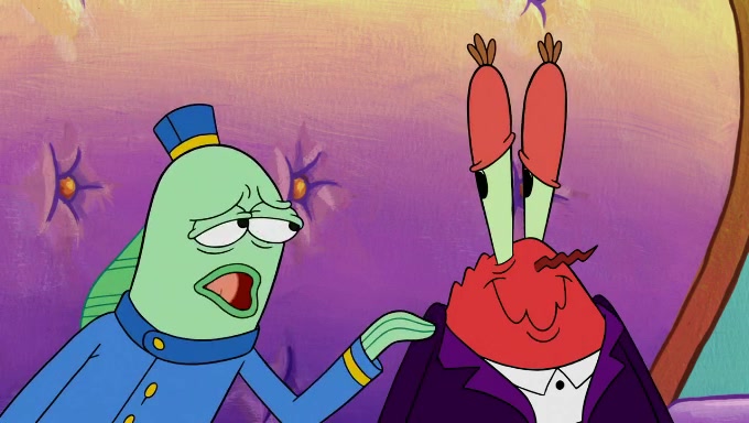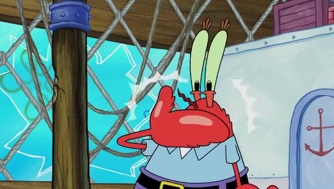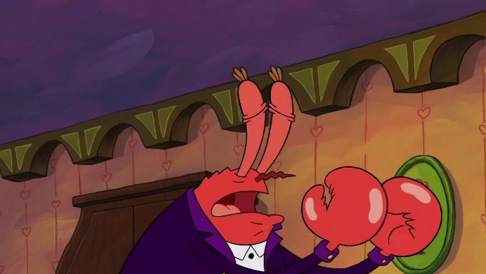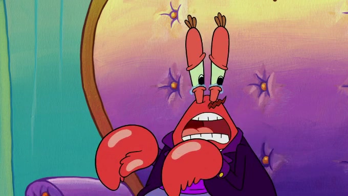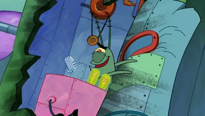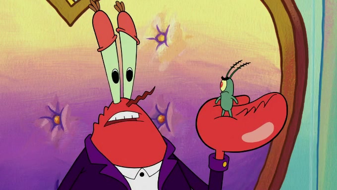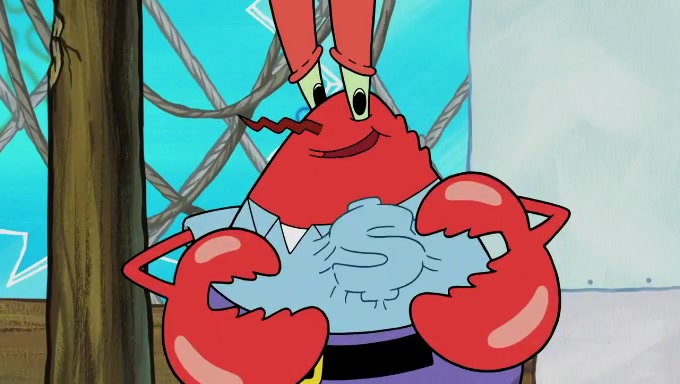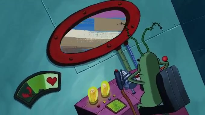 Mr. Krabs and Cashina later go out to Honeymoon Hotel where he proceeds to kiss her again, only to be stopped. Cashina asks Mr. Krabs to tell her the secret formula and he says that he will. However, just as Mr. Krabs is about to tell her the formula, he starts sweating nervously and his eyes get watery. A teardrop falls on Cashina, causing her to malfunction and explode, revealing Plankton inside it. Mr. Krabs, shocked at the revelation, starts to get angry, but then gets depressed. He says that he's been alone for so long and that it was the first time that he fell for someone, and that although Cashina wasn't real, his feelings were. Plankton just concludes that he was being crazy and runs out of the room, declaring that he will get the formula next time. Mr. Krabs breaks down sobbing, and a bellhop tries to console him, only to say that he has to tip him. Mr. Krabs then stashes away the money from when Cashina exploded and gives the bellhop a nickel.