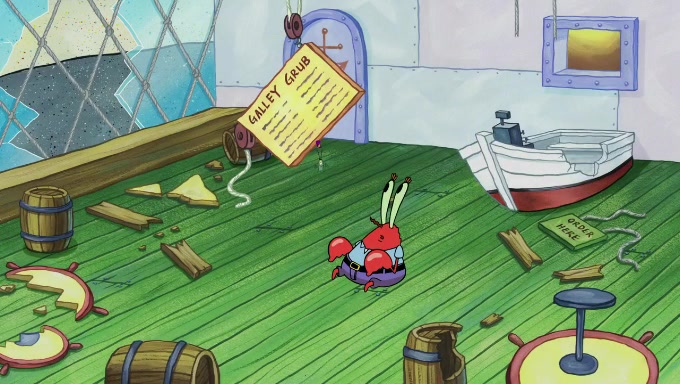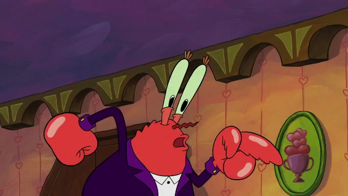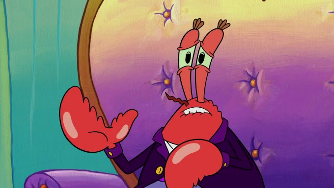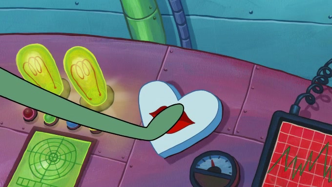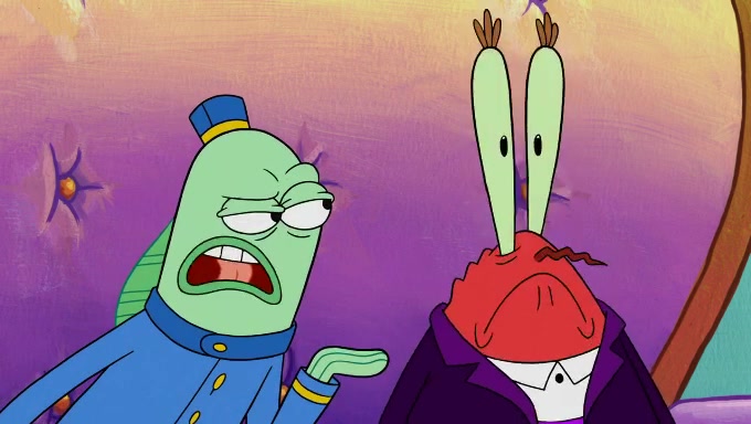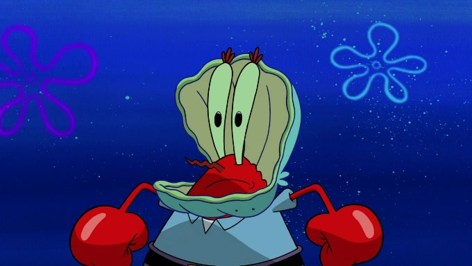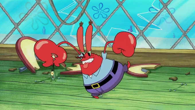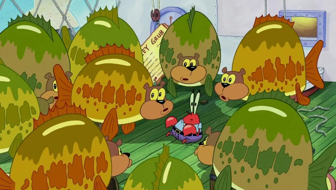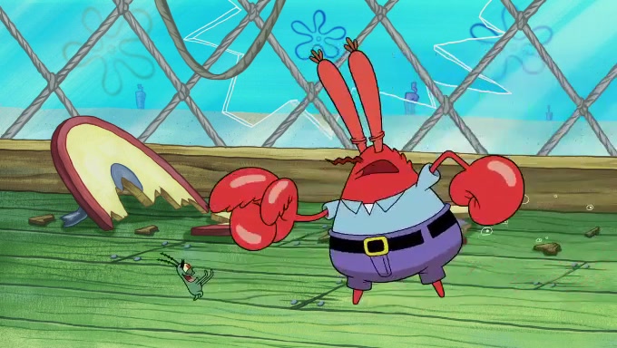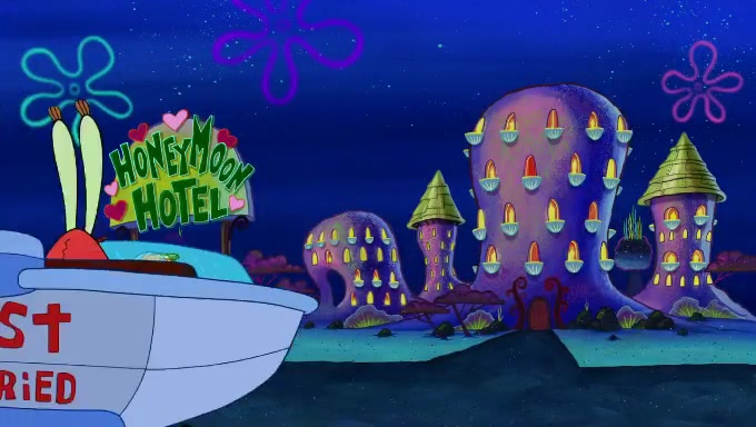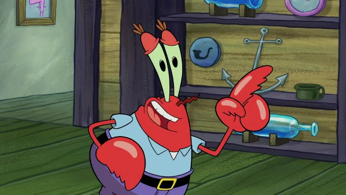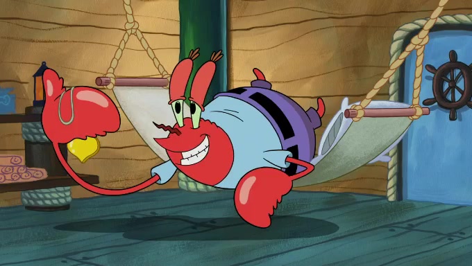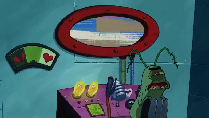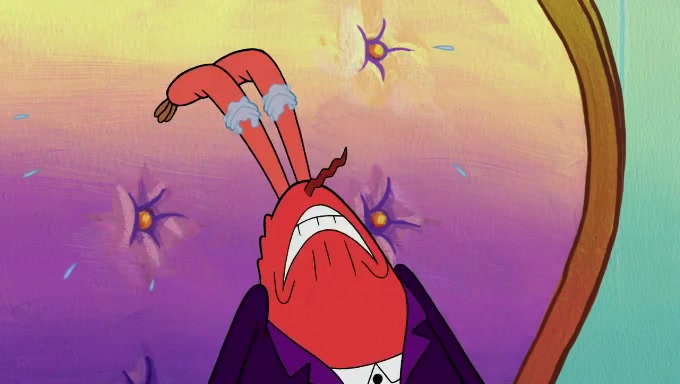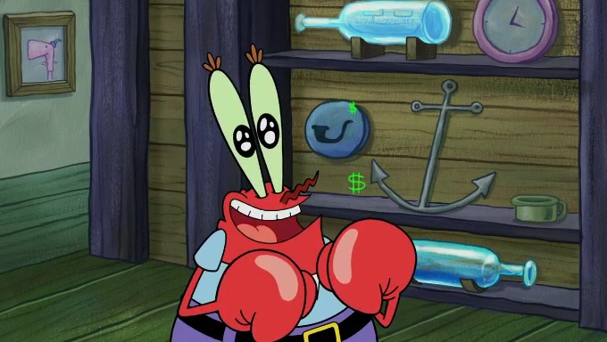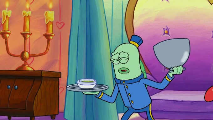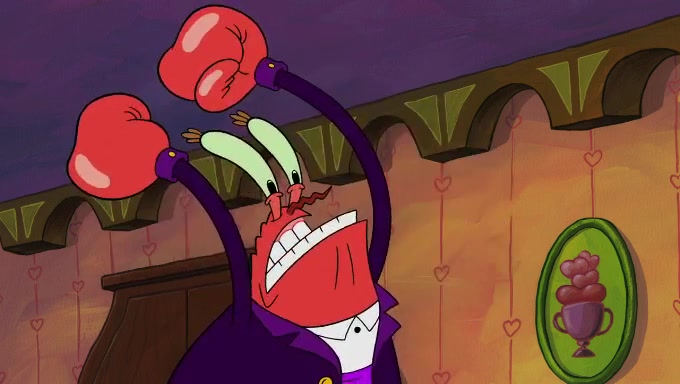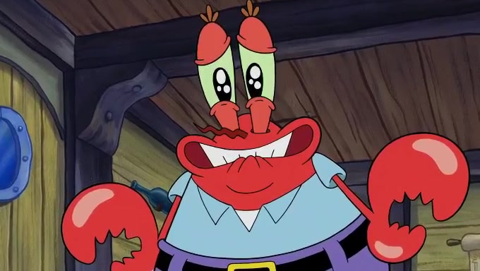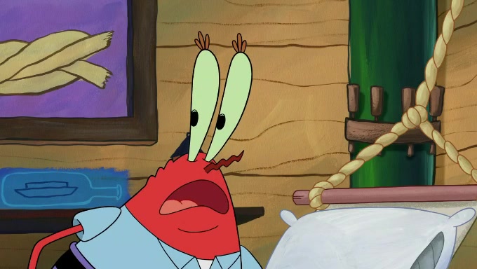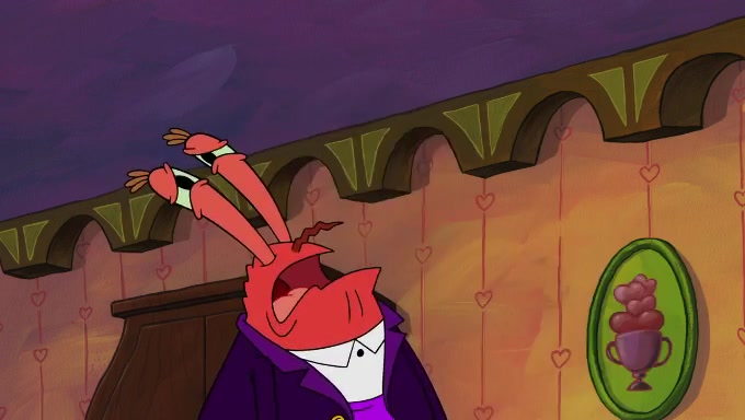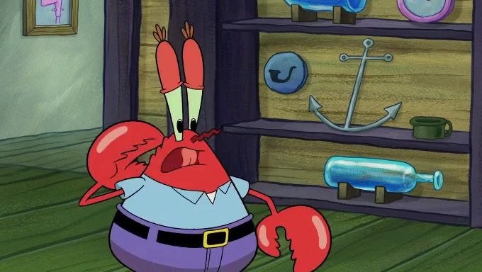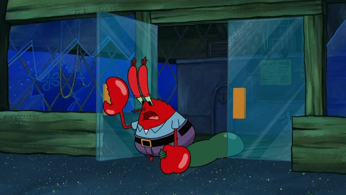 Mr. Krabs and Cashina later go out to Honeymoon Hotel where he proceeds to kiss her again, only to be stopped. Cashina asks Mr. Krabs to tell her the secret formula and he says that he will. However, just as Mr. Krabs is about to tell her the formula, he starts sweating nervously and his eyes get watery. A teardrop falls on Cashina, causing her to malfunction and explode, revealing Plankton inside it. Mr. Krabs, shocked at the revelation, starts to get angry, but then gets depressed. He says that he's been alone for so long and that it was the first time that he fell for someone, and that although Cashina wasn't real, his feelings were. Plankton just concludes that he was being crazy and runs out of the room, declaring that he will get the formula next time. Mr. Krabs breaks down sobbing, and a bellhop tries to console him, only to say that he has to tip him. Mr. Krabs then stashes away the money from when Cashina exploded and gives the bellhop a nickel.