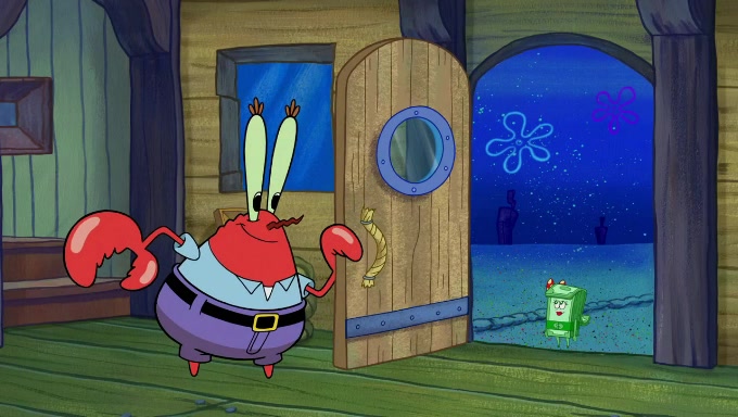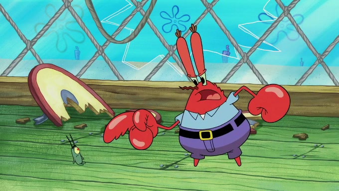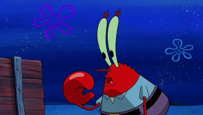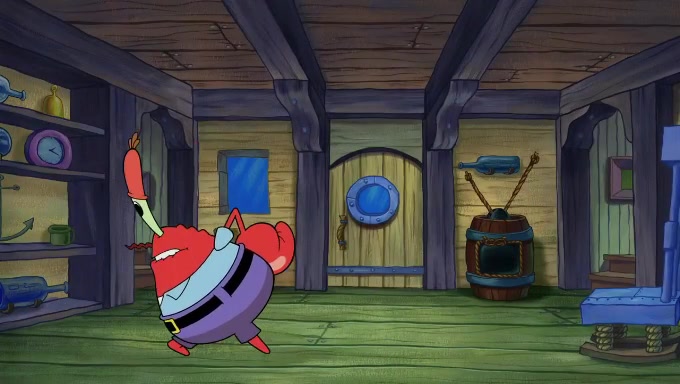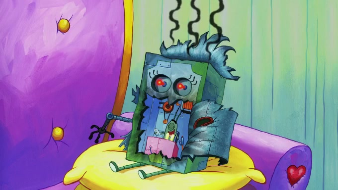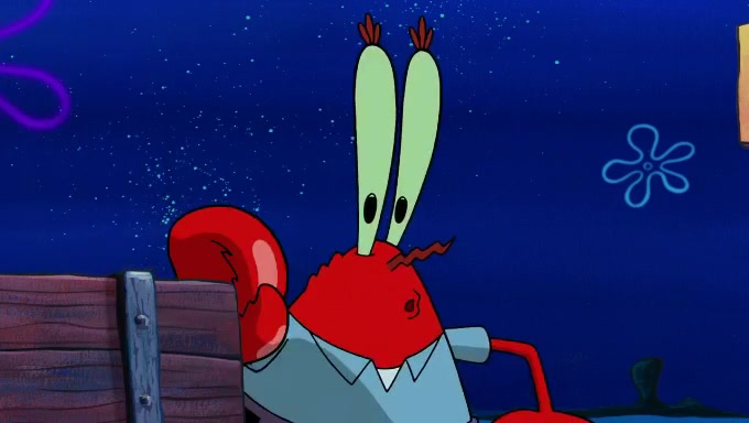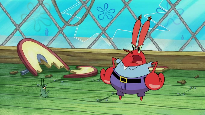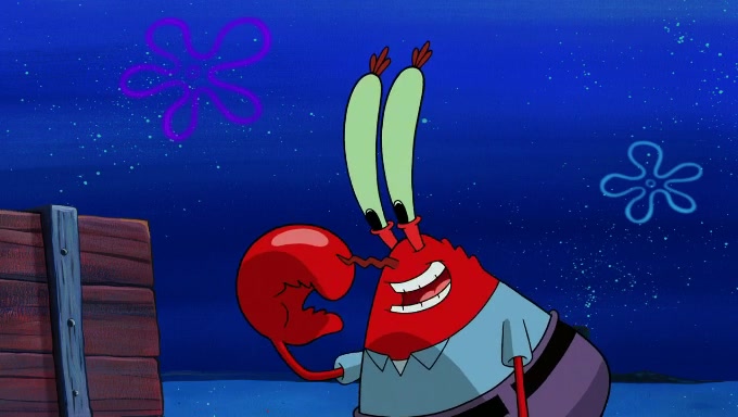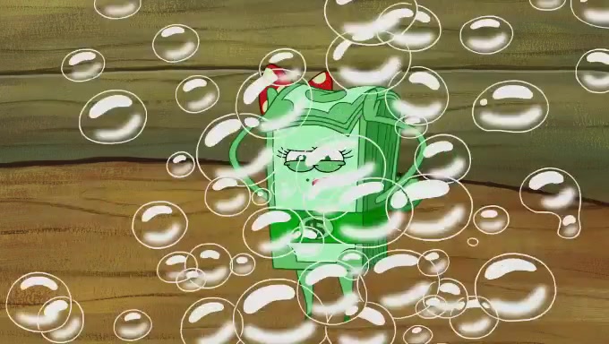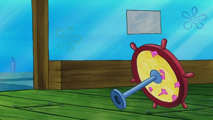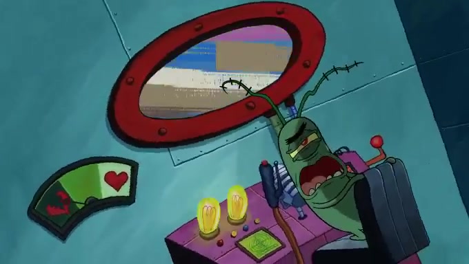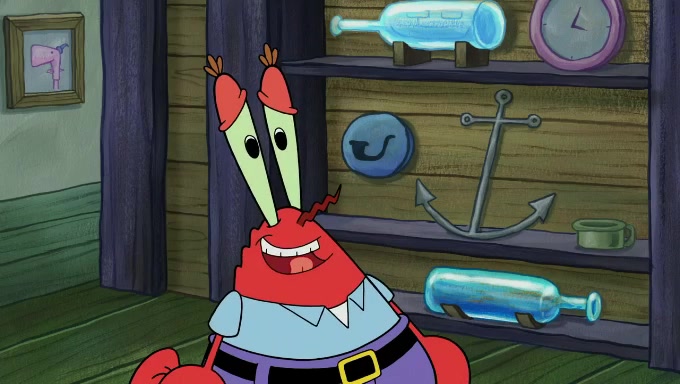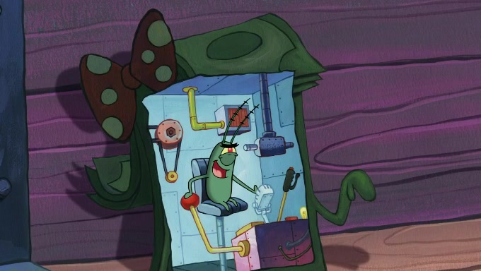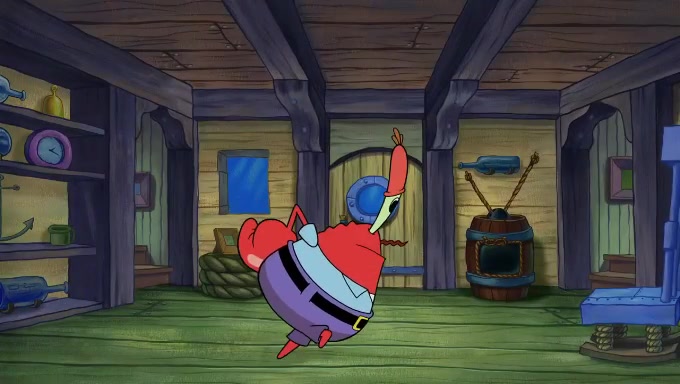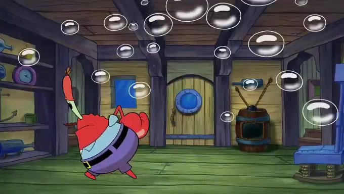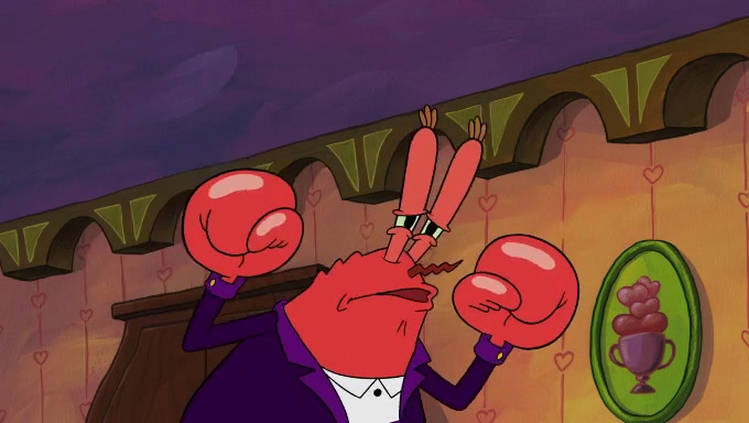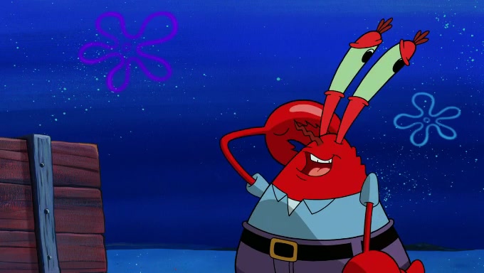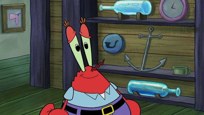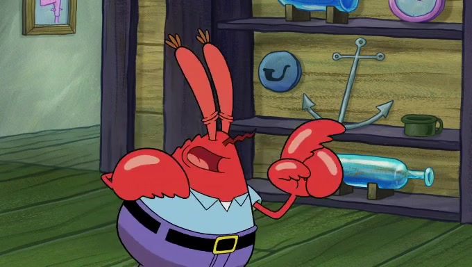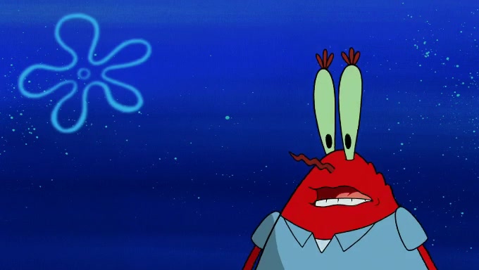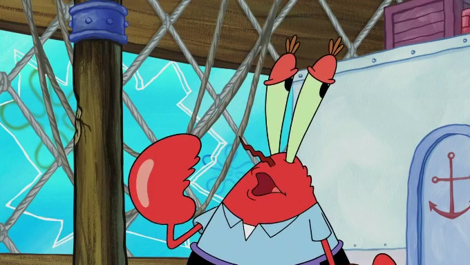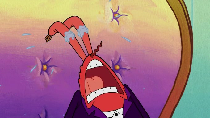 Mr. Krabs and Cashina later go out to Honeymoon Hotel where he proceeds to kiss her again, only to be stopped. Cashina asks Mr. Krabs to tell her the secret formula and he says that he will. However, just as Mr. Krabs is about to tell her the formula, he starts sweating nervously and his eyes get watery. A teardrop falls on Cashina, causing her to malfunction and explode, revealing Plankton inside it. Mr. Krabs, shocked at the revelation, starts to get angry, but then gets depressed. He says that he's been alone for so long and that it was the first time that he fell for someone, and that although Cashina wasn't real, his feelings were. Plankton just concludes that he was being crazy and runs out of the room, declaring that he will get the formula next time. Mr. Krabs breaks down sobbing, and a bellhop tries to console him, only to say that he has to tip him. Mr. Krabs then stashes away the money from when Cashina exploded and gives the bellhop a nickel.