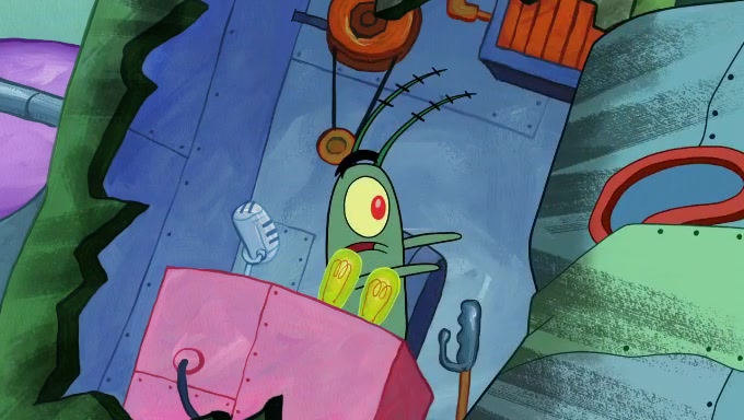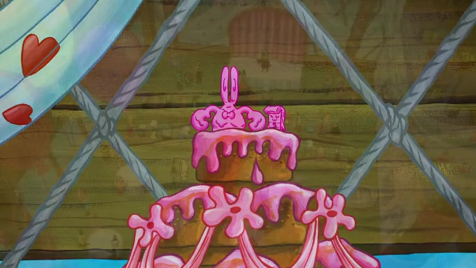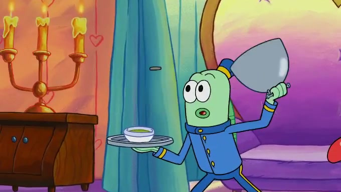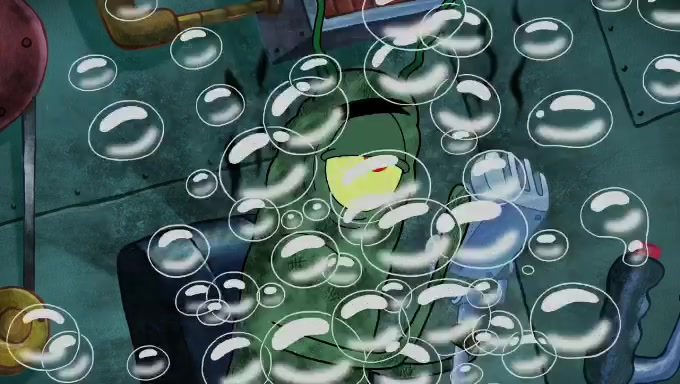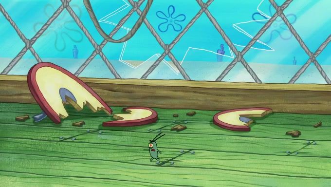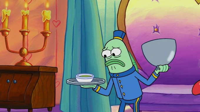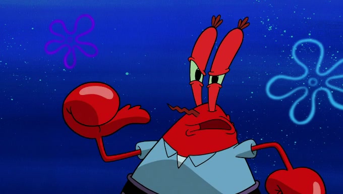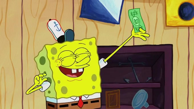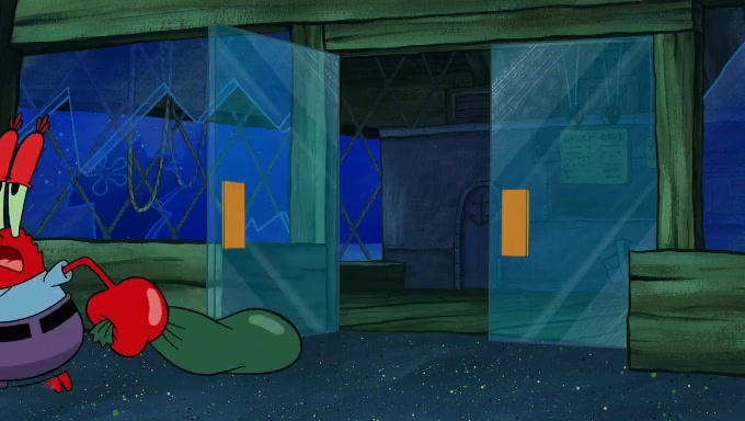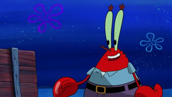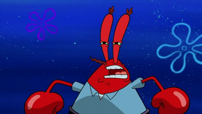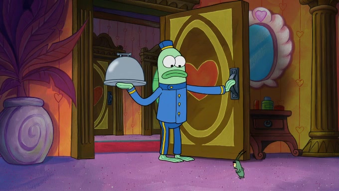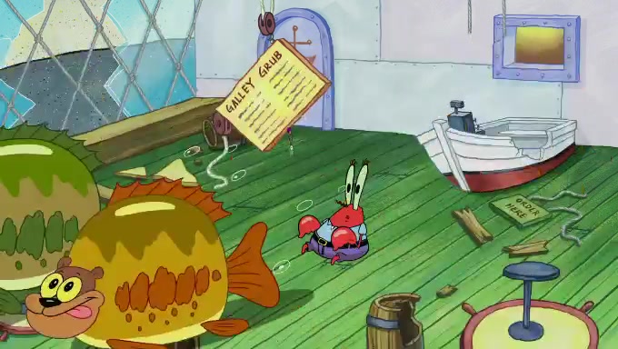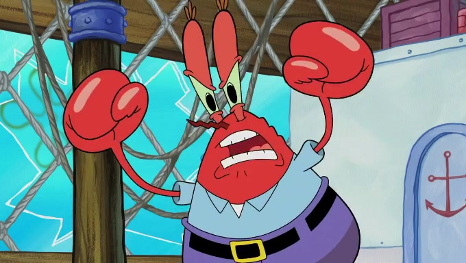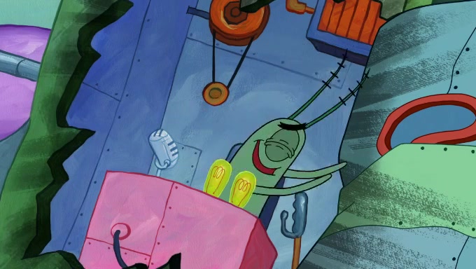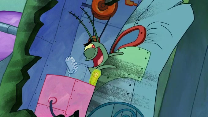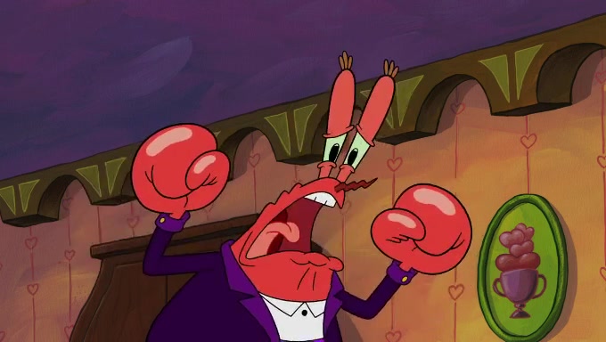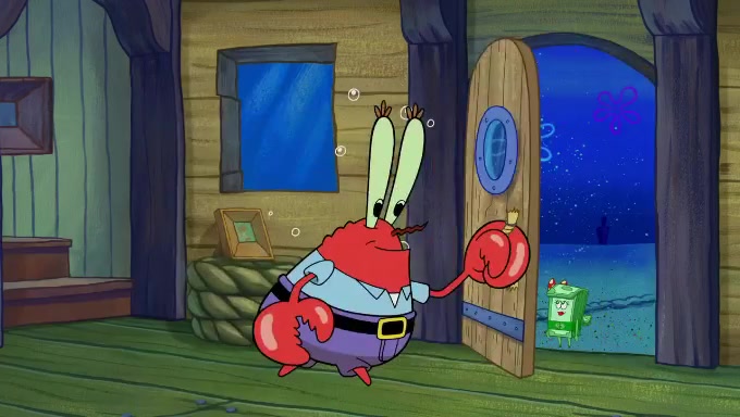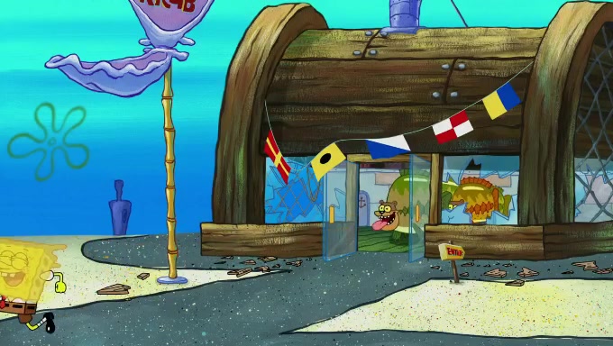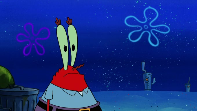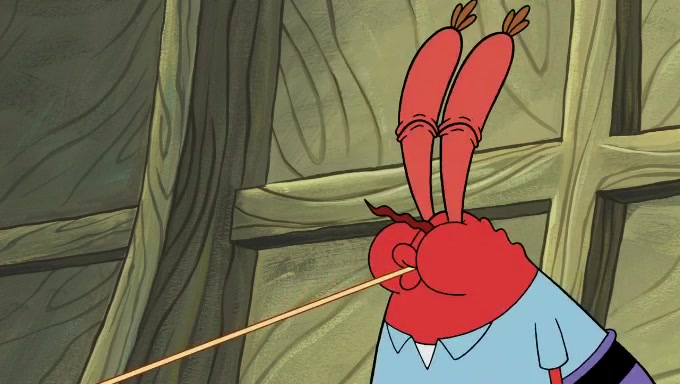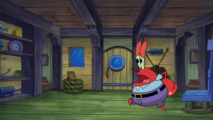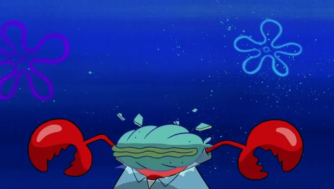 Mr. Krabs and Cashina later go out to Honeymoon Hotel where he proceeds to kiss her again, only to be stopped. Cashina asks Mr. Krabs to tell her the secret formula and he says that he will. However, just as Mr. Krabs is about to tell her the formula, he starts sweating nervously and his eyes get watery. A teardrop falls on Cashina, causing her to malfunction and explode, revealing Plankton inside it. Mr. Krabs, shocked at the revelation, starts to get angry, but then gets depressed. He says that he's been alone for so long and that it was the first time that he fell for someone, and that although Cashina wasn't real, his feelings were. Plankton just concludes that he was being crazy and runs out of the room, declaring that he will get the formula next time. Mr. Krabs breaks down sobbing, and a bellhop tries to console him, only to say that he has to tip him. Mr. Krabs then stashes away the money from when Cashina exploded and gives the bellhop a nickel.