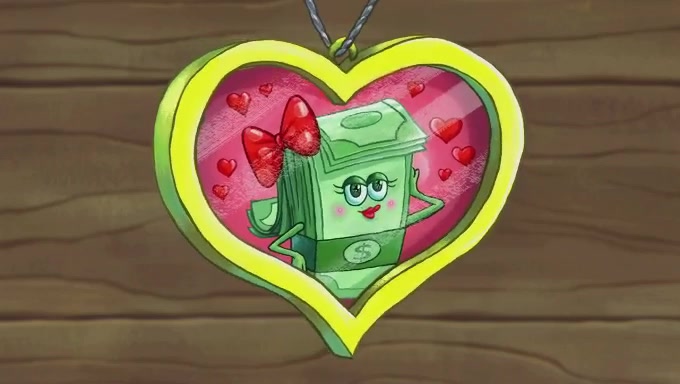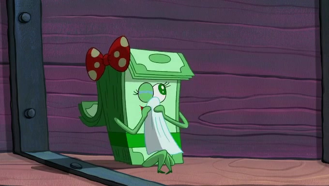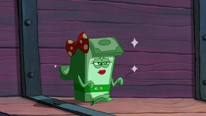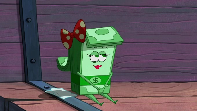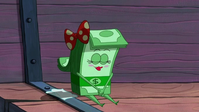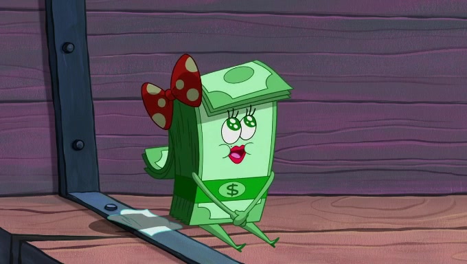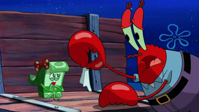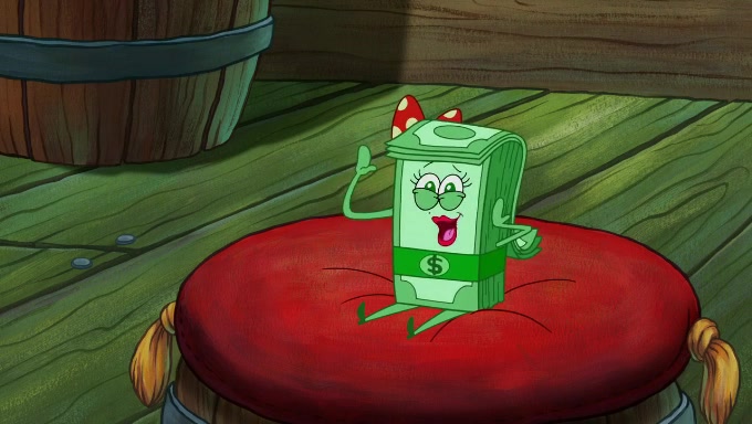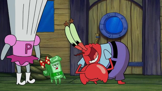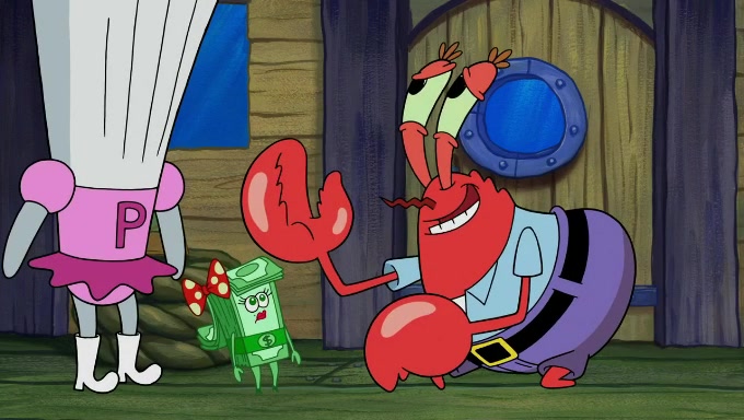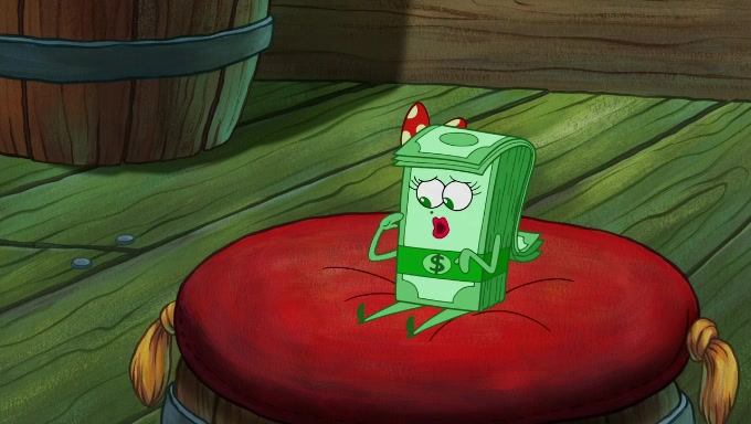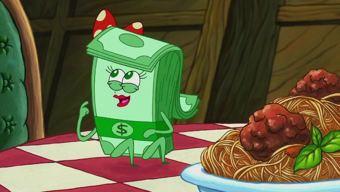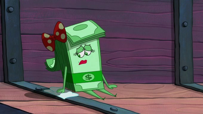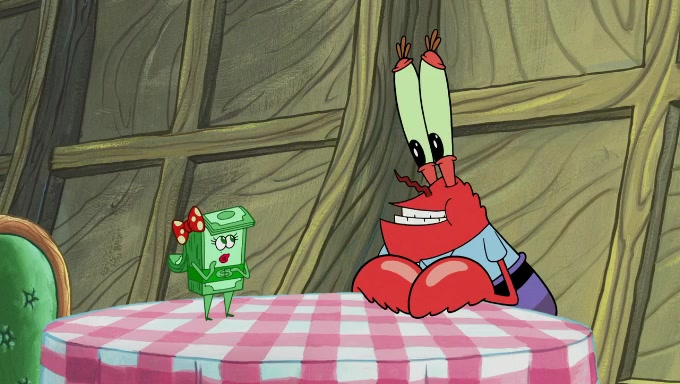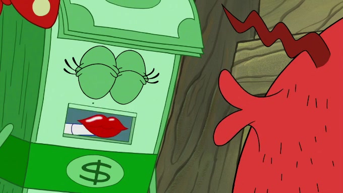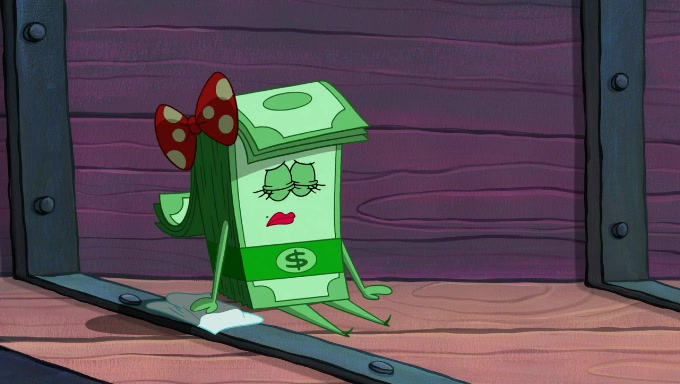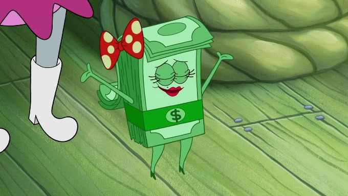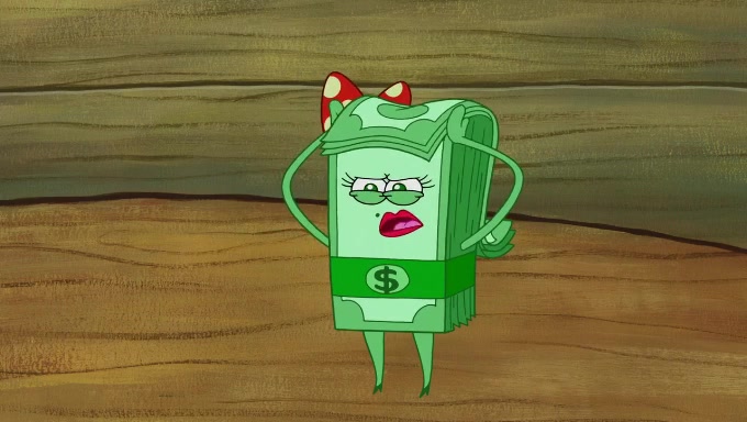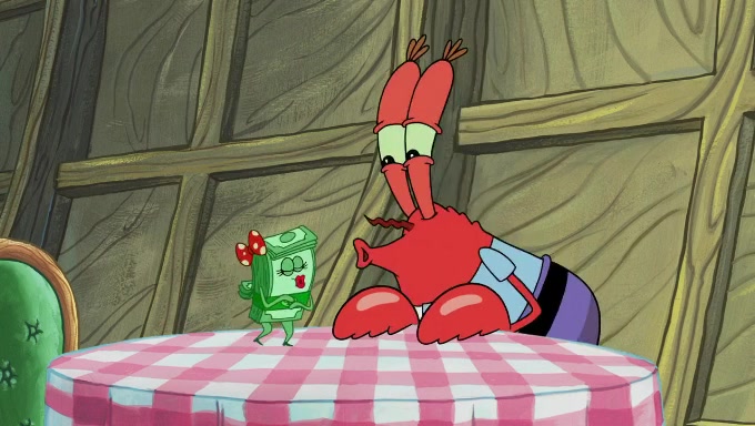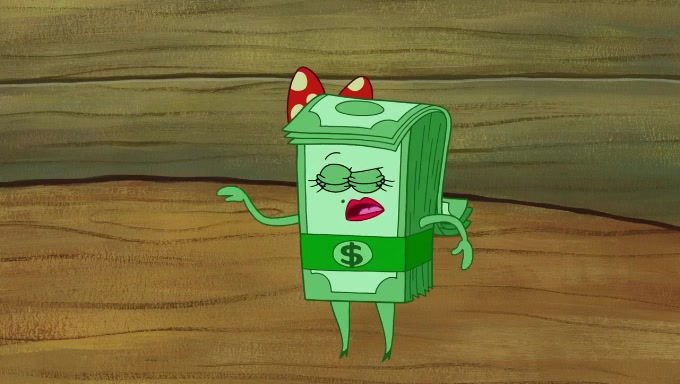 That night, Mr. Krabs takes out the trash from the Krusty Krab and hears someone crying. He spots a small lady made out of dollar bills on a nearby bench and is easily smitten. Mr. Krabs asks why she was crying and she says that her date was supposed to take her to the bank but stood her up. The lady introduces herself as Cashina, and Mr. Krabs asks if he could take her out to dinner. Cashina says that she would love to. Unknown to Mr. Krabs, however, Cashina is actually a robot piloted by Plankton who intends to scam Mr. Krabs into giving him the secret formula.