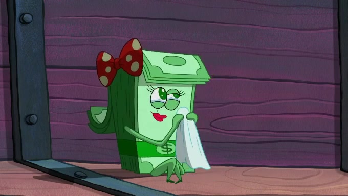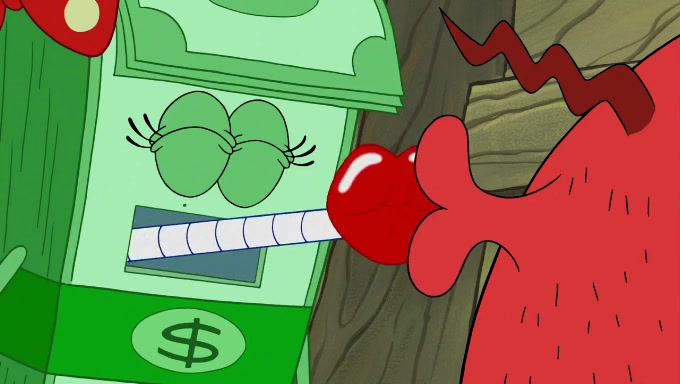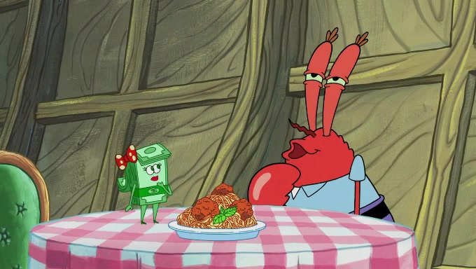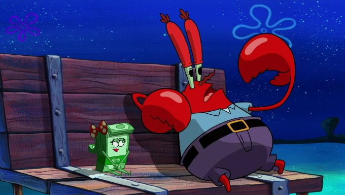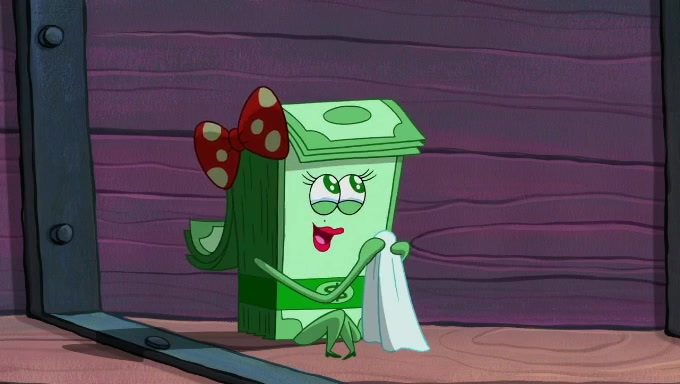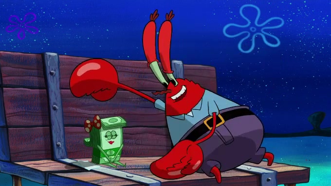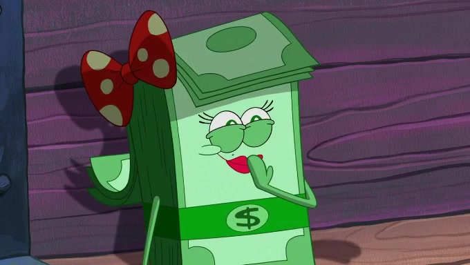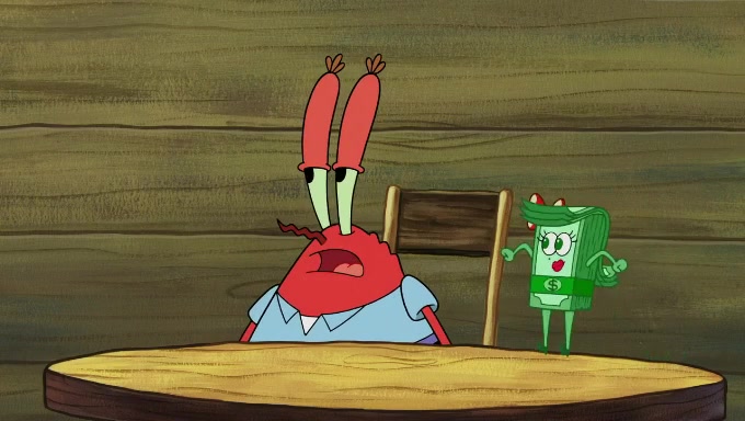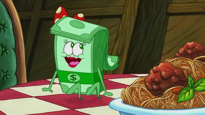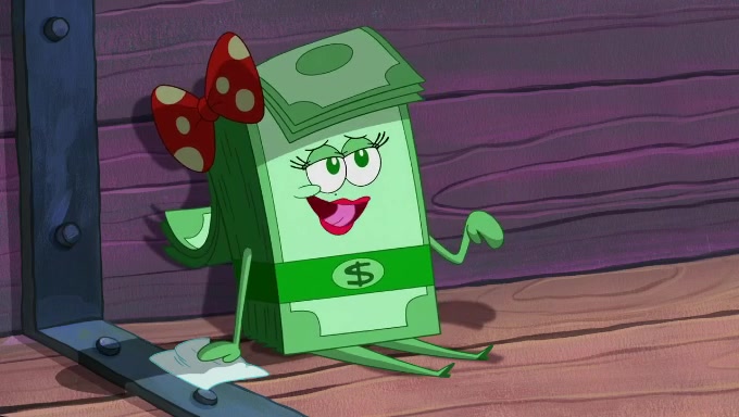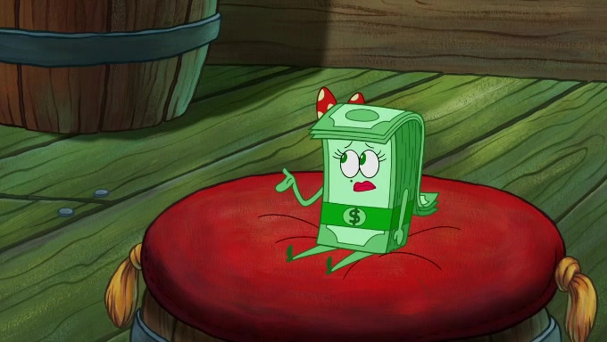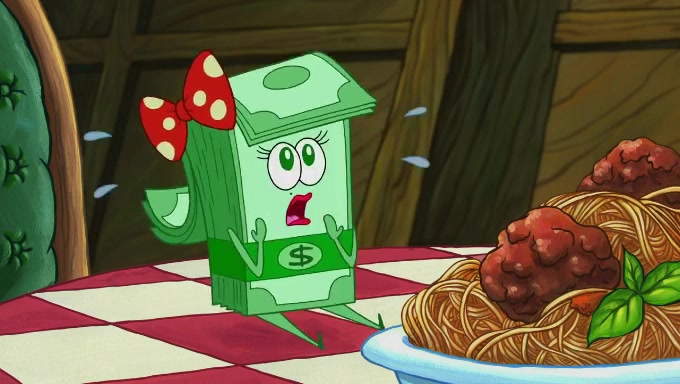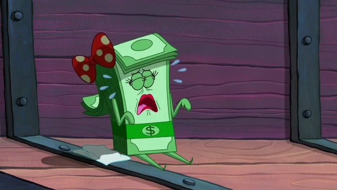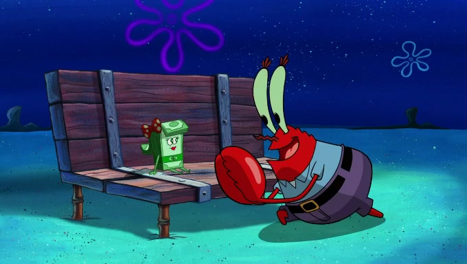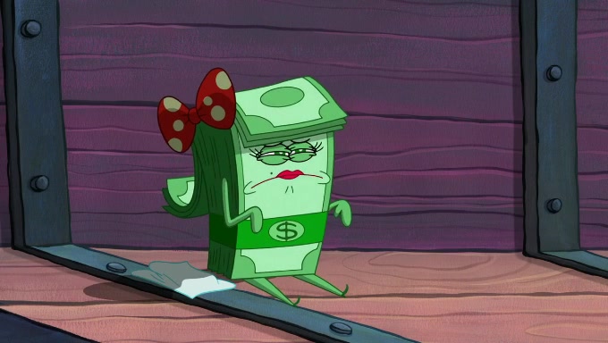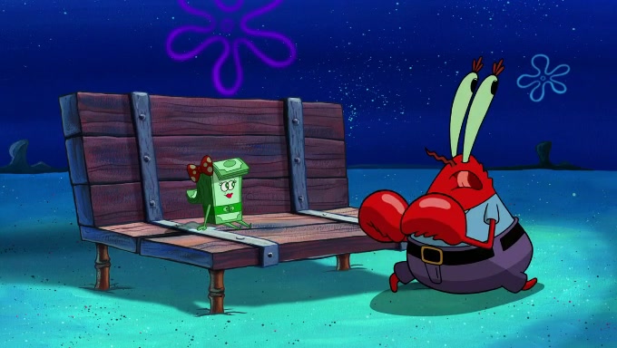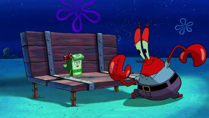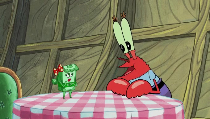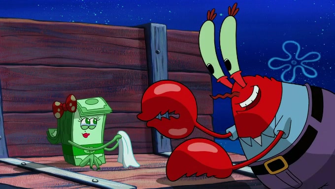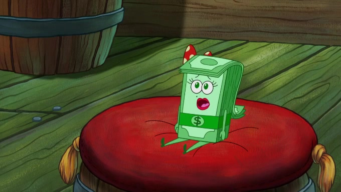 That night, Mr. Krabs takes out the trash from the Krusty Krab and hears someone crying. He spots a small lady made out of dollar bills on a nearby bench and is easily smitten. Mr. Krabs asks why she was crying and she says that her date was supposed to take her to the bank but stood her up. The lady introduces herself as Cashina, and Mr. Krabs asks if he could take her out to dinner. Cashina says that she would love to. Unknown to Mr. Krabs, however, Cashina is actually a robot piloted by Plankton who intends to scam Mr. Krabs into giving him the secret formula.
