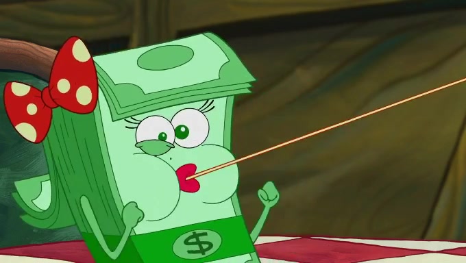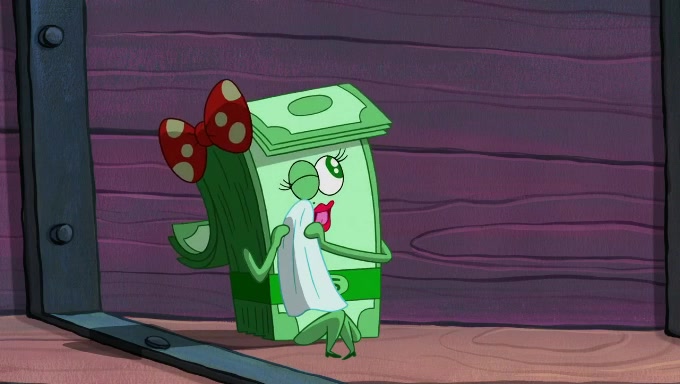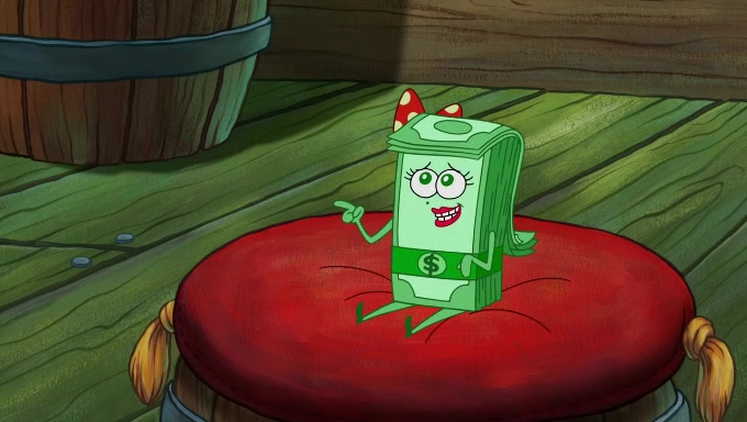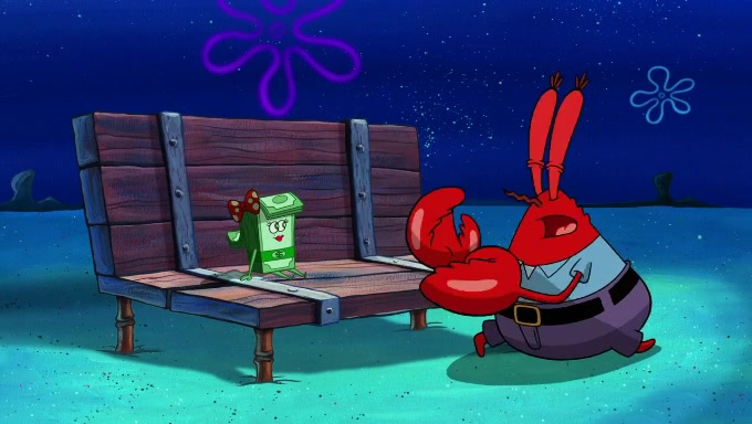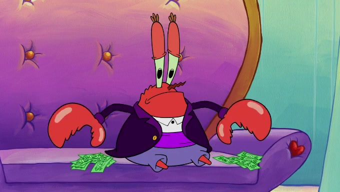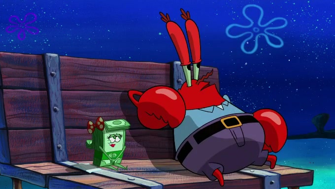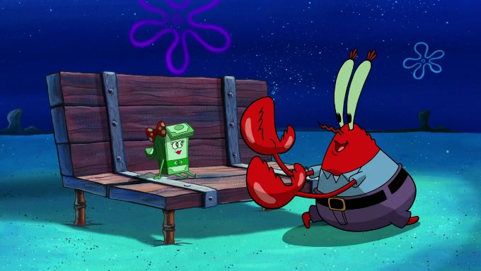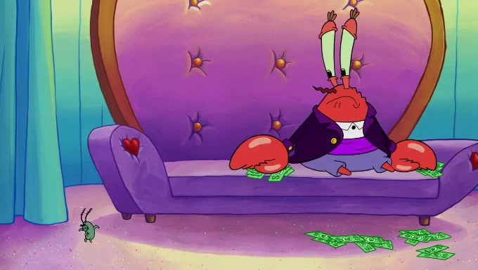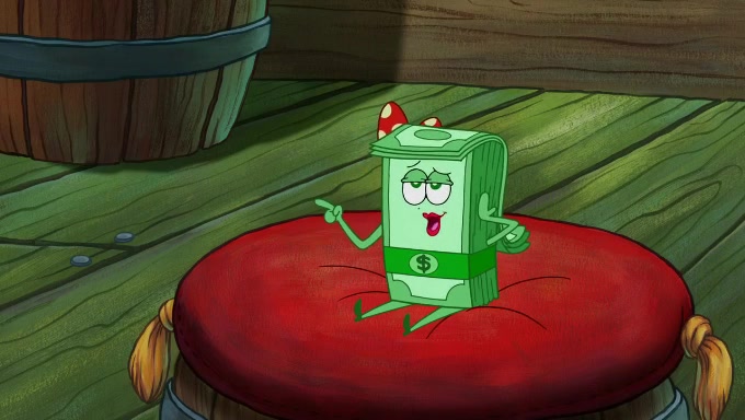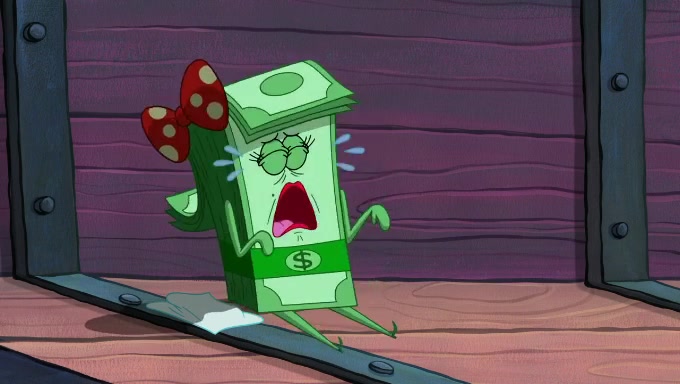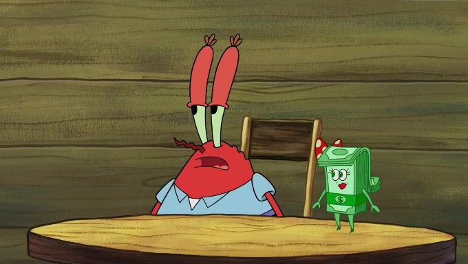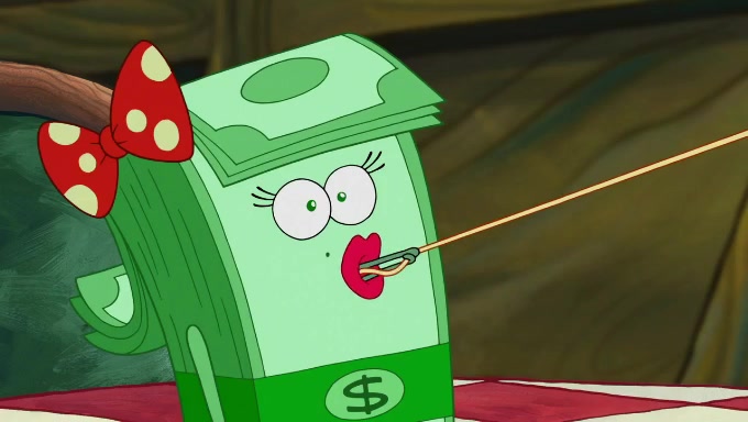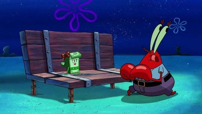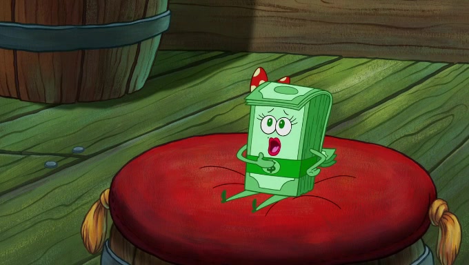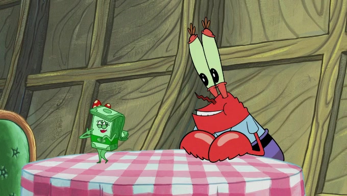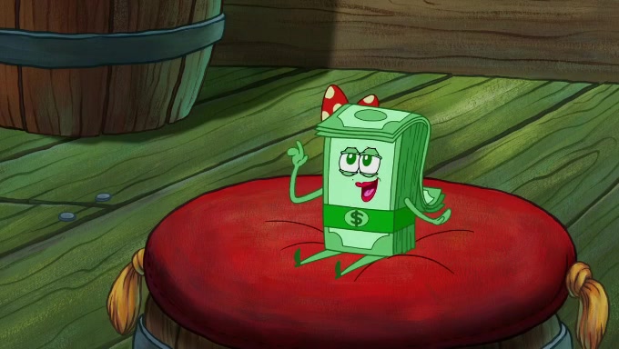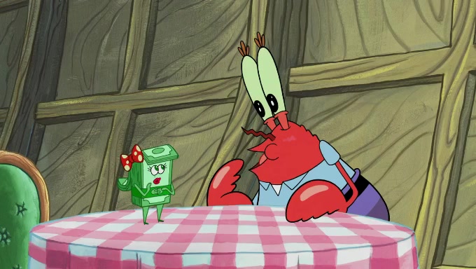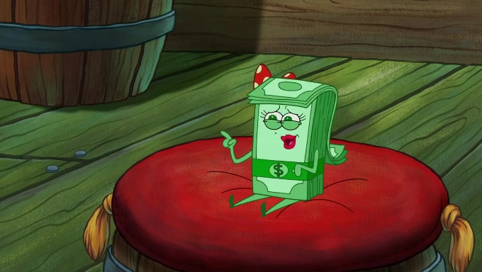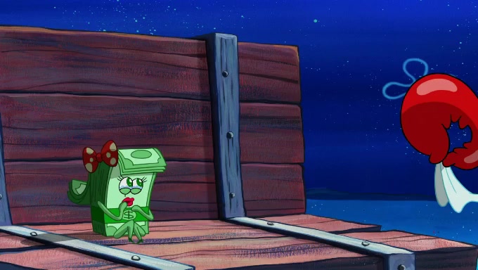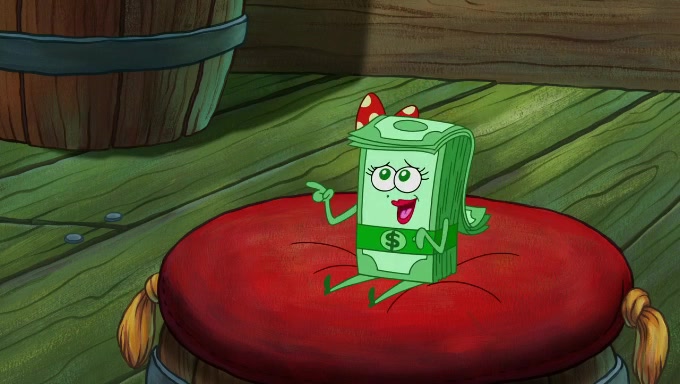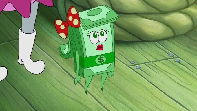 That night, Mr. Krabs takes out the trash from the Krusty Krab and hears someone crying. He spots a small lady made out of dollar bills on a nearby bench and is easily smitten. Mr. Krabs asks why she was crying and she says that her date was supposed to take her to the bank but stood her up. The lady introduces herself as Cashina, and Mr. Krabs asks if he could take her out to dinner. Cashina says that she would love to. Unknown to Mr. Krabs, however, Cashina is actually a robot piloted by Plankton who intends to scam Mr. Krabs into giving him the secret formula.