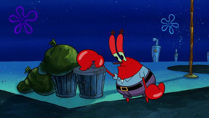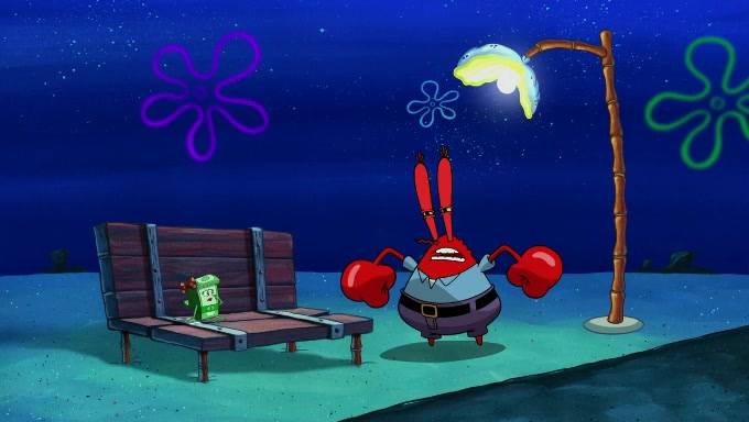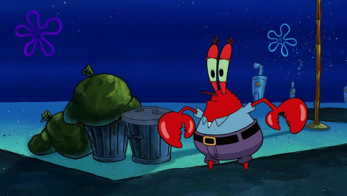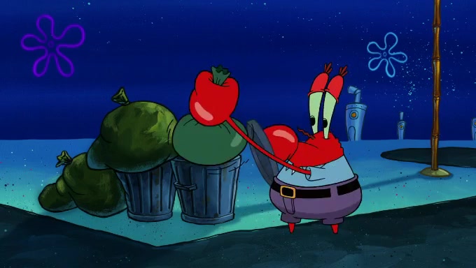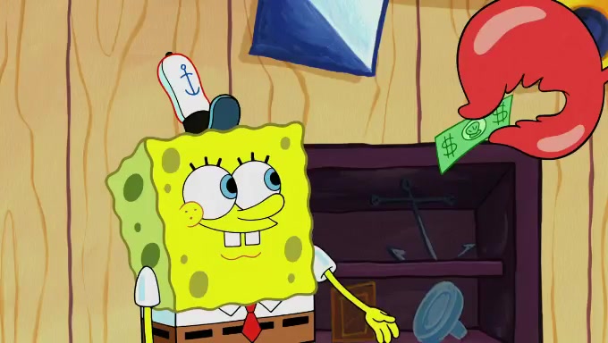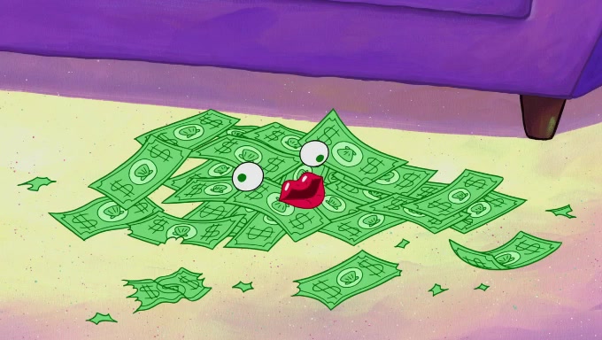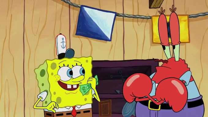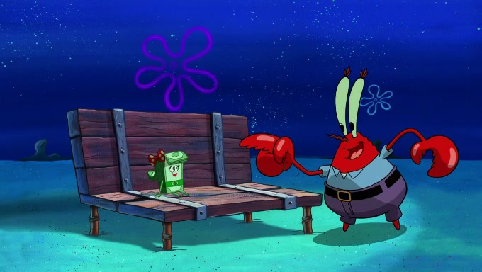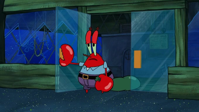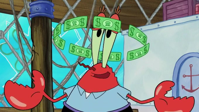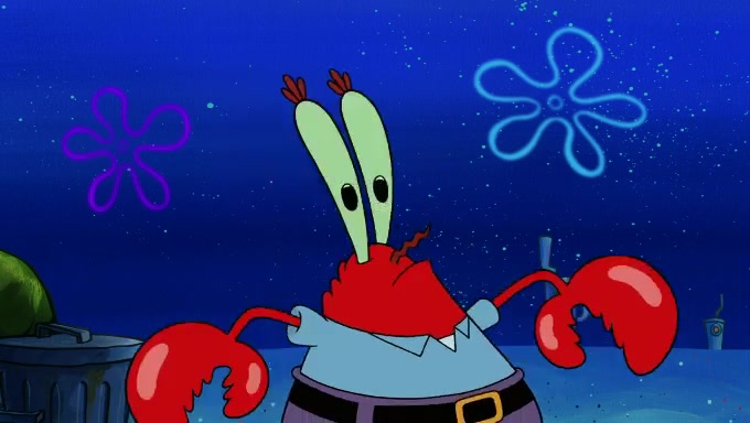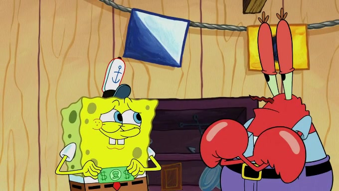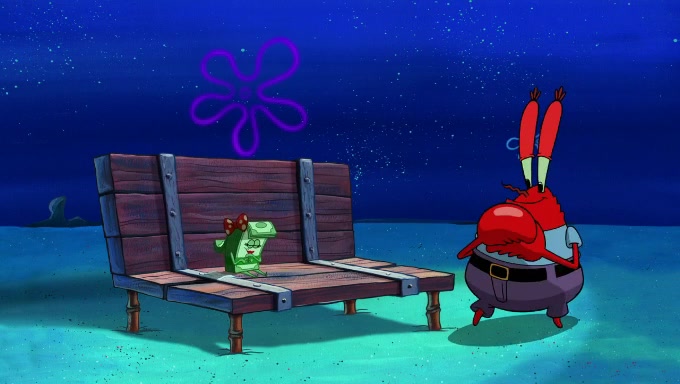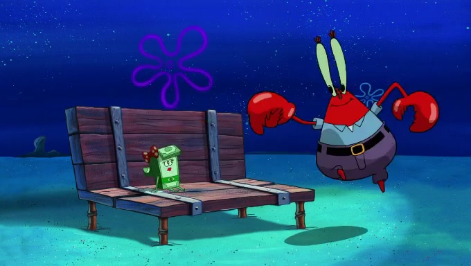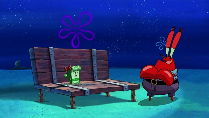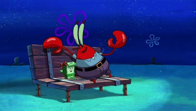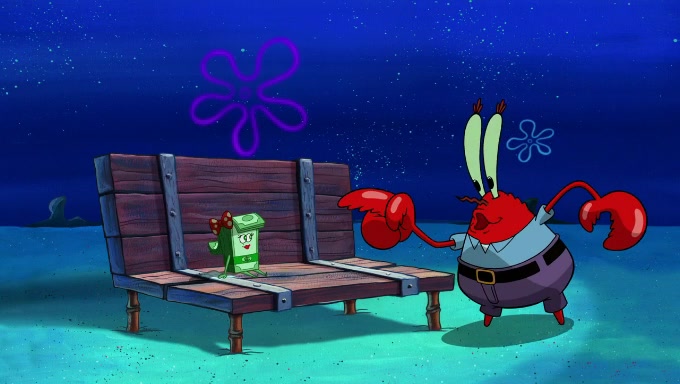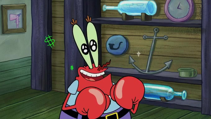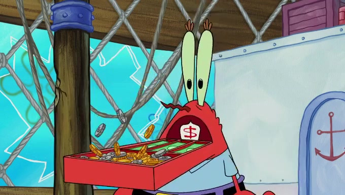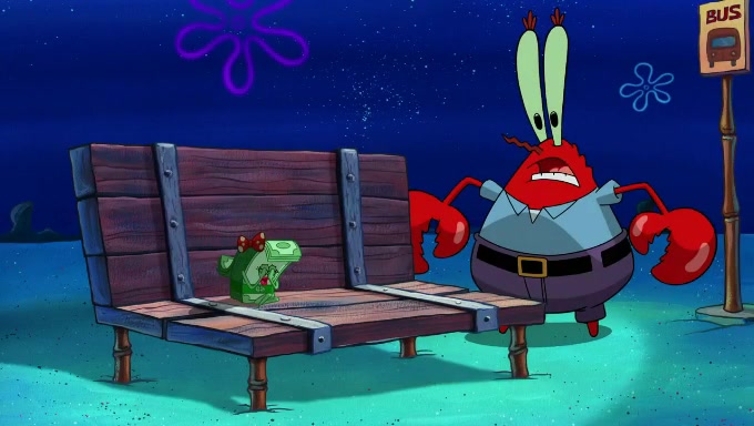 That night, Mr. Krabs takes out the trash from the Krusty Krab and hears someone crying. He spots a small lady made out of dollar bills on a nearby bench and is easily smitten. Mr. Krabs asks why she was crying and she says that her date was supposed to take her to the bank but stood her up. The lady introduces herself as Cashina, and Mr. Krabs asks if he could take her out to dinner. Cashina says that she would love to. Unknown to Mr. Krabs, however, Cashina is actually a robot piloted by Plankton who intends to scam Mr. Krabs into giving him the secret formula.