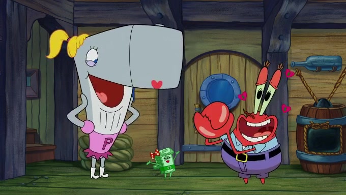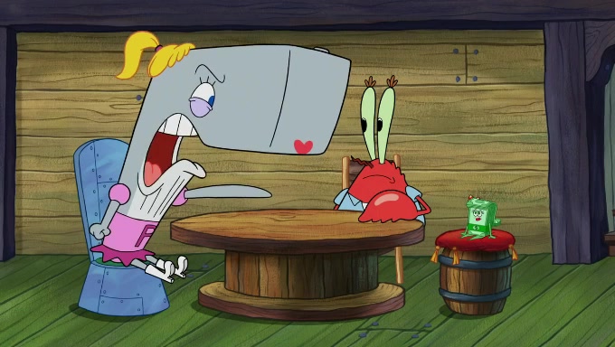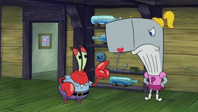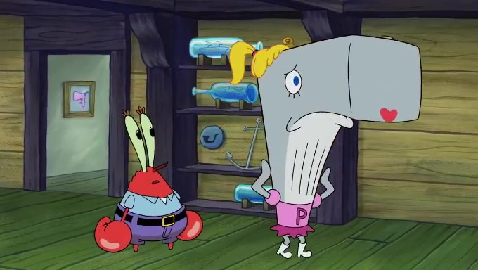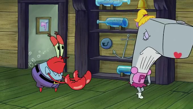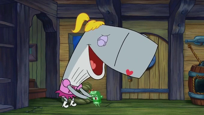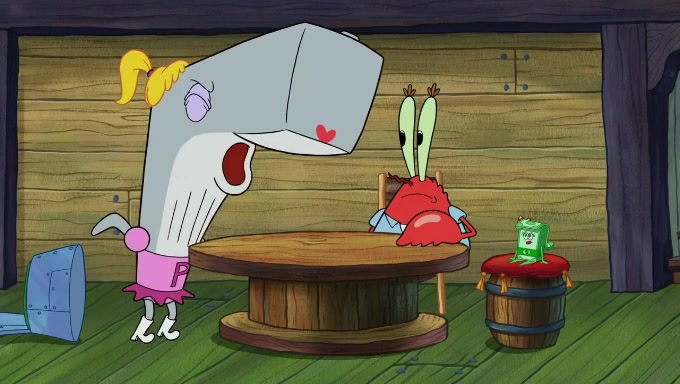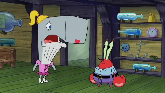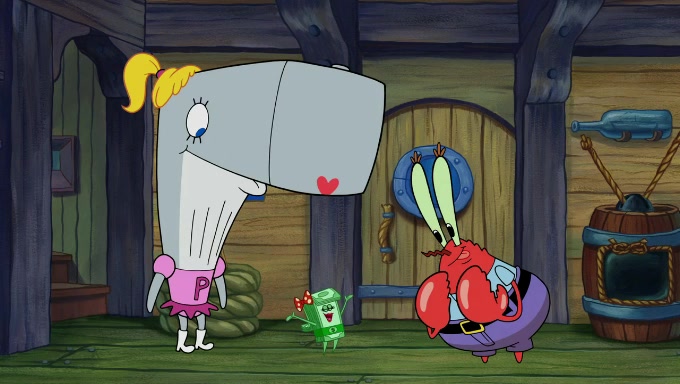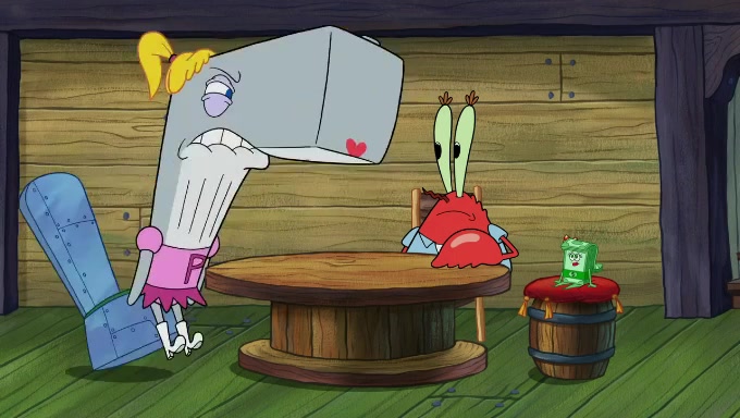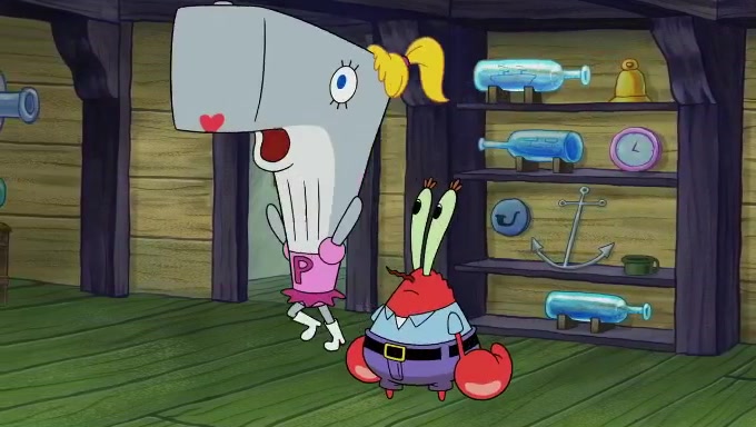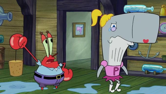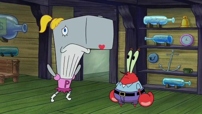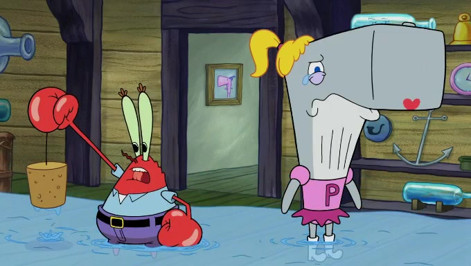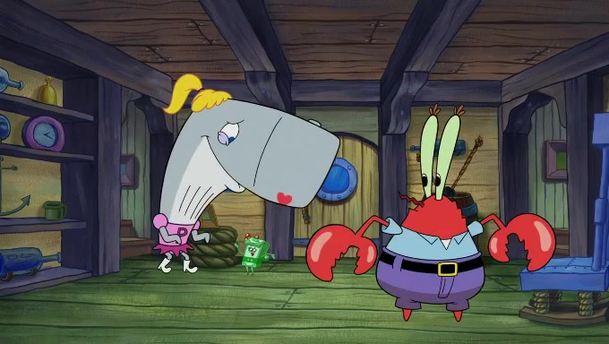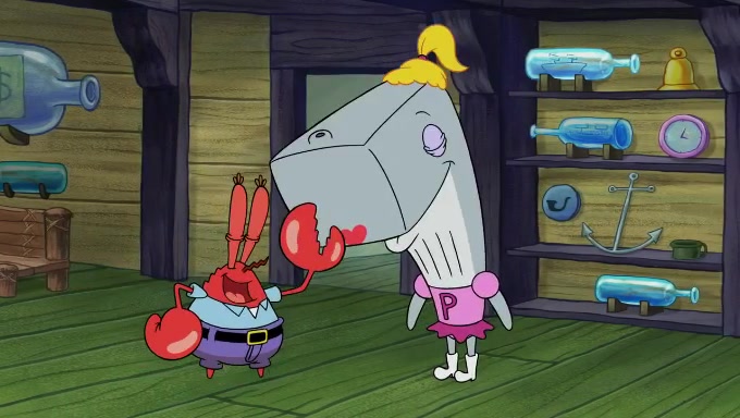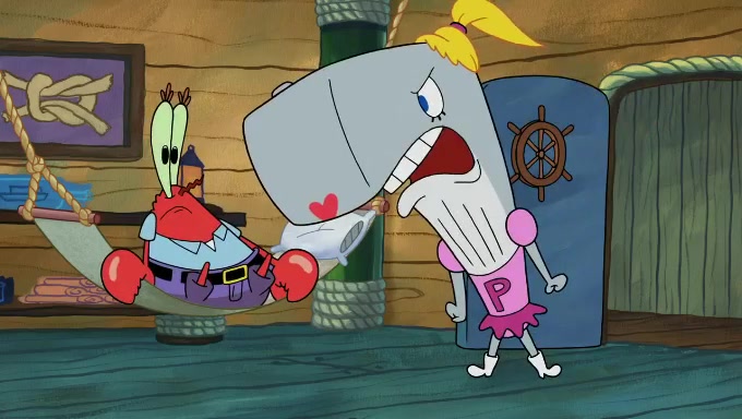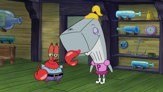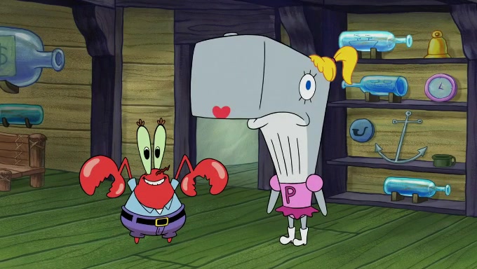 At Mr. Krabs' house, Pearl finds out about his relationship with Cashina and disapproves it, claiming that she can't have a stepmother like the ones she saw in the movies because then she won't get her "Prince Charming." In an attempt to change her mind, Mr. Krabs introduces Pearl to Cashina. However, Pearl immediately doesn't like her and storms off to her room. Mr. Krabs wants to talk to Pearl, but Cashina says that she will do it alone. She successfully manages to get Pearl to like her, talking about girl things. Witnessing this, Mr. Krabs decides to propose to Cashina, bringing Plankton one step closer to the formula.