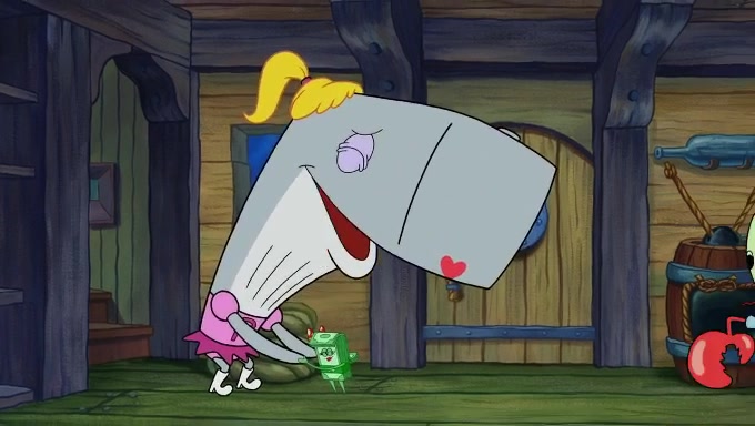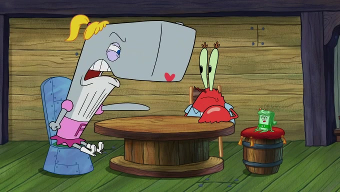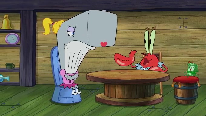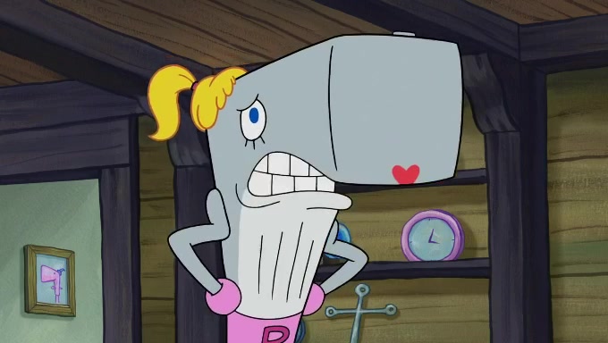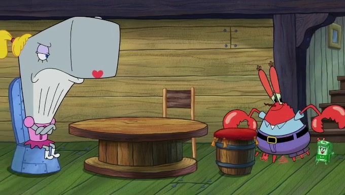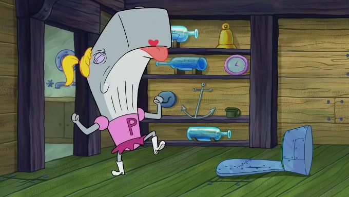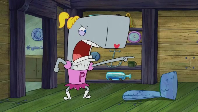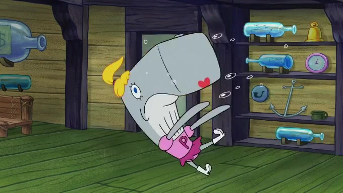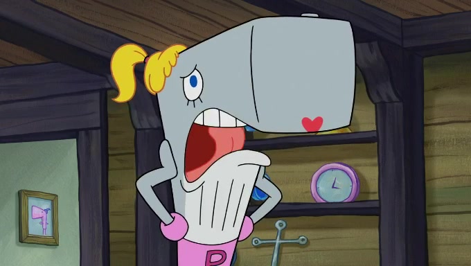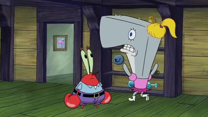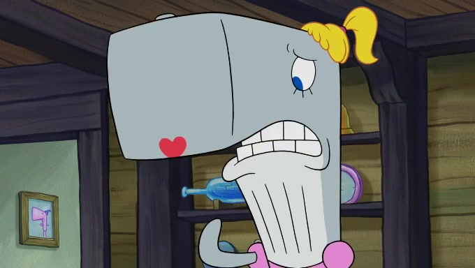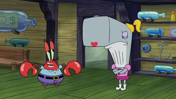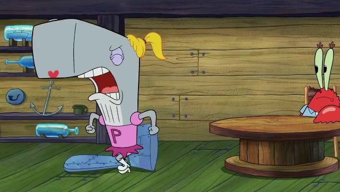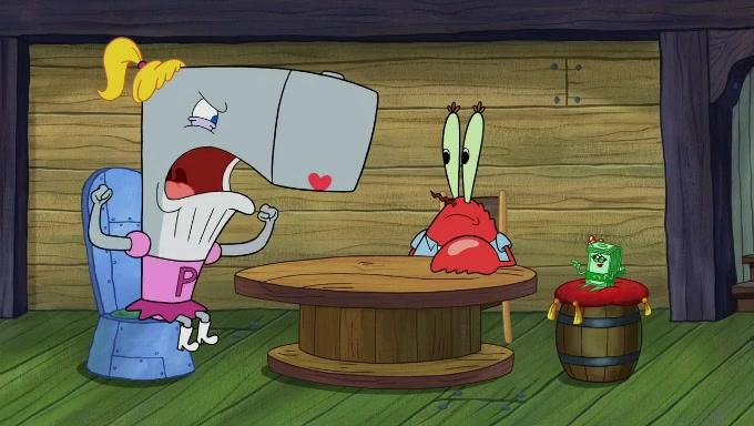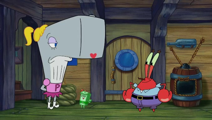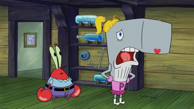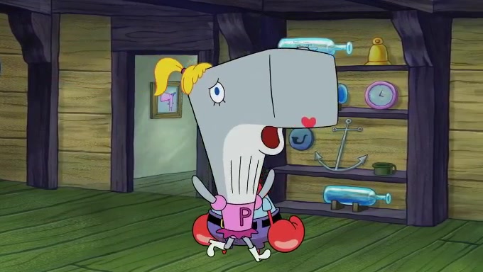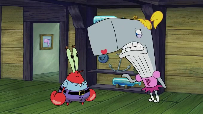 At Mr. Krabs' house, Pearl finds out about his relationship with Cashina and disapproves it, claiming that she can't have a stepmother like the ones she saw in the movies because then she won't get her "Prince Charming." In an attempt to change her mind, Mr. Krabs introduces Pearl to Cashina. However, Pearl immediately doesn't like her and storms off to her room. Mr. Krabs wants to talk to Pearl, but Cashina says that she will do it alone. She successfully manages to get Pearl to like her, talking about girl things. Witnessing this, Mr. Krabs decides to propose to Cashina, bringing Plankton one step closer to the formula.