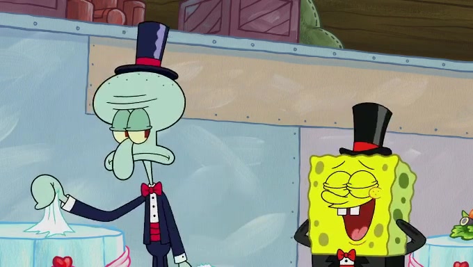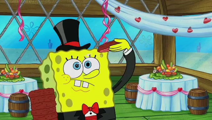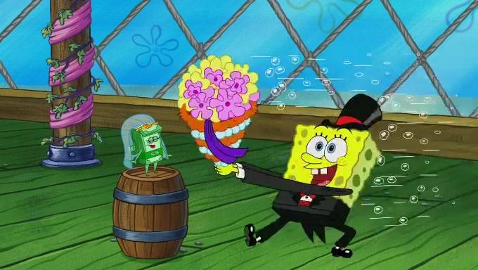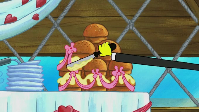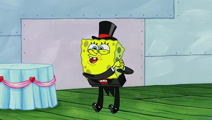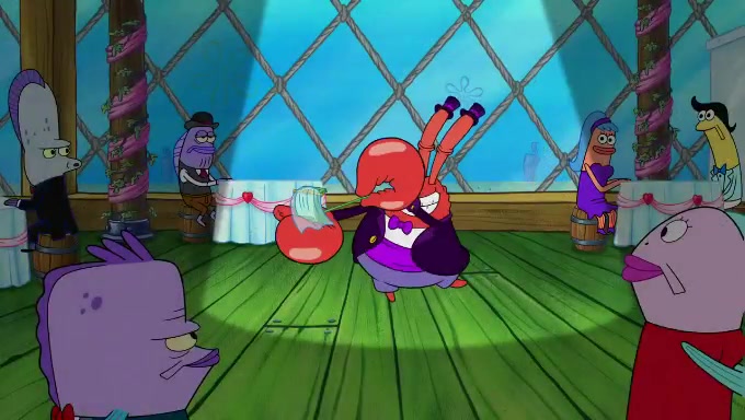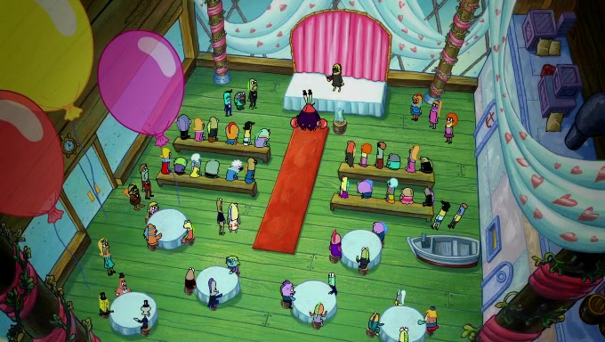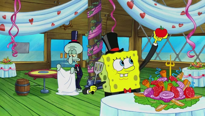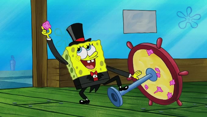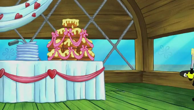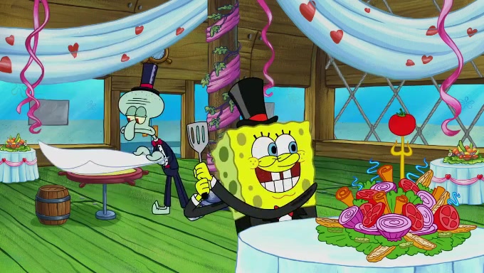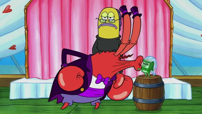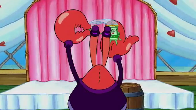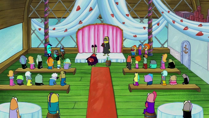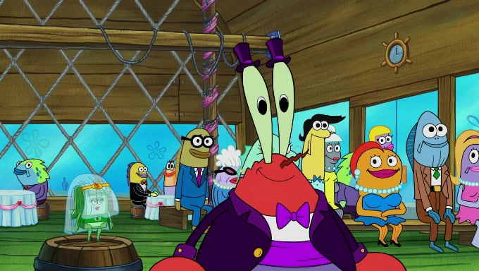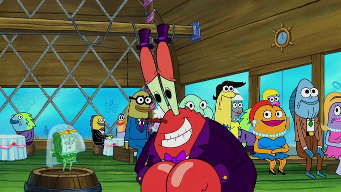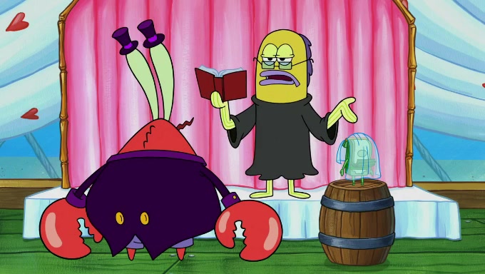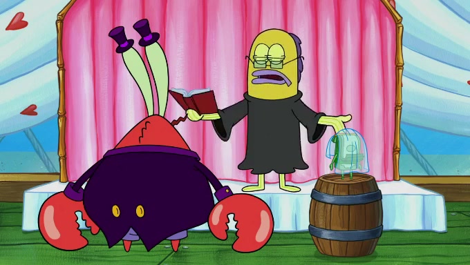 The next day, SpongeBob, Patrick, and Squidward set up wedding decorations all over the Krusty Krab. As the wedding between Mr. Krabs and Cashina takes place, the two exchange vows and then kiss, causing Mr. Krabs to be electrocuted again. Thus, Mr. Krabs and Cashina are officially married. SpongeBob then provides Cashina a bouquet of flowers to toss towards a group of ladies attending the wedding, but Patrick catches and swallows the whole bouquet. At the reception, SpongeBob wonders where Plankton was the whole time as Mr. Krabs dances with Cashina and swings her around, causing Plankton to become dizzy.