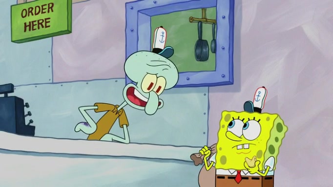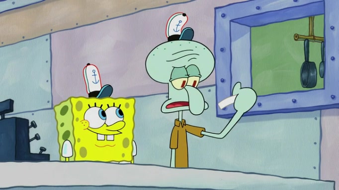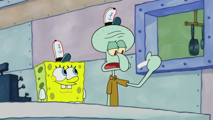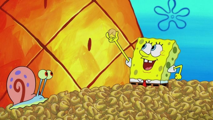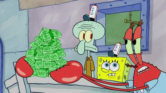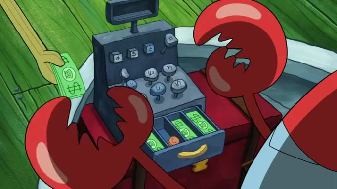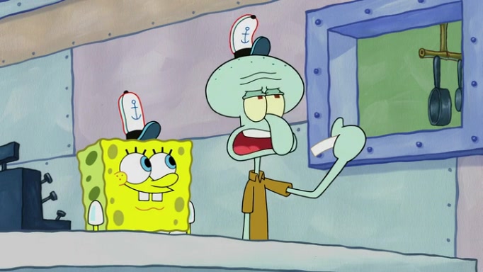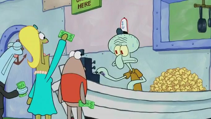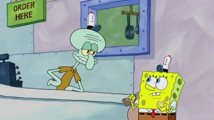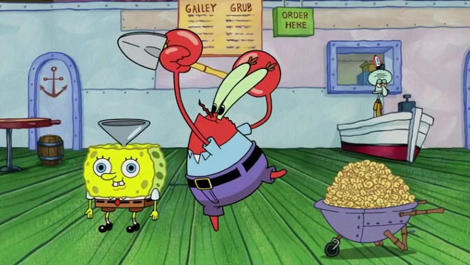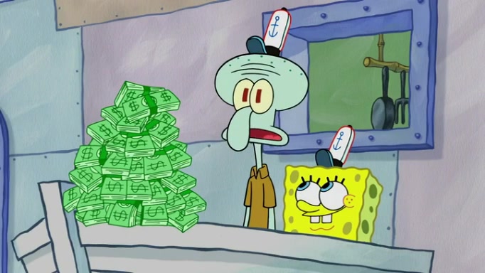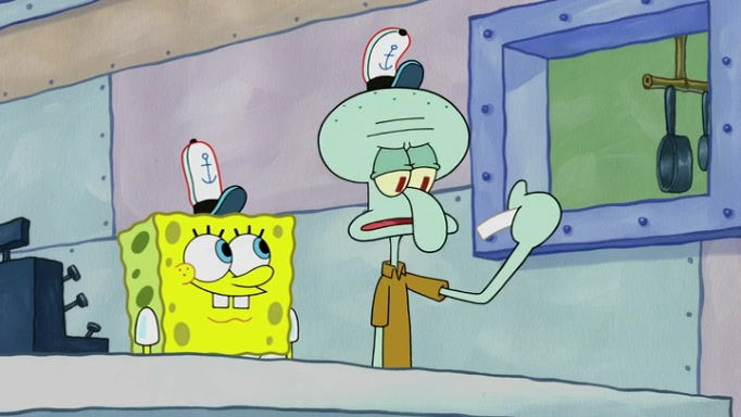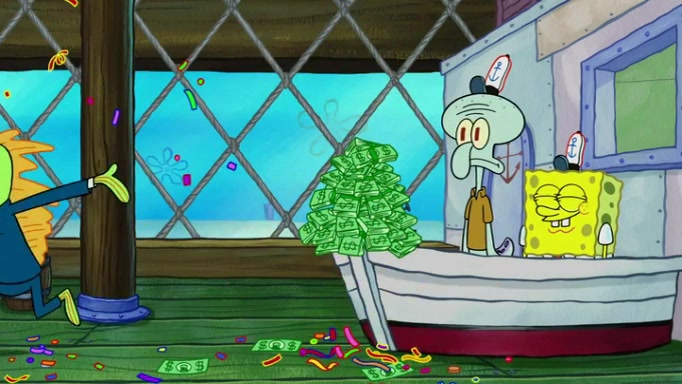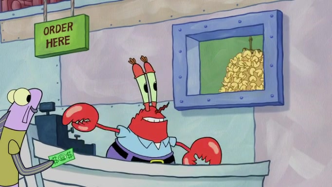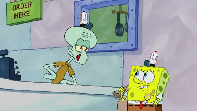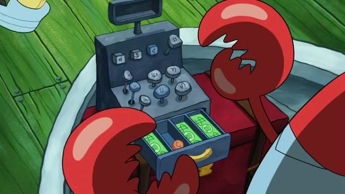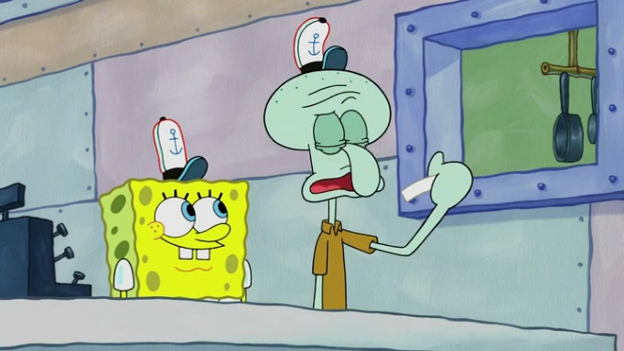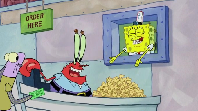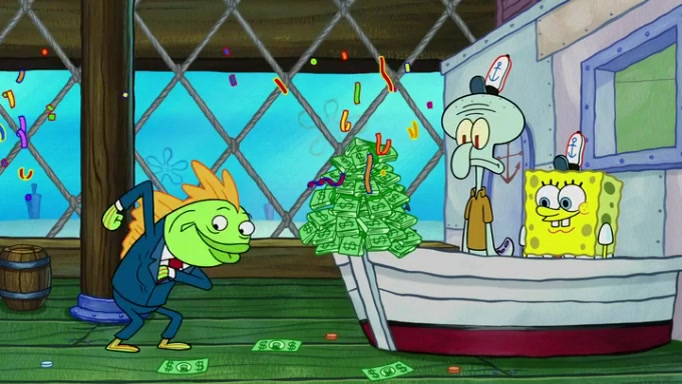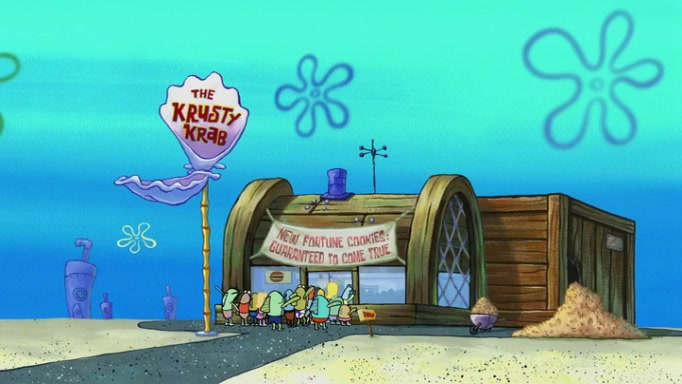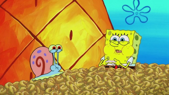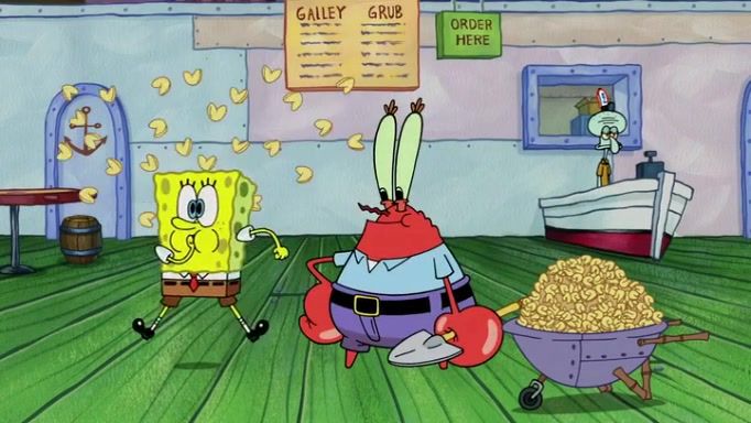SpongeBob then takes them to the Krusty Krab where he tries to convince Mr. Krabs to give them away with every purchase but Mr. Krabs shuts down his idea. Squidward backs him up by saying that they are lame and that fortune cookies never come true. SpongeBob tells Squidward to try one, and when he opens it, it reads, "You will be rewarded for your particular talents." Squidward is presumably about to say how that will not happen before he wins the "most miserable cashier in Bikini Bottom" contest. He then gets a cash prize, which gets immediately purloined by Mr. Krabs. Soon after Mr. Krabs snatches Squidward's prize, SpongeBob assures Mr. Krabs about selling his magical cookies, which flips his thoughts about selling them, and decides to share them with the folks of Bikini Bottom.