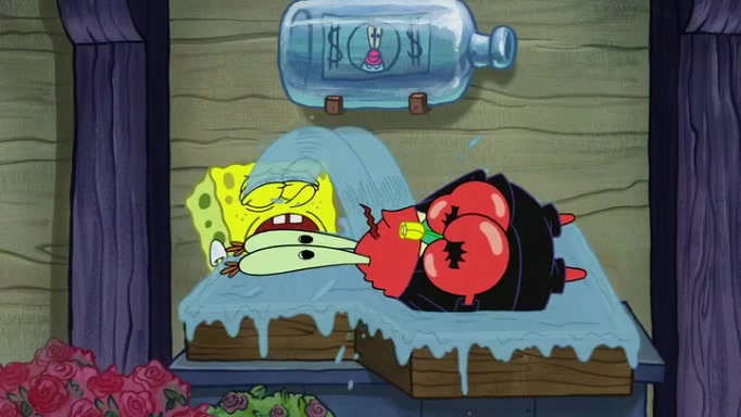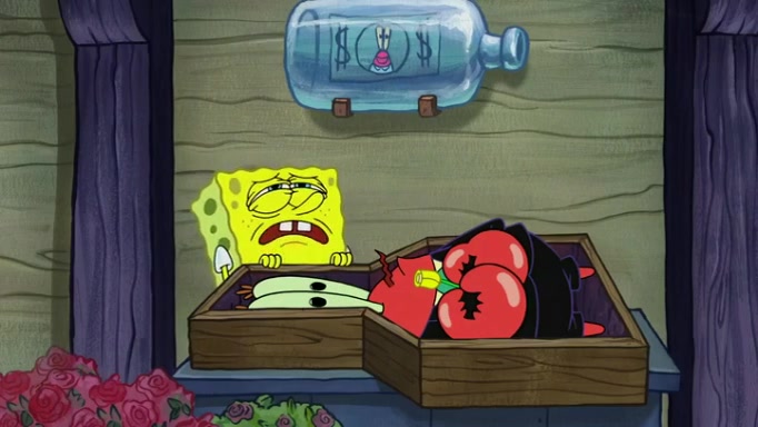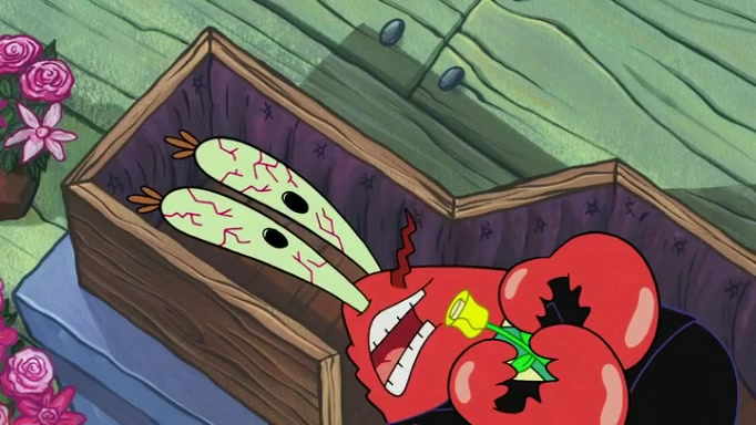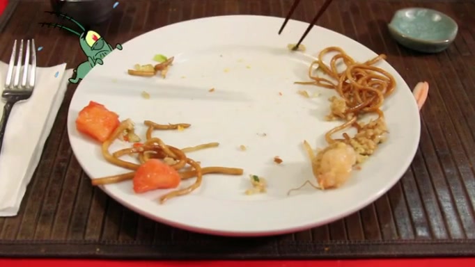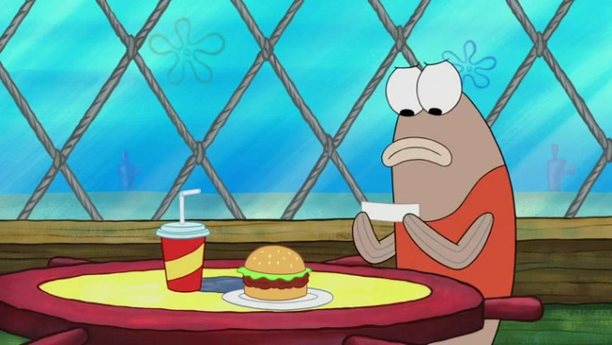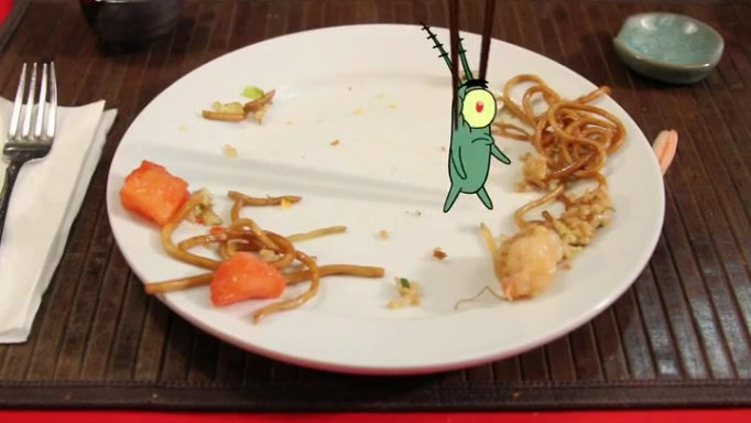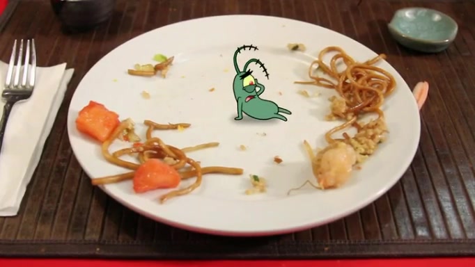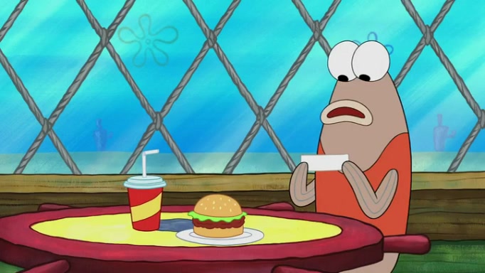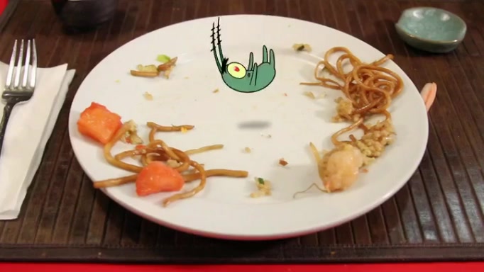 Later, Plankton creates another fortune that says Mr. Krabs will die unless he gives up the Krabby Patty formula. Mr. Krabs is very shocked to see that. Then Mr. Krabs has a vision of what will happen if he dies. After his thought, SpongeBob and Mr. Krabs agree to give Plankton the formula. Back at the Chum Bucket, Karen is giving the customers some Chumbalaya but even though the customers find it disgusting, they still eat it due to the fake fortunes. Mr. Krabs and SpongeBob both make it to the Chum Bucket to deliver the formula to Plankton. SpongeBob tries to give Plankton the formula but it falls down and Mr. Krabs all of a sudden grabs the formula. Plankton then tells everyone to get out of the restaurant because he wrote the fake fortunes. Mr. Krabs then gives him one fortune cookie. The fortune says: "You will go on a long voyage where you will get everything you deserve." Which then Plankton is taken to a different restaurant called Chinese Food where a live-action customer eats him. Then the episode ends.