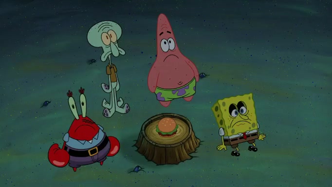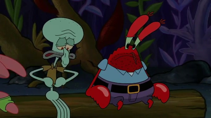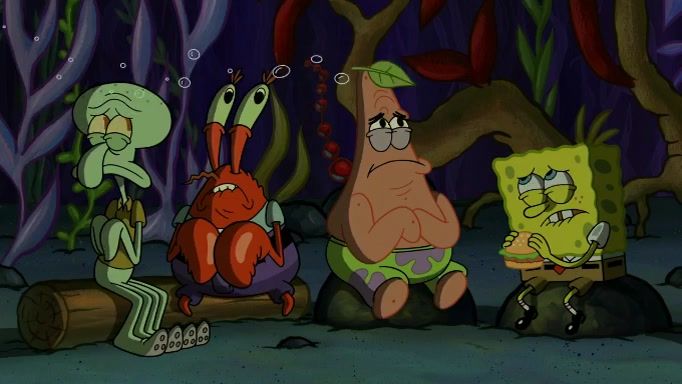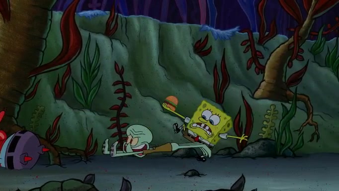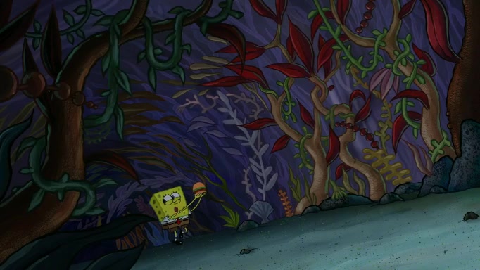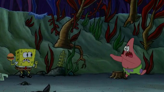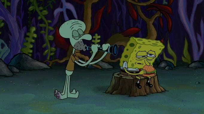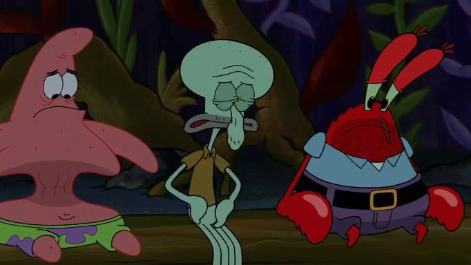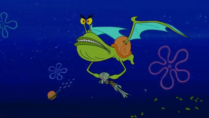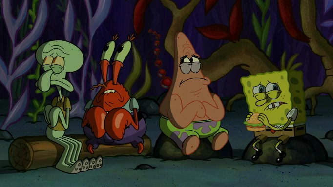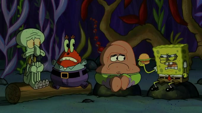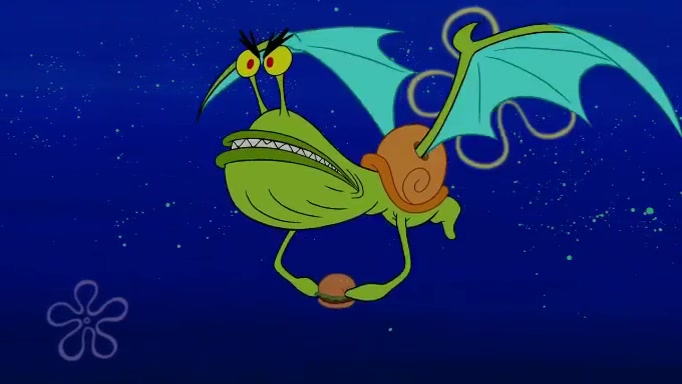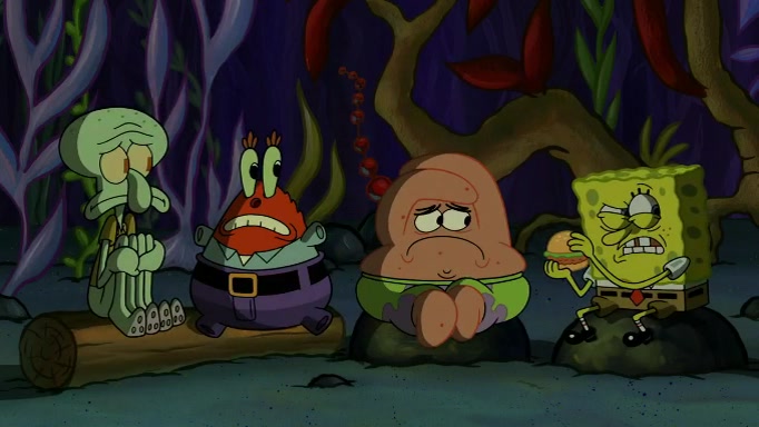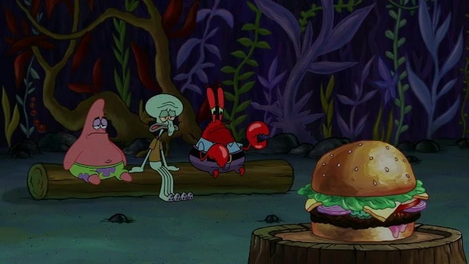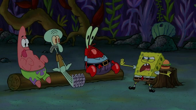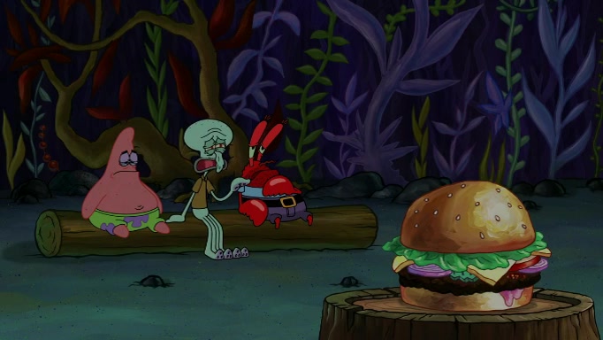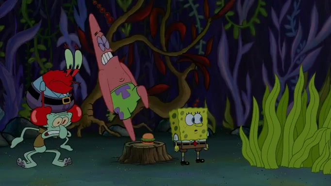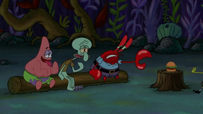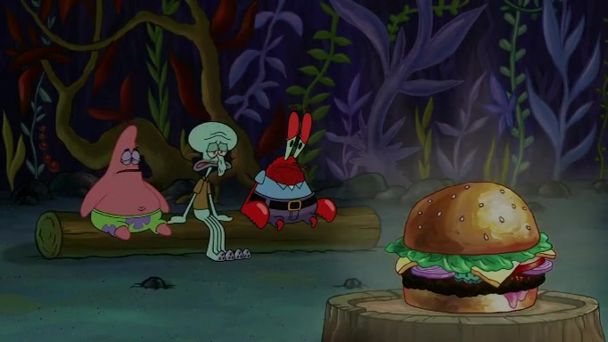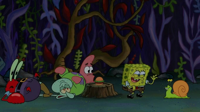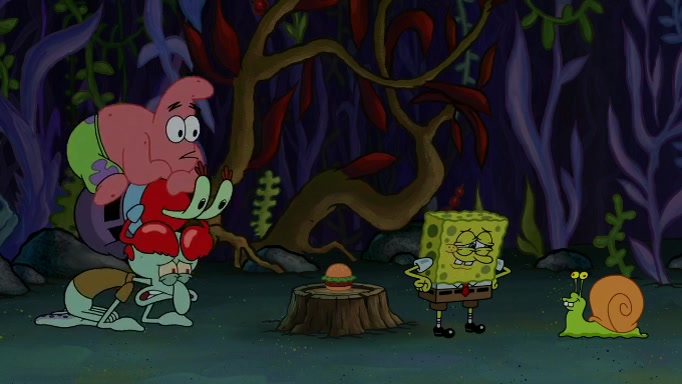 The French Narrator begins to speak as SpongeBob and Patrick begin to pull the trailer with Mr. Krabs and Squidward on it. They go through the desert and up a snowy mountain until they make it to a forest. SpongeBob and Patrick are worn out from the trip. Squidward advises to Mr. Krabs that they stop for the night since SpongeBob and Patrick are in no condition to continue. Later, the four of them are around a fire frightened by the creatures in the forest. SpongeBob tells everyone that they must guard the last Krabby Patty, but a small snail comes out of the woods. Unfortunately, it transforms into a large, winged monster that grabs the Krabby Patty and flies off. Mr. Krabs then tosses Squidward at the Krabby Patty knocking it out of the monster's claws. The monster takes a bite out of Squidward but spits him out in disgust. SpongeBob grabs the Krabby Patty while Squidward lands on his face.