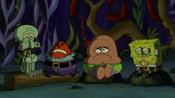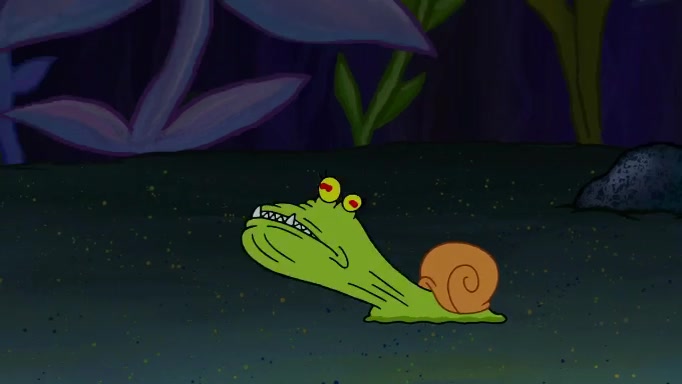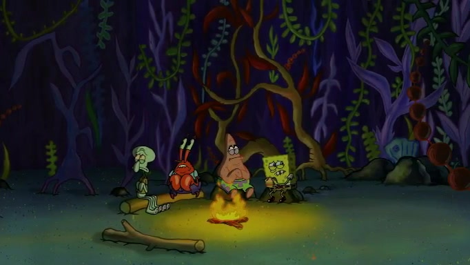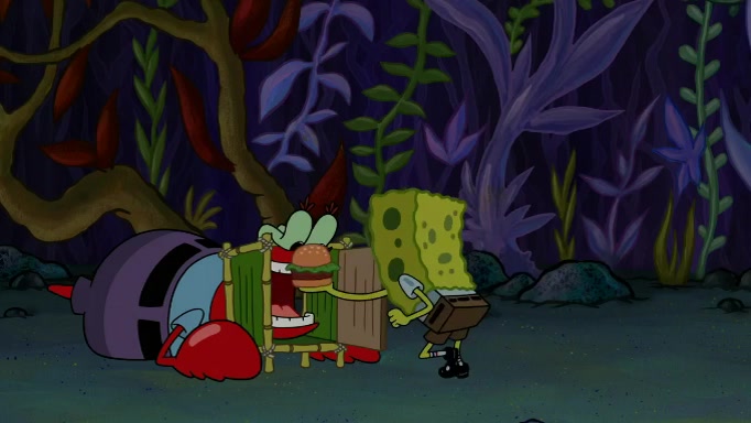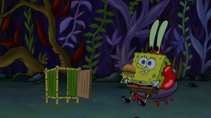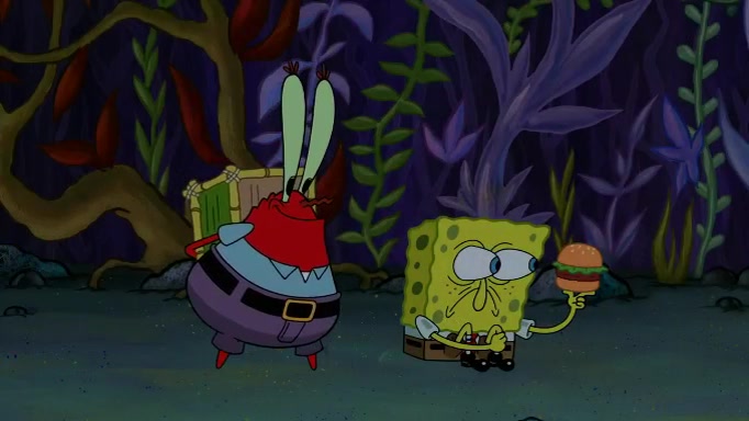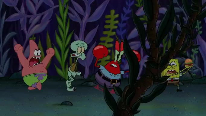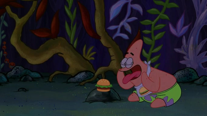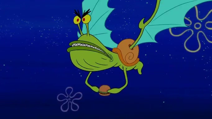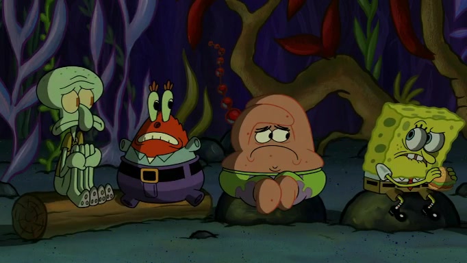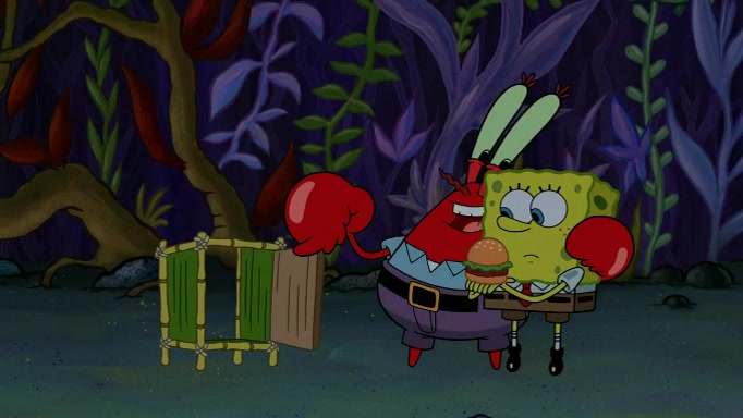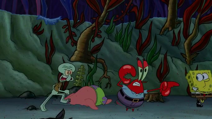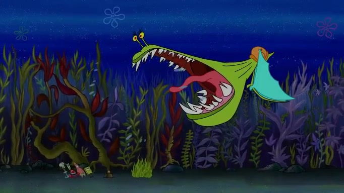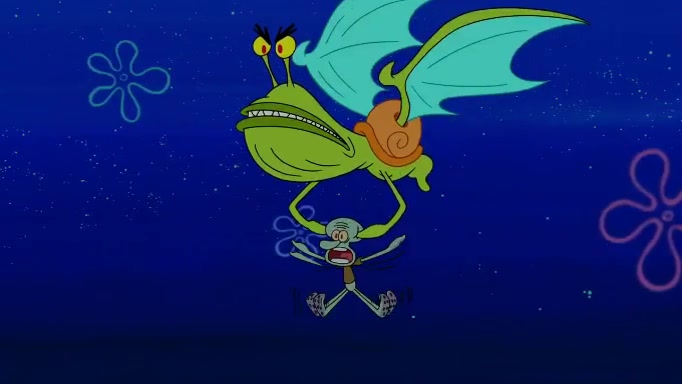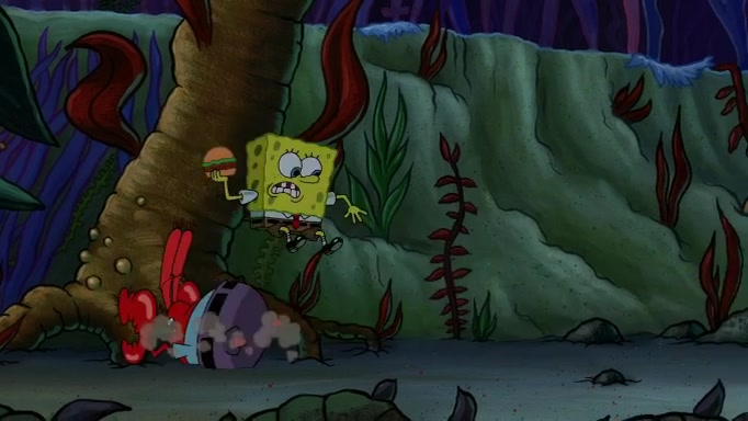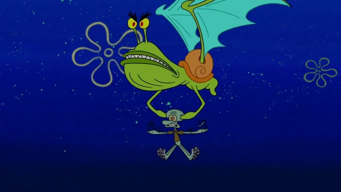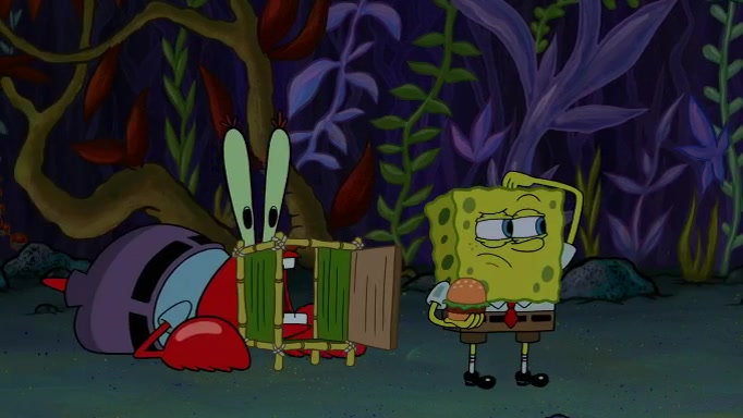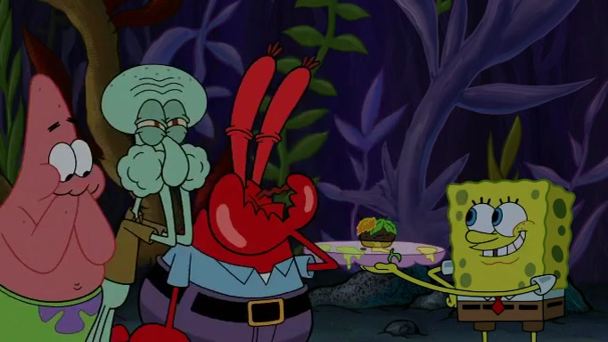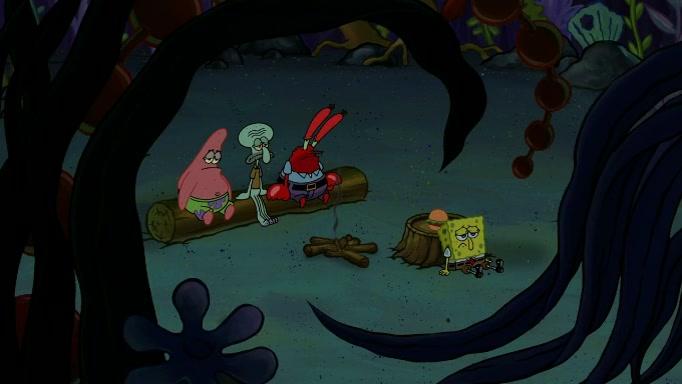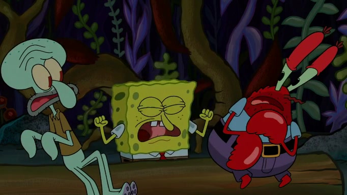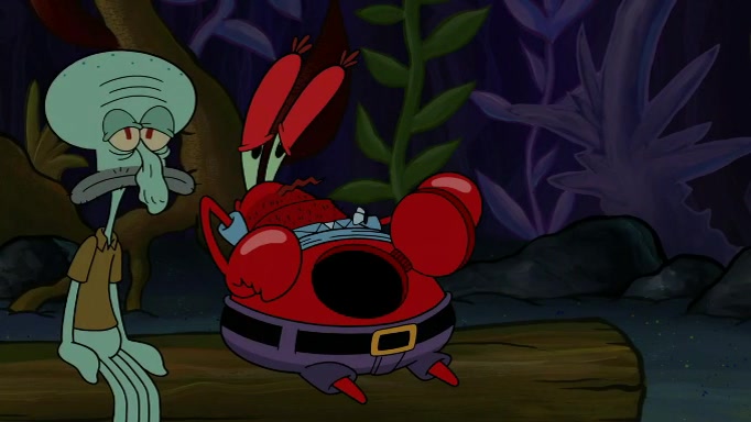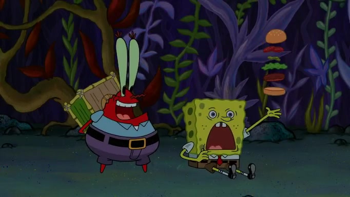 The French Narrator begins to speak as SpongeBob and Patrick begin to pull the trailer with Mr. Krabs and Squidward on it. They go through the desert and up a snowy mountain until they make it to a forest. SpongeBob and Patrick are worn out from the trip. Squidward advises to Mr. Krabs that they stop for the night since SpongeBob and Patrick are in no condition to continue. Later, the four of them are around a fire frightened by the creatures in the forest. SpongeBob tells everyone that they must guard the last Krabby Patty, but a small snail comes out of the woods. Unfortunately, it transforms into a large, winged monster that grabs the Krabby Patty and flies off. Mr. Krabs then tosses Squidward at the Krabby Patty knocking it out of the monster's claws. The monster takes a bite out of Squidward but spits him out in disgust. SpongeBob grabs the Krabby Patty while Squidward lands on his face.