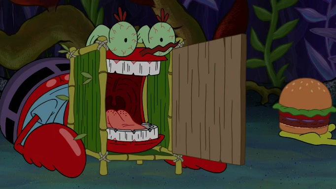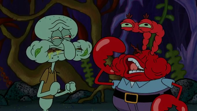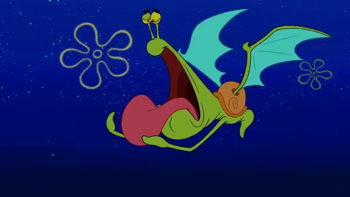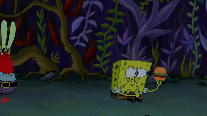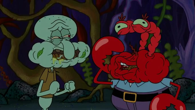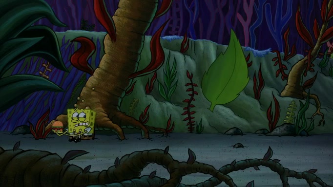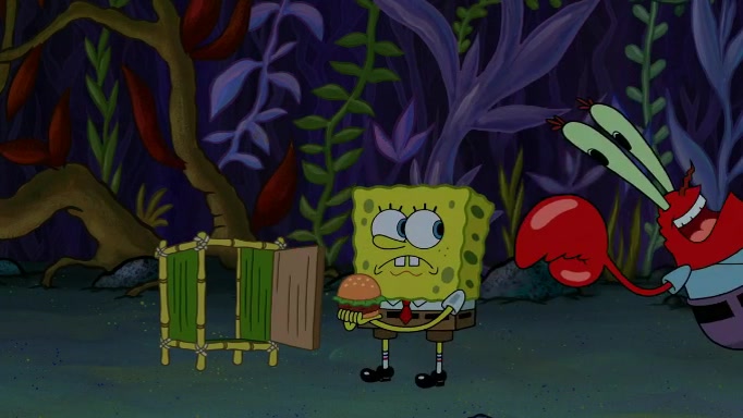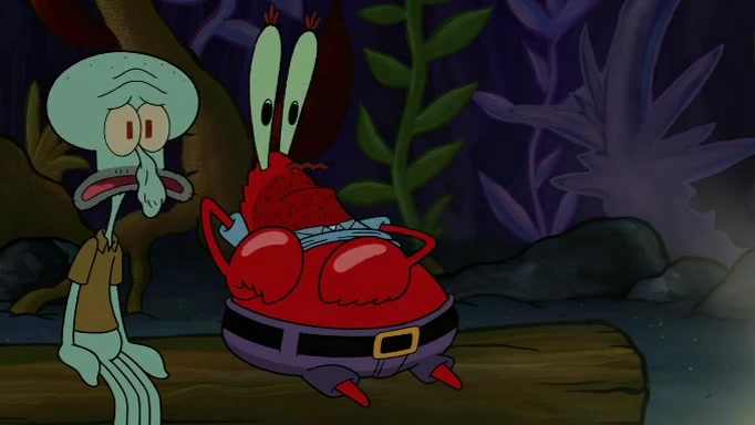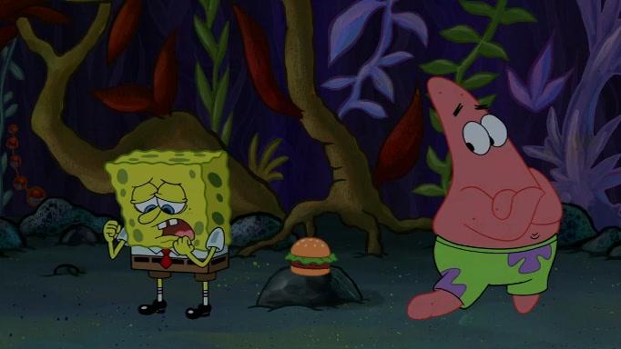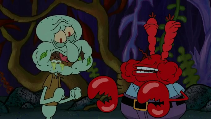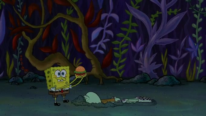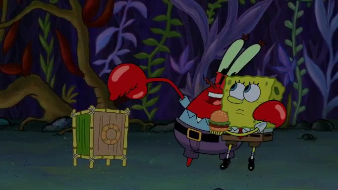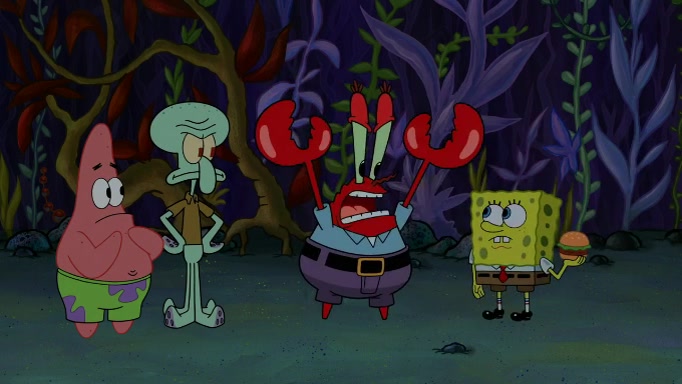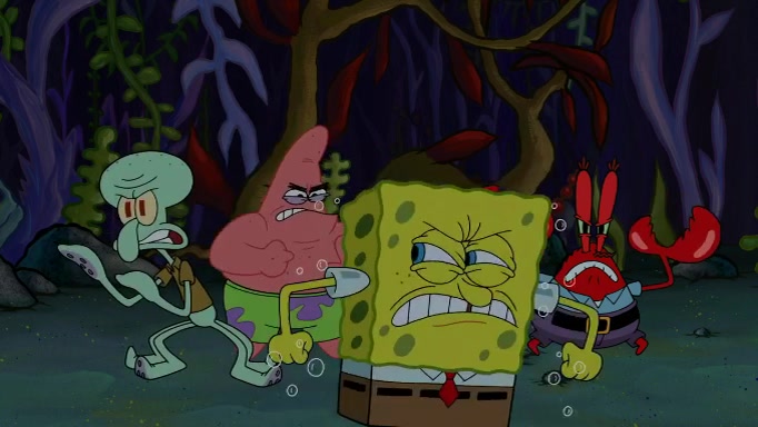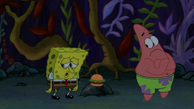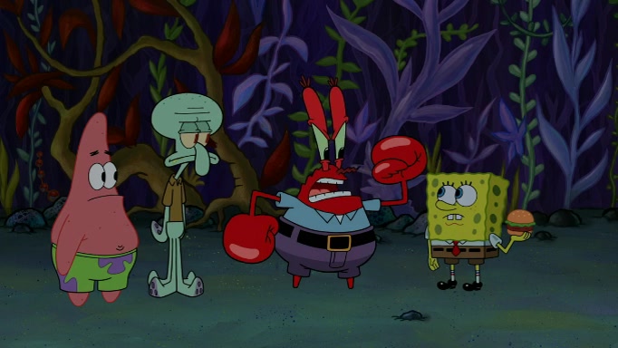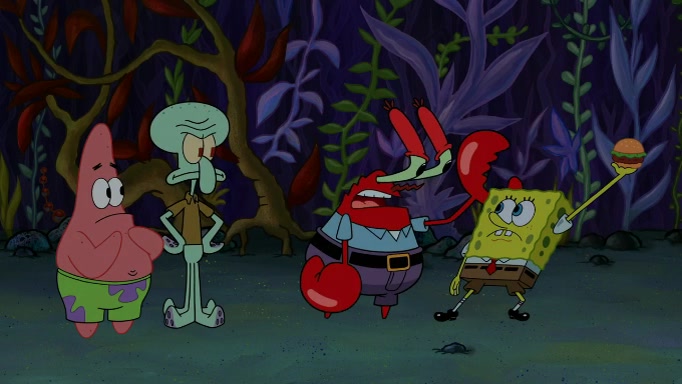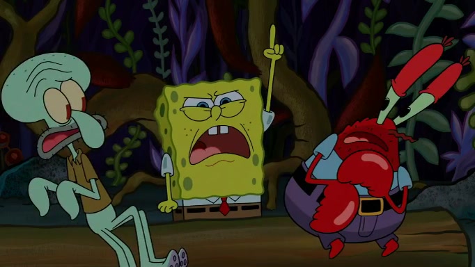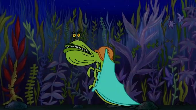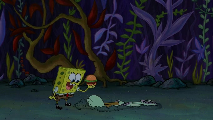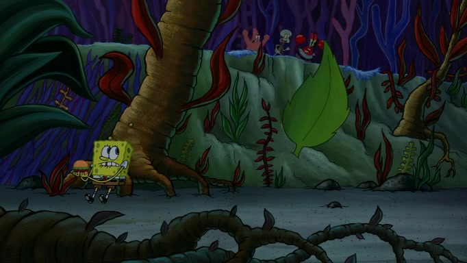 The French Narrator begins to speak as SpongeBob and Patrick begin to pull the trailer with Mr. Krabs and Squidward on it. They go through the desert and up a snowy mountain until they make it to a forest. SpongeBob and Patrick are worn out from the trip. Squidward advises to Mr. Krabs that they stop for the night since SpongeBob and Patrick are in no condition to continue. Later, the four of them are around a fire frightened by the creatures in the forest. SpongeBob tells everyone that they must guard the last Krabby Patty, but a small snail comes out of the woods. Unfortunately, it transforms into a large, winged monster that grabs the Krabby Patty and flies off. Mr. Krabs then tosses Squidward at the Krabby Patty knocking it out of the monster's claws. The monster takes a bite out of Squidward but spits him out in disgust. SpongeBob grabs the Krabby Patty while Squidward lands on his face.