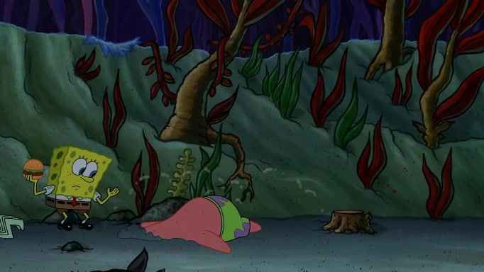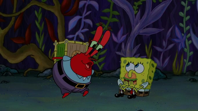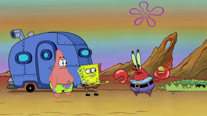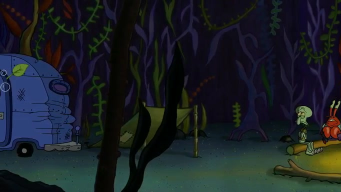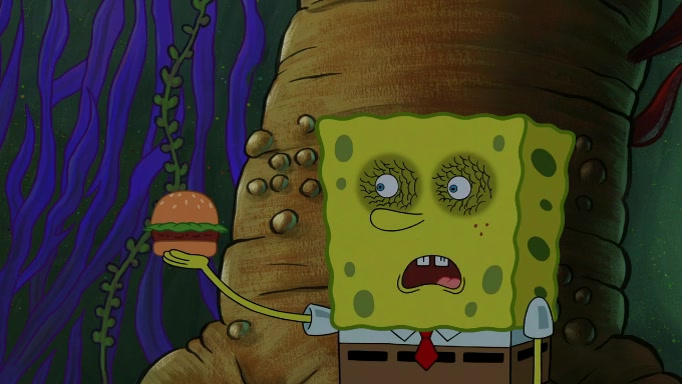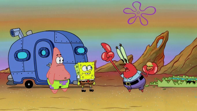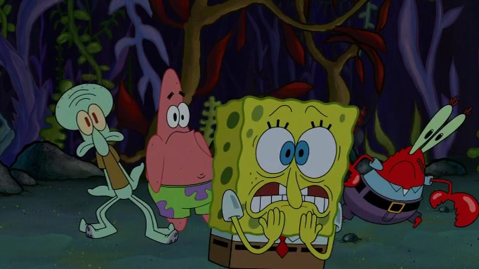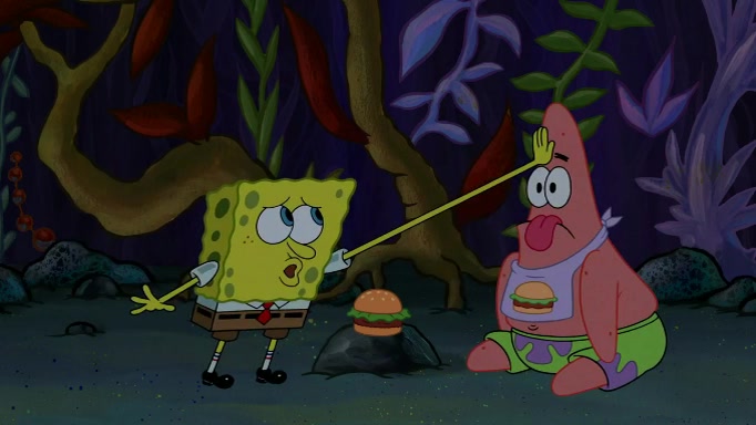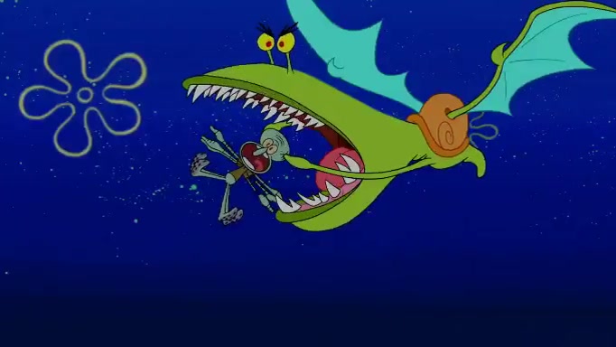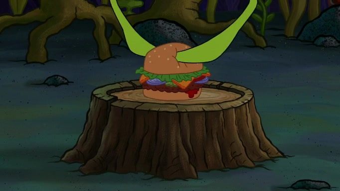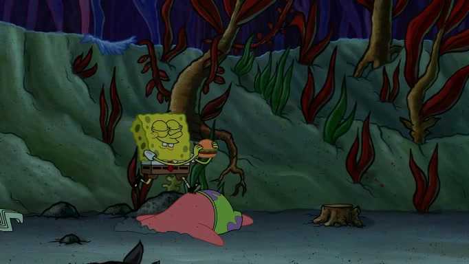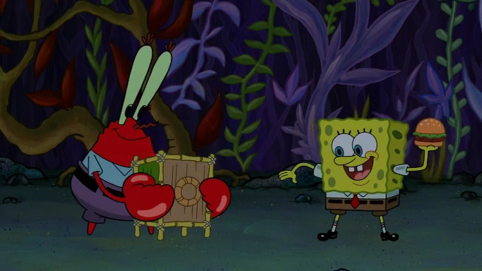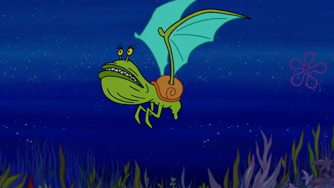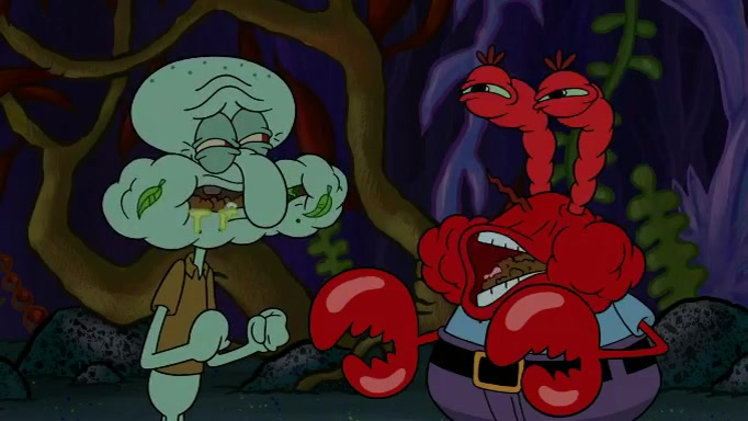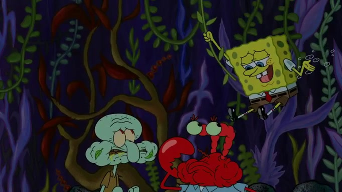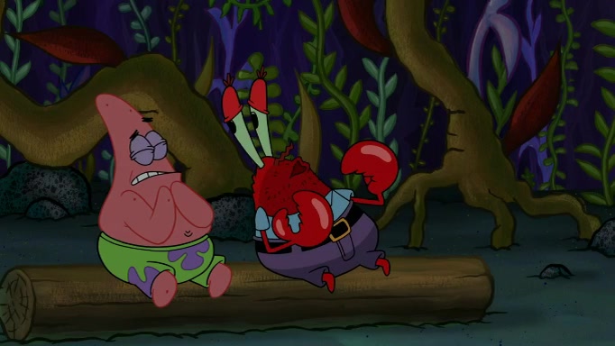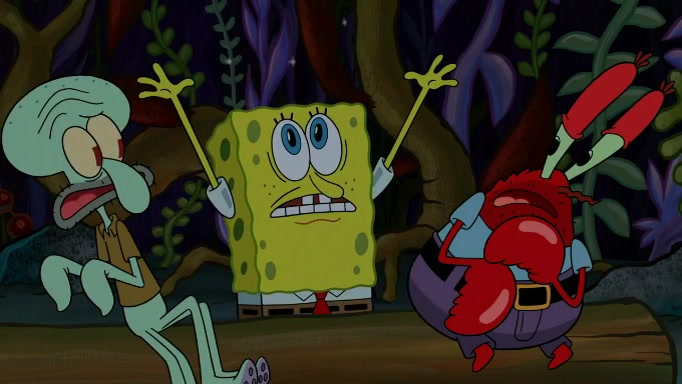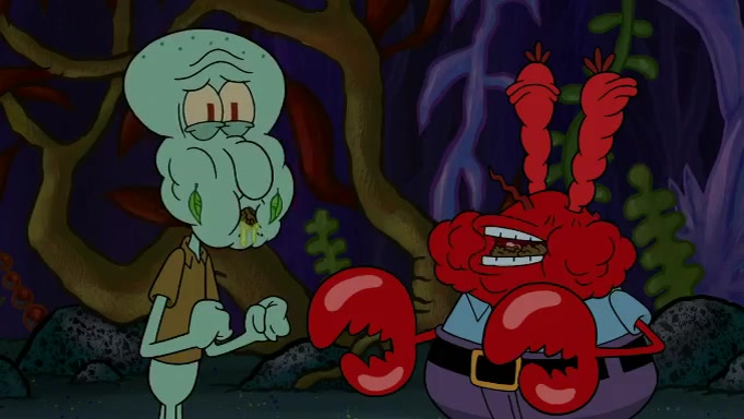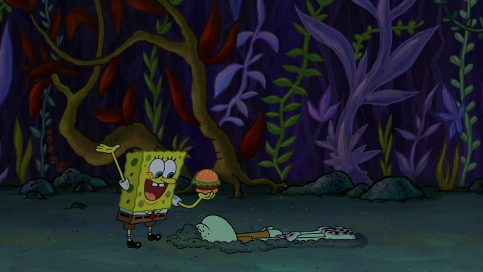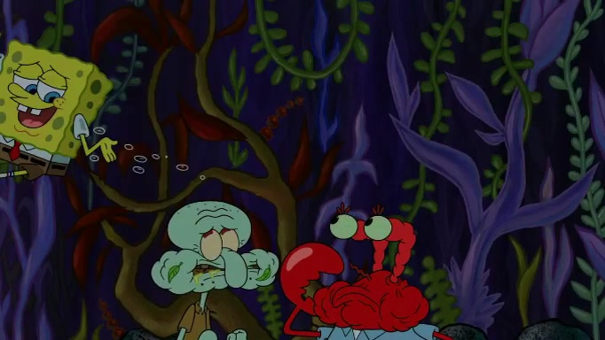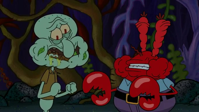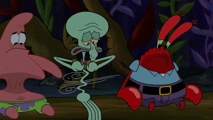 The French Narrator begins to speak as SpongeBob and Patrick begin to pull the trailer with Mr. Krabs and Squidward on it. They go through the desert and up a snowy mountain until they make it to a forest. SpongeBob and Patrick are worn out from the trip. Squidward advises to Mr. Krabs that they stop for the night since SpongeBob and Patrick are in no condition to continue. Later, the four of them are around a fire frightened by the creatures in the forest. SpongeBob tells everyone that they must guard the last Krabby Patty, but a small snail comes out of the woods. Unfortunately, it transforms into a large, winged monster that grabs the Krabby Patty and flies off. Mr. Krabs then tosses Squidward at the Krabby Patty knocking it out of the monster's claws. The monster takes a bite out of Squidward but spits him out in disgust. SpongeBob grabs the Krabby Patty while Squidward lands on his face.