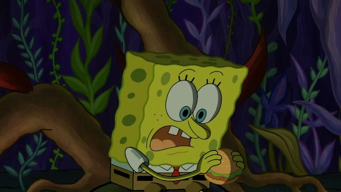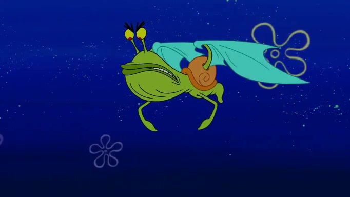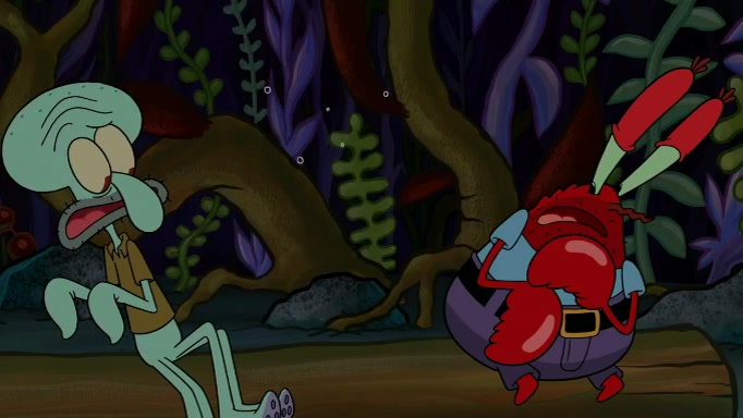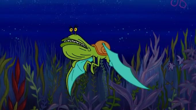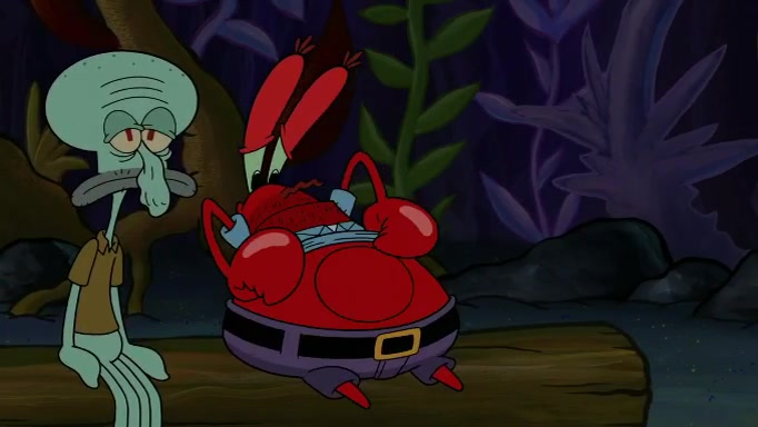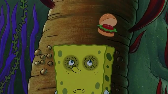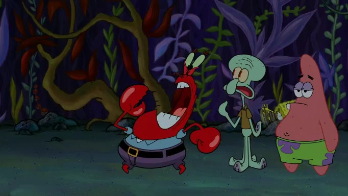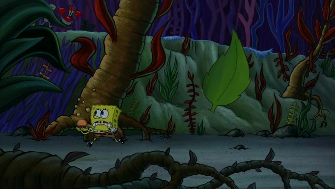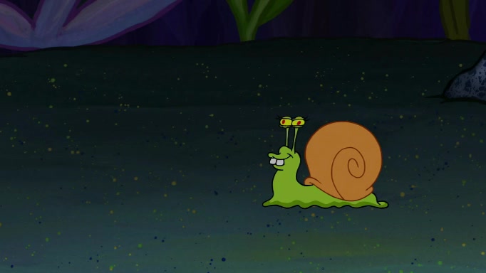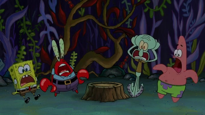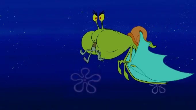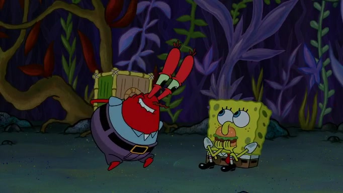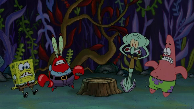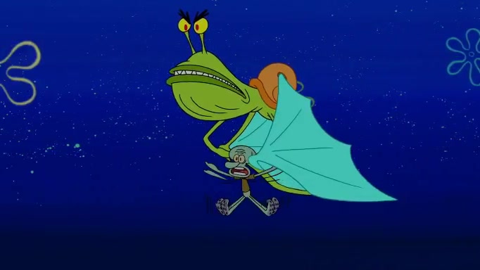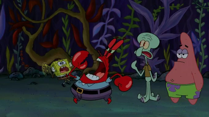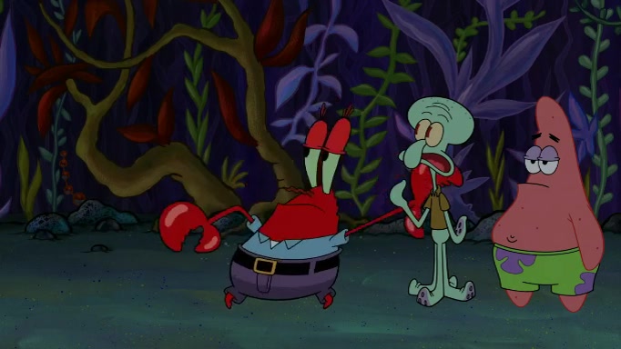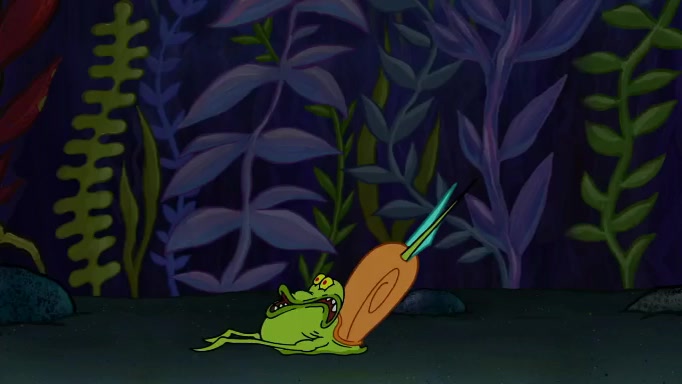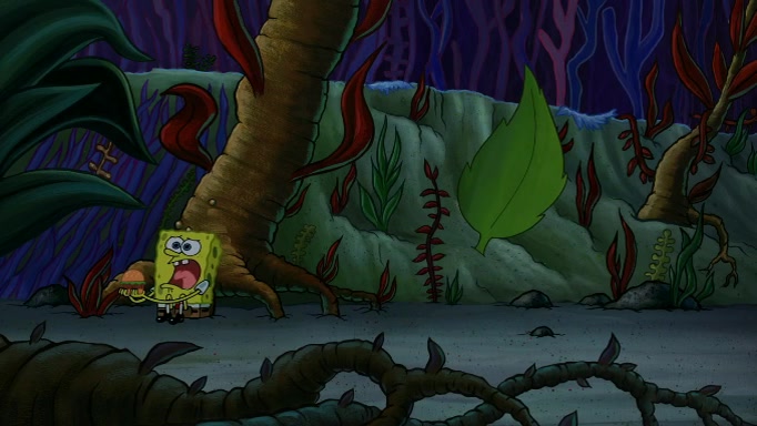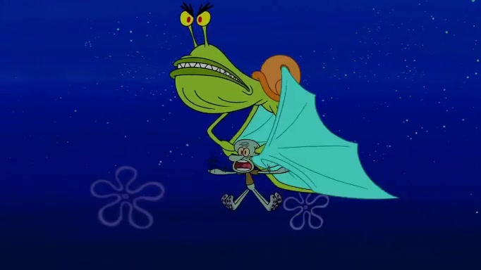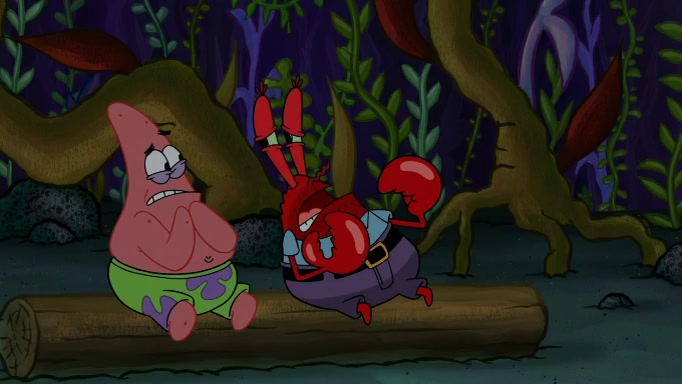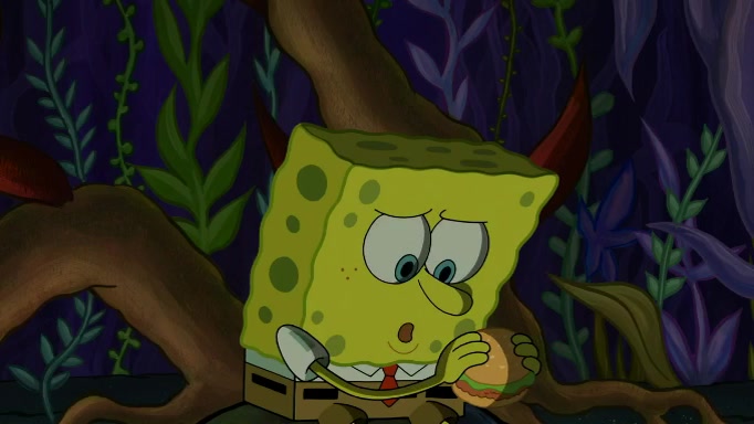 The French Narrator begins to speak as SpongeBob and Patrick begin to pull the trailer with Mr. Krabs and Squidward on it. They go through the desert and up a snowy mountain until they make it to a forest. SpongeBob and Patrick are worn out from the trip. Squidward advises to Mr. Krabs that they stop for the night since SpongeBob and Patrick are in no condition to continue. Later, the four of them are around a fire frightened by the creatures in the forest. SpongeBob tells everyone that they must guard the last Krabby Patty, but a small snail comes out of the woods. Unfortunately, it transforms into a large, winged monster that grabs the Krabby Patty and flies off. Mr. Krabs then tosses Squidward at the Krabby Patty knocking it out of the monster's claws. The monster takes a bite out of Squidward but spits him out in disgust. SpongeBob grabs the Krabby Patty while Squidward lands on his face.