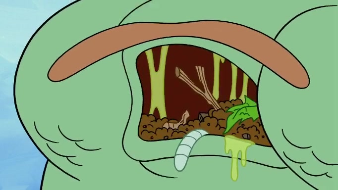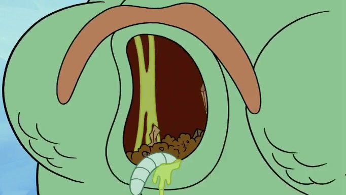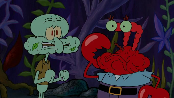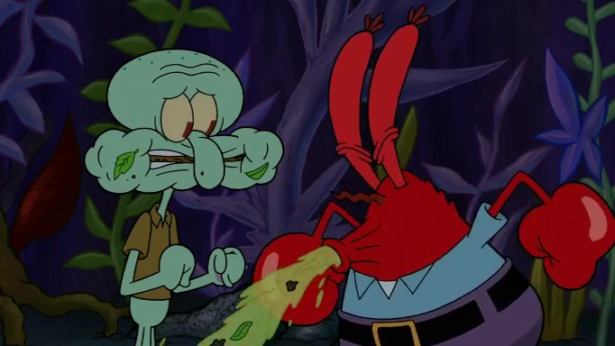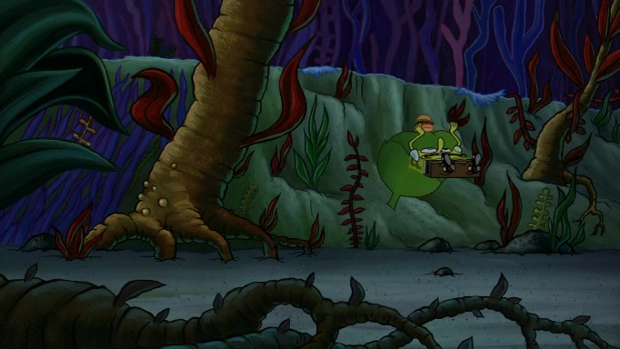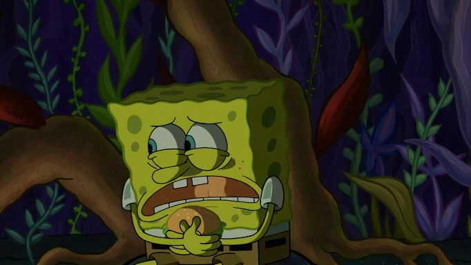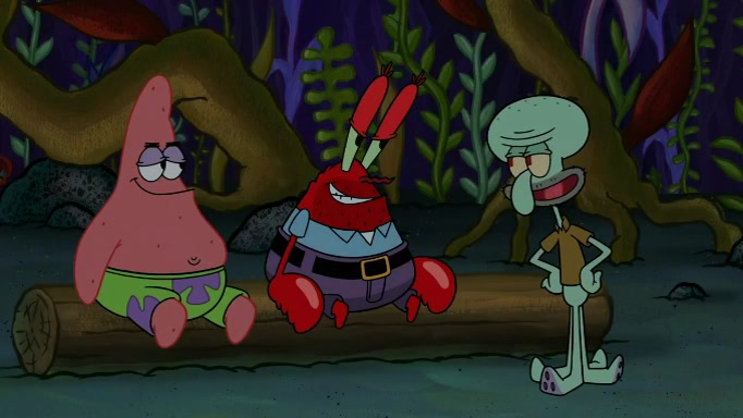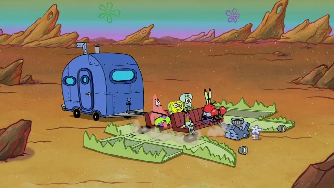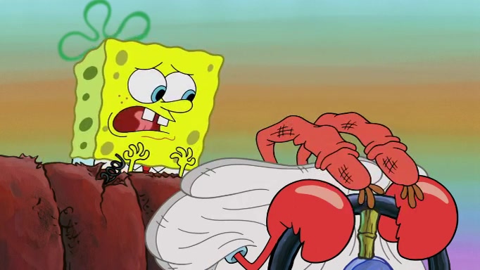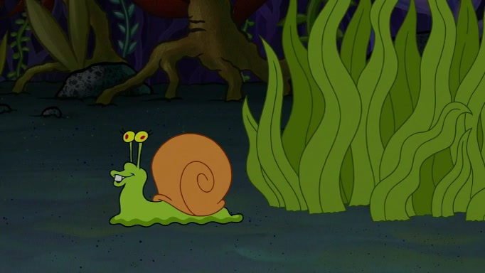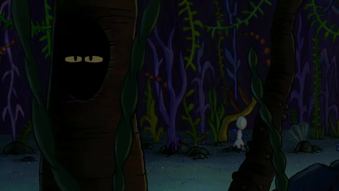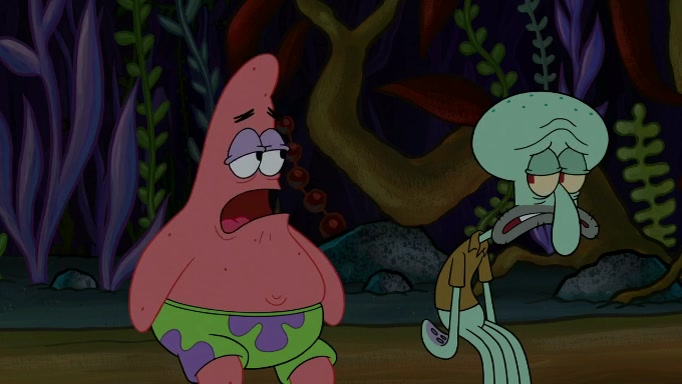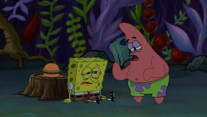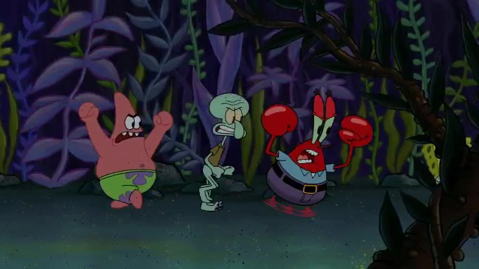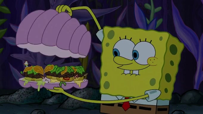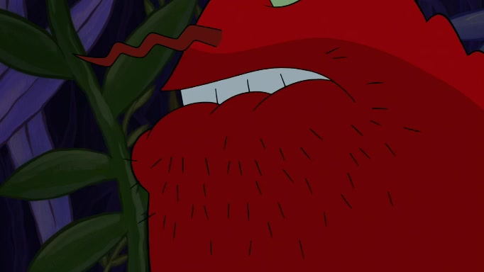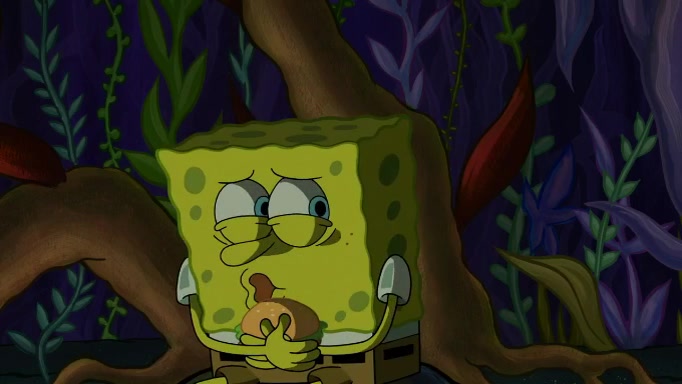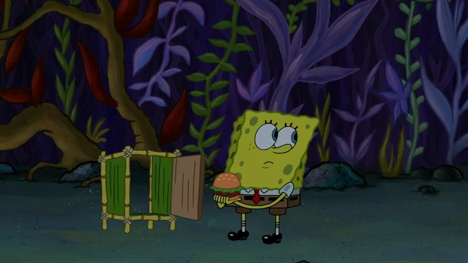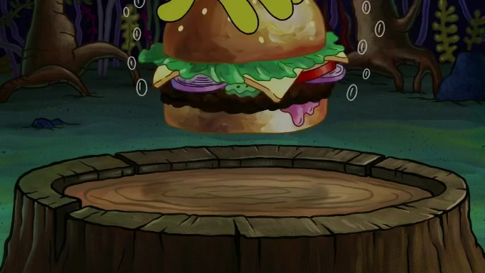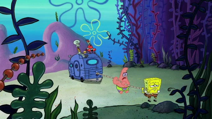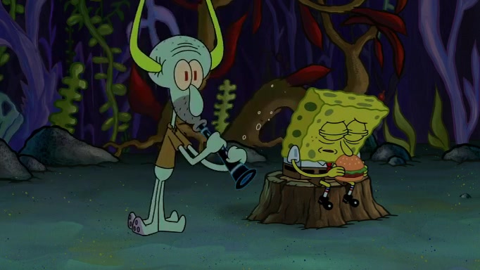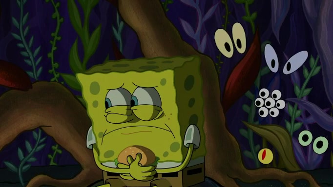 The French Narrator begins to speak as SpongeBob and Patrick begin to pull the trailer with Mr. Krabs and Squidward on it. They go through the desert and up a snowy mountain until they make it to a forest. SpongeBob and Patrick are worn out from the trip. Squidward advises to Mr. Krabs that they stop for the night since SpongeBob and Patrick are in no condition to continue. Later, the four of them are around a fire frightened by the creatures in the forest. SpongeBob tells everyone that they must guard the last Krabby Patty, but a small snail comes out of the woods. Unfortunately, it transforms into a large, winged monster that grabs the Krabby Patty and flies off. Mr. Krabs then tosses Squidward at the Krabby Patty knocking it out of the monster's claws. The monster takes a bite out of Squidward but spits him out in disgust. SpongeBob grabs the Krabby Patty while Squidward lands on his face.