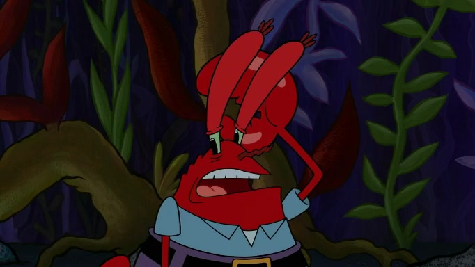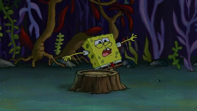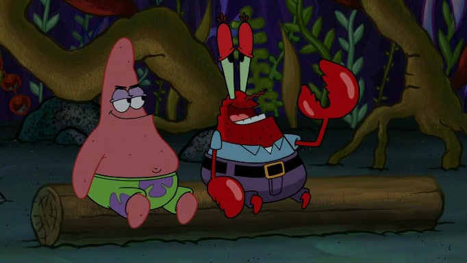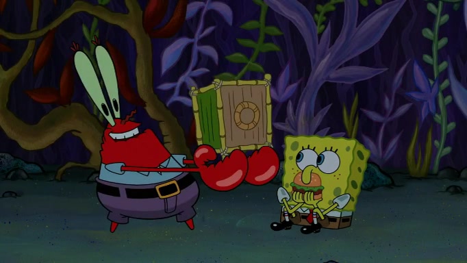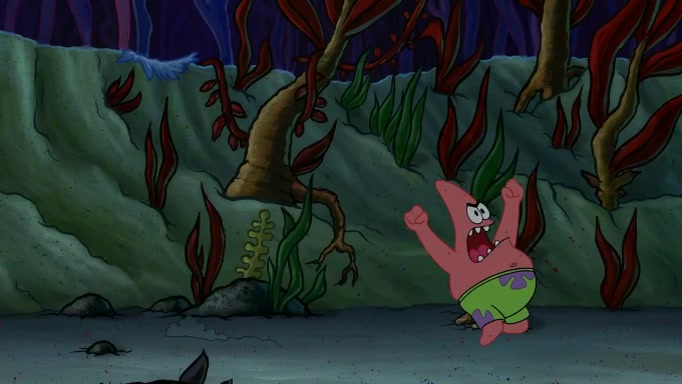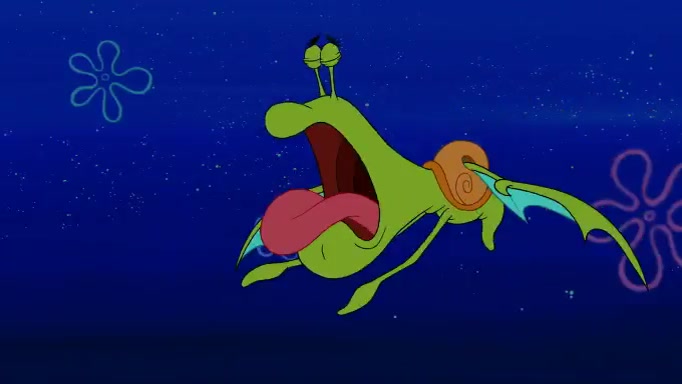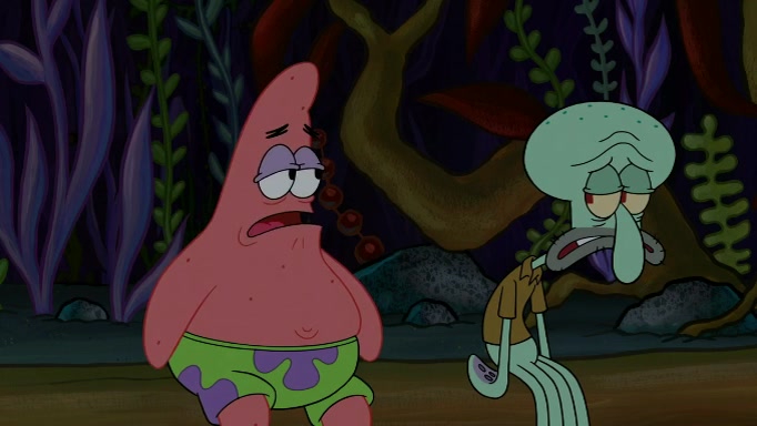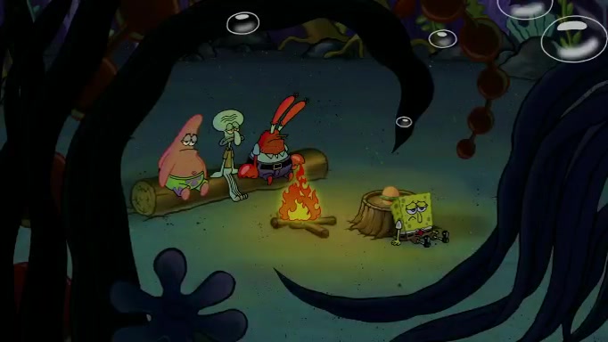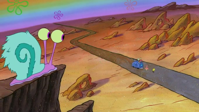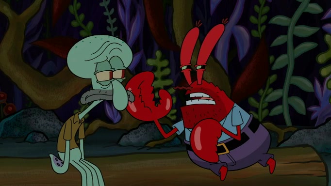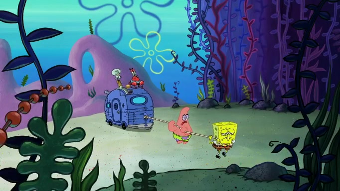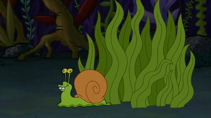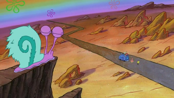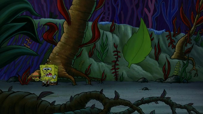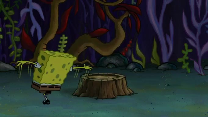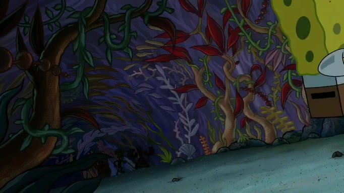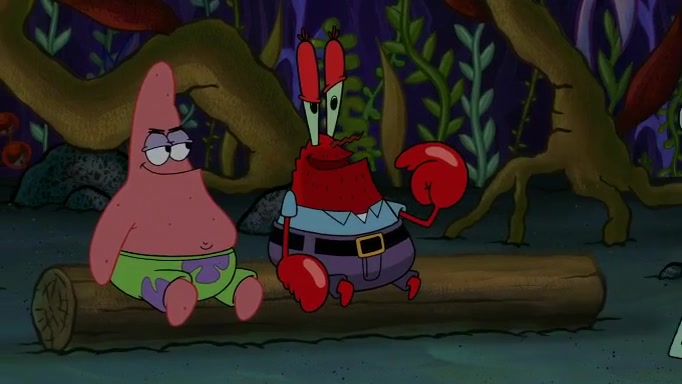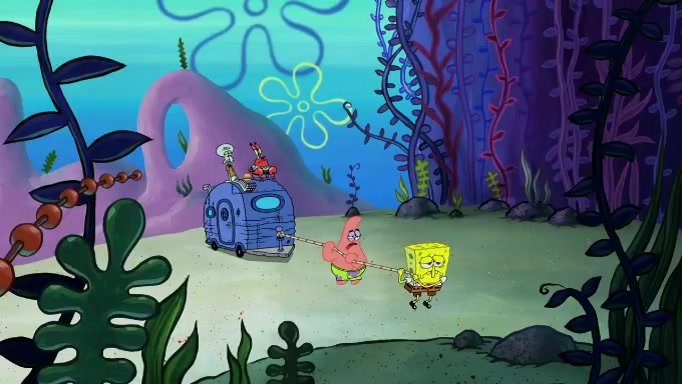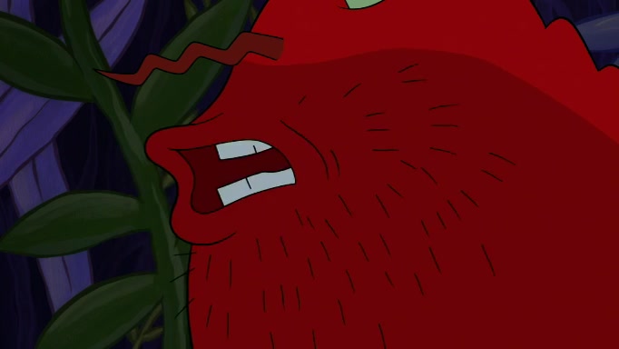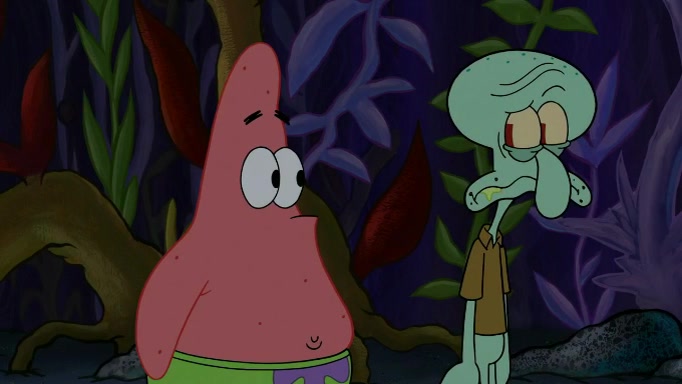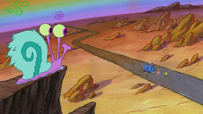 The French Narrator begins to speak as SpongeBob and Patrick begin to pull the trailer with Mr. Krabs and Squidward on it. They go through the desert and up a snowy mountain until they make it to a forest. SpongeBob and Patrick are worn out from the trip. Squidward advises to Mr. Krabs that they stop for the night since SpongeBob and Patrick are in no condition to continue. Later, the four of them are around a fire frightened by the creatures in the forest. SpongeBob tells everyone that they must guard the last Krabby Patty, but a small snail comes out of the woods. Unfortunately, it transforms into a large, winged monster that grabs the Krabby Patty and flies off. Mr. Krabs then tosses Squidward at the Krabby Patty knocking it out of the monster's claws. The monster takes a bite out of Squidward but spits him out in disgust. SpongeBob grabs the Krabby Patty while Squidward lands on his face.