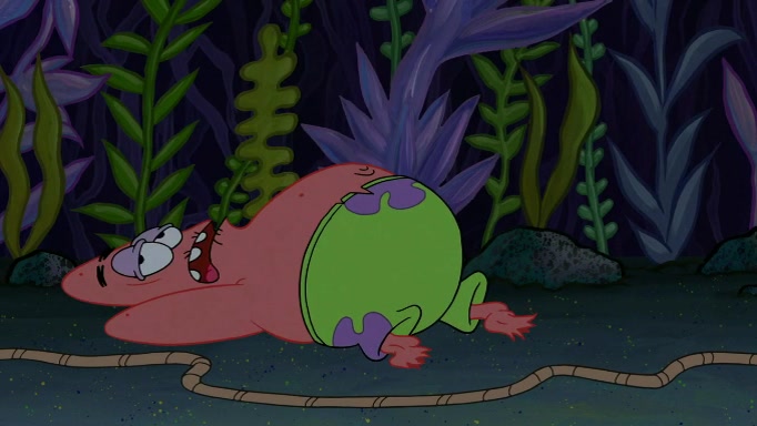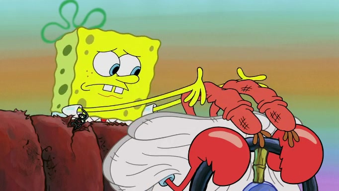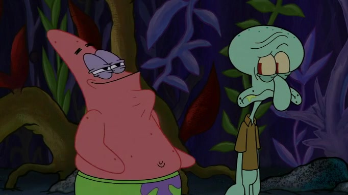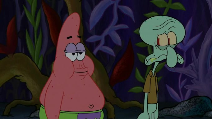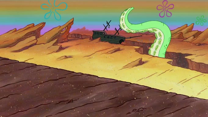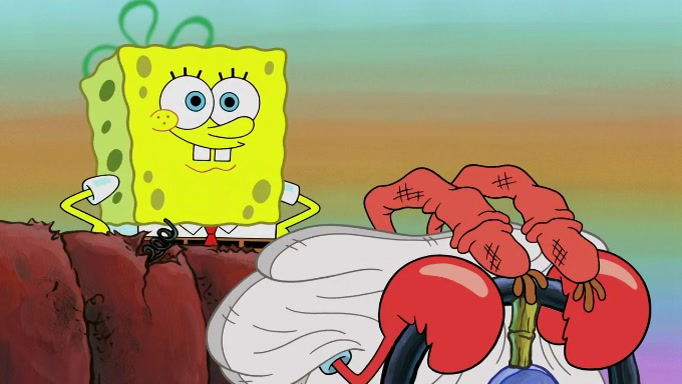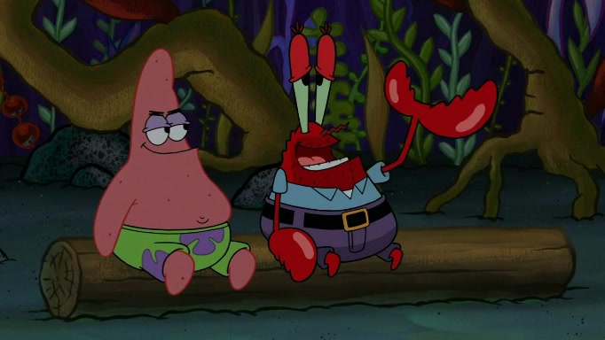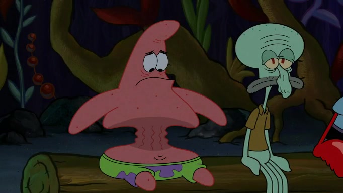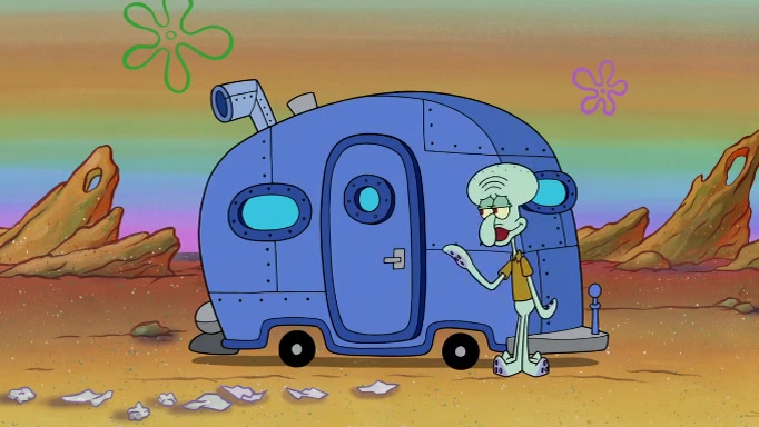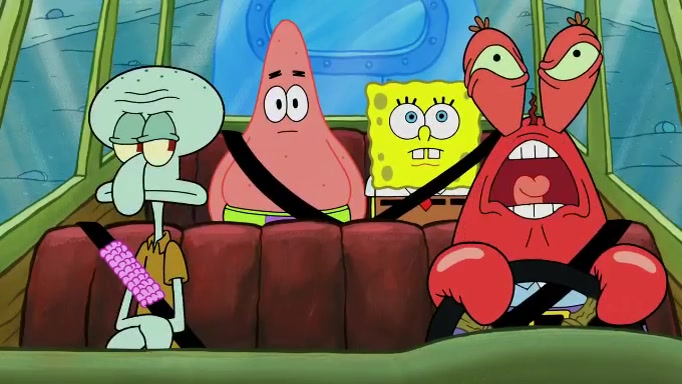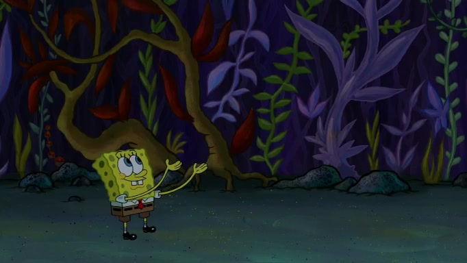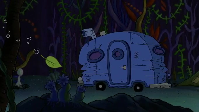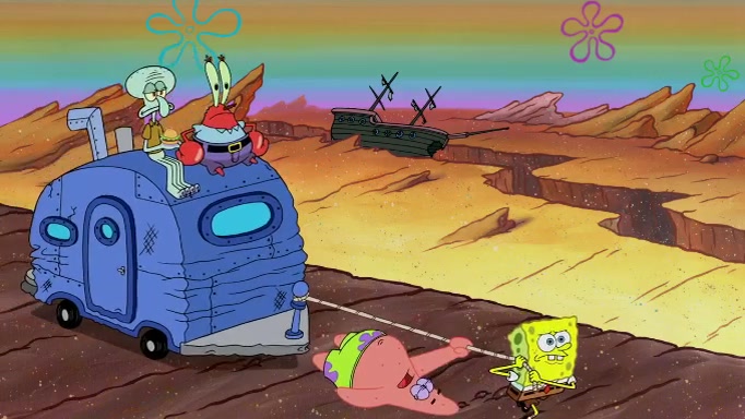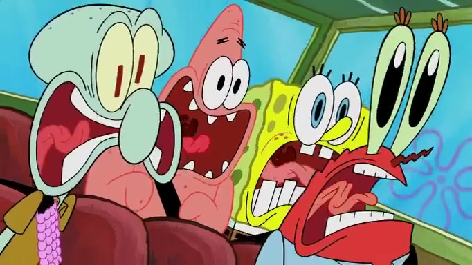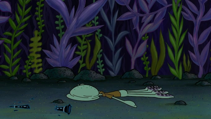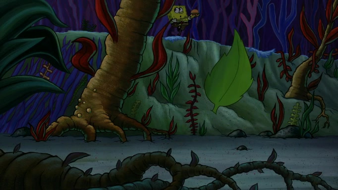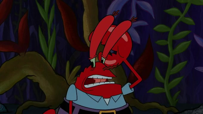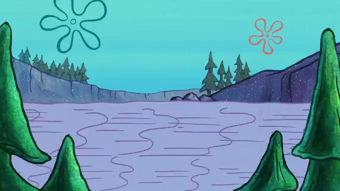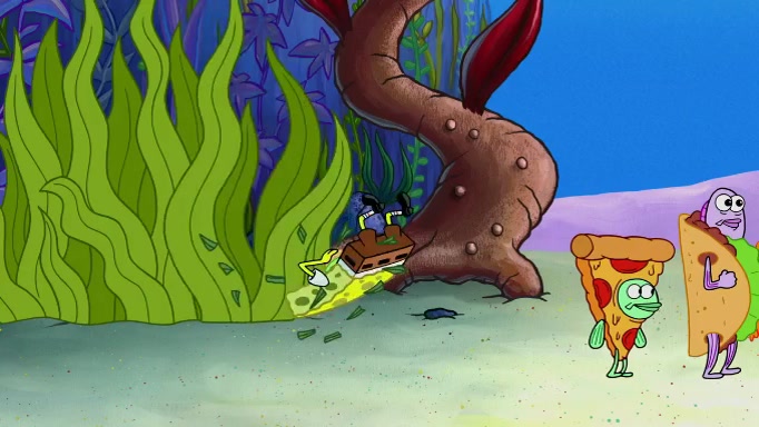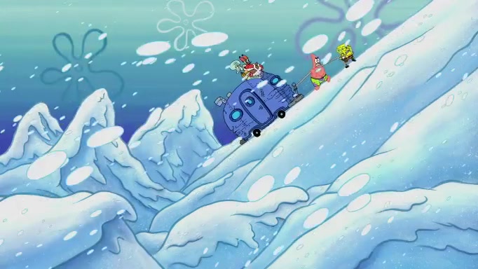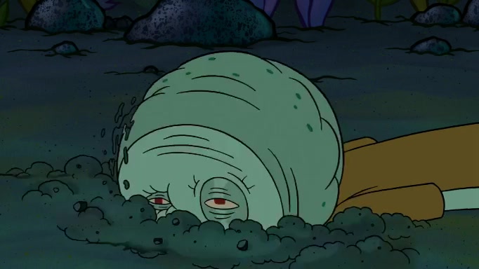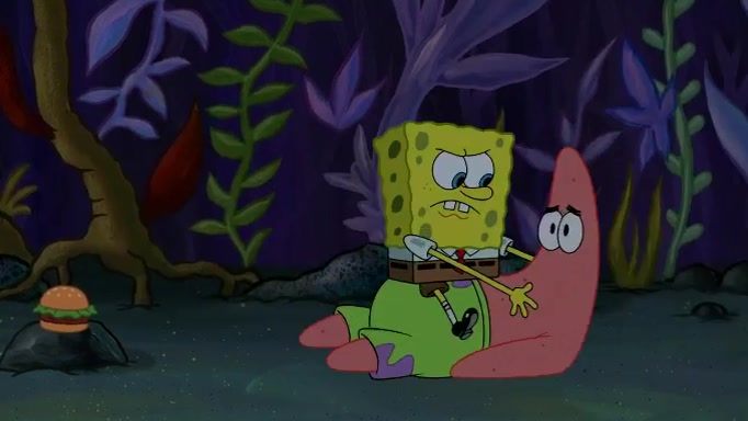 The French Narrator begins to speak as SpongeBob and Patrick begin to pull the trailer with Mr. Krabs and Squidward on it. They go through the desert and up a snowy mountain until they make it to a forest. SpongeBob and Patrick are worn out from the trip. Squidward advises to Mr. Krabs that they stop for the night since SpongeBob and Patrick are in no condition to continue. Later, the four of them are around a fire frightened by the creatures in the forest. SpongeBob tells everyone that they must guard the last Krabby Patty, but a small snail comes out of the woods. Unfortunately, it transforms into a large, winged monster that grabs the Krabby Patty and flies off. Mr. Krabs then tosses Squidward at the Krabby Patty knocking it out of the monster's claws. The monster takes a bite out of Squidward but spits him out in disgust. SpongeBob grabs the Krabby Patty while Squidward lands on his face.