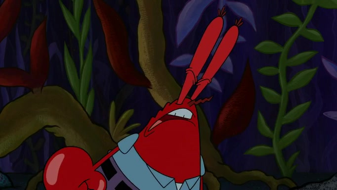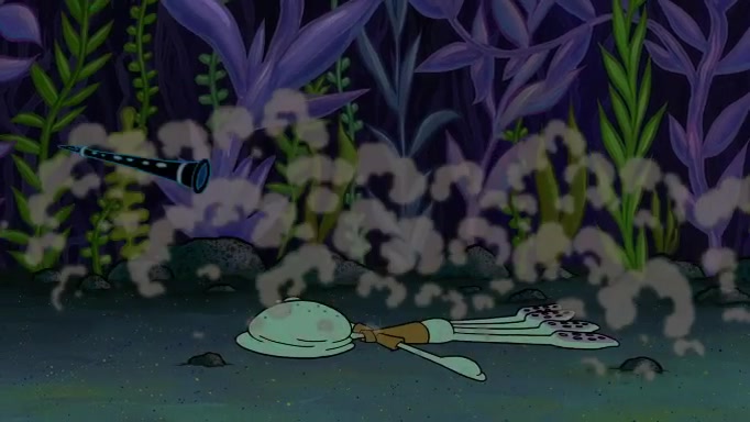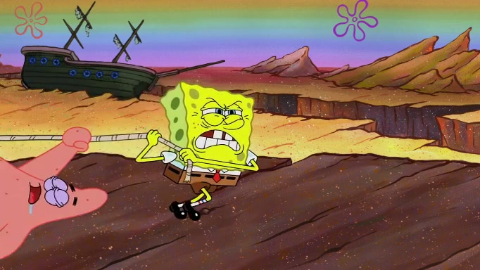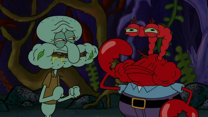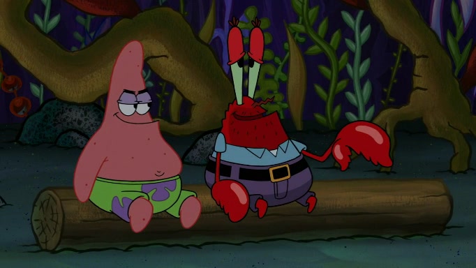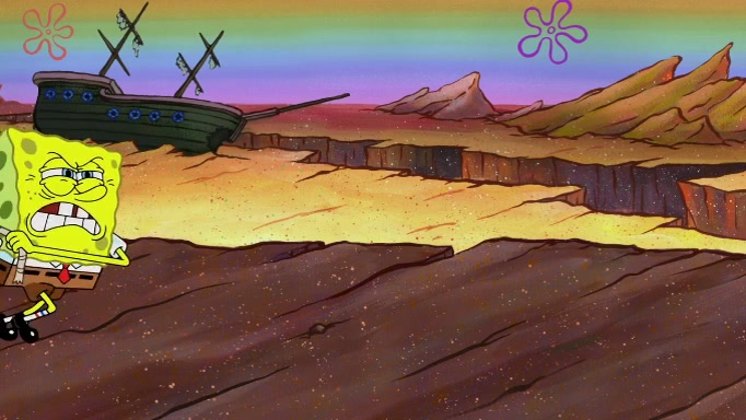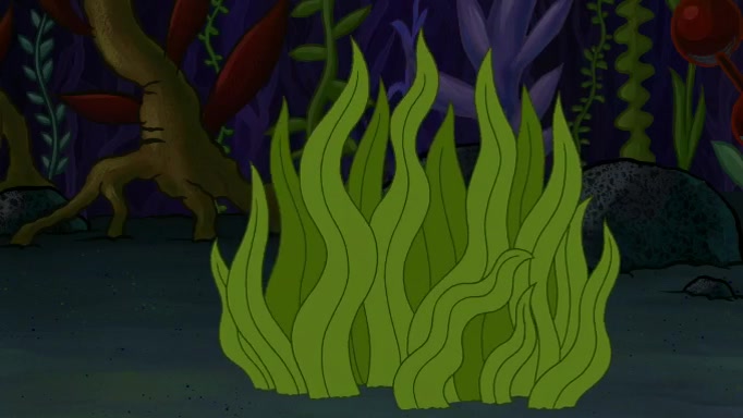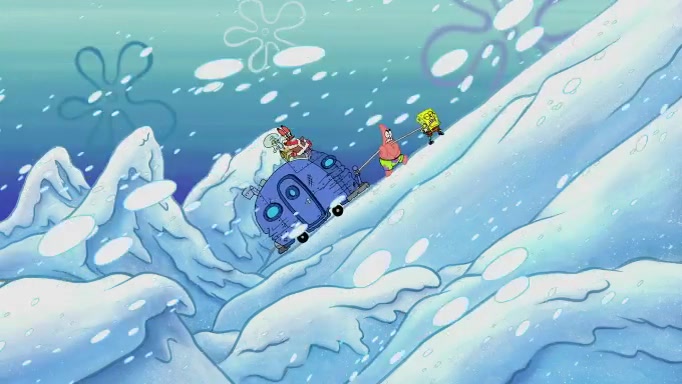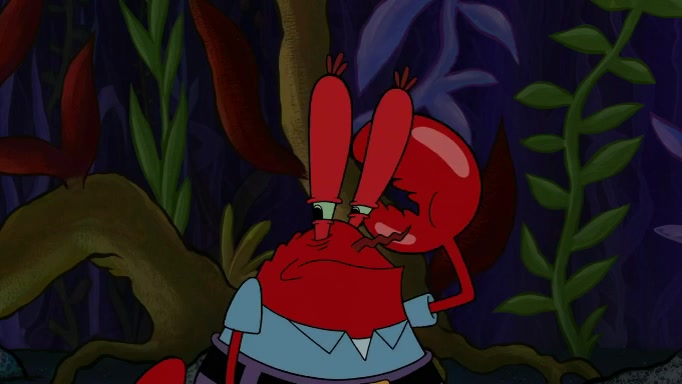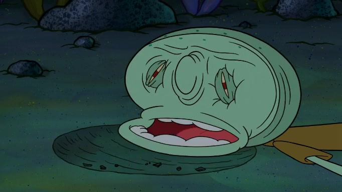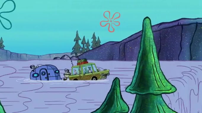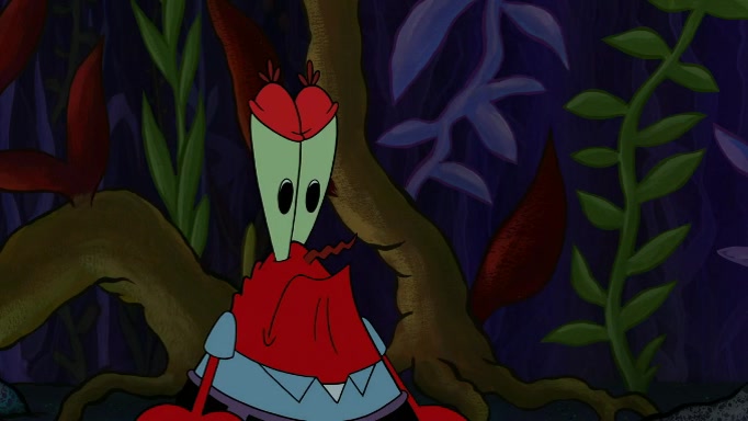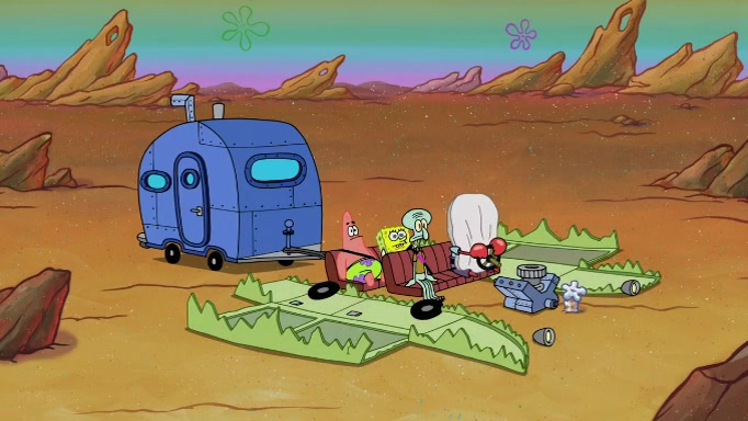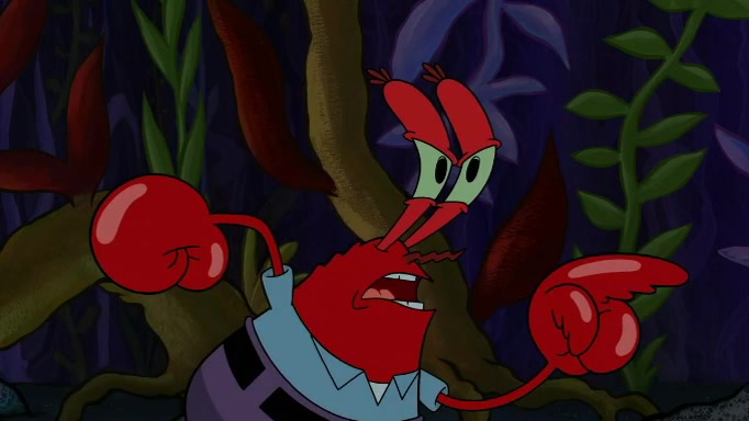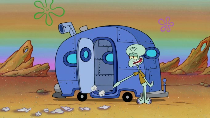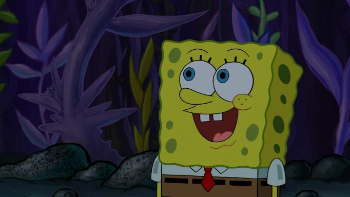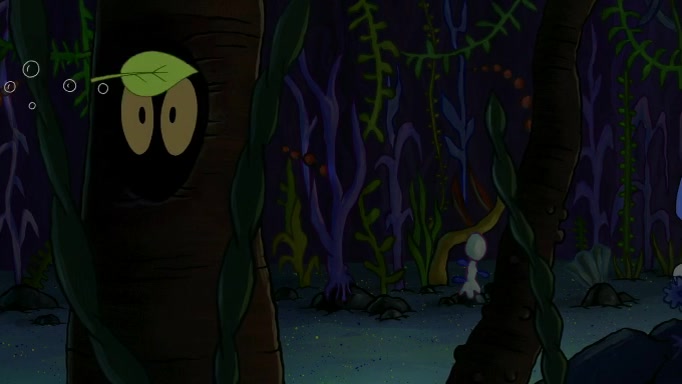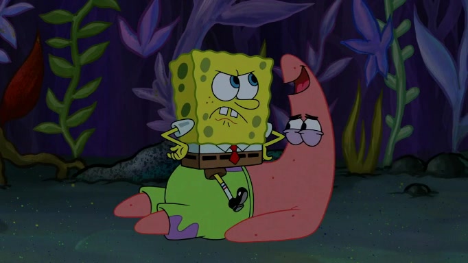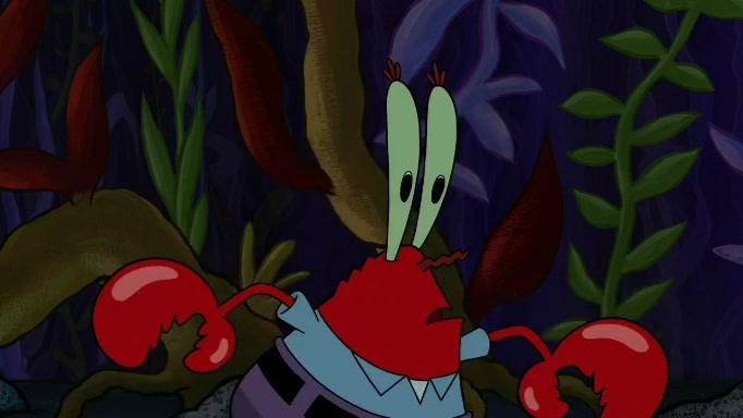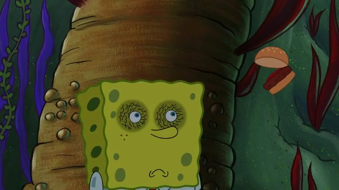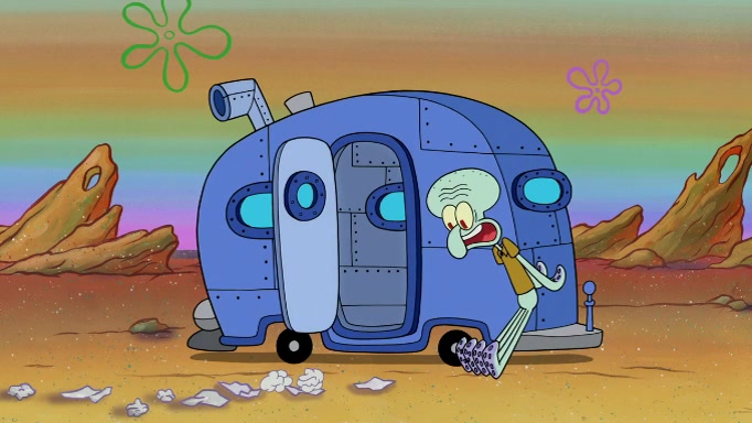 The French Narrator begins to speak as SpongeBob and Patrick begin to pull the trailer with Mr. Krabs and Squidward on it. They go through the desert and up a snowy mountain until they make it to a forest. SpongeBob and Patrick are worn out from the trip. Squidward advises to Mr. Krabs that they stop for the night since SpongeBob and Patrick are in no condition to continue. Later, the four of them are around a fire frightened by the creatures in the forest. SpongeBob tells everyone that they must guard the last Krabby Patty, but a small snail comes out of the woods. Unfortunately, it transforms into a large, winged monster that grabs the Krabby Patty and flies off. Mr. Krabs then tosses Squidward at the Krabby Patty knocking it out of the monster's claws. The monster takes a bite out of Squidward but spits him out in disgust. SpongeBob grabs the Krabby Patty while Squidward lands on his face.