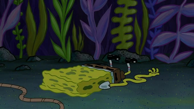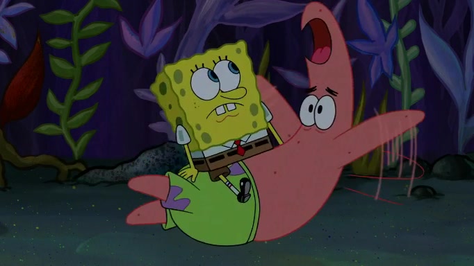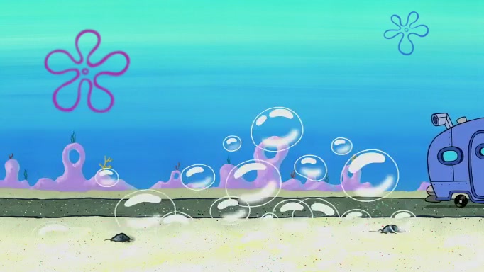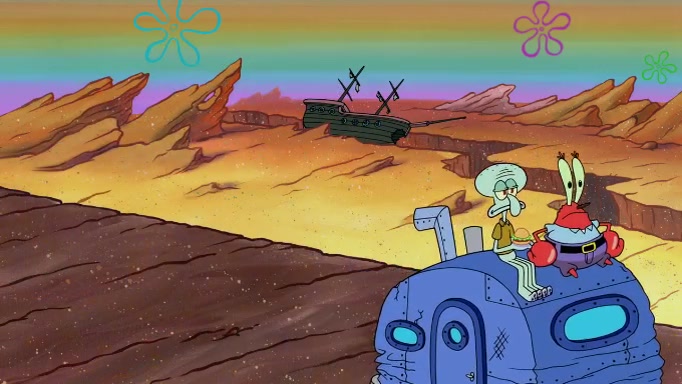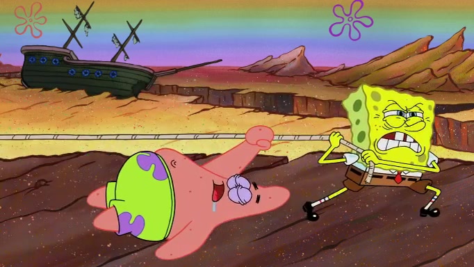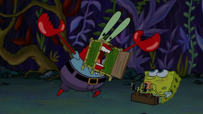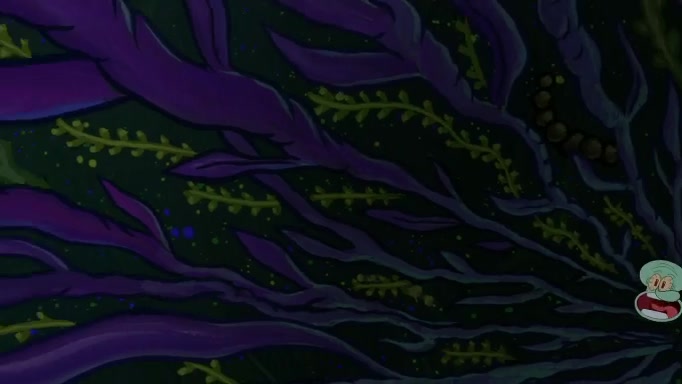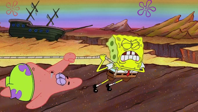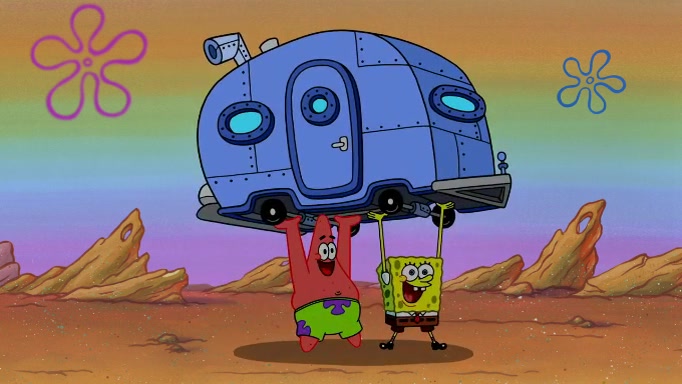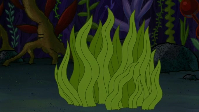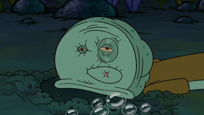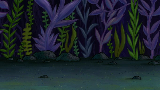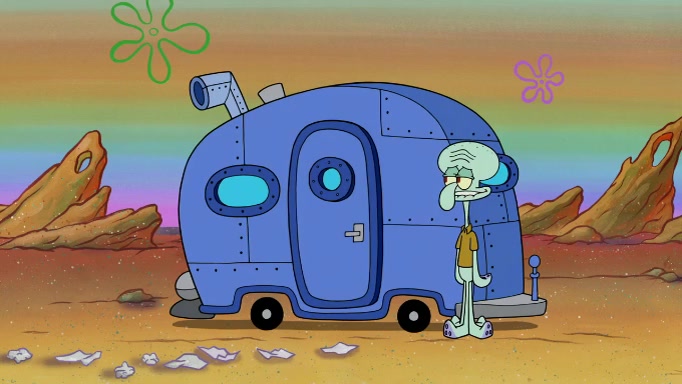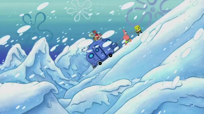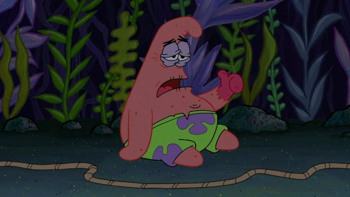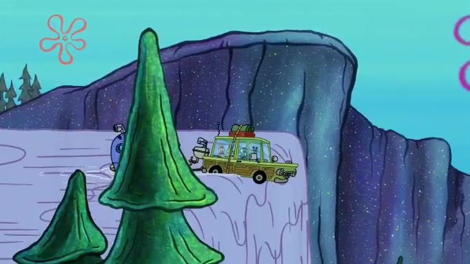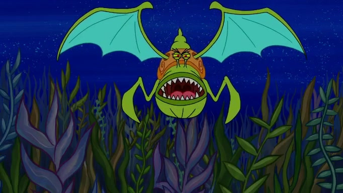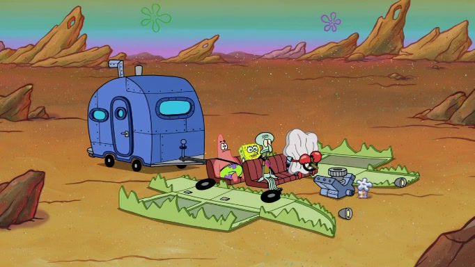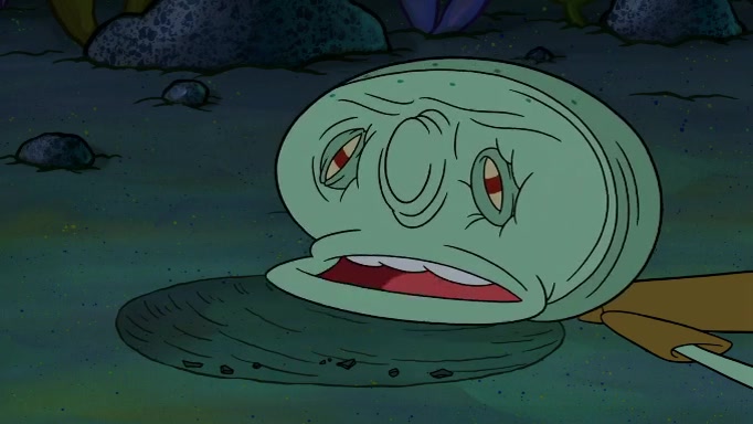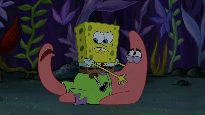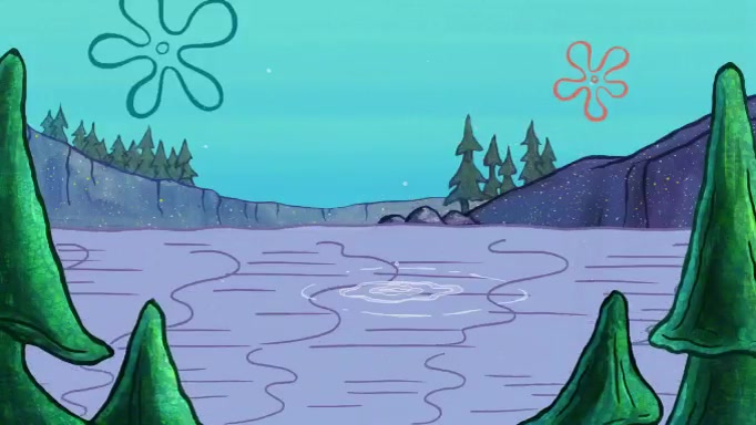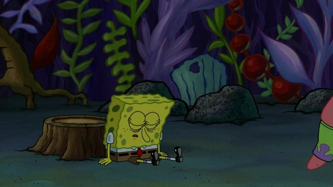 The French Narrator begins to speak as SpongeBob and Patrick begin to pull the trailer with Mr. Krabs and Squidward on it. They go through the desert and up a snowy mountain until they make it to a forest. SpongeBob and Patrick are worn out from the trip. Squidward advises to Mr. Krabs that they stop for the night since SpongeBob and Patrick are in no condition to continue. Later, the four of them are around a fire frightened by the creatures in the forest. SpongeBob tells everyone that they must guard the last Krabby Patty, but a small snail comes out of the woods. Unfortunately, it transforms into a large, winged monster that grabs the Krabby Patty and flies off. Mr. Krabs then tosses Squidward at the Krabby Patty knocking it out of the monster's claws. The monster takes a bite out of Squidward but spits him out in disgust. SpongeBob grabs the Krabby Patty while Squidward lands on his face.