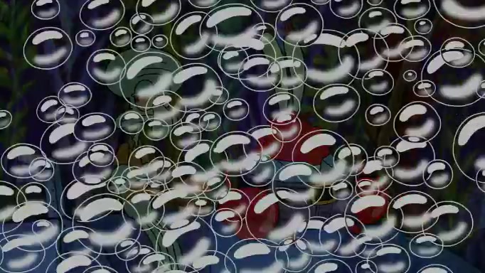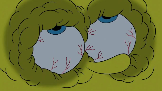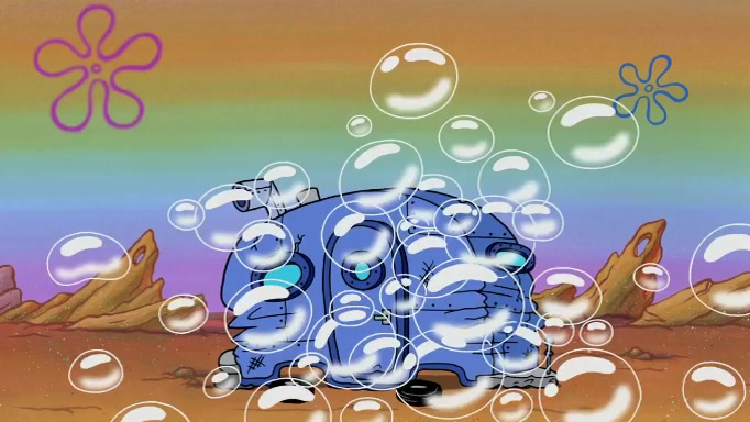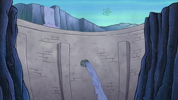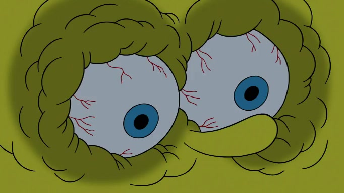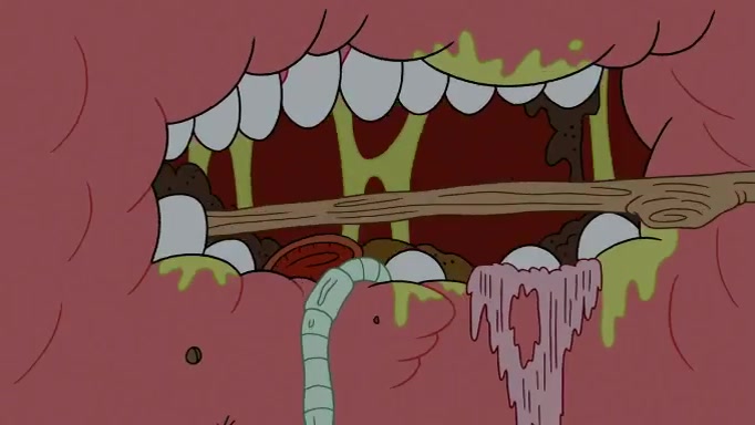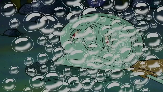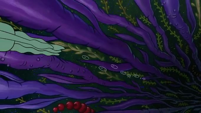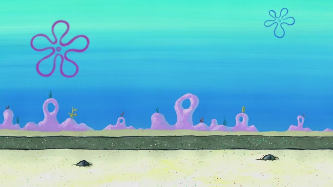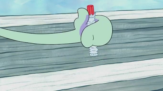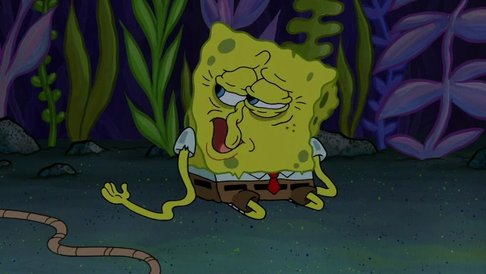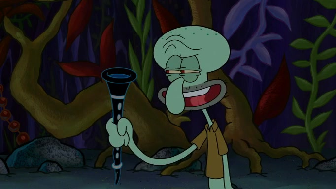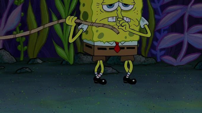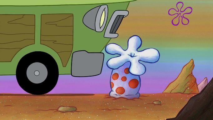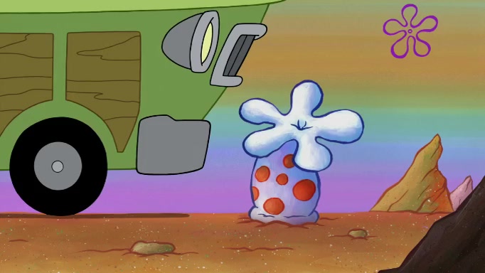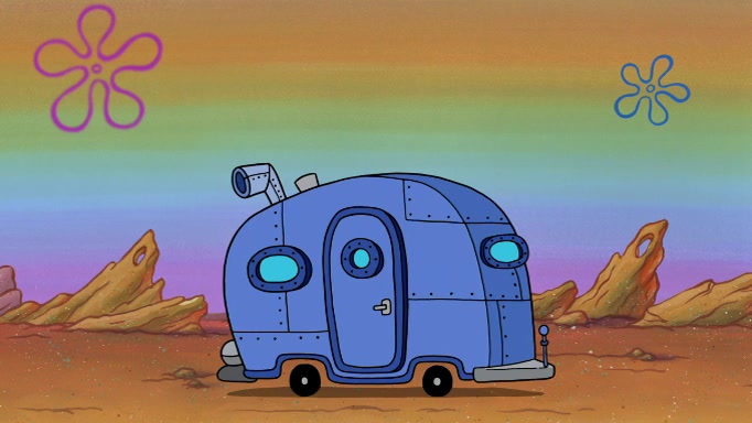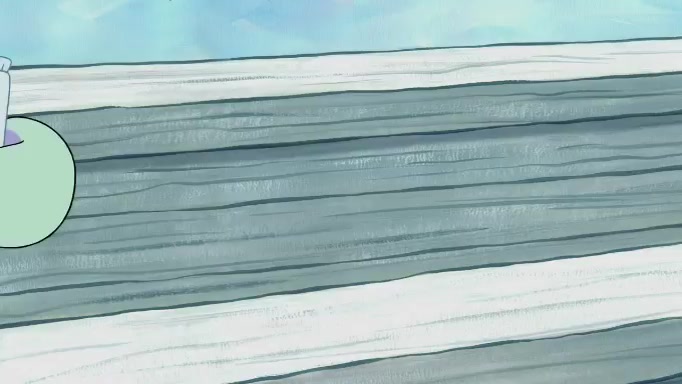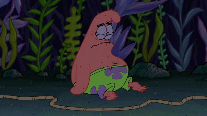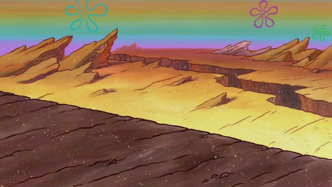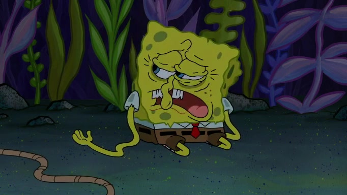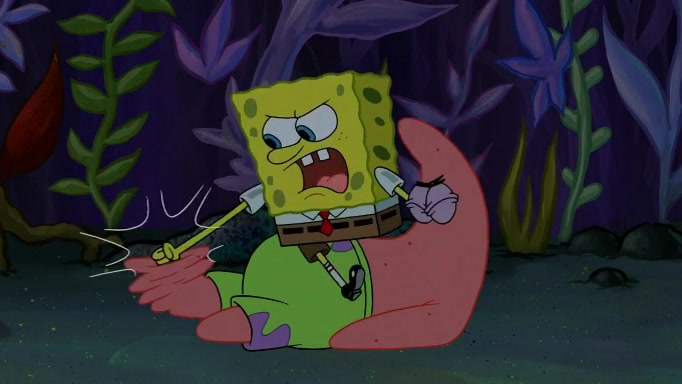 The French Narrator begins to speak as SpongeBob and Patrick begin to pull the trailer with Mr. Krabs and Squidward on it. They go through the desert and up a snowy mountain until they make it to a forest. SpongeBob and Patrick are worn out from the trip. Squidward advises to Mr. Krabs that they stop for the night since SpongeBob and Patrick are in no condition to continue. Later, the four of them are around a fire frightened by the creatures in the forest. SpongeBob tells everyone that they must guard the last Krabby Patty, but a small snail comes out of the woods. Unfortunately, it transforms into a large, winged monster that grabs the Krabby Patty and flies off. Mr. Krabs then tosses Squidward at the Krabby Patty knocking it out of the monster's claws. The monster takes a bite out of Squidward but spits him out in disgust. SpongeBob grabs the Krabby Patty while Squidward lands on his face.