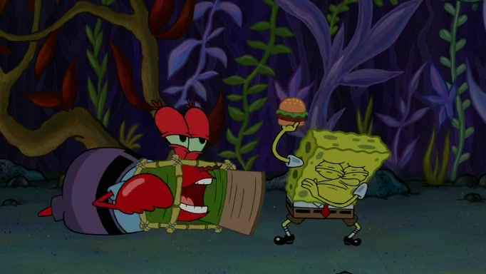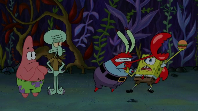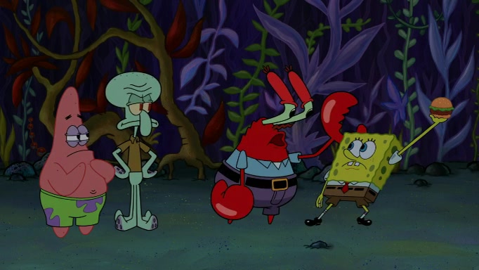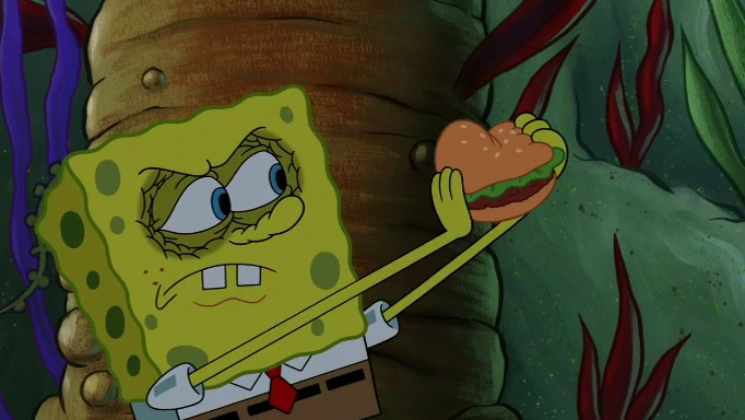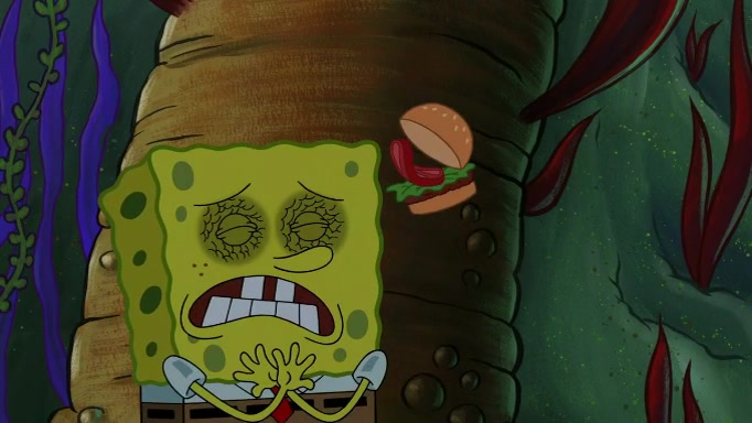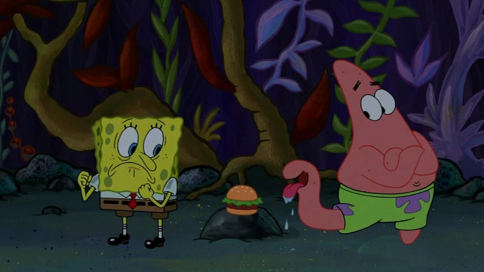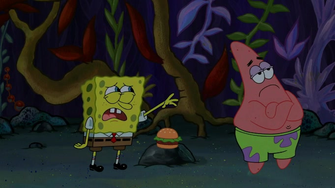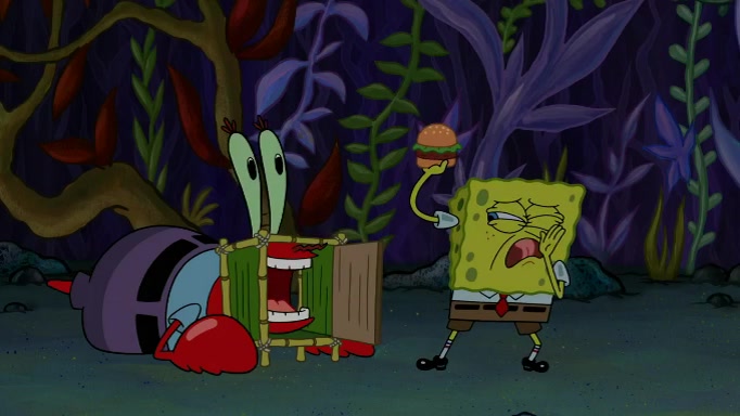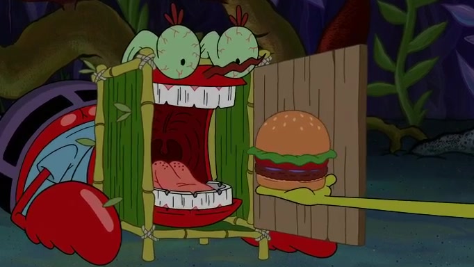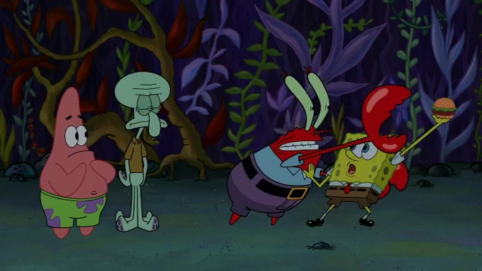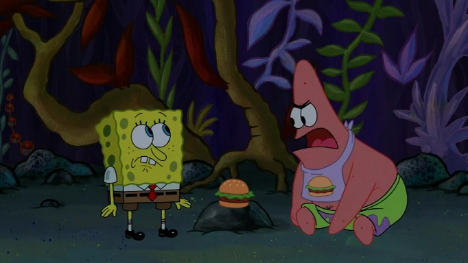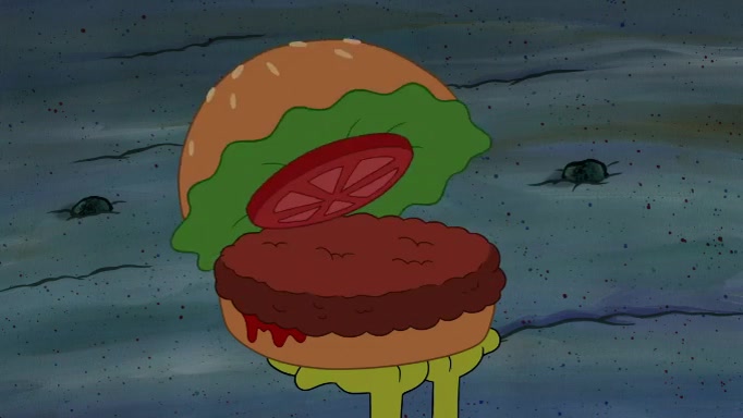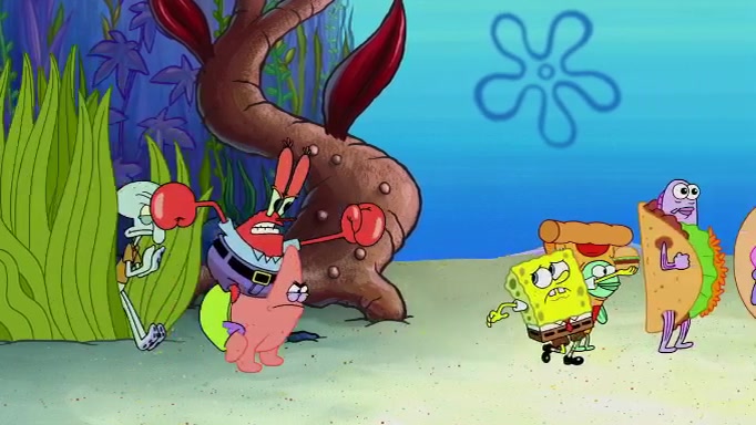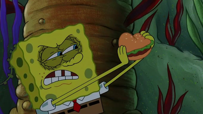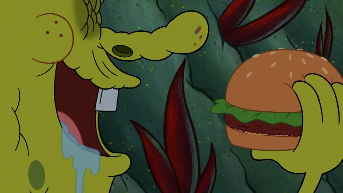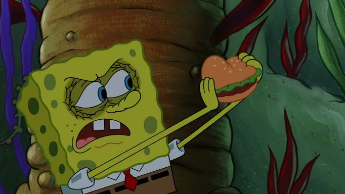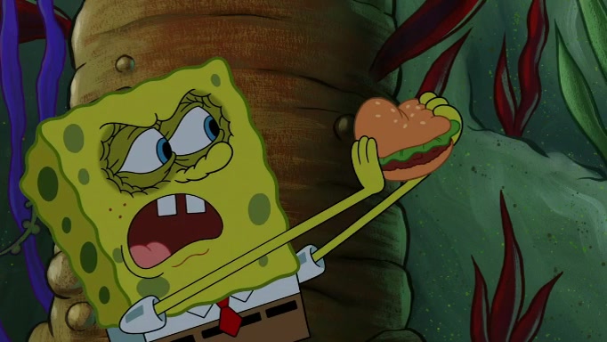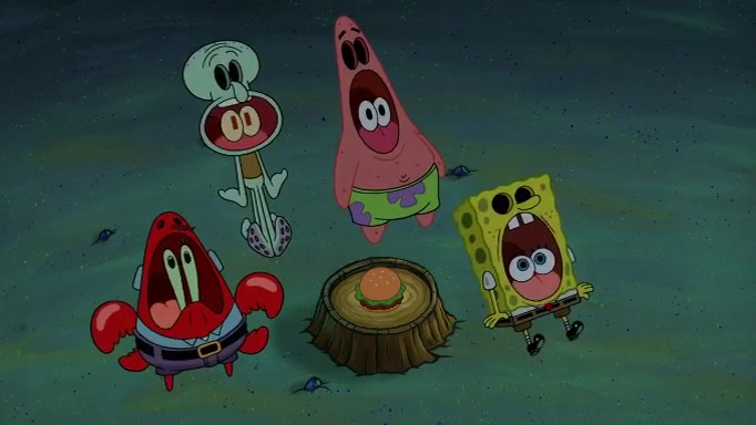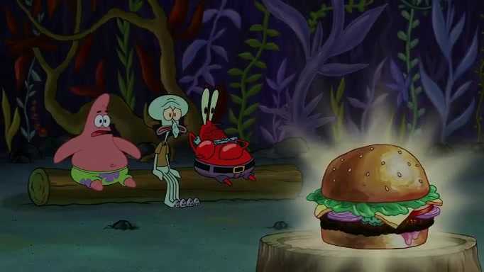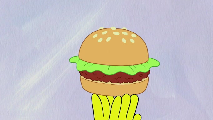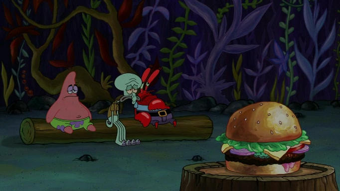 More time later, Patrick, Squidward, and Mr. Krabs are showing signs of hunger and think about eating the Krabby Patty. SpongeBob tries to get everyone not to eat the Krabby Patty but the others only care for eating it now. Patrick nearly eats the Krabby Patty by tricking SpongeBob but his plan fails. Squidward then tries to put SpongeBob to sleep with his clarinet, but the Snail Monster returns and grabs Squidward by his head. It then drops Squidward on his face and he comments "Everybody's a critic." Mr. Krabs' turn to trick SpongeBob as he created a safe to put the Krabby Patty in. However, the other side of the safe leads into Mr. Krabs' mouth and SpongeBob backs him away. SpongeBob then offers everyone a solution: Nature Patties. Only Patrick seems to enjoy these patties while Squidward and Mr. Krab show great disgust for them. Having enough, Mr. Krabs, Squidward, and Patrick all decide to chase SpongeBob down to get to the Krabby Patty.