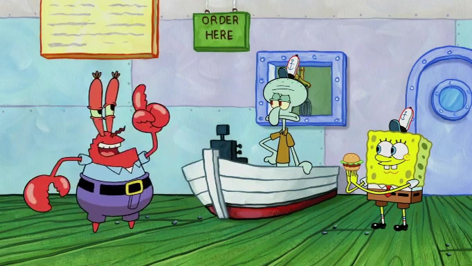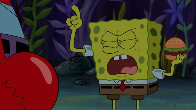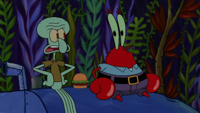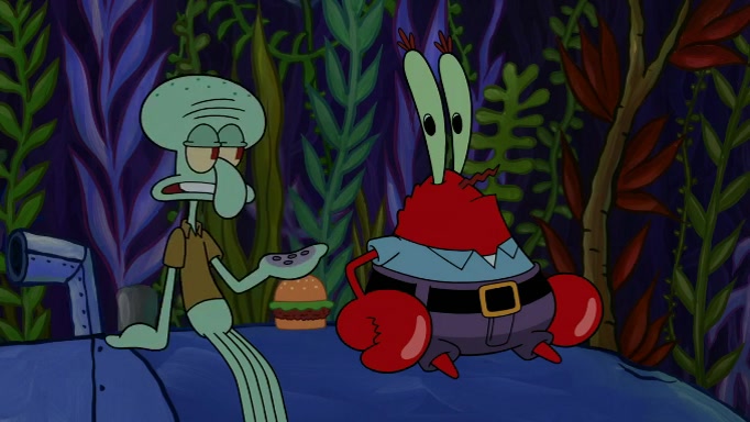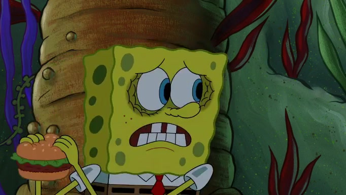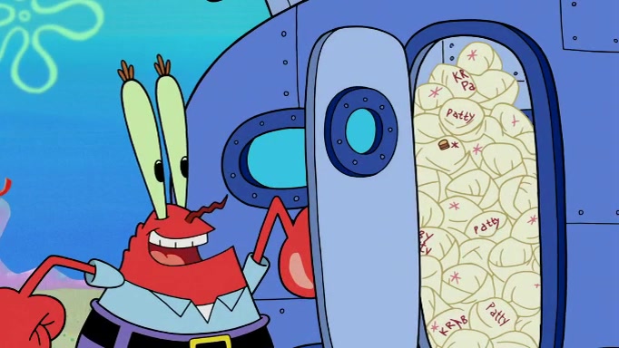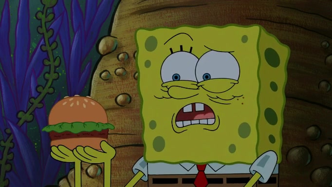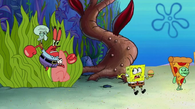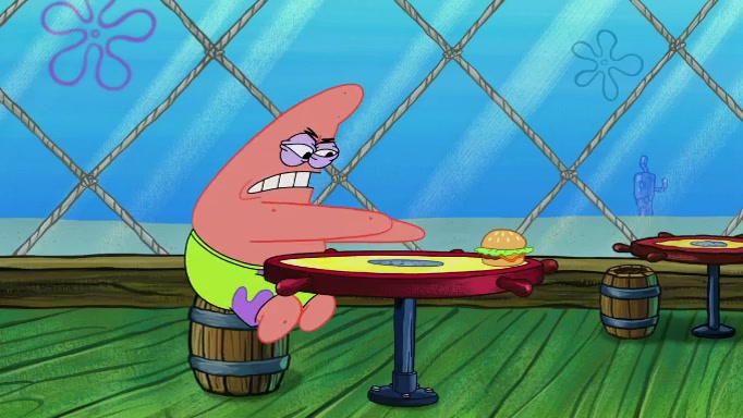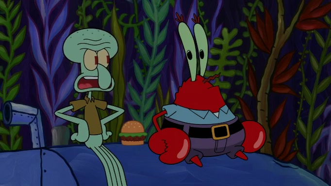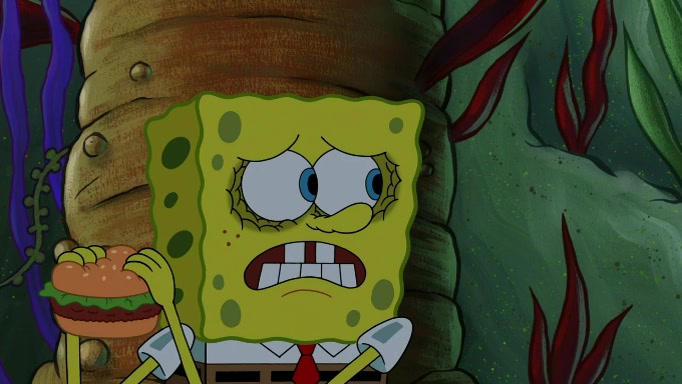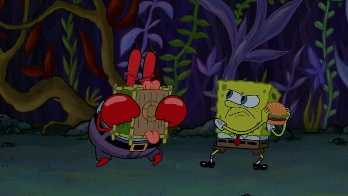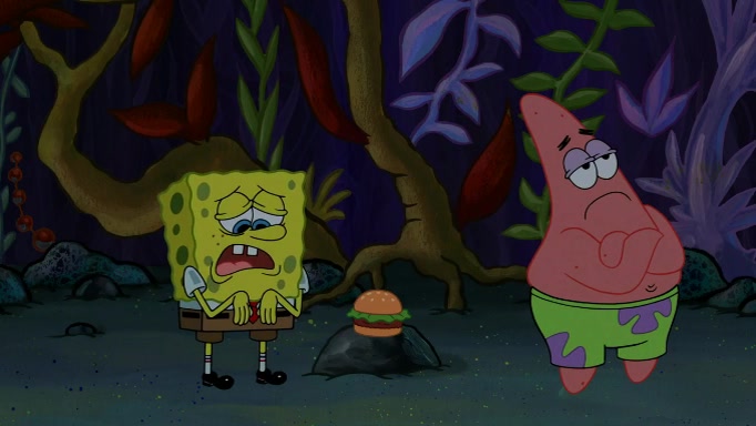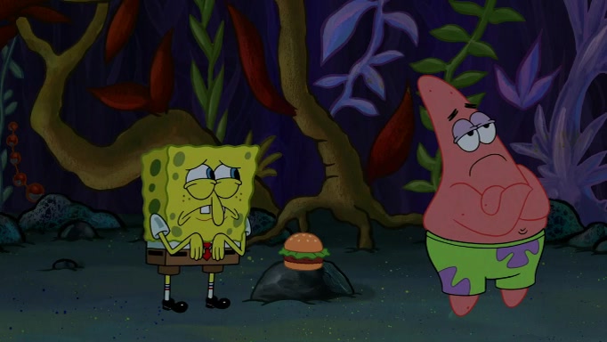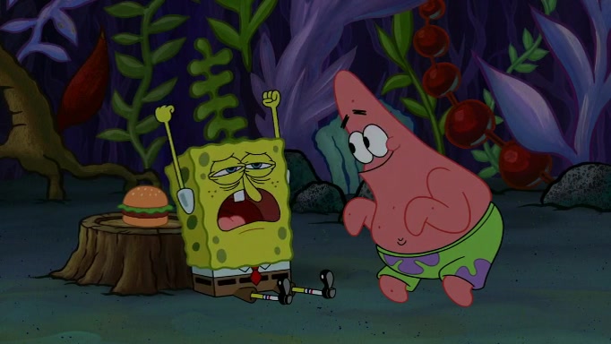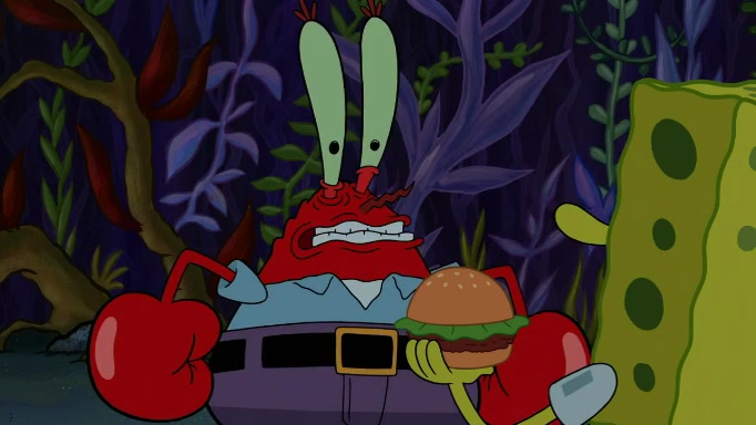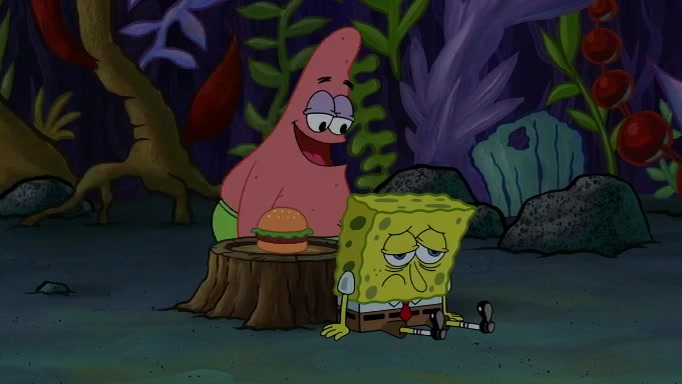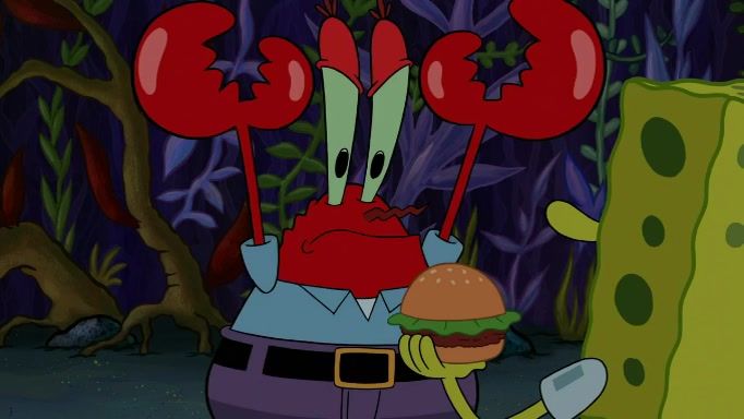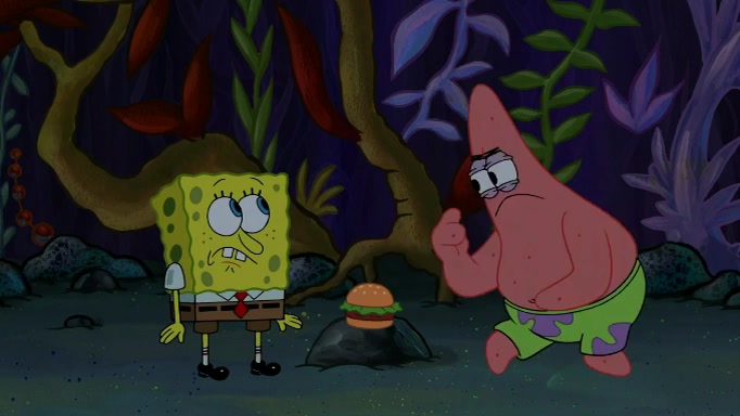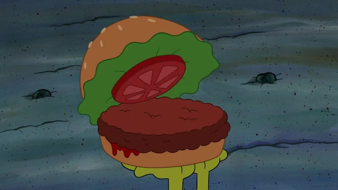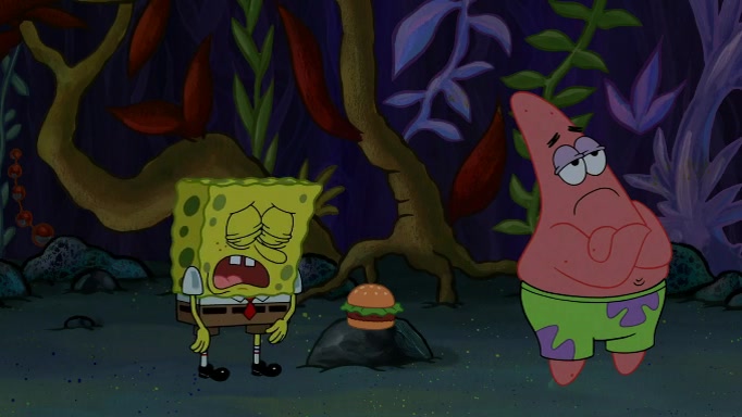 More time later, Patrick, Squidward, and Mr. Krabs are showing signs of hunger and think about eating the Krabby Patty. SpongeBob tries to get everyone not to eat the Krabby Patty but the others only care for eating it now. Patrick nearly eats the Krabby Patty by tricking SpongeBob but his plan fails. Squidward then tries to put SpongeBob to sleep with his clarinet, but the Snail Monster returns and grabs Squidward by his head. It then drops Squidward on his face and he comments "Everybody's a critic." Mr. Krabs' turn to trick SpongeBob as he created a safe to put the Krabby Patty in. However, the other side of the safe leads into Mr. Krabs' mouth and SpongeBob backs him away. SpongeBob then offers everyone a solution: Nature Patties. Only Patrick seems to enjoy these patties while Squidward and Mr. Krab show great disgust for them. Having enough, Mr. Krabs, Squidward, and Patrick all decide to chase SpongeBob down to get to the Krabby Patty.