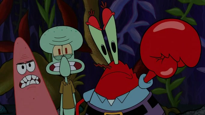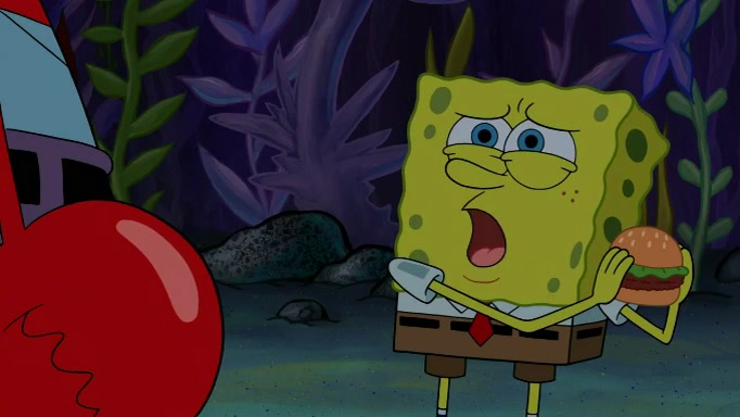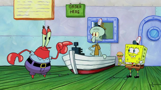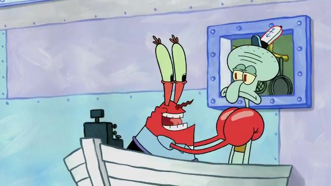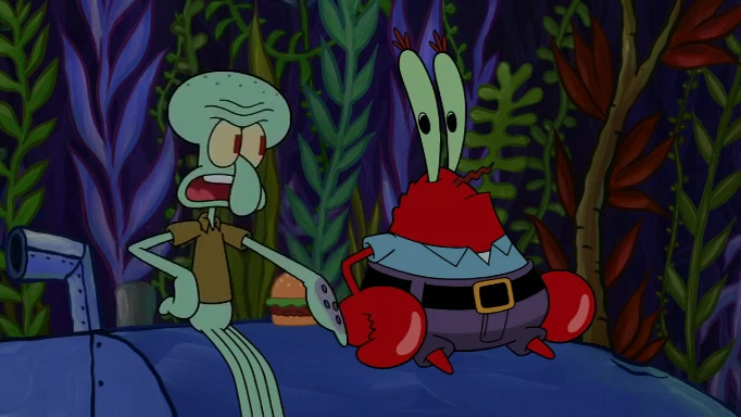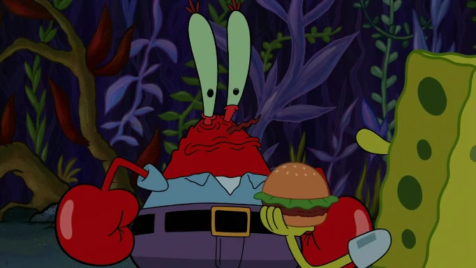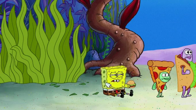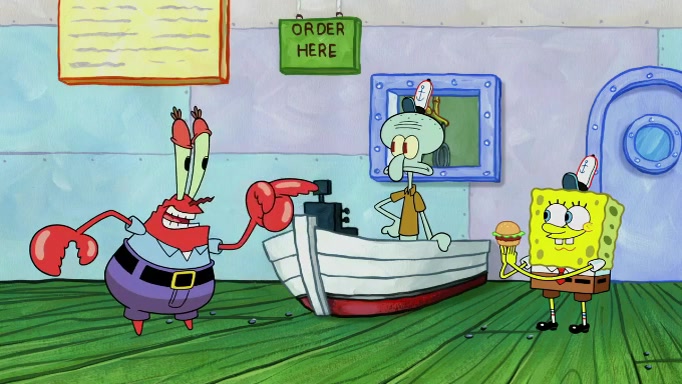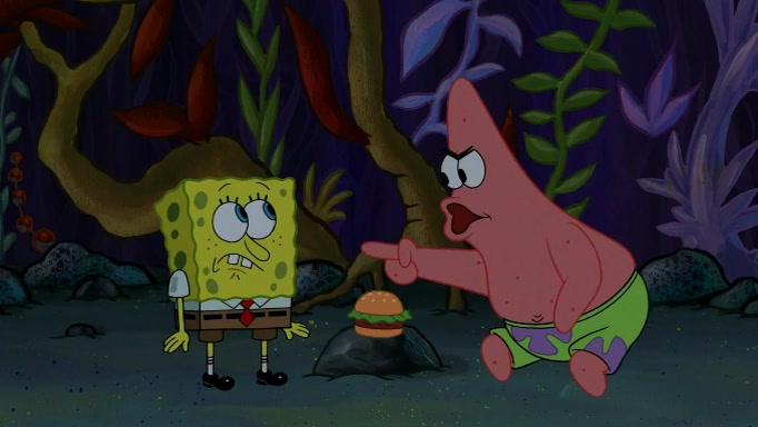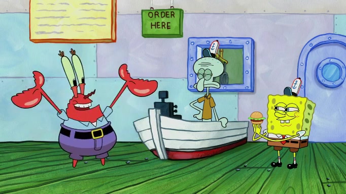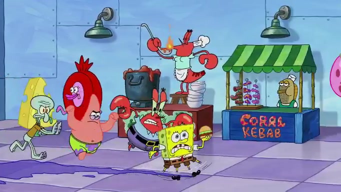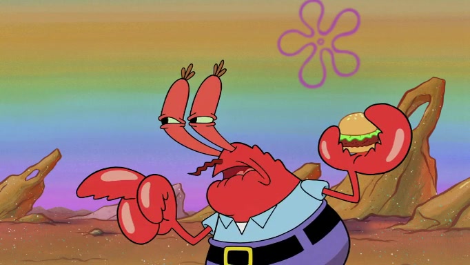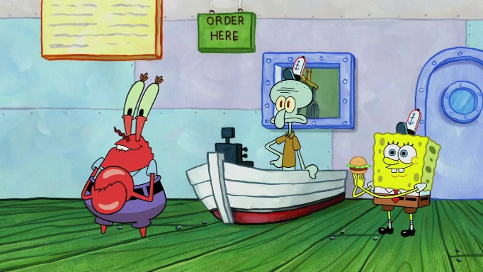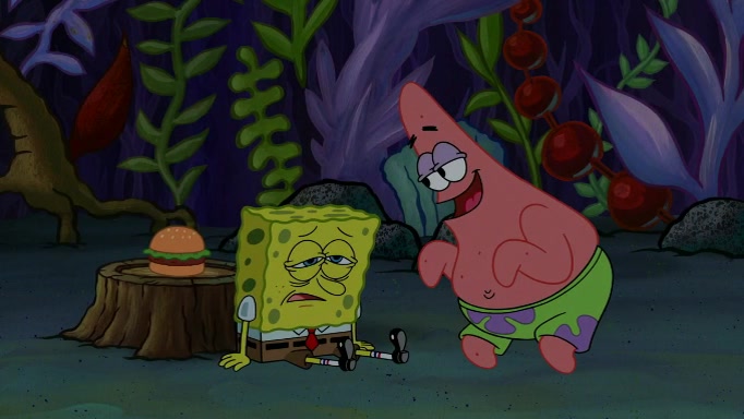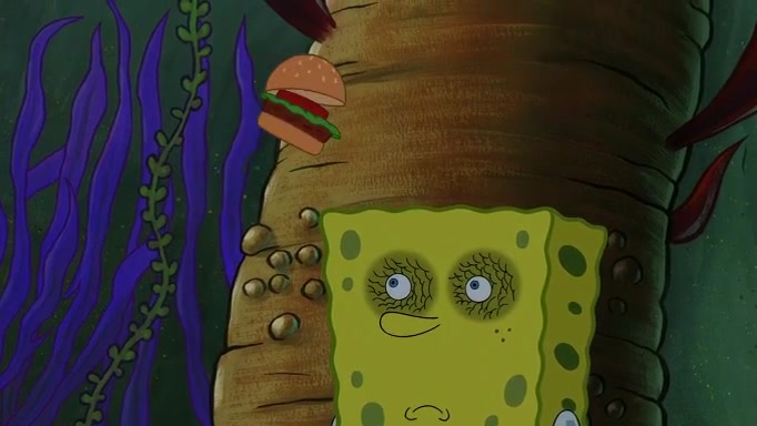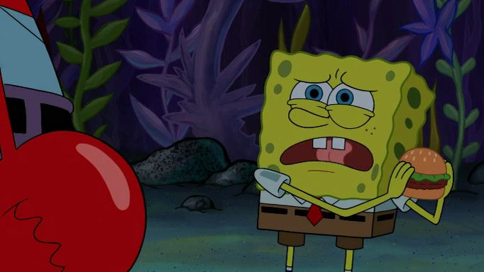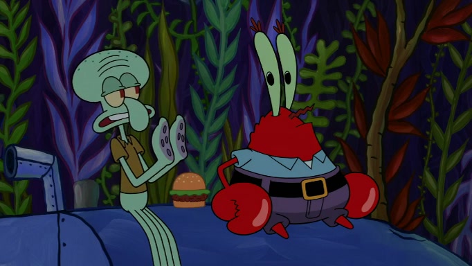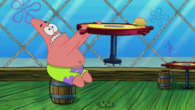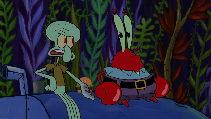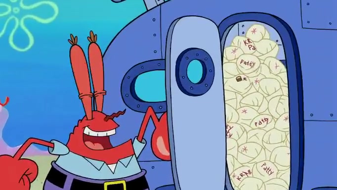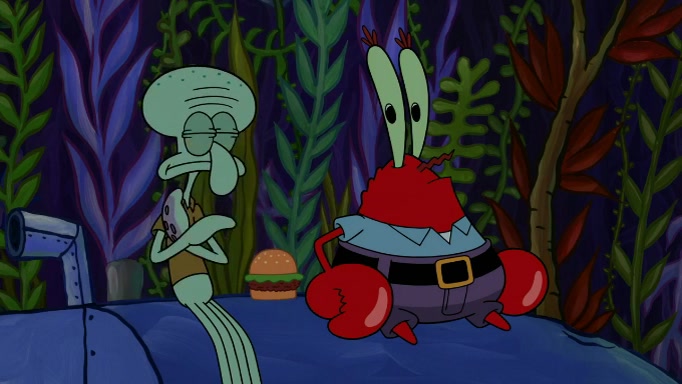 More time later, Patrick, Squidward, and Mr. Krabs are showing signs of hunger and think about eating the Krabby Patty. SpongeBob tries to get everyone not to eat the Krabby Patty but the others only care for eating it now. Patrick nearly eats the Krabby Patty by tricking SpongeBob but his plan fails. Squidward then tries to put SpongeBob to sleep with his clarinet, but the Snail Monster returns and grabs Squidward by his head. It then drops Squidward on his face and he comments "Everybody's a critic." Mr. Krabs' turn to trick SpongeBob as he created a safe to put the Krabby Patty in. However, the other side of the safe leads into Mr. Krabs' mouth and SpongeBob backs him away. SpongeBob then offers everyone a solution: Nature Patties. Only Patrick seems to enjoy these patties while Squidward and Mr. Krab show great disgust for them. Having enough, Mr. Krabs, Squidward, and Patrick all decide to chase SpongeBob down to get to the Krabby Patty.