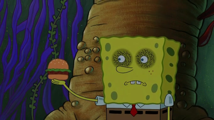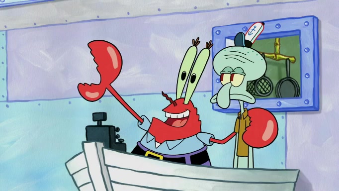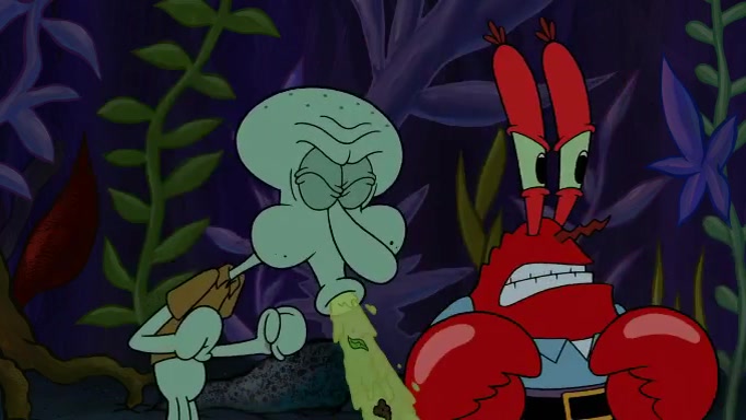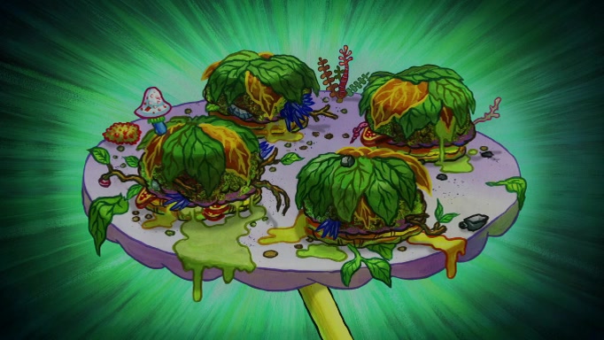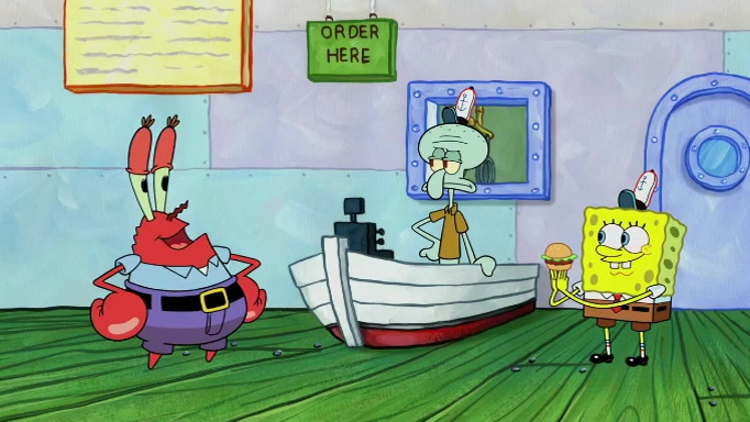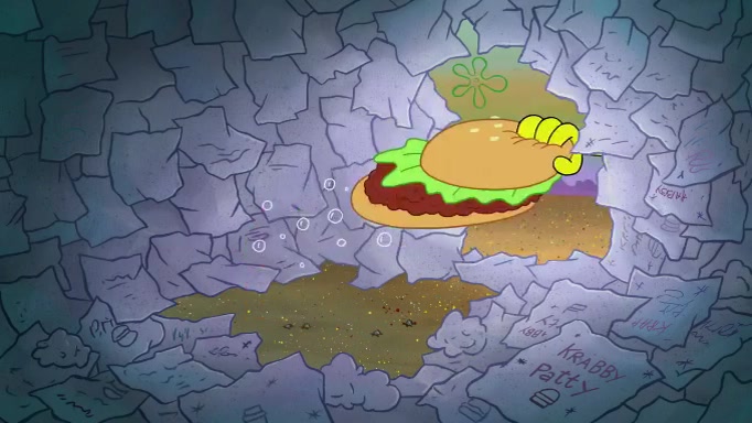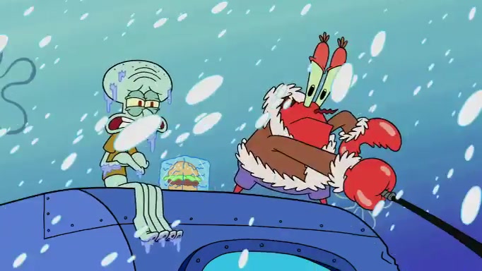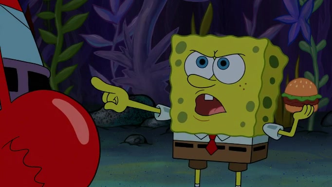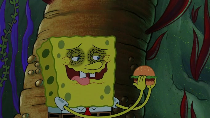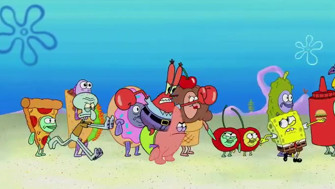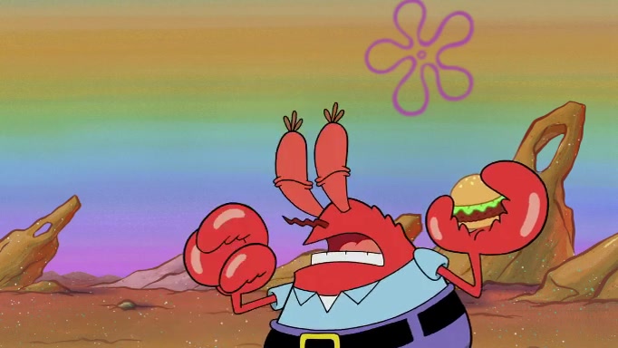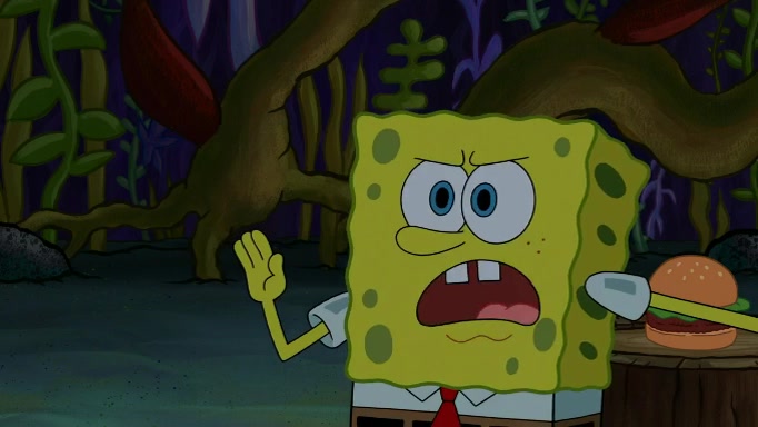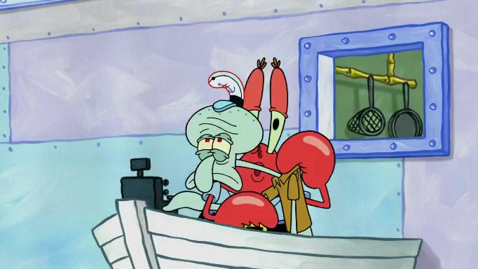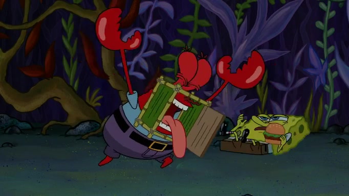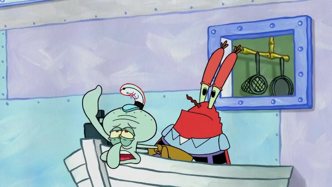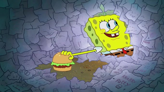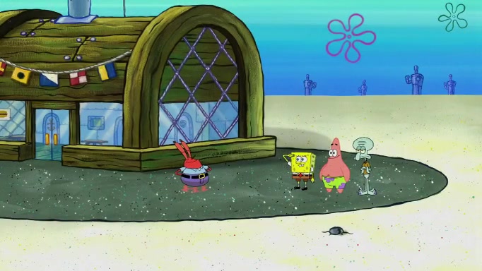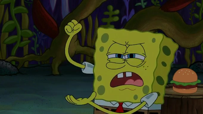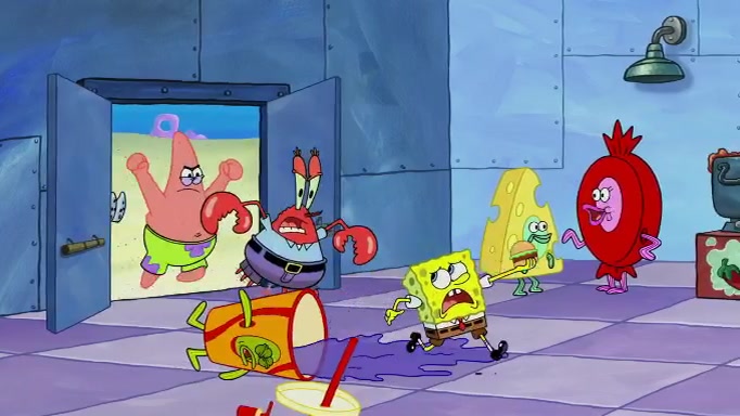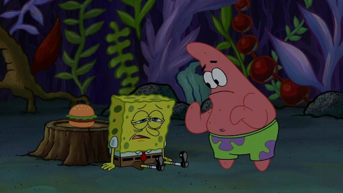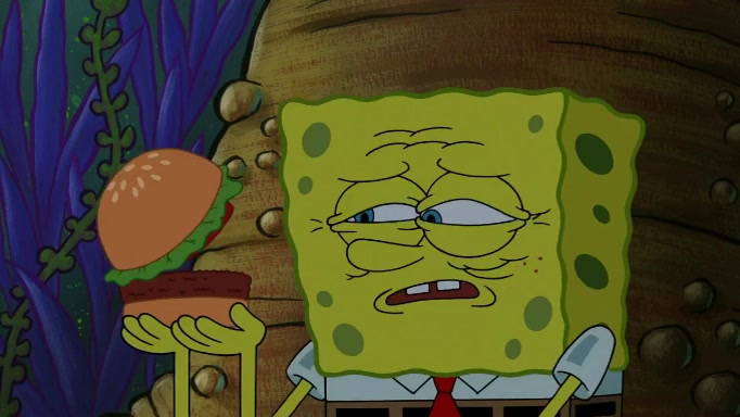 More time later, Patrick, Squidward, and Mr. Krabs are showing signs of hunger and think about eating the Krabby Patty. SpongeBob tries to get everyone not to eat the Krabby Patty but the others only care for eating it now. Patrick nearly eats the Krabby Patty by tricking SpongeBob but his plan fails. Squidward then tries to put SpongeBob to sleep with his clarinet, but the Snail Monster returns and grabs Squidward by his head. It then drops Squidward on his face and he comments "Everybody's a critic." Mr. Krabs' turn to trick SpongeBob as he created a safe to put the Krabby Patty in. However, the other side of the safe leads into Mr. Krabs' mouth and SpongeBob backs him away. SpongeBob then offers everyone a solution: Nature Patties. Only Patrick seems to enjoy these patties while Squidward and Mr. Krab show great disgust for them. Having enough, Mr. Krabs, Squidward, and Patrick all decide to chase SpongeBob down to get to the Krabby Patty.