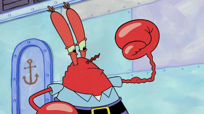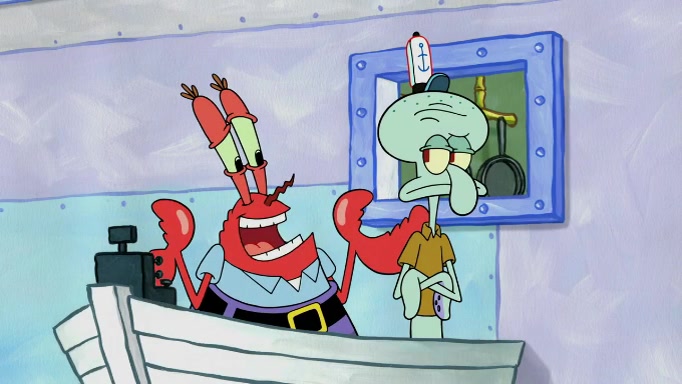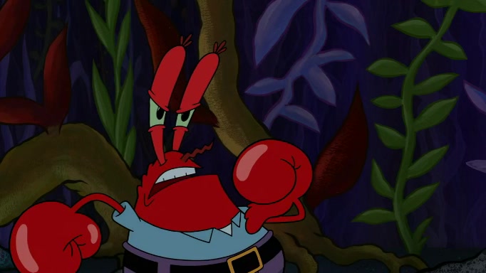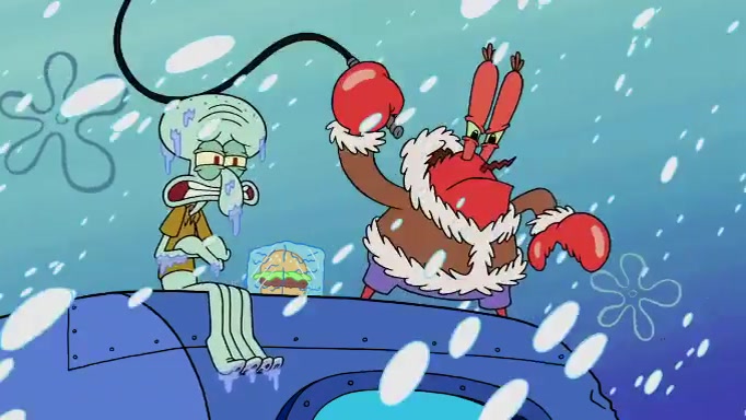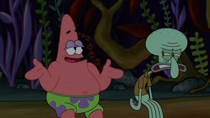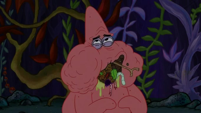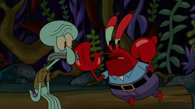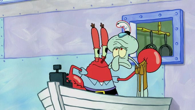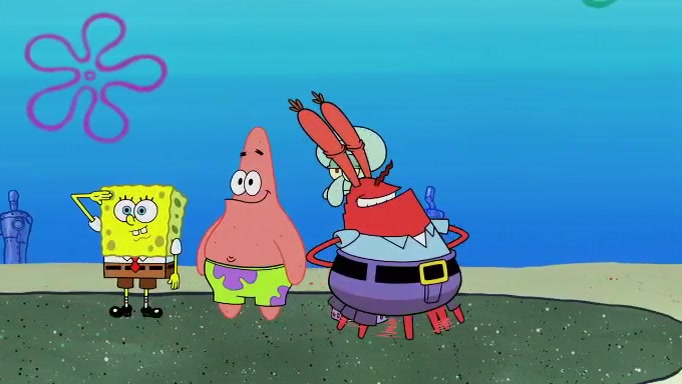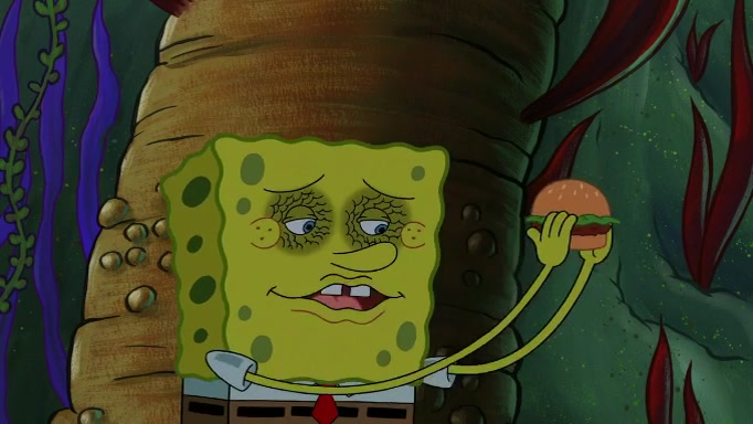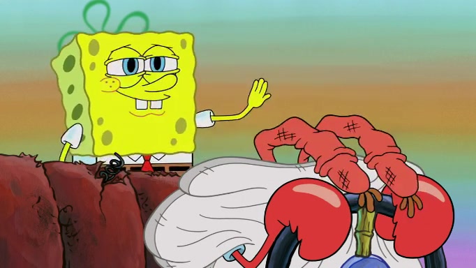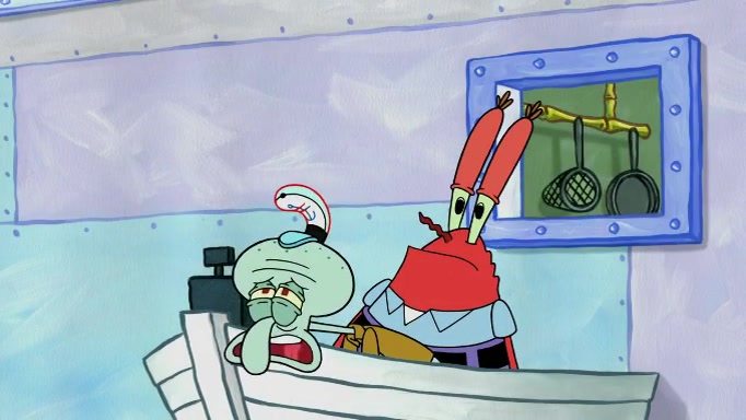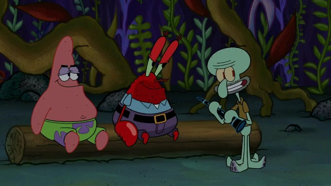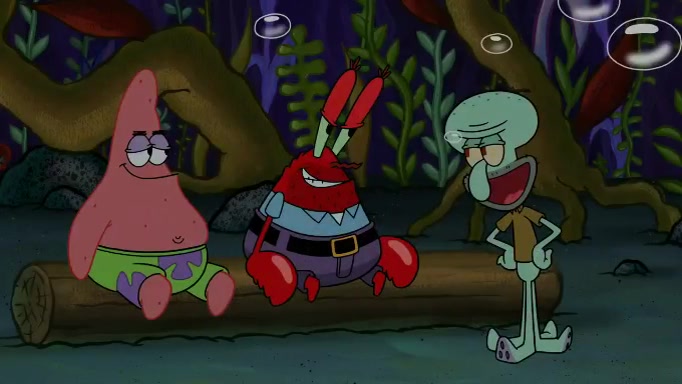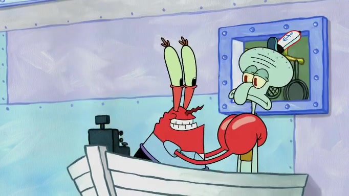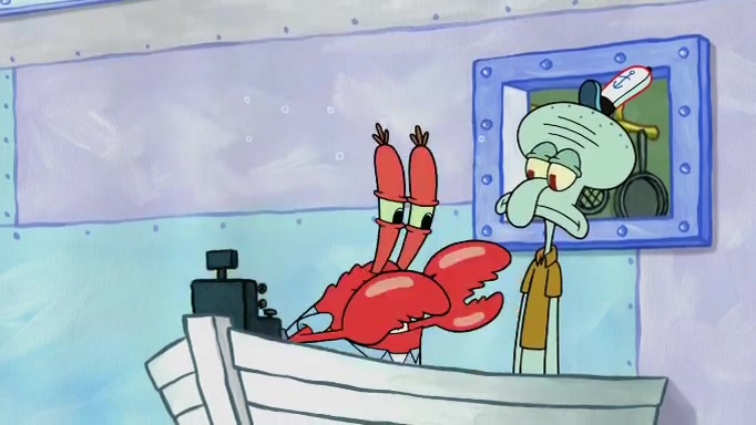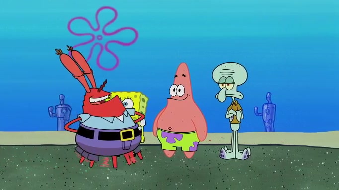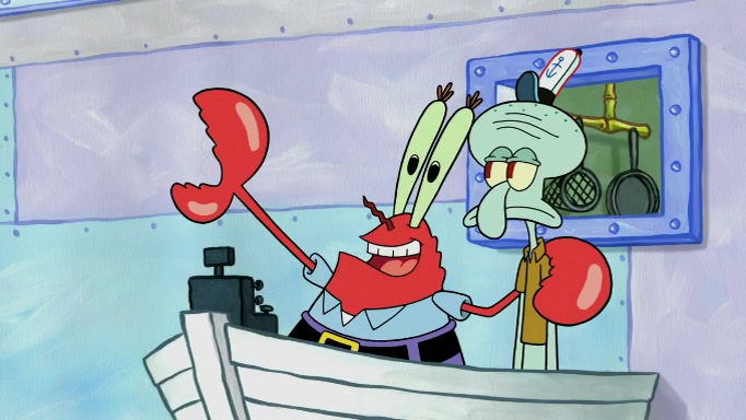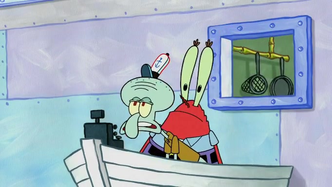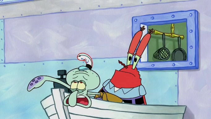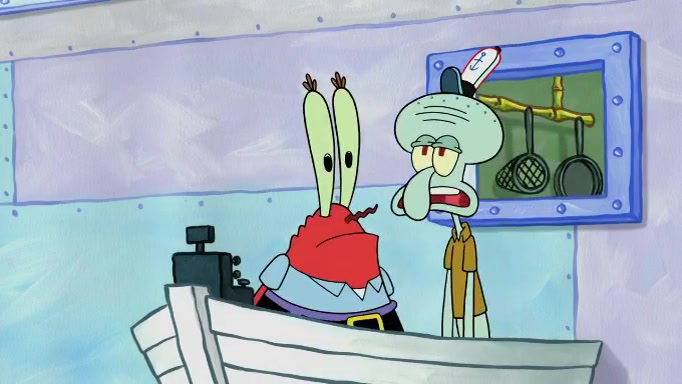 More time later, Patrick, Squidward, and Mr. Krabs are showing signs of hunger and think about eating the Krabby Patty. SpongeBob tries to get everyone not to eat the Krabby Patty but the others only care for eating it now. Patrick nearly eats the Krabby Patty by tricking SpongeBob but his plan fails. Squidward then tries to put SpongeBob to sleep with his clarinet, but the Snail Monster returns and grabs Squidward by his head. It then drops Squidward on his face and he comments "Everybody's a critic." Mr. Krabs' turn to trick SpongeBob as he created a safe to put the Krabby Patty in. However, the other side of the safe leads into Mr. Krabs' mouth and SpongeBob backs him away. SpongeBob then offers everyone a solution: Nature Patties. Only Patrick seems to enjoy these patties while Squidward and Mr. Krab show great disgust for them. Having enough, Mr. Krabs, Squidward, and Patrick all decide to chase SpongeBob down to get to the Krabby Patty.